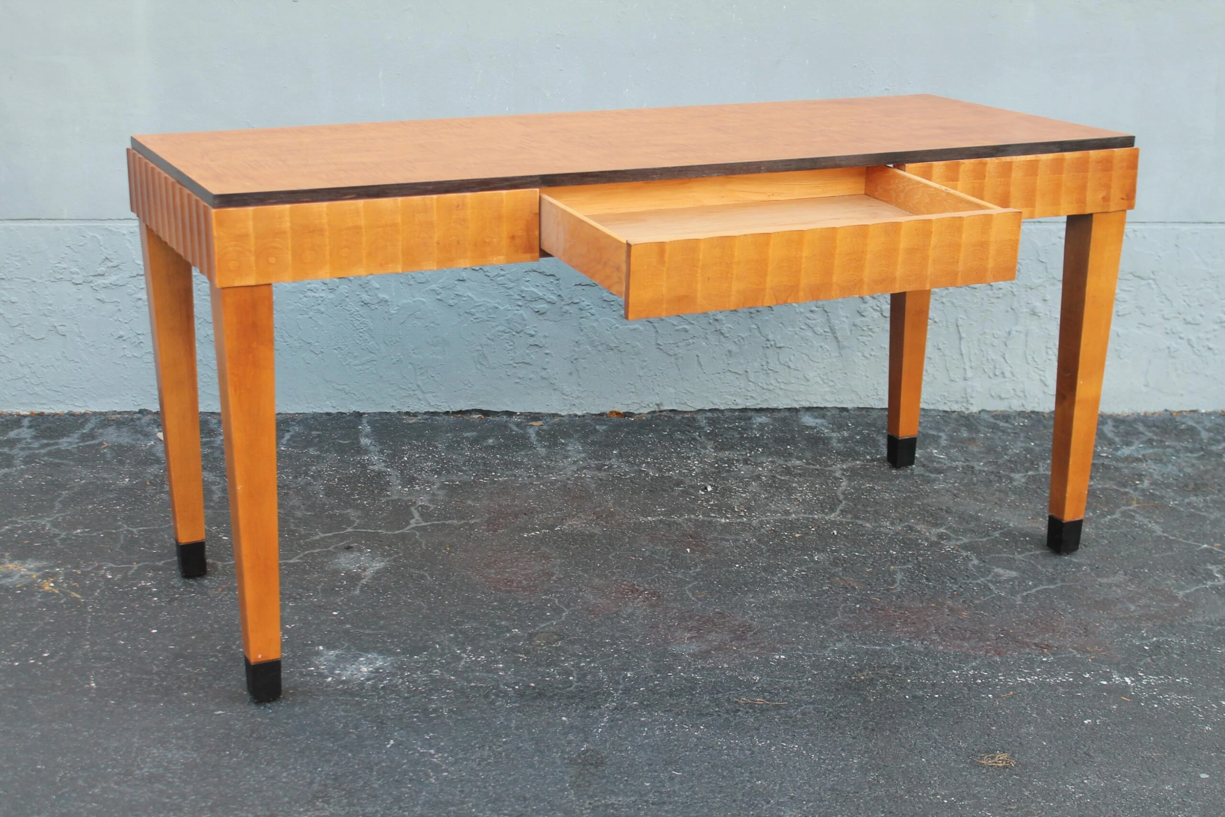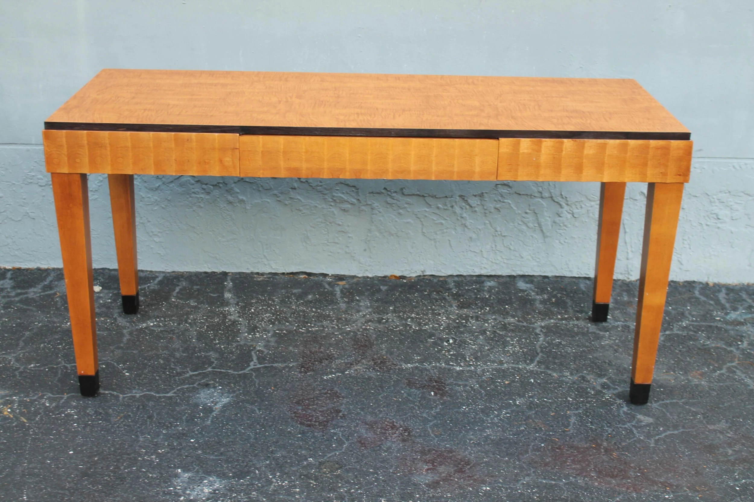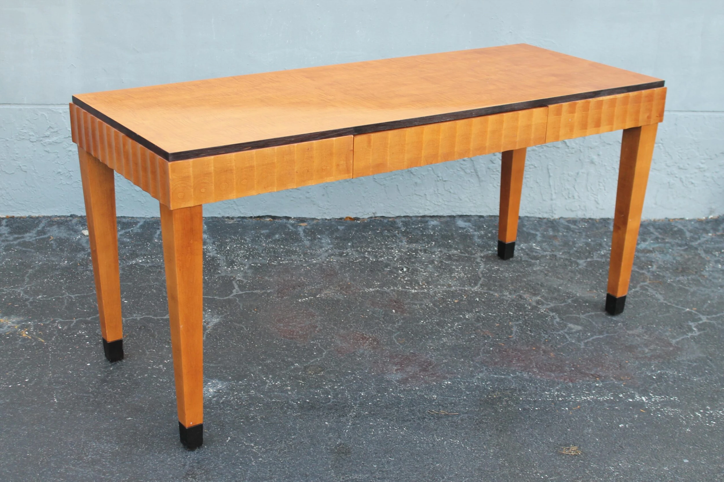 1970 MCM Lane Altavista Elegant Ladies Writing Desk. Center drawer storage. Beautiful scalloped wood border. Black lacquer line detail. Light to medium toned wood. Excellent size for use as a hall Console.