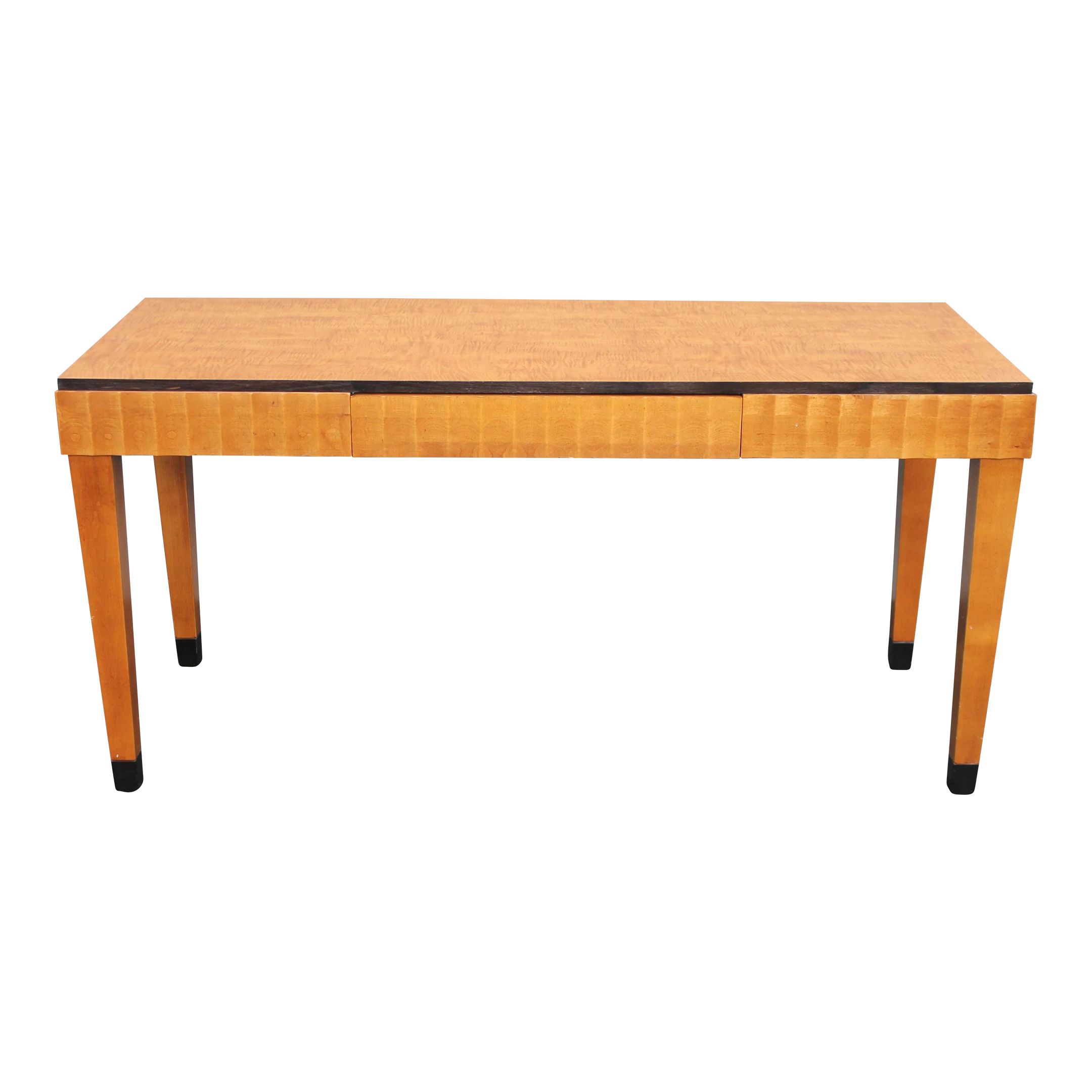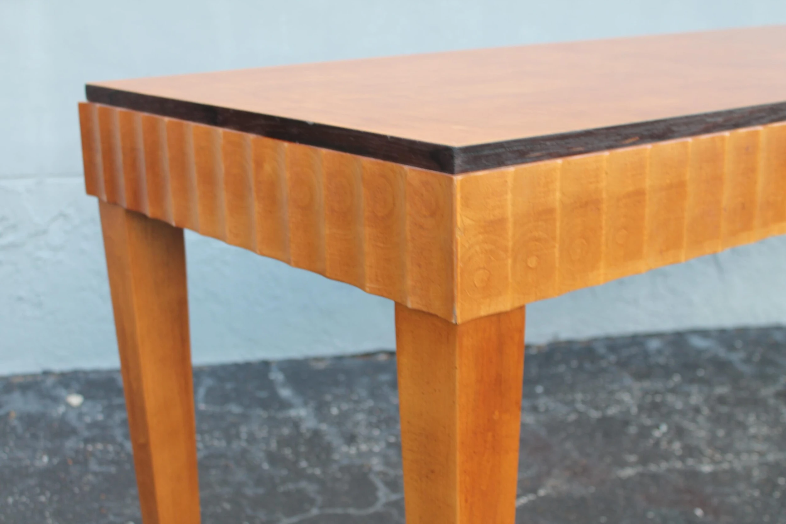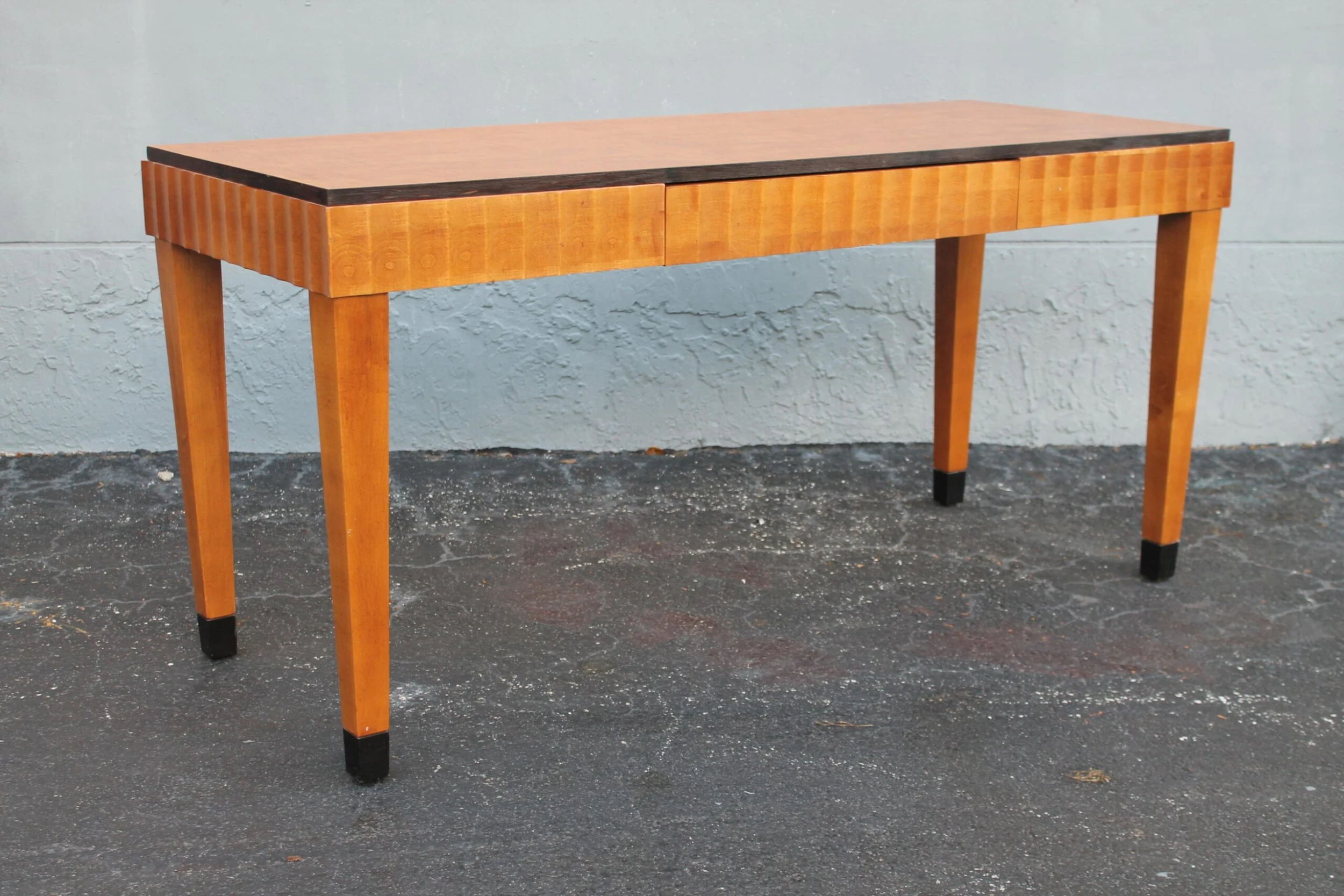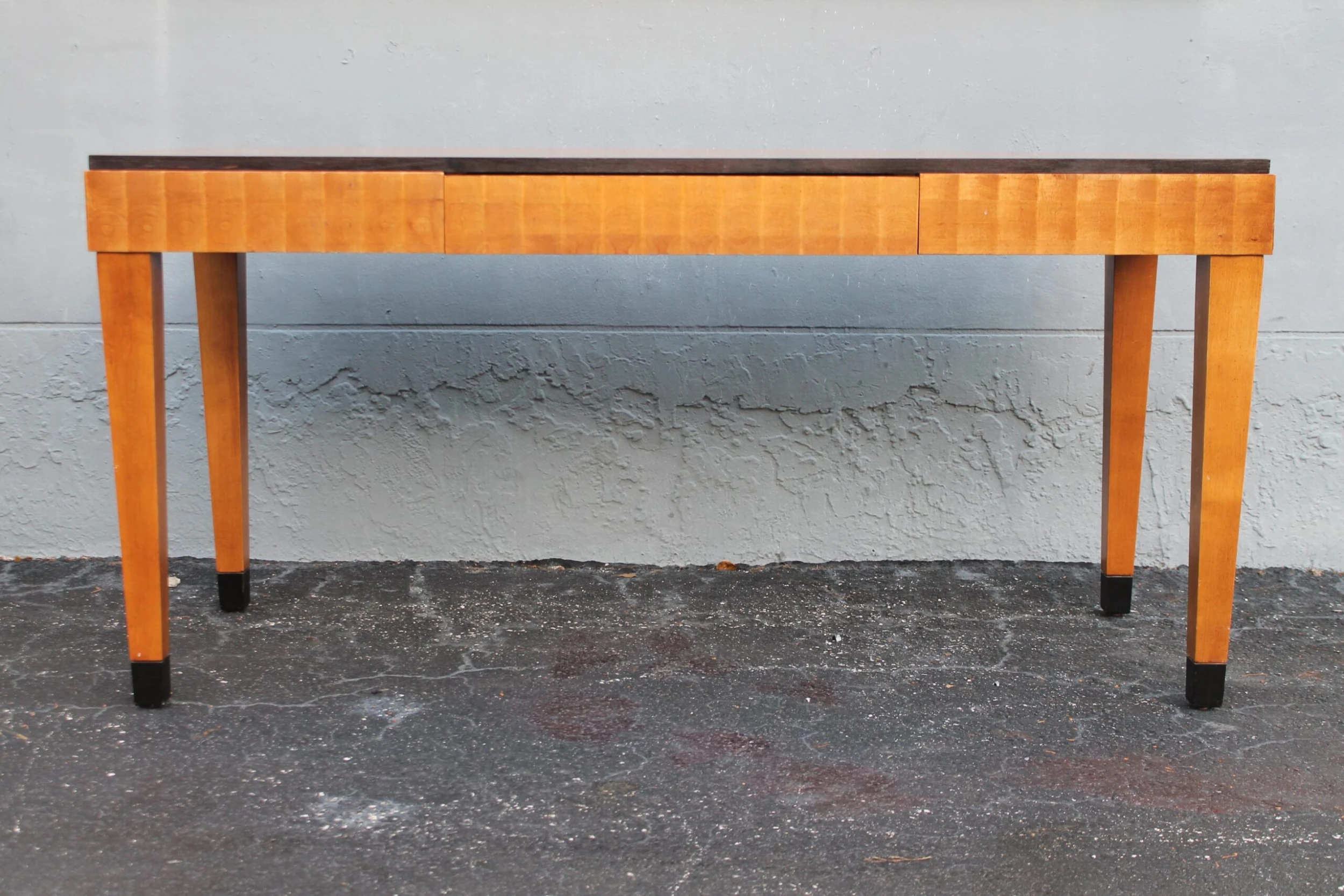 1970 MCM Lane Altavista Elegant Ladies Writing Desk. Center drawer storage. Beautiful scalloped wood border. Black lacquer line detail. Light to medium toned wood. Excellent size for use as a hall Console.