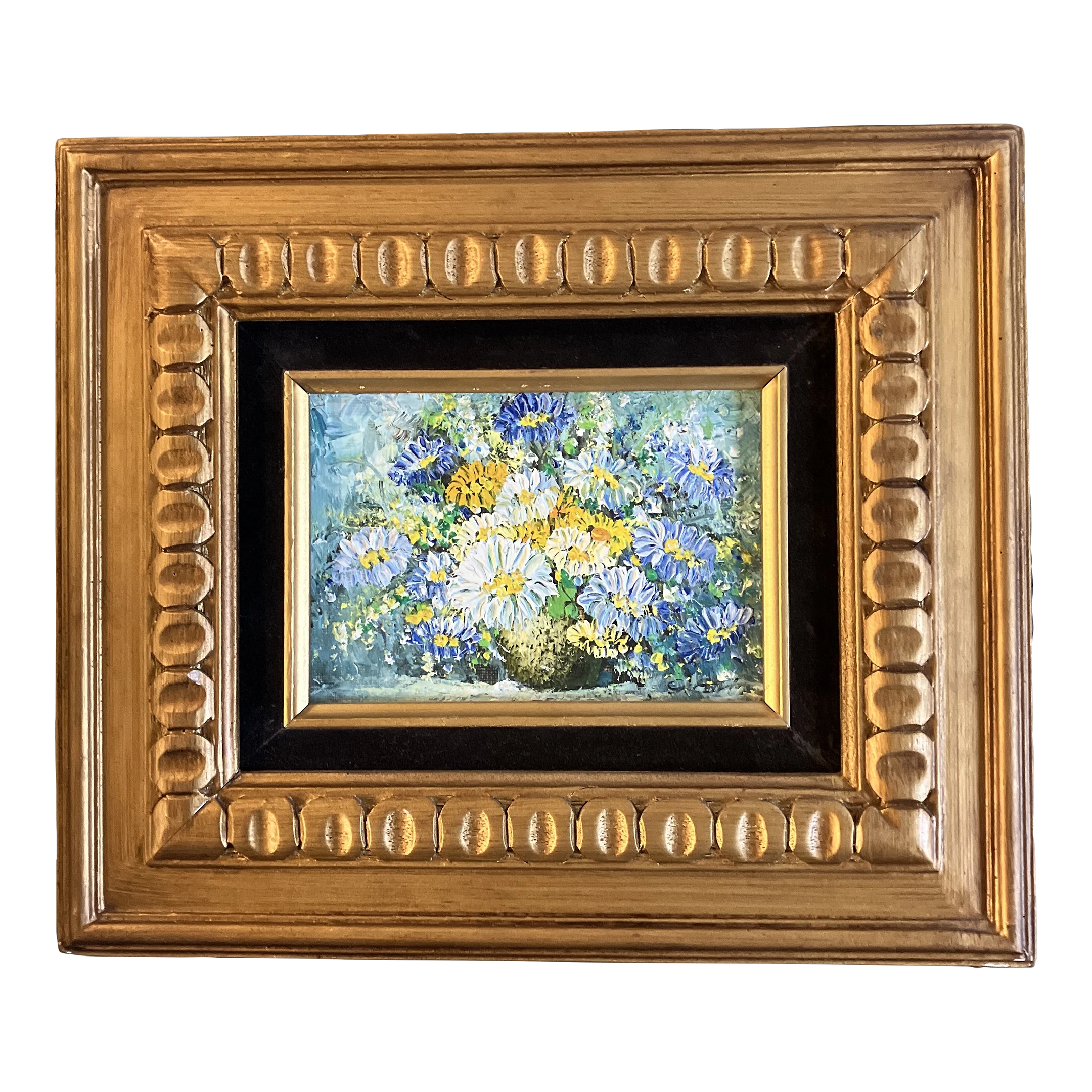 Original 5 x 7 painting on wood panel signed bottom right Overall size with original carved wood frame with velvet liner is 11.5 x 13.5