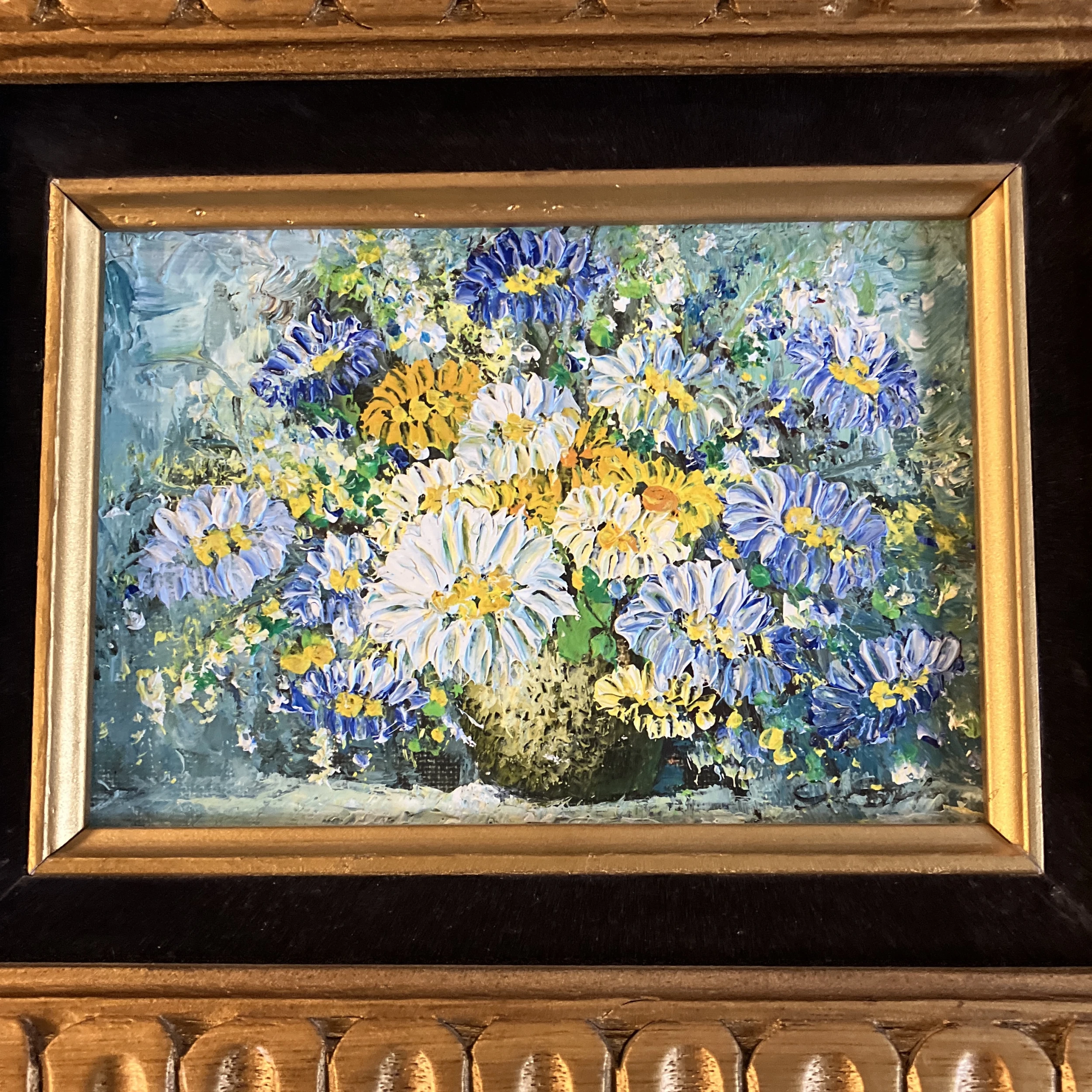 Original 5 x 7 painting on wood panel signed bottom right Overall size with original carved wood frame with velvet …