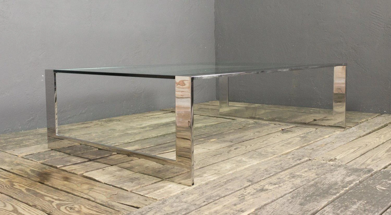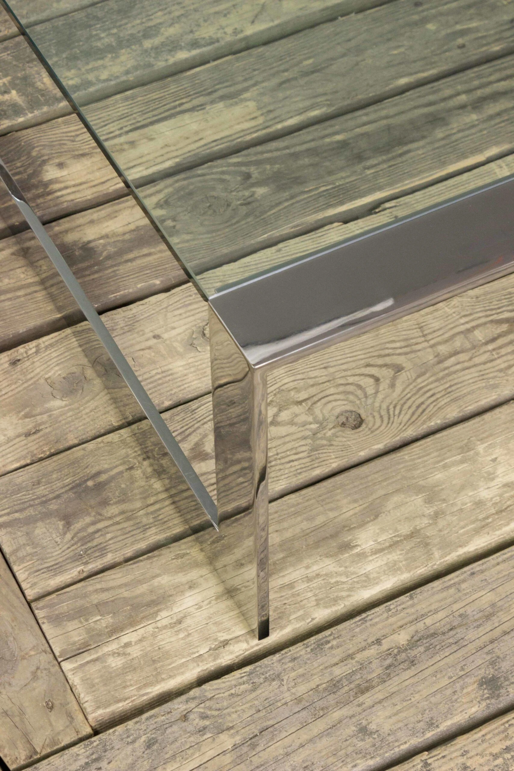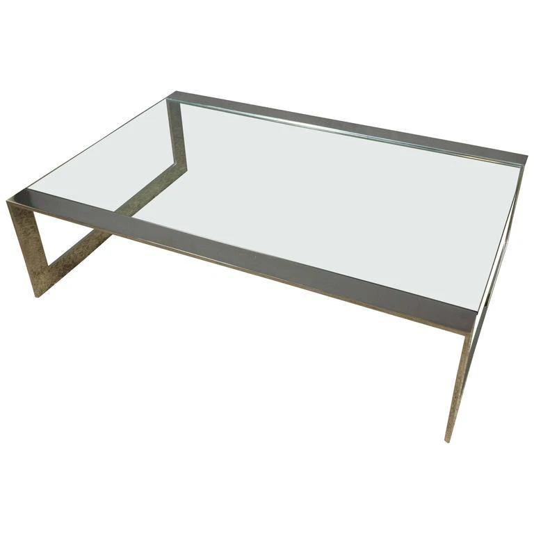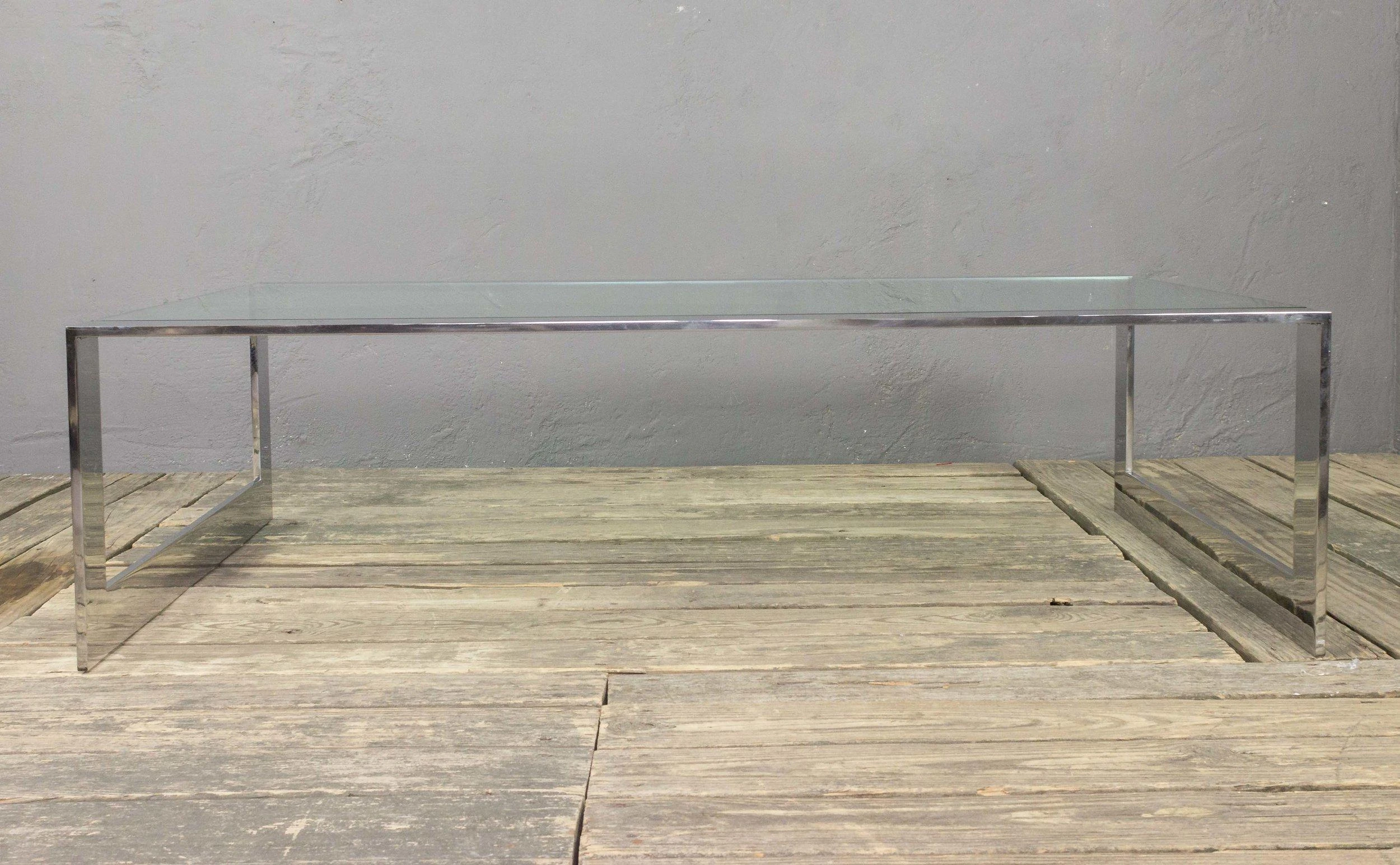 Polished stainless steel coffee table with inset clear glass. Very good condition. Frame has recently been polished. There are a few minor surface blemishes to the frame that are not very noticeable. The original glass has chips to the corners, but a new glass top can be made. American, 1970s. Dimensions: 15″H x 54″W x 36″D