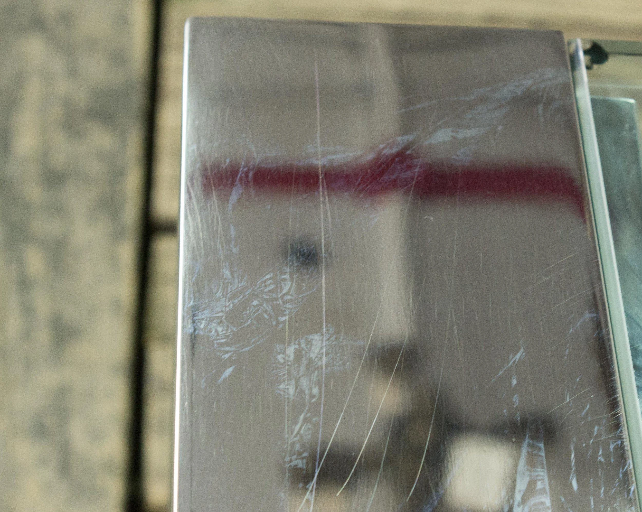 There are a few minor surface blemishes to the frame that are not very noticeable. The original glass has chips to the corners, but a new glass top can be made.