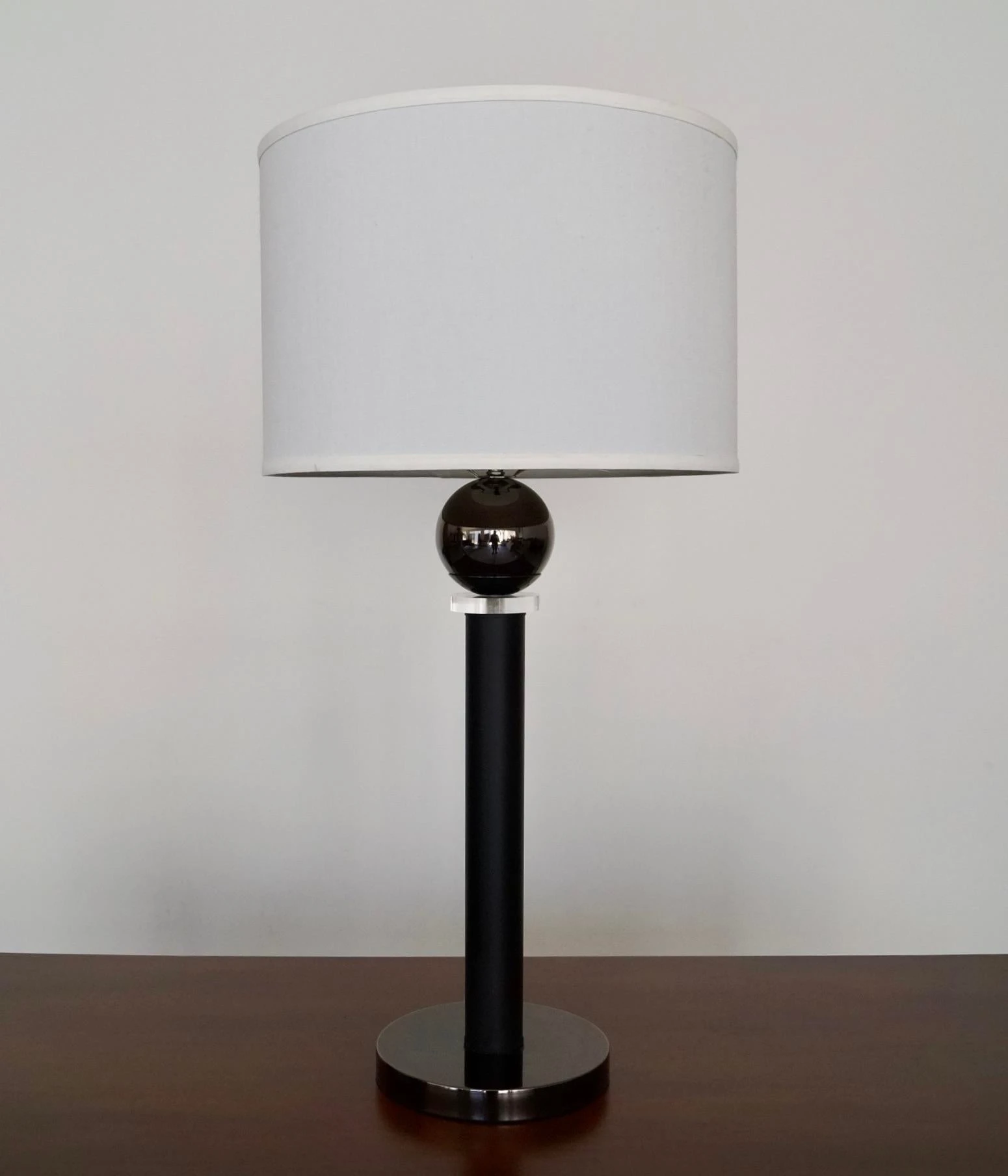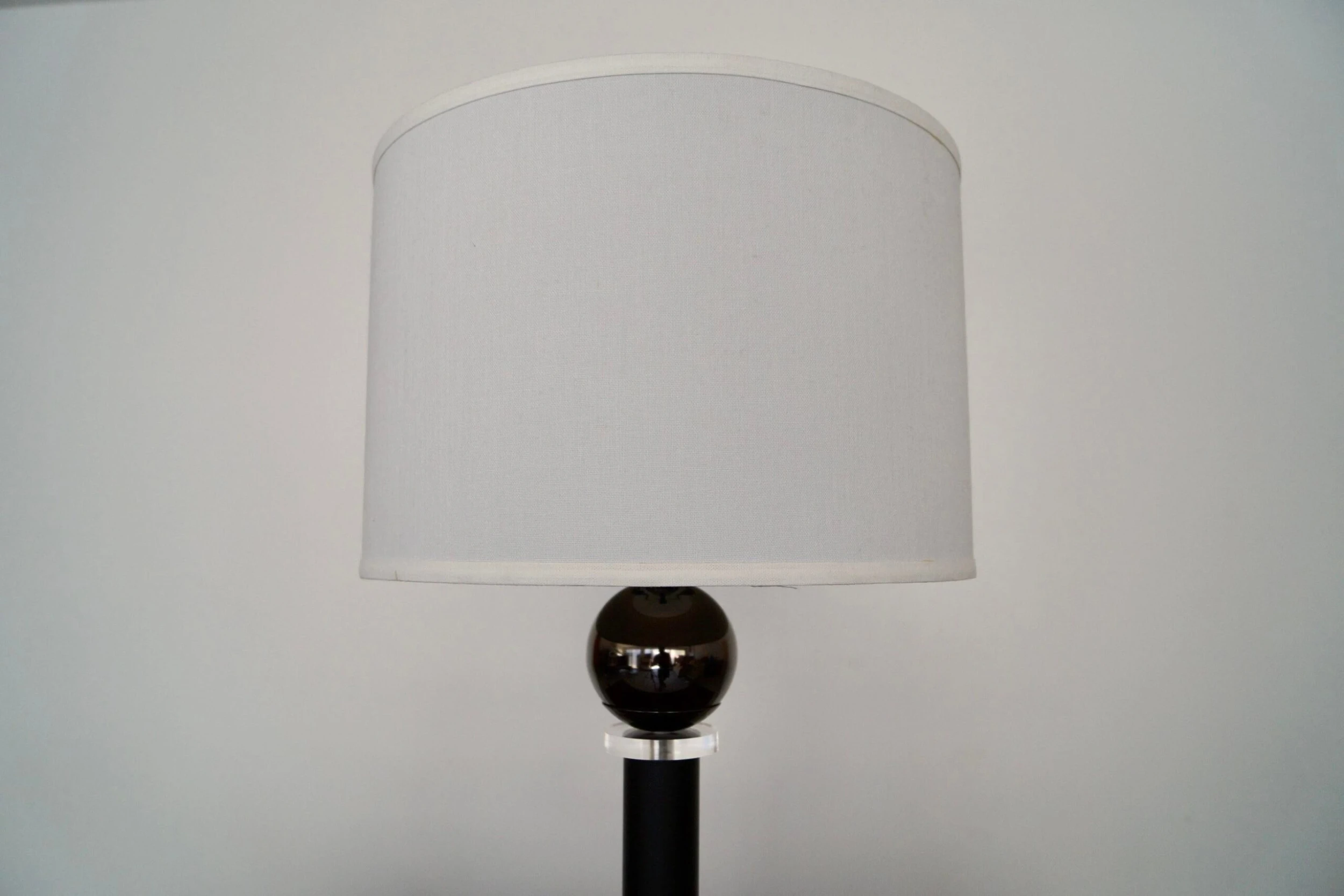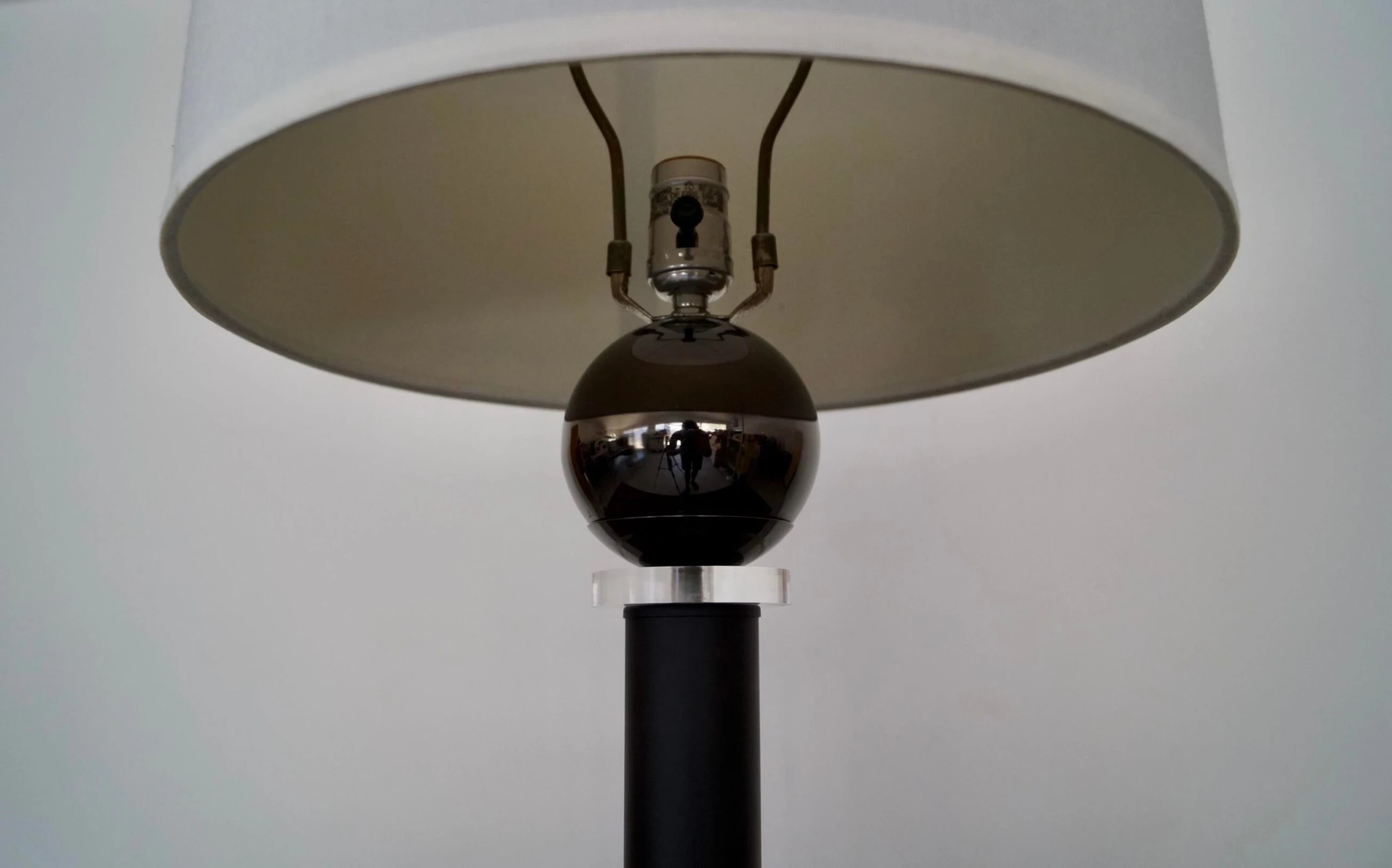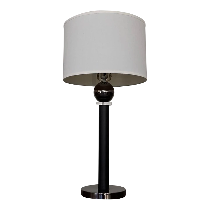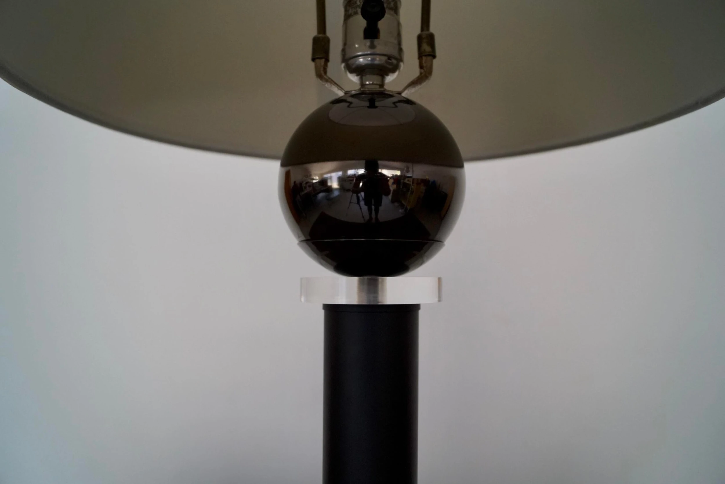 Vintage table lamp for sale. In amazing condition, and manufactured by Hallmark Lighting in the 1970’s here in California with the original label. Very unique postmodern design with a metallic base, a black pole, a lucite ring, and a metallic metal reflective ball on top. It’s in perfect working order, and a beautiful lamp to decorate. Has a Memphis flare.