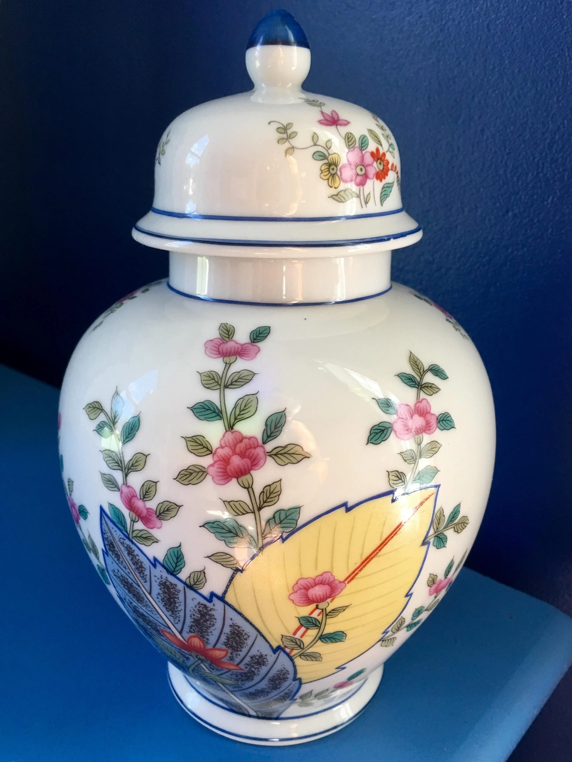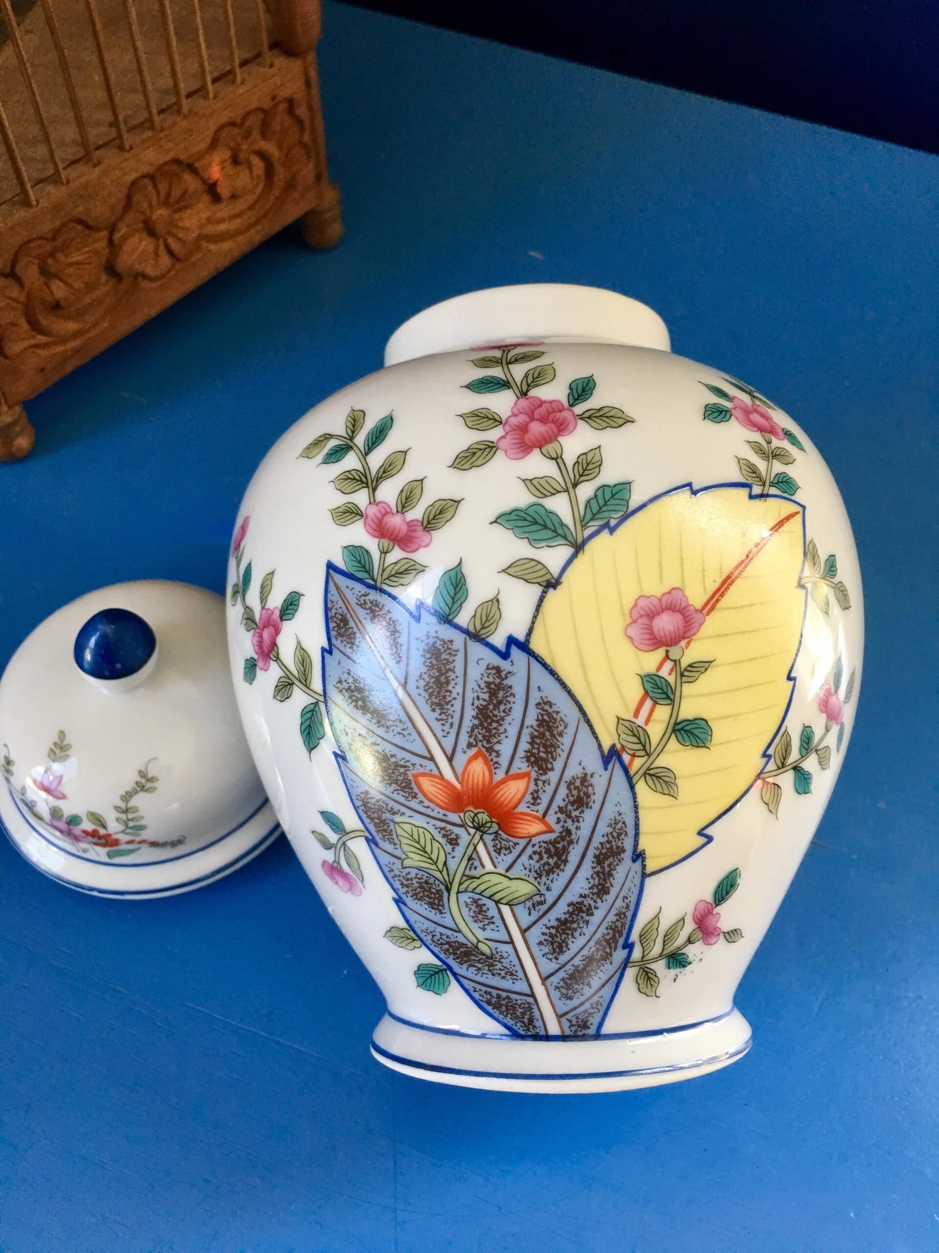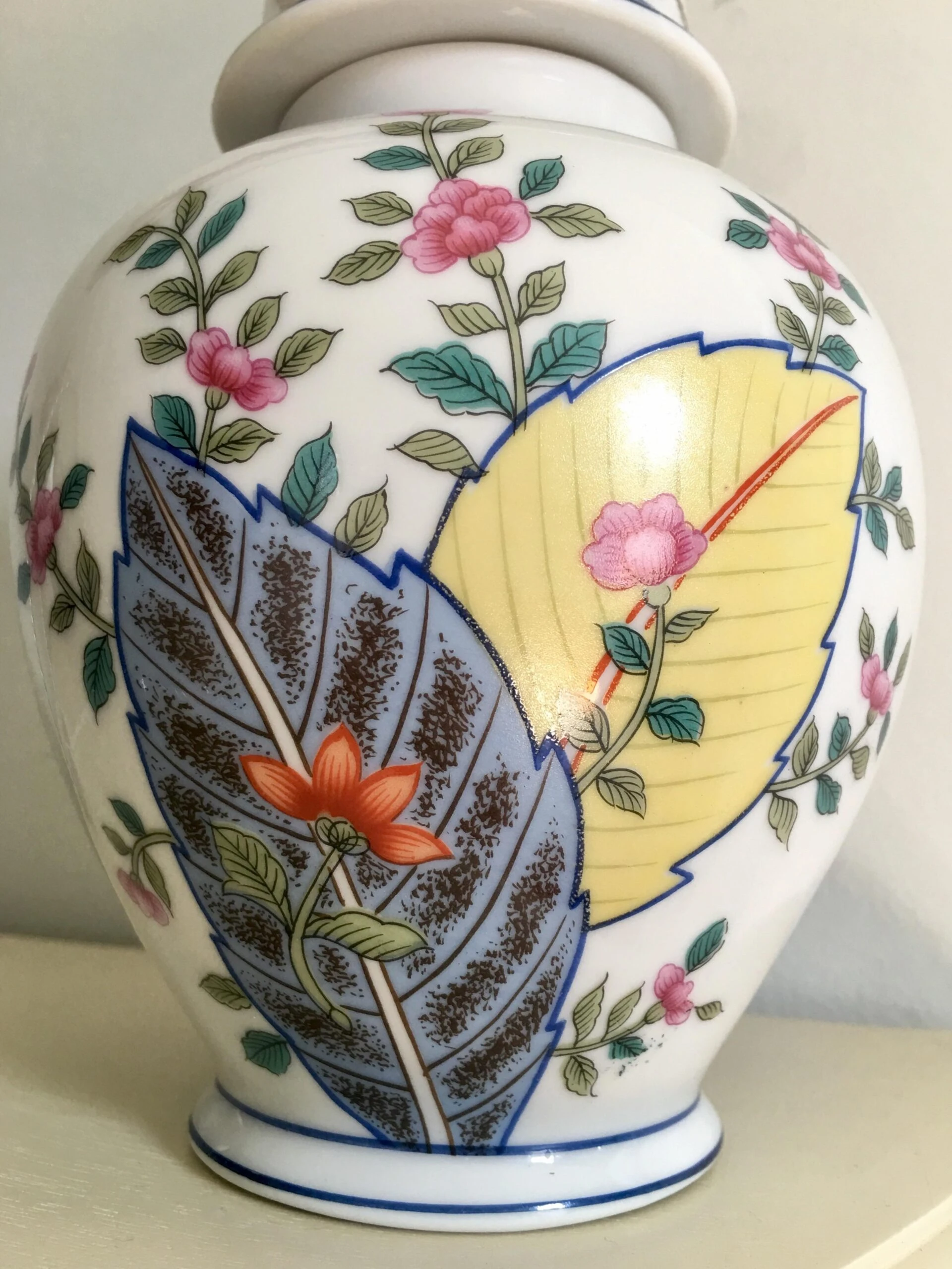 A classic 1970’s petite ginger jar by Seymour Mann with the highly collectible tobacco leaf pattern in vibrant colors.