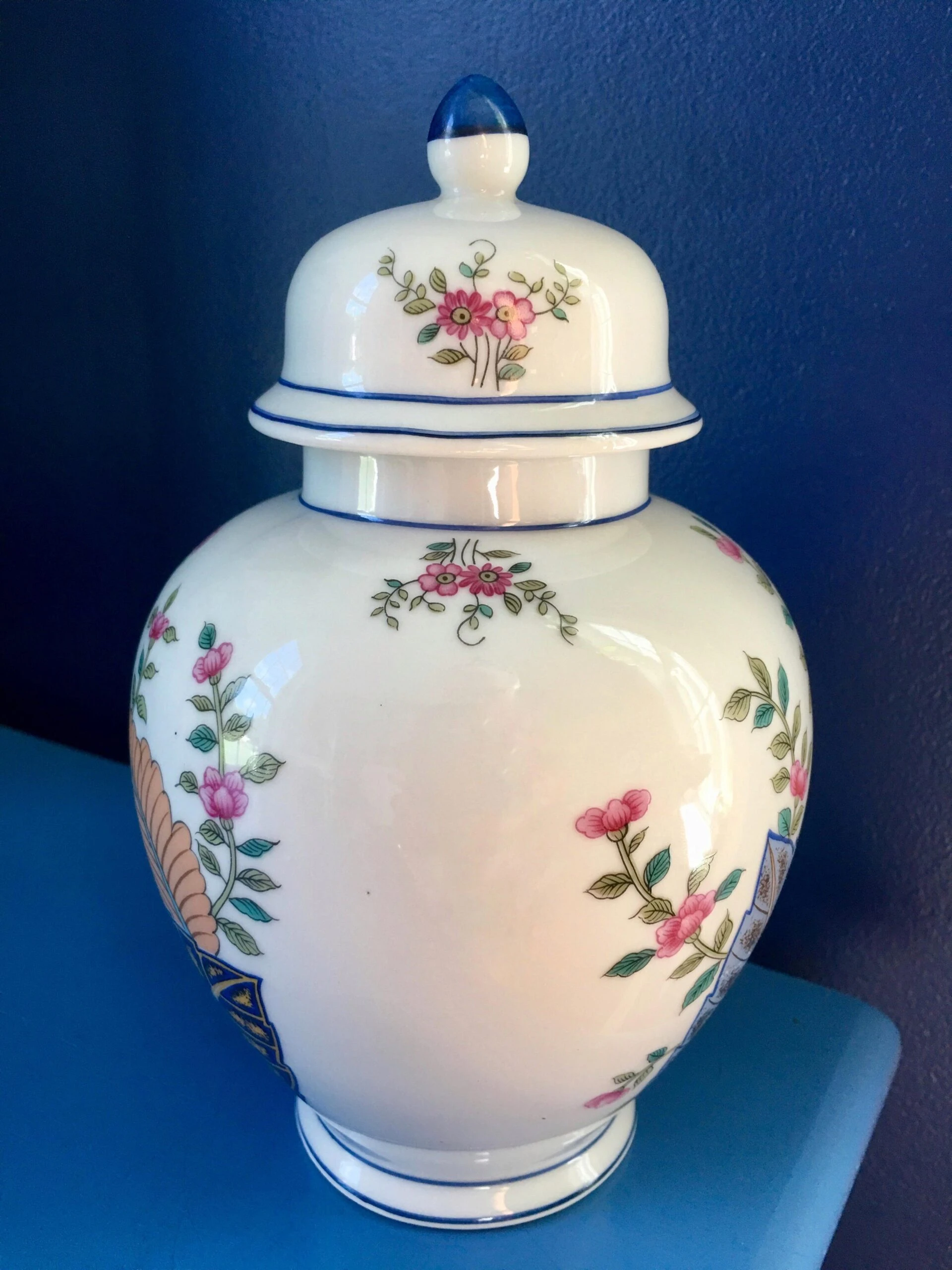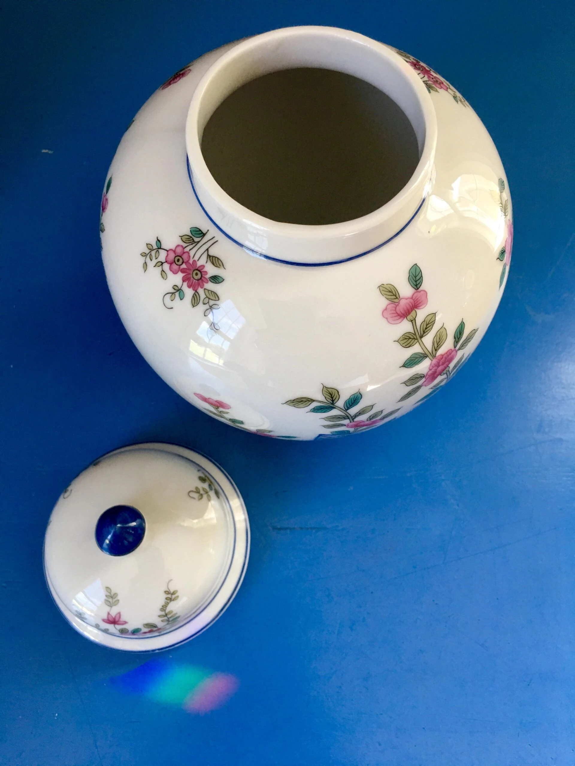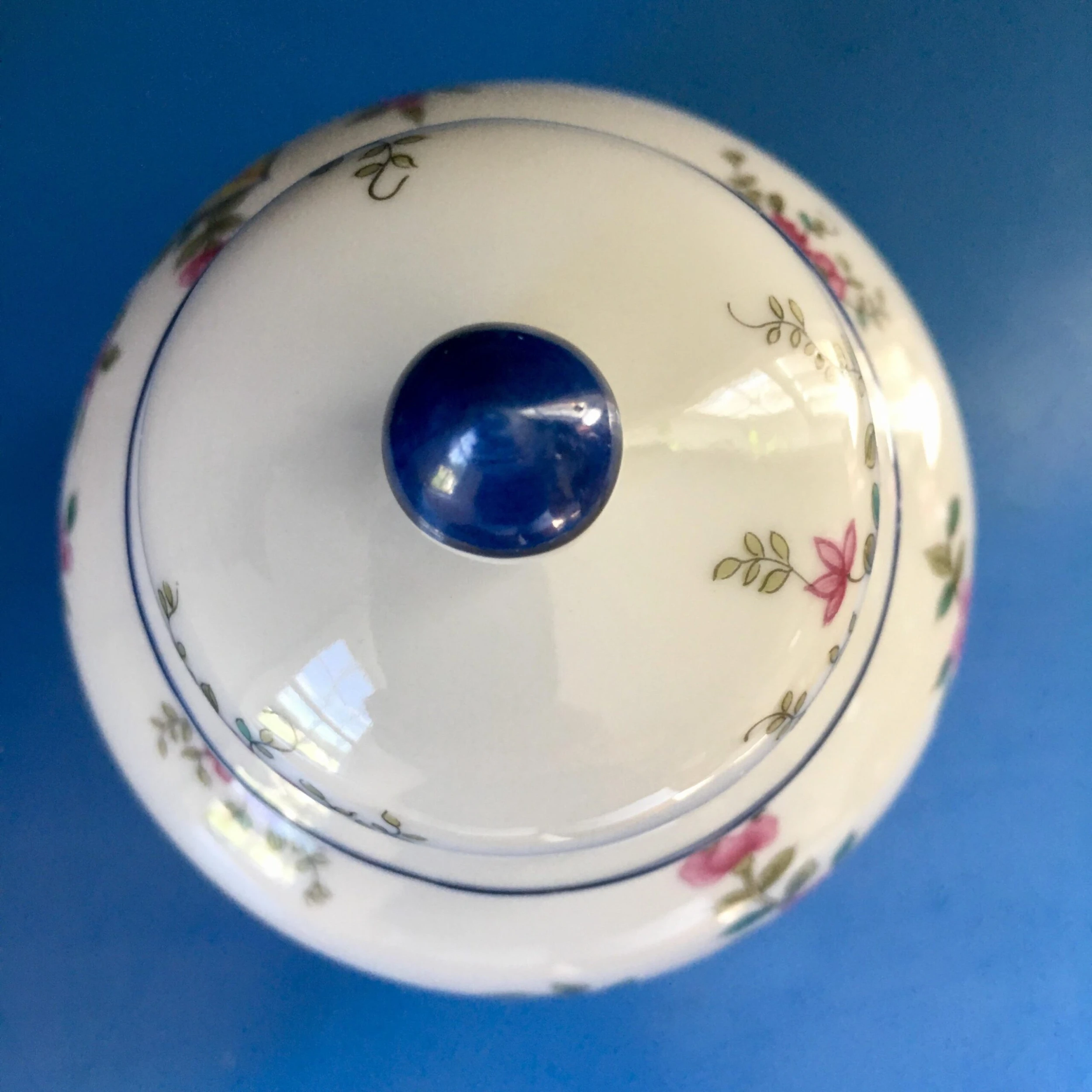 Very well kept piece with minimal age related imperfections such as a slight loss of blue trim paint on lid as noted in the images. A really tiny blue drop of paint is on the upper body from the hand painted trim-creation process in the 70’s. In lovely condition!