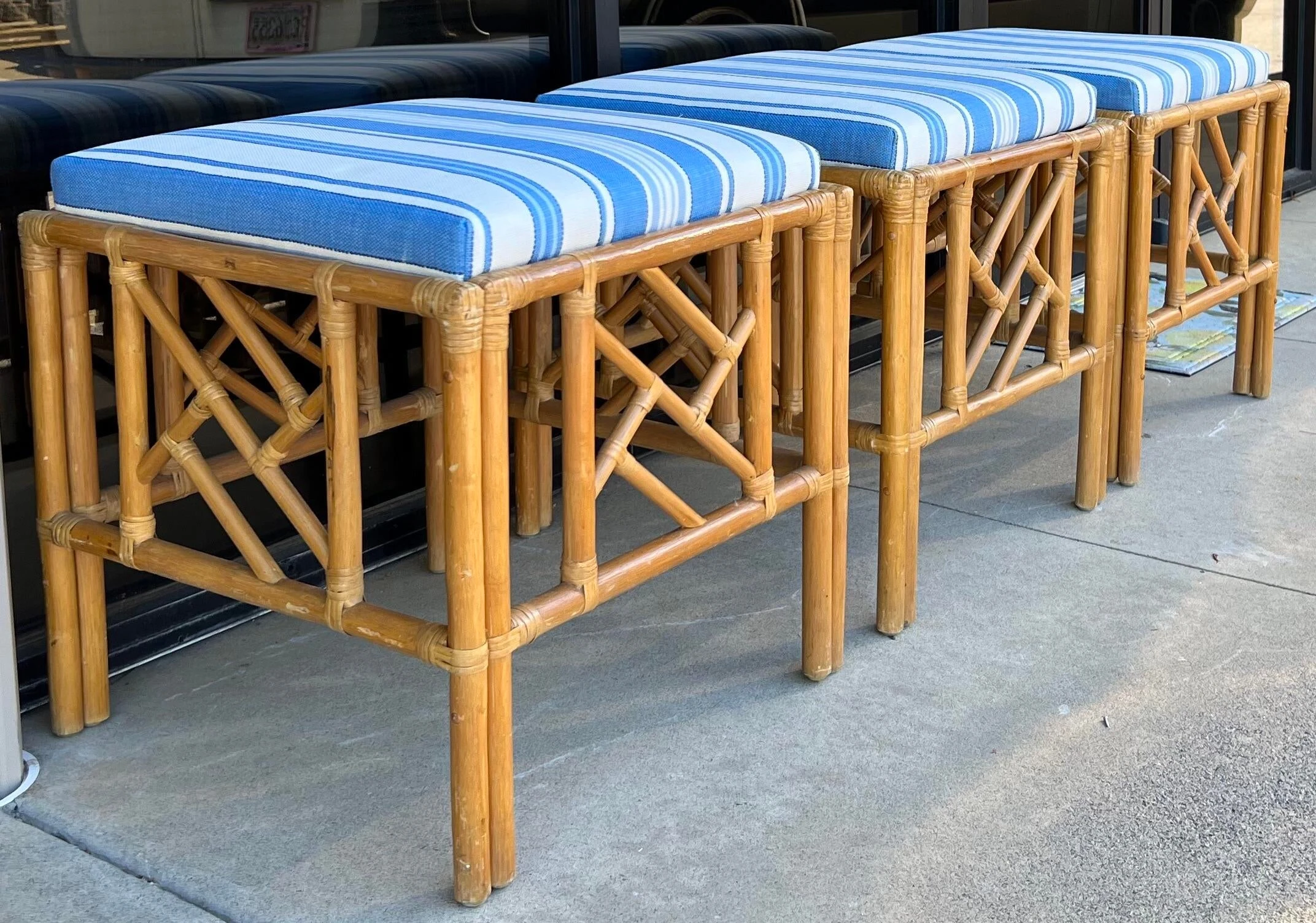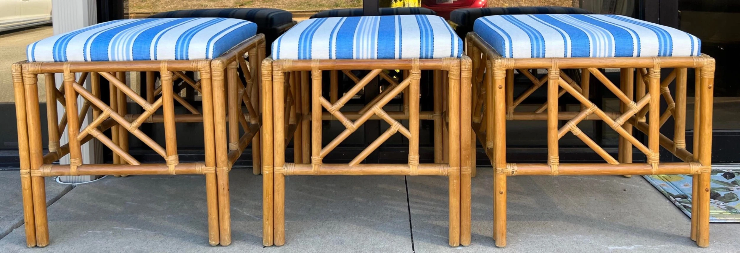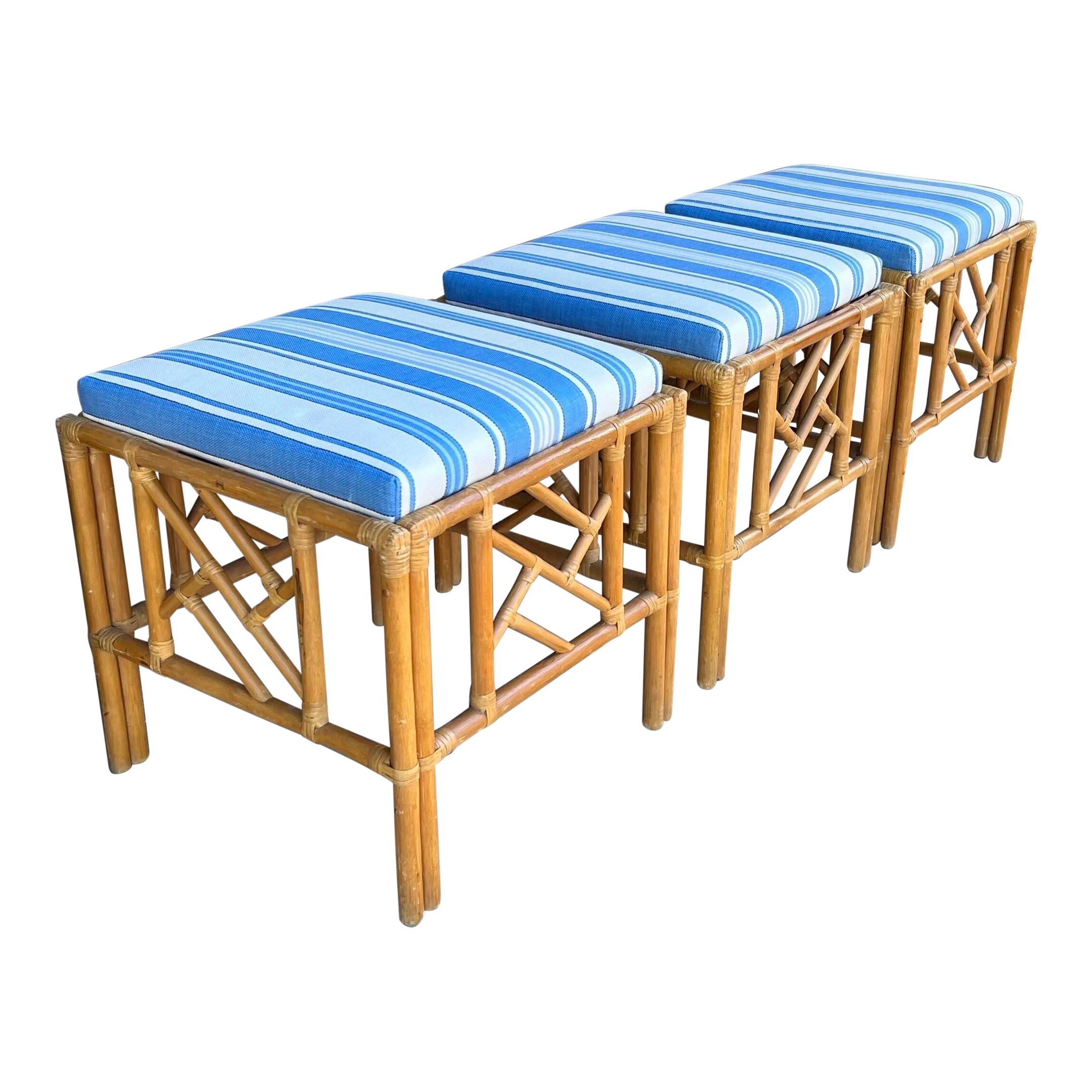 This is a fun set! It is a set of three Chinese chippendale style ottomans or side tables in a new striped upholstery. They are in very good vintage condition. The tops are not attached, so side tables are a wonderful option.