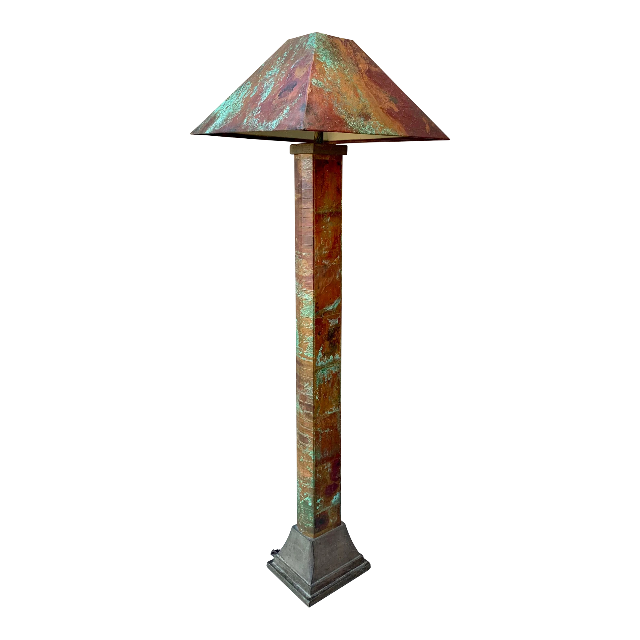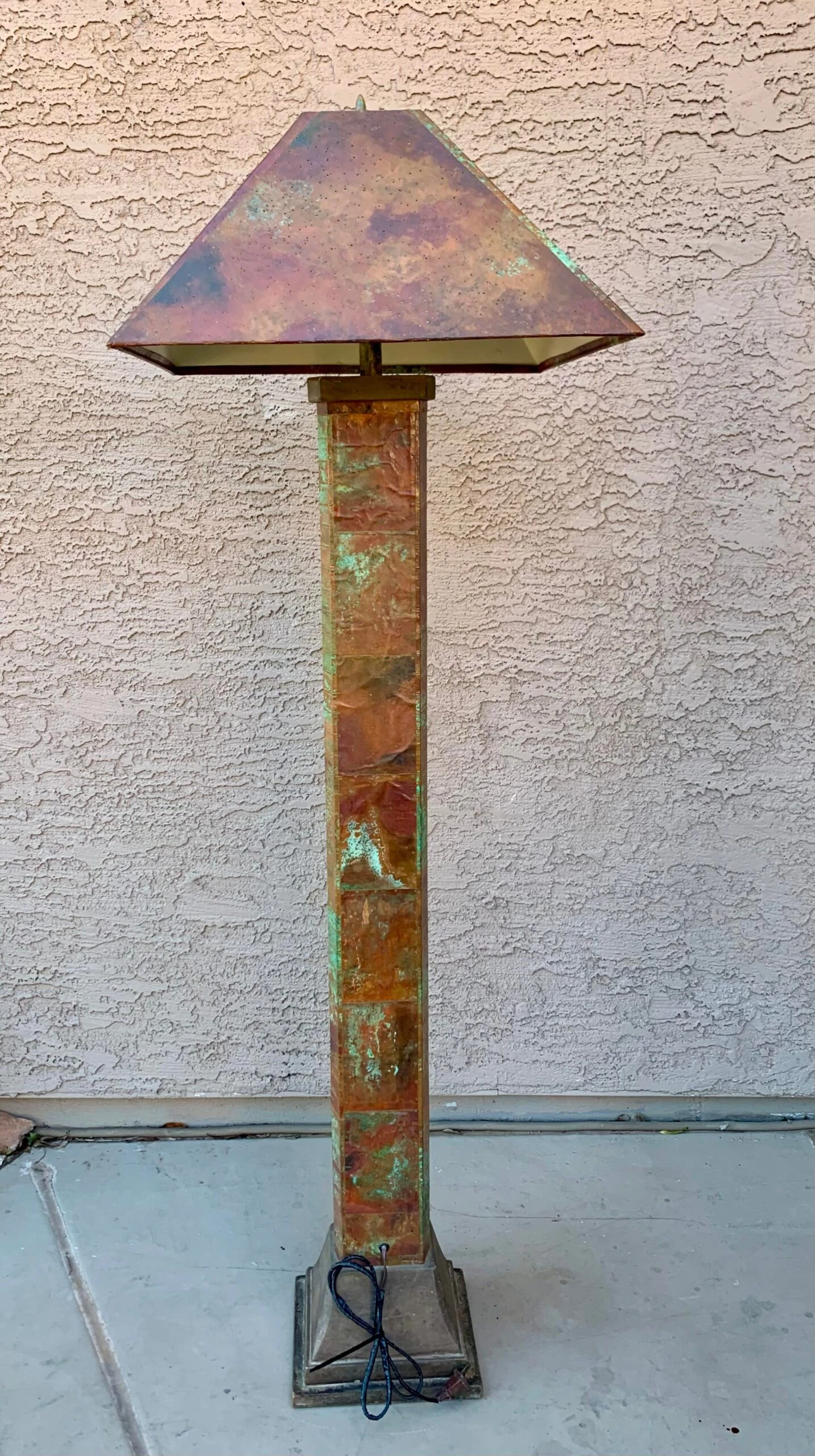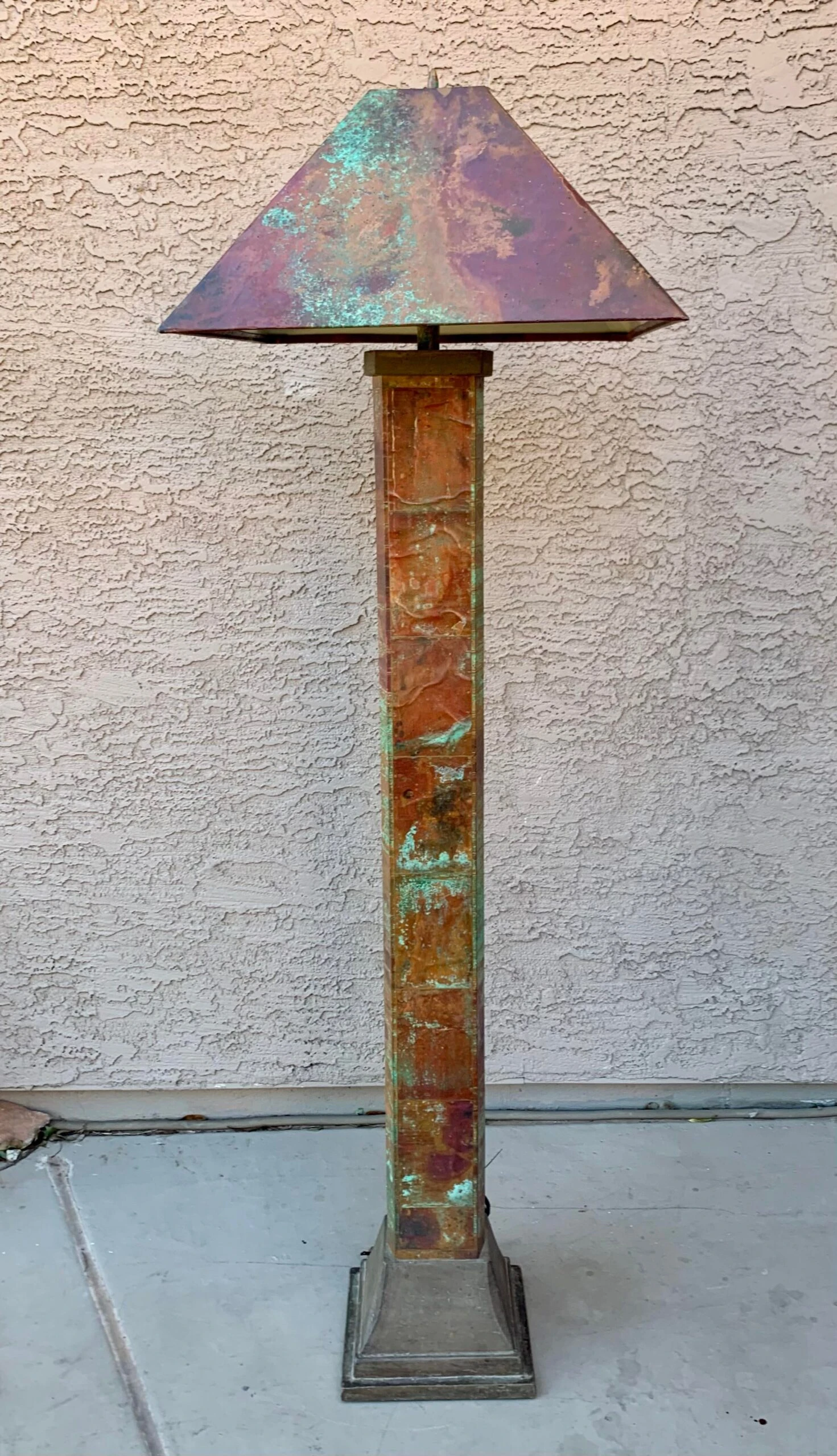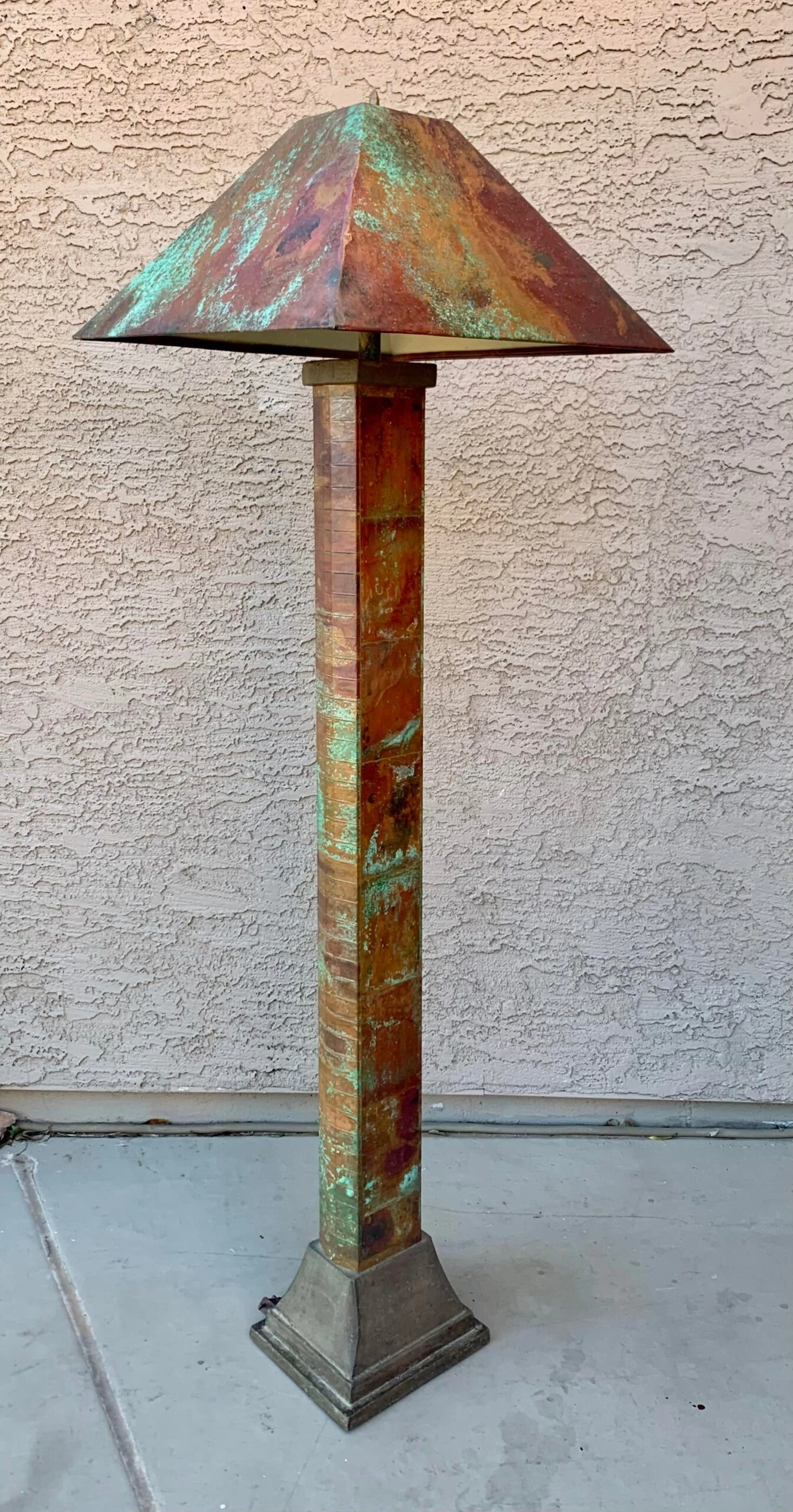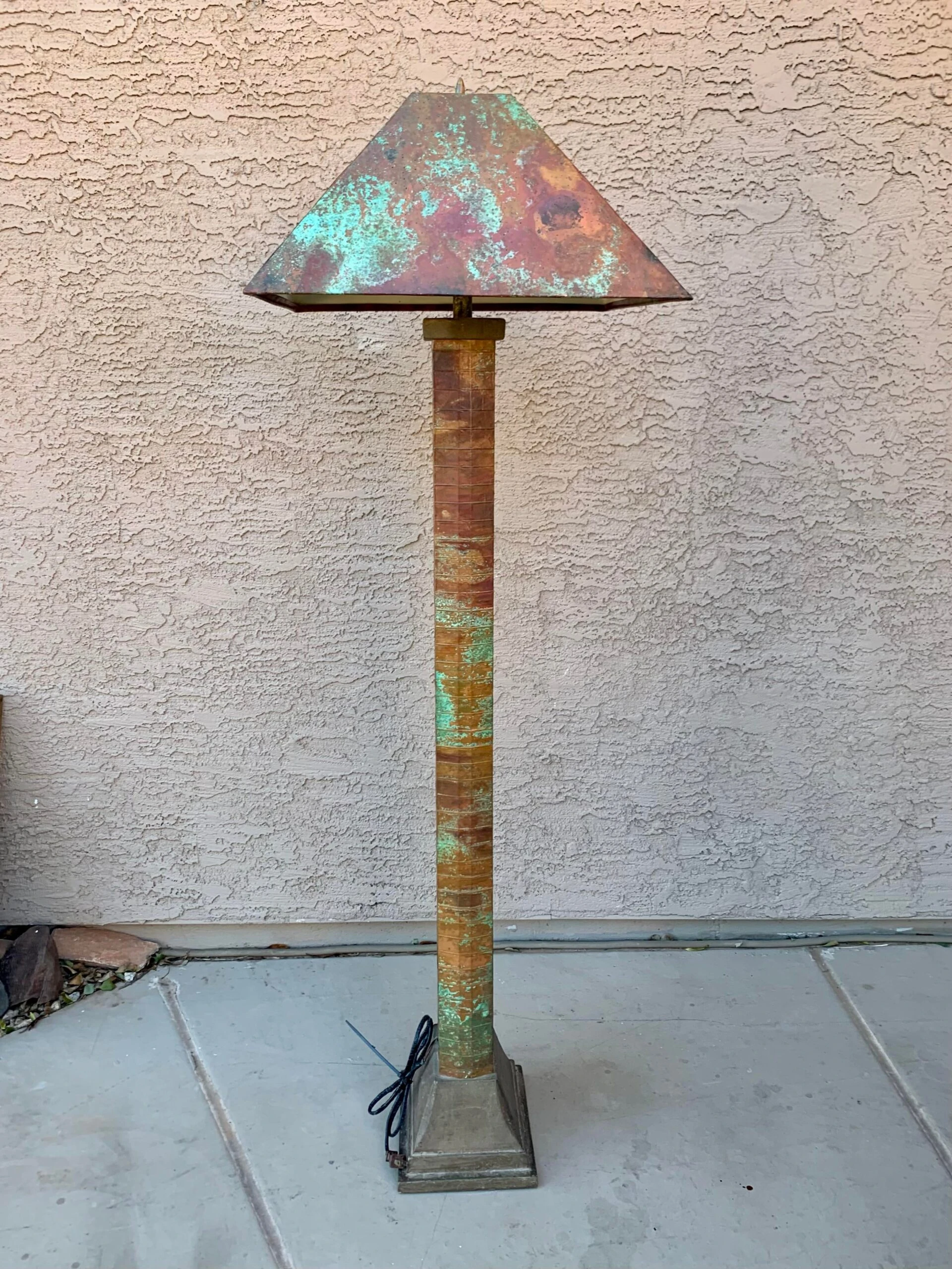 1980’s elegant tall column floor lamp, plaster and ribbed copper, Arts and craft style.