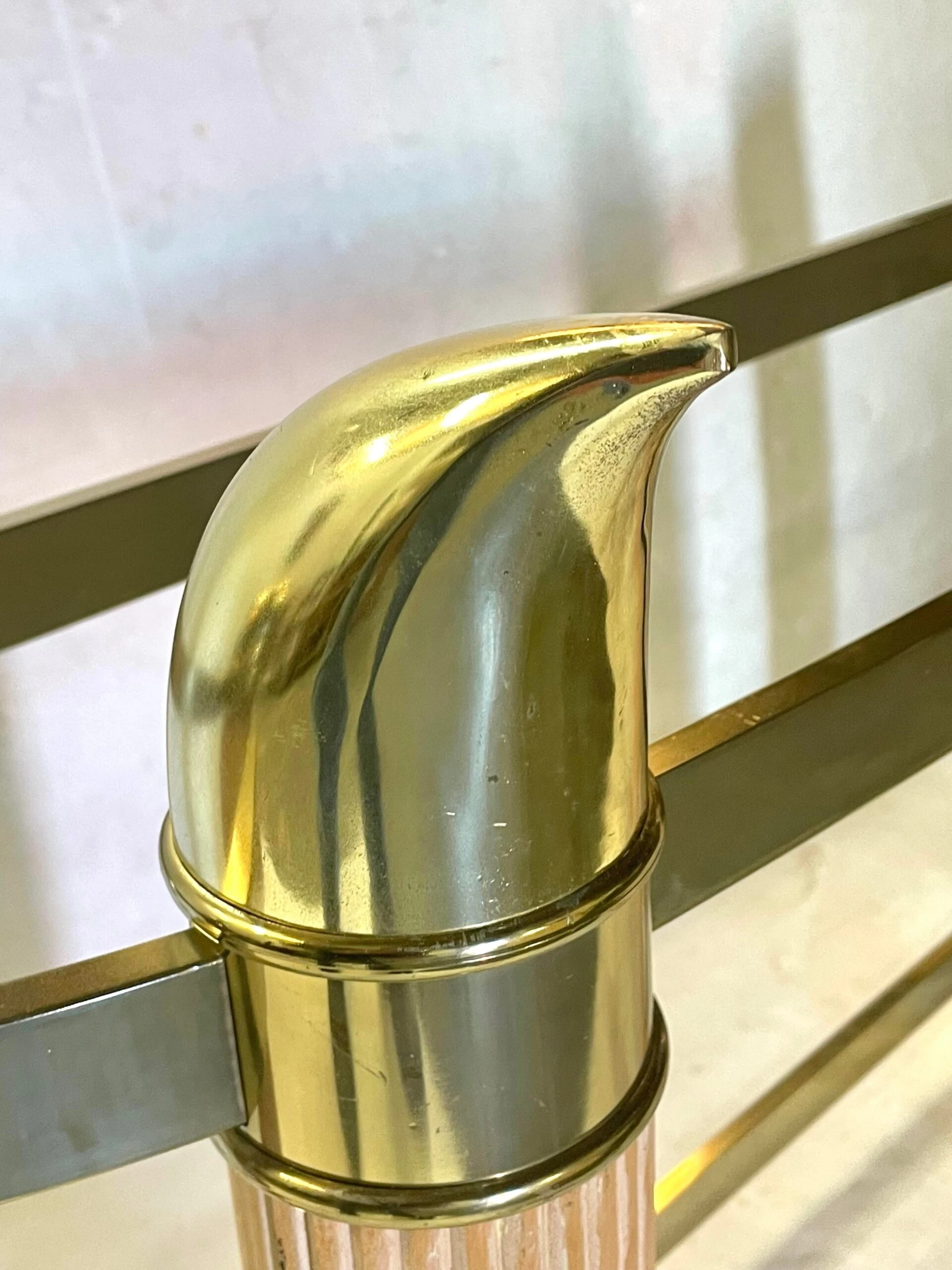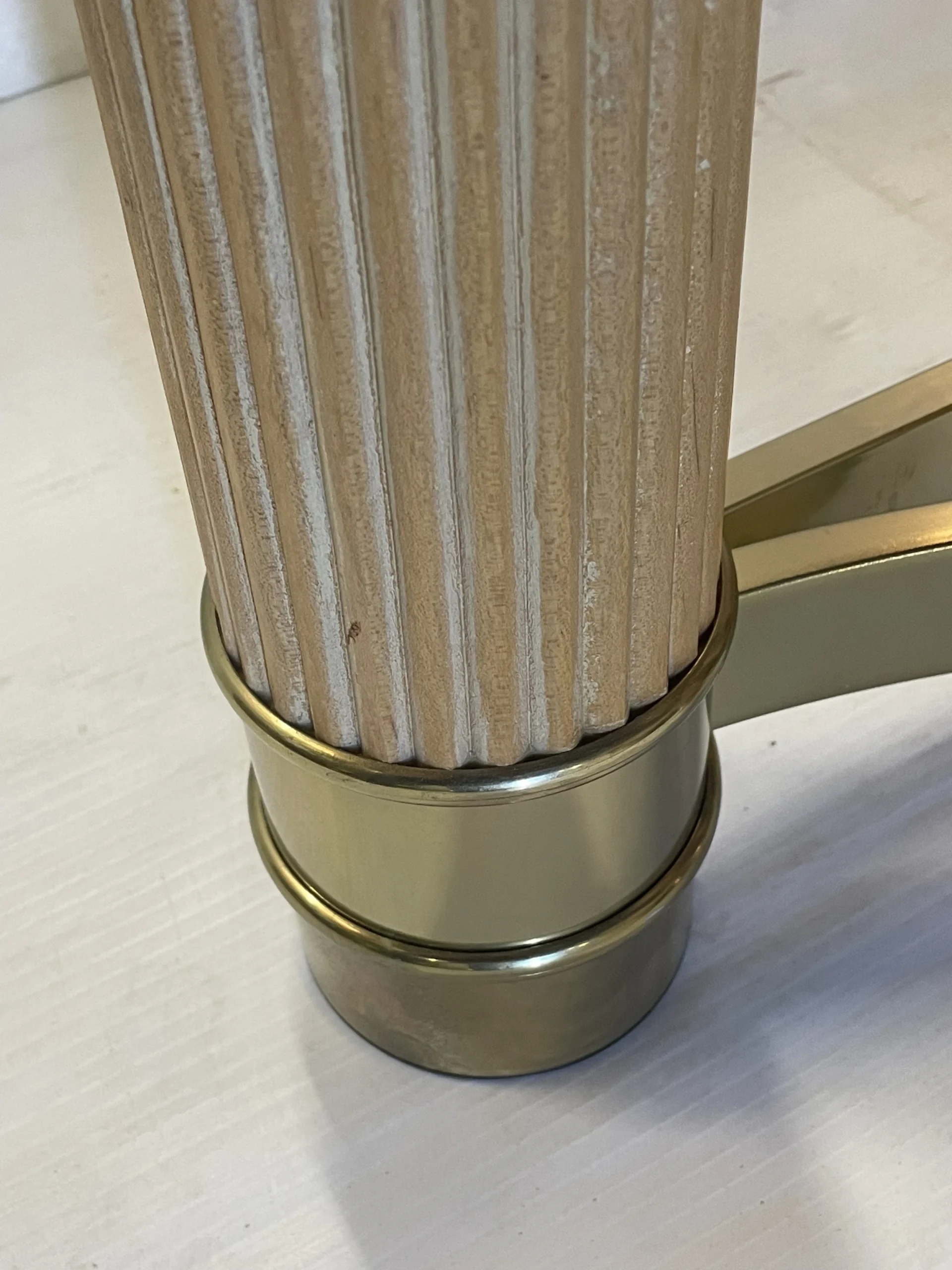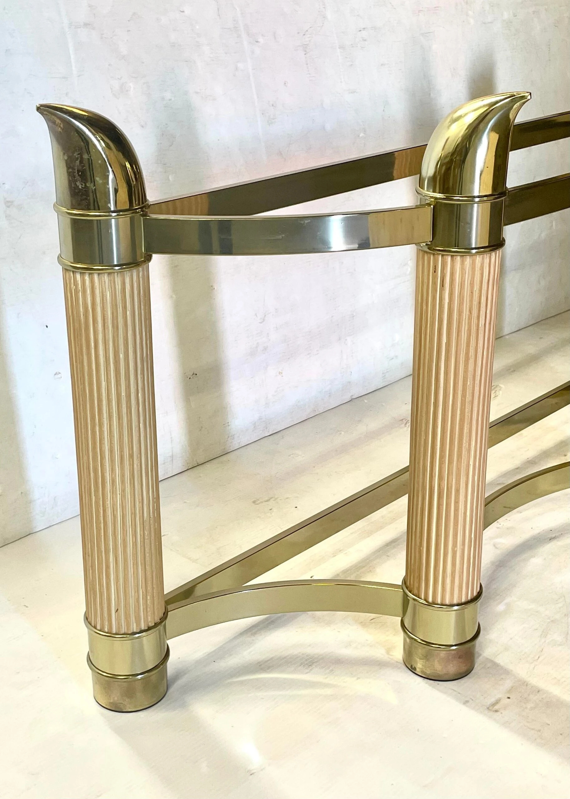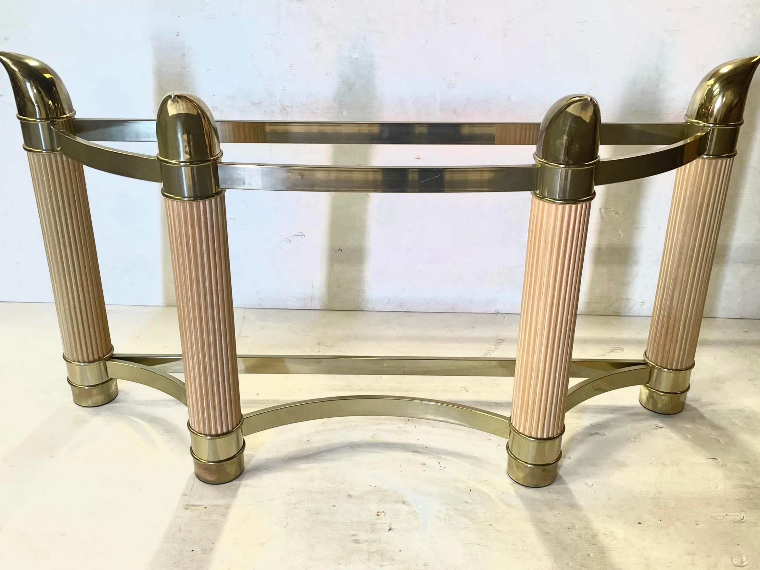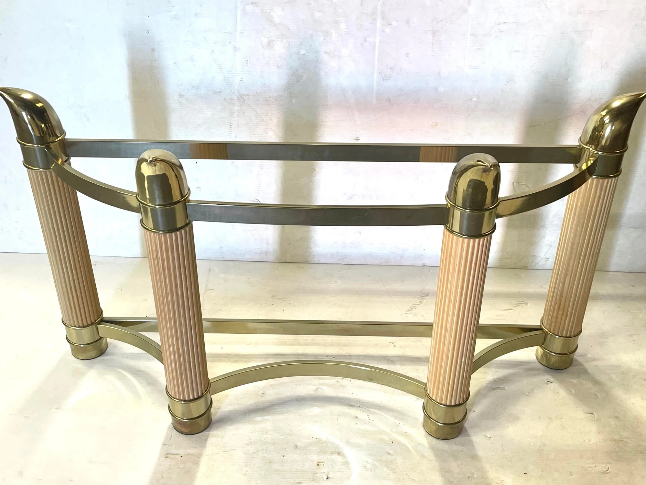 Vintage 1970’s. The classic elephant trunk design after Tommaso Barbi. Brass & wood in a Demilune form. Measures 27″ x 15″ x 51″ wide. BASE ONLY. Add your own glass or lacquered wood top and truly a wonderful addition to the finest modern Hollywood Regency interior. Nationwide shipping available Greg