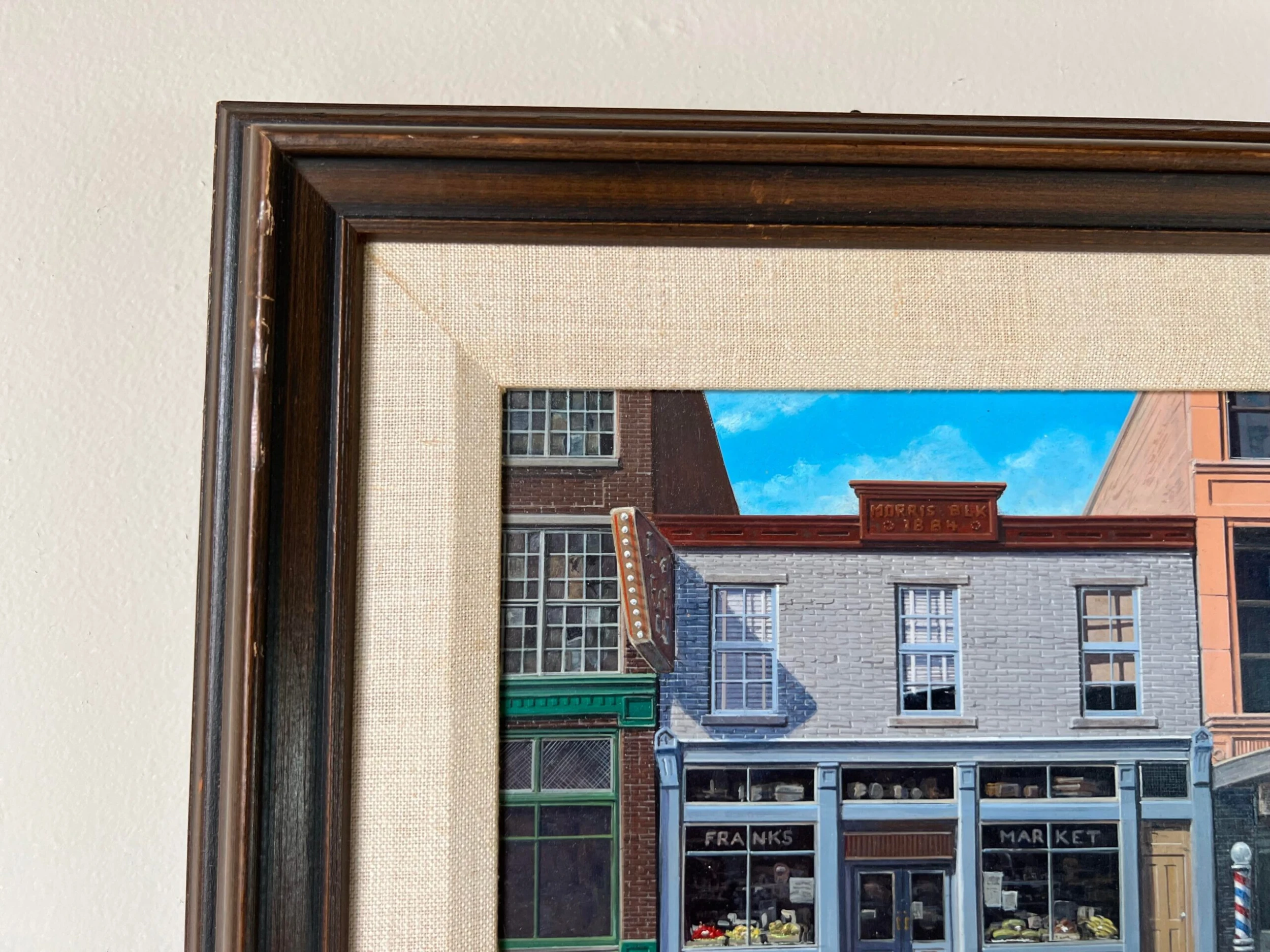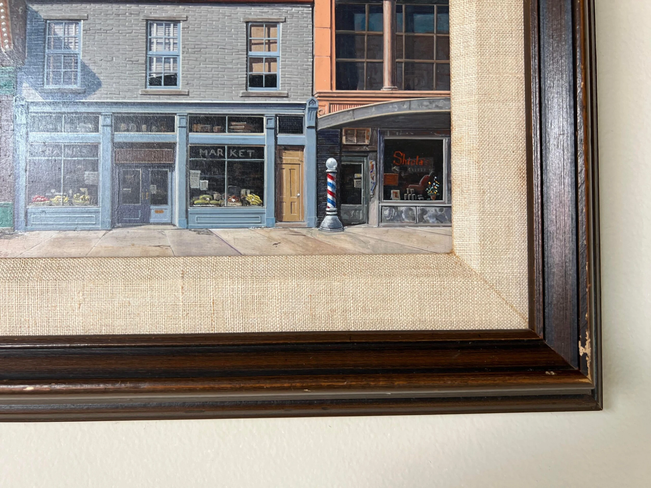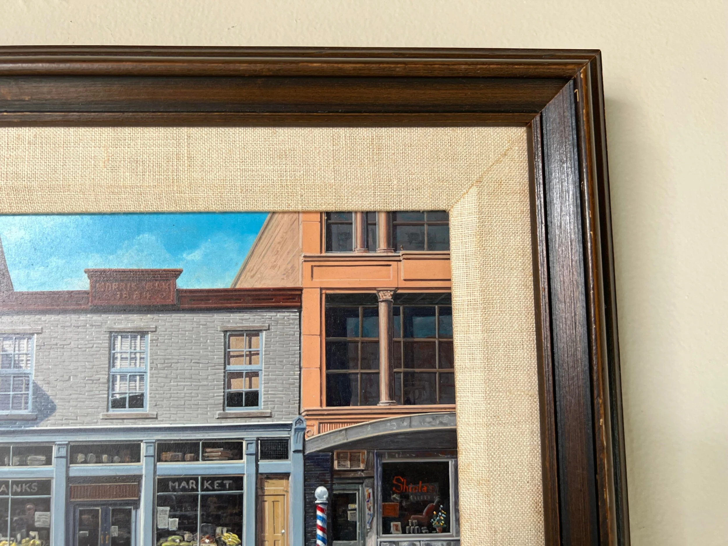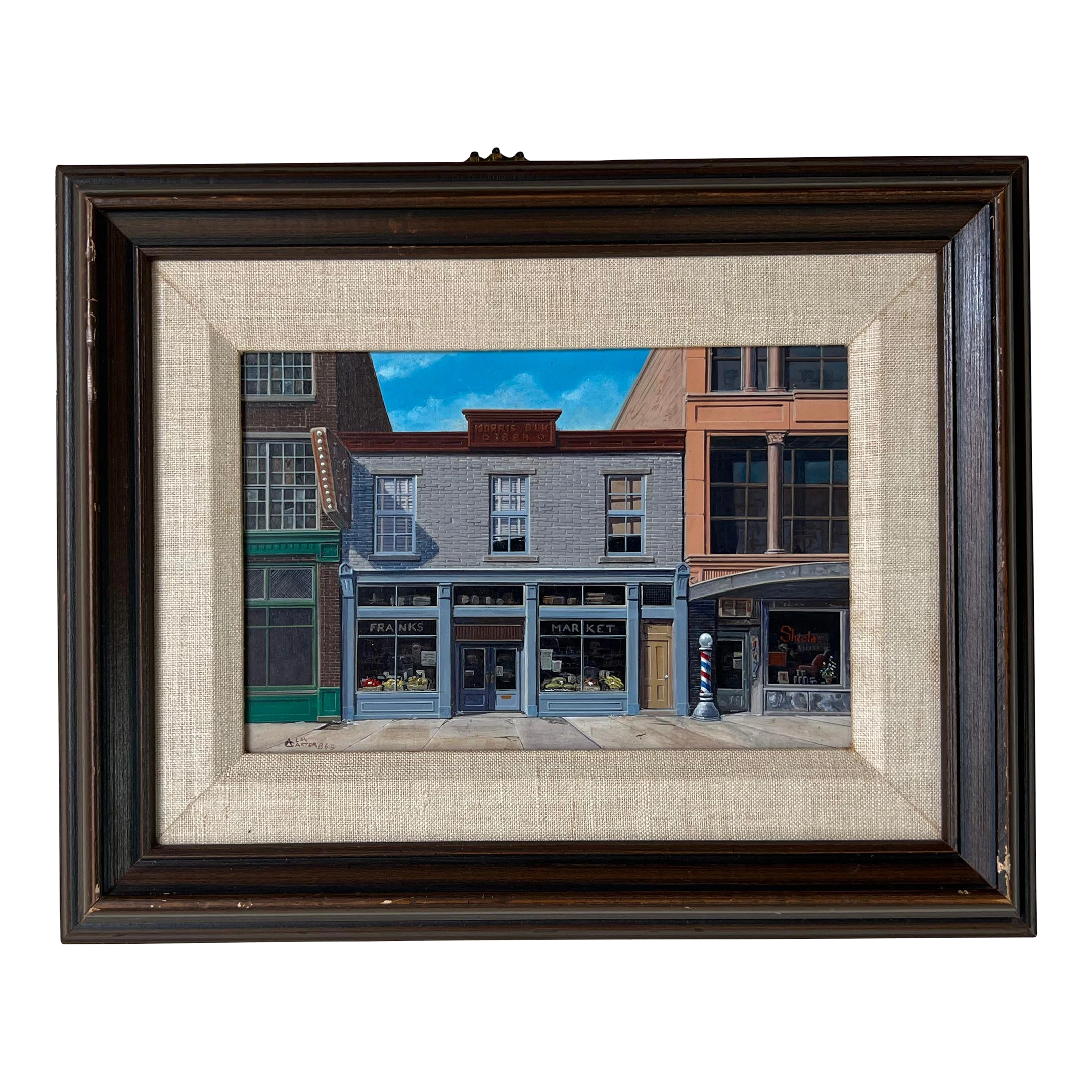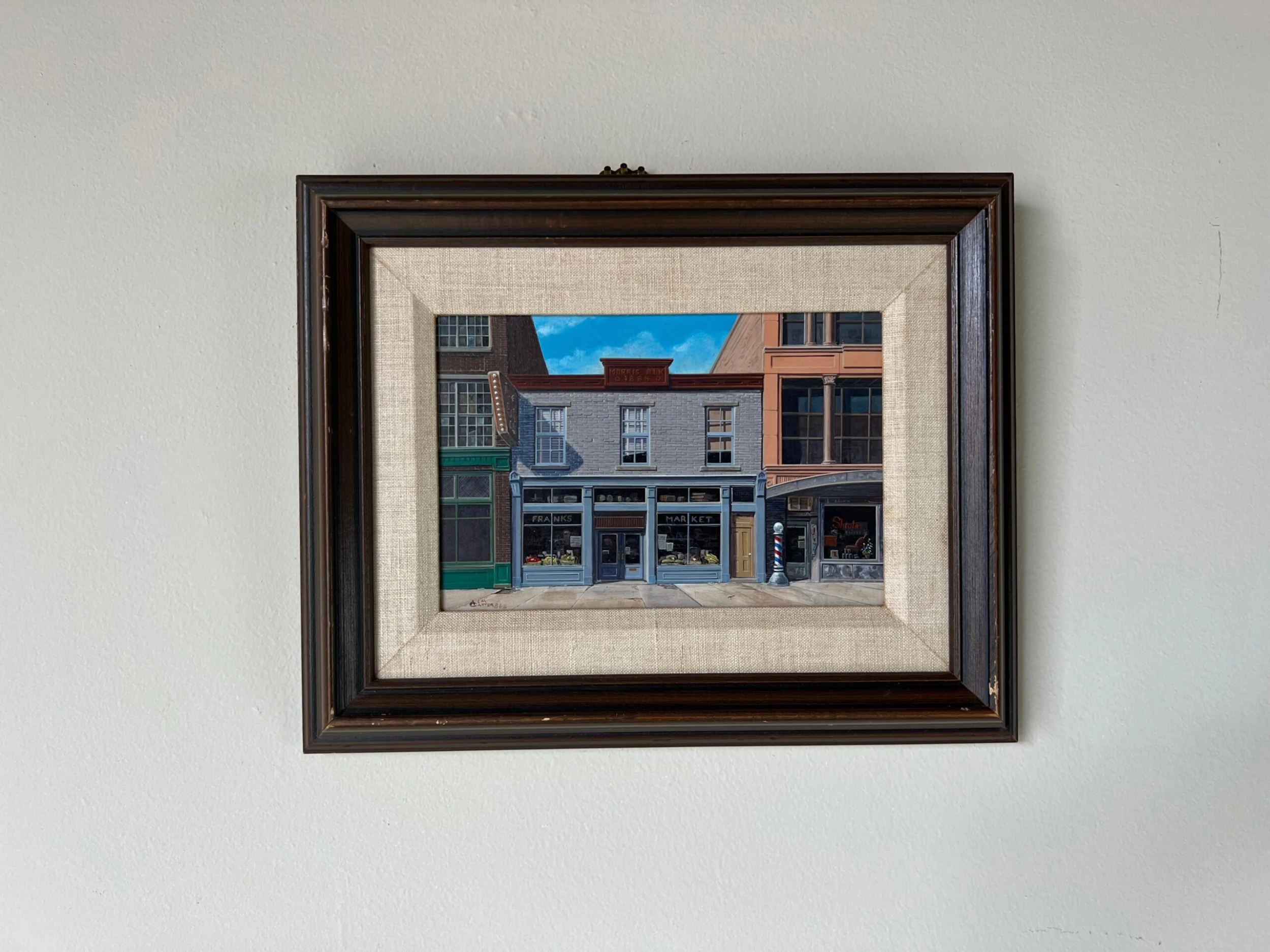 Beautiful Vintage Modernist abstract architectural colorful street scene oil painting by LAN A. CARTER. C, 1986. Yet these very contrasts of light and shadow, and the succession of verticals and horizontals, create the charged, almost theatrical, atmosphere of empty buildings on an unpopulated street at the beginning of the day.