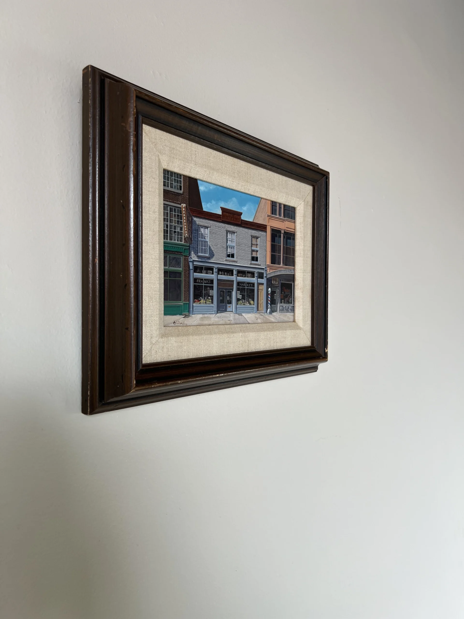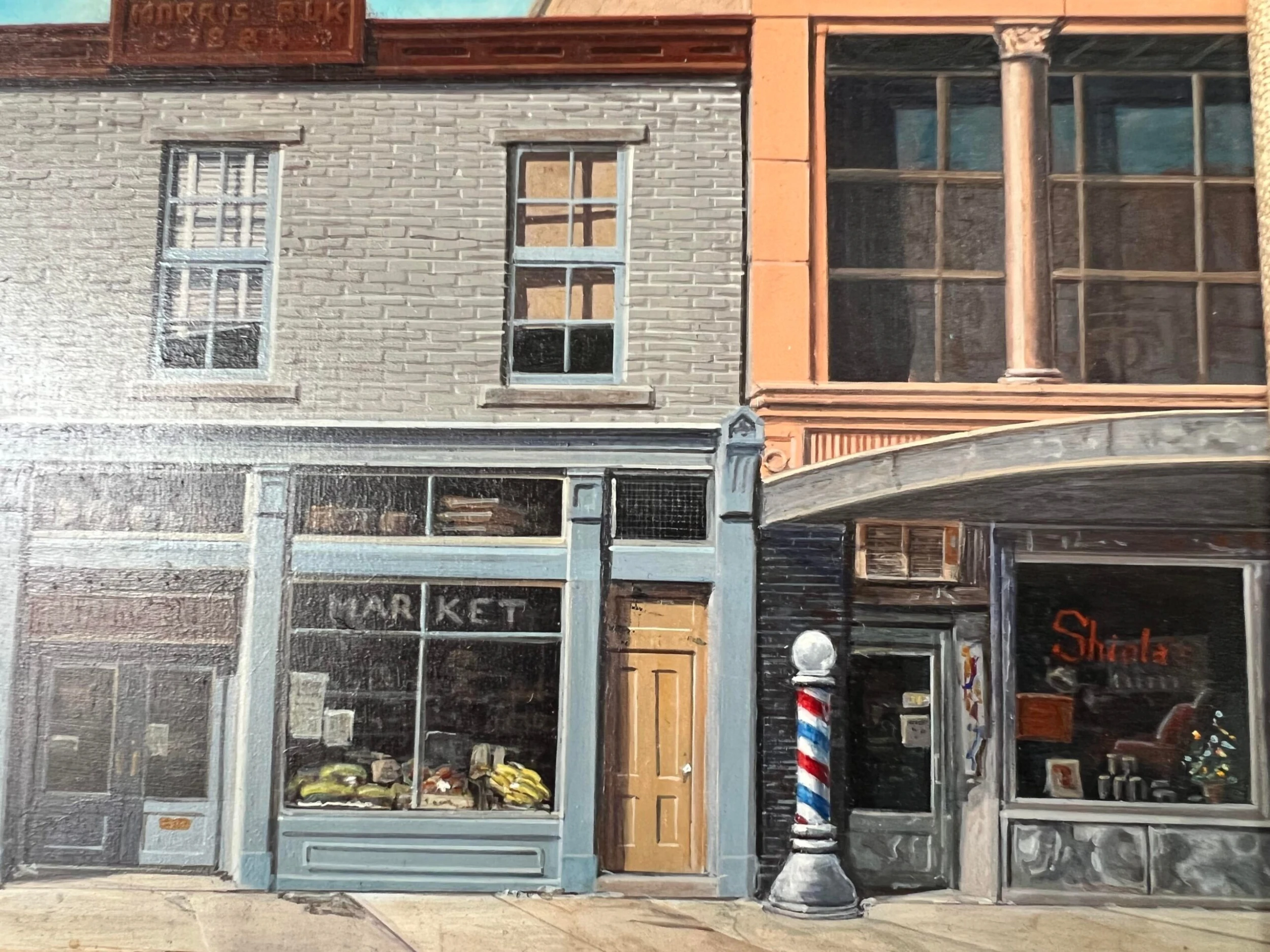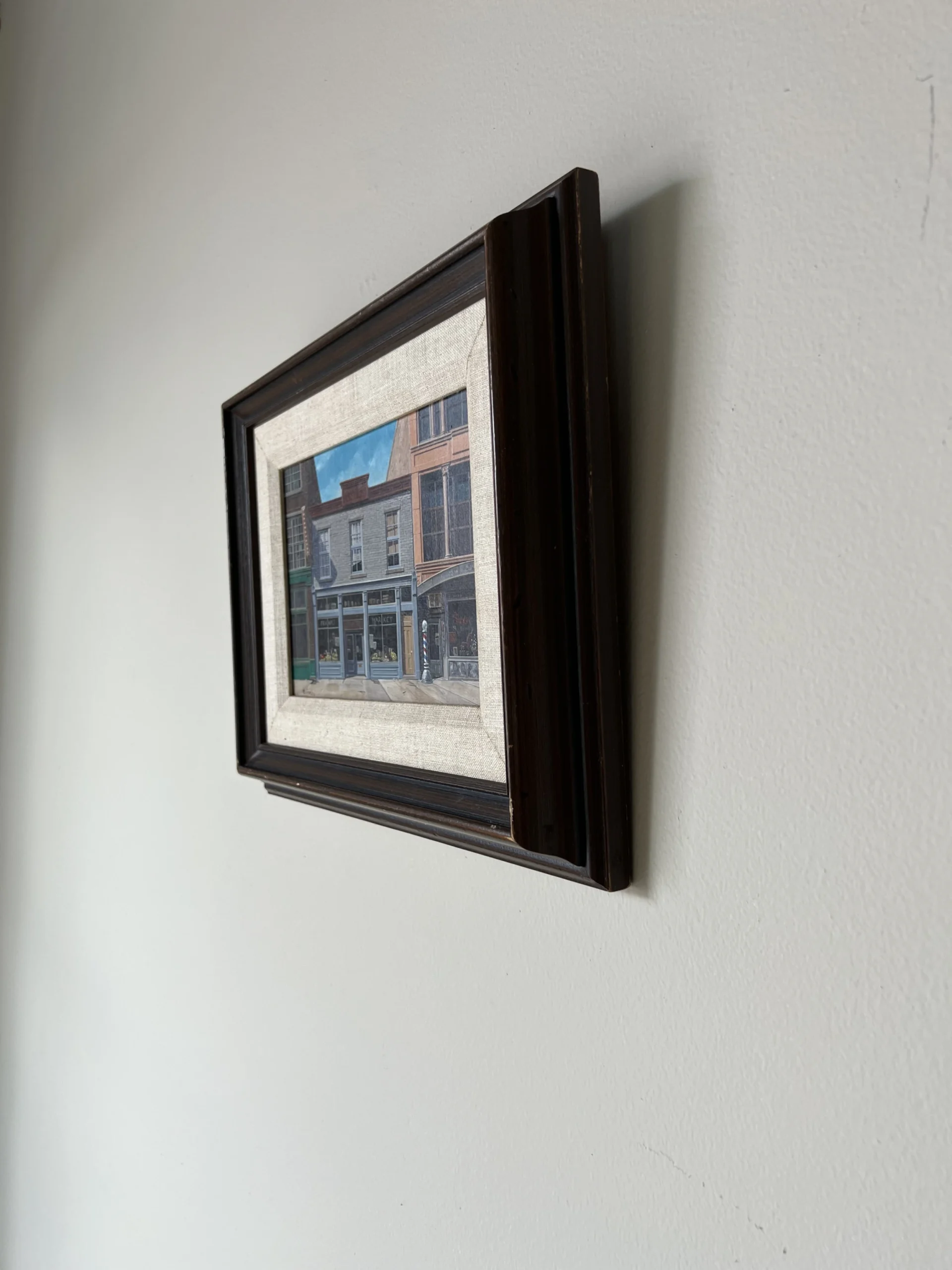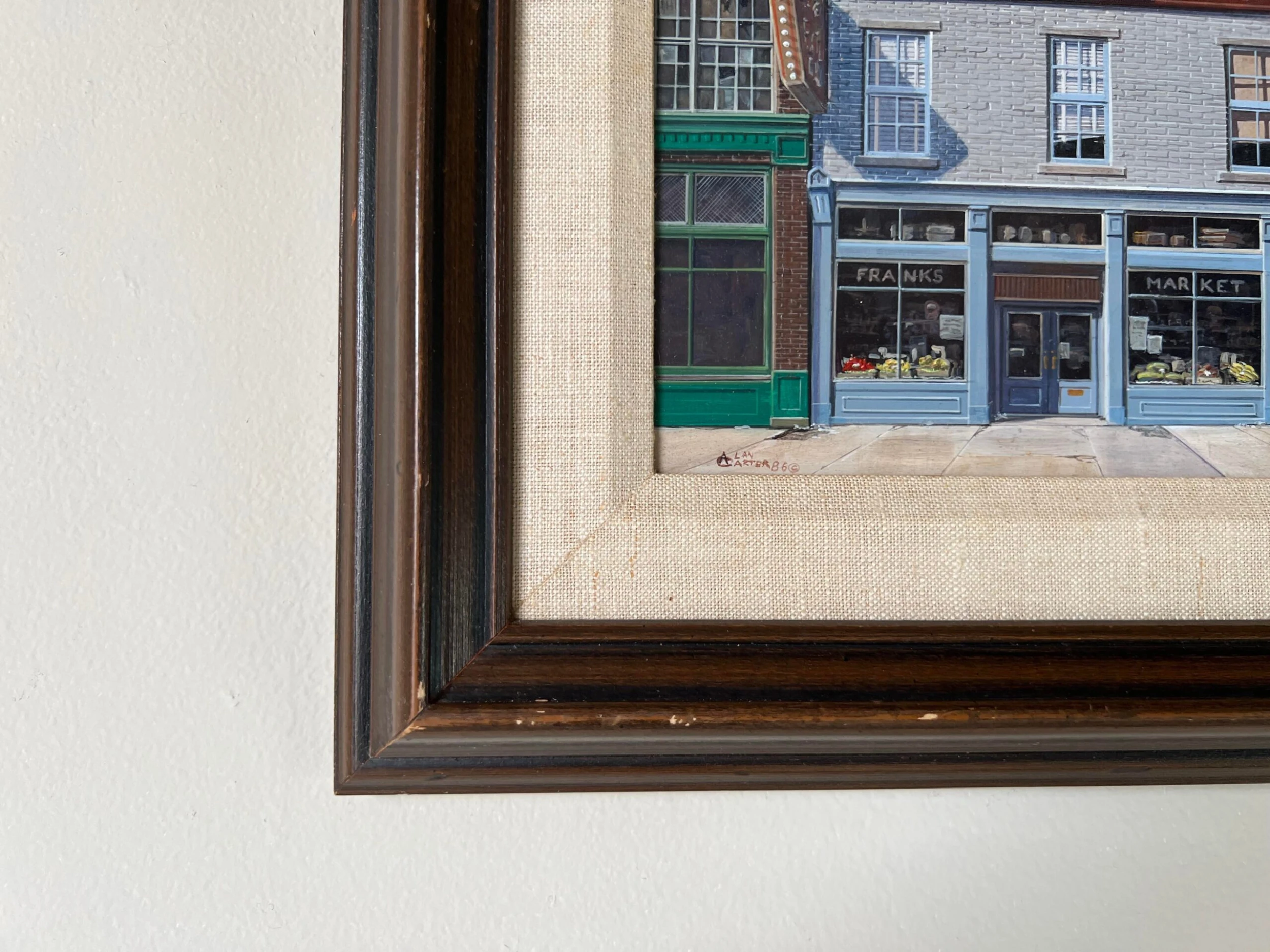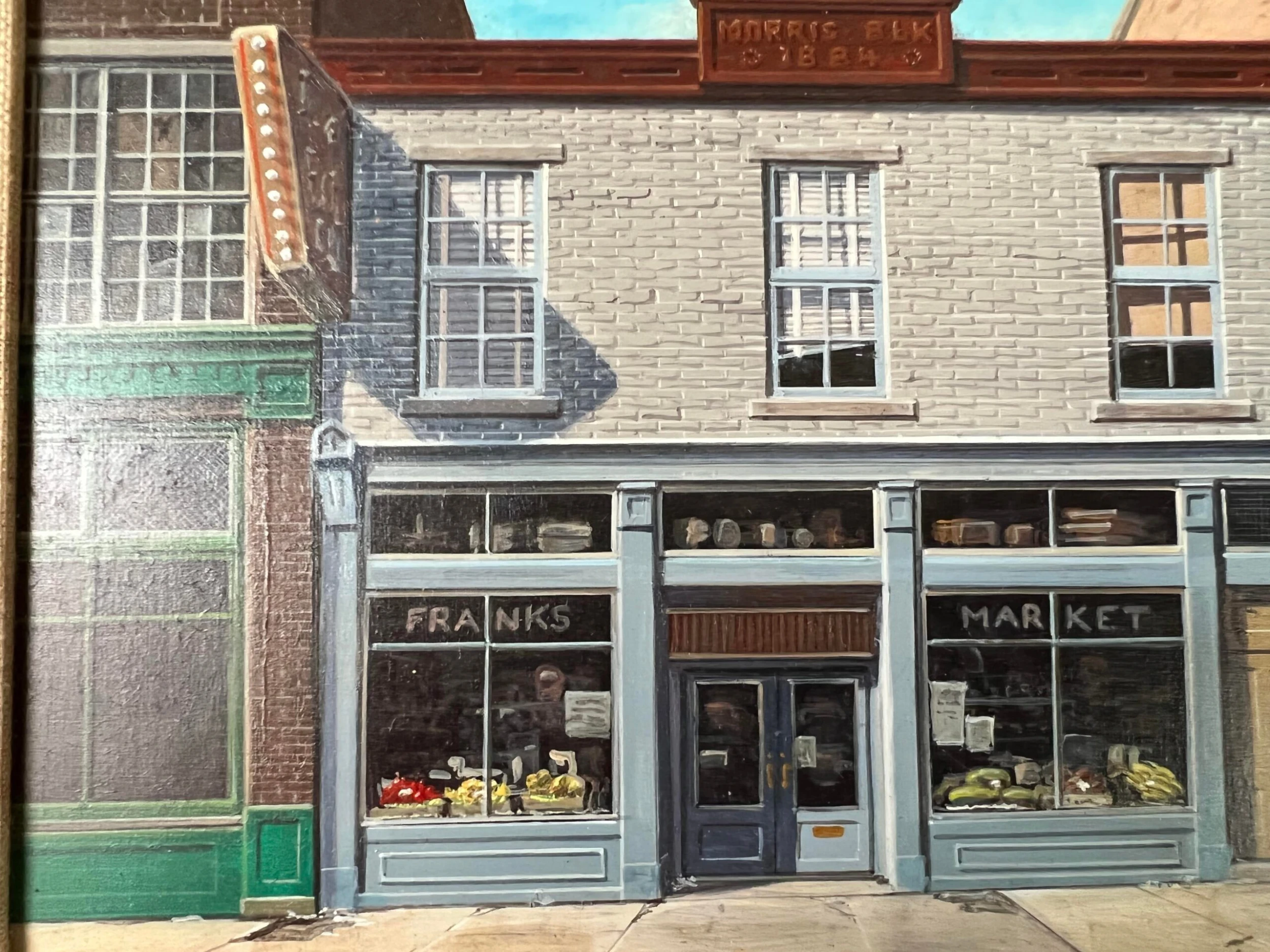 Beautiful Vintage Modernist abstract architectural colorful street scene oil painting by LAN A. CARTER. C, 1986. Yet these very contrasts of light and shadow, and the succession of verticals and horizontals, create the charged, almost theatrical, atmosphere of empty buildings on an unpopulated street at the beginning of the day.