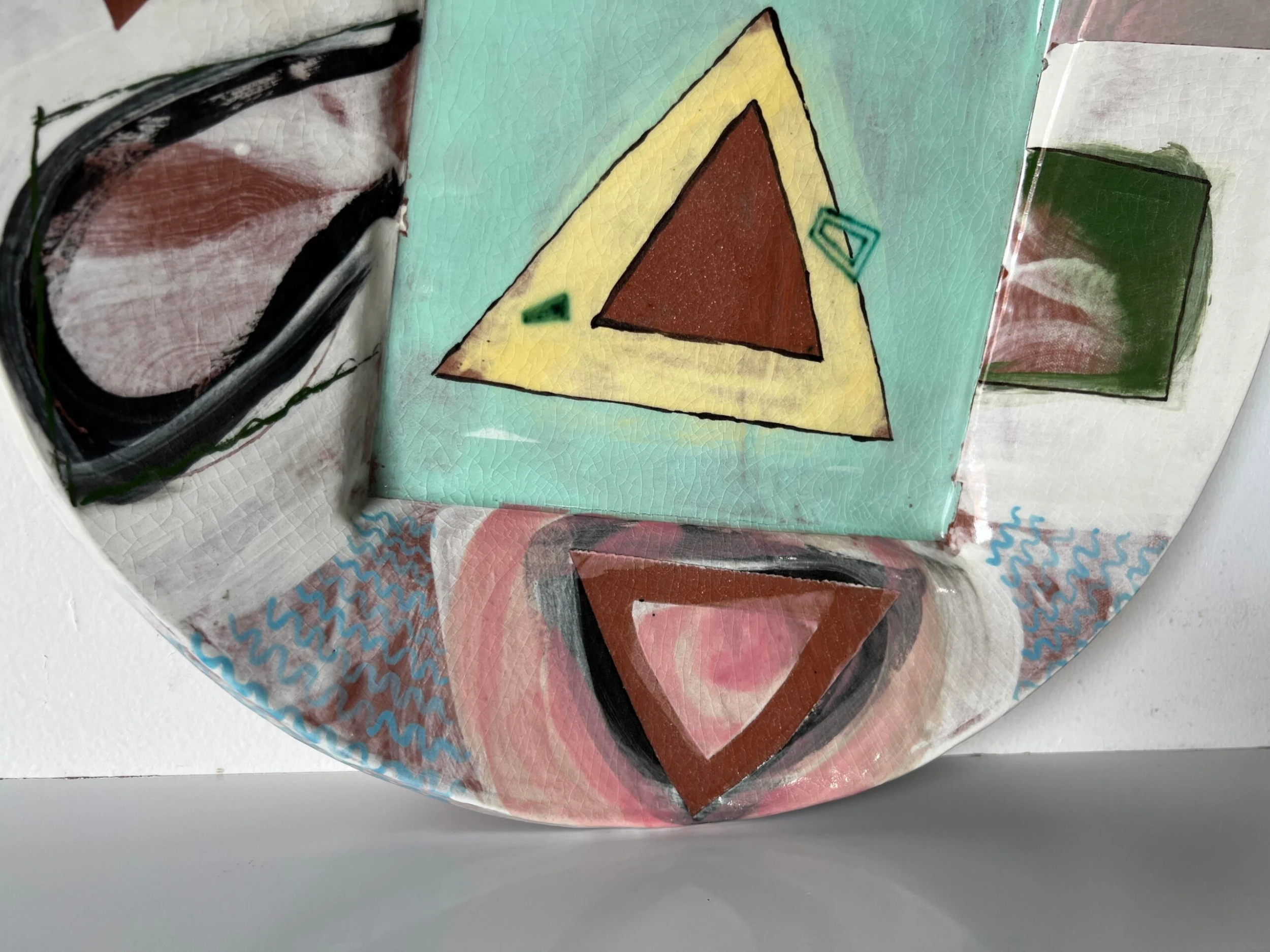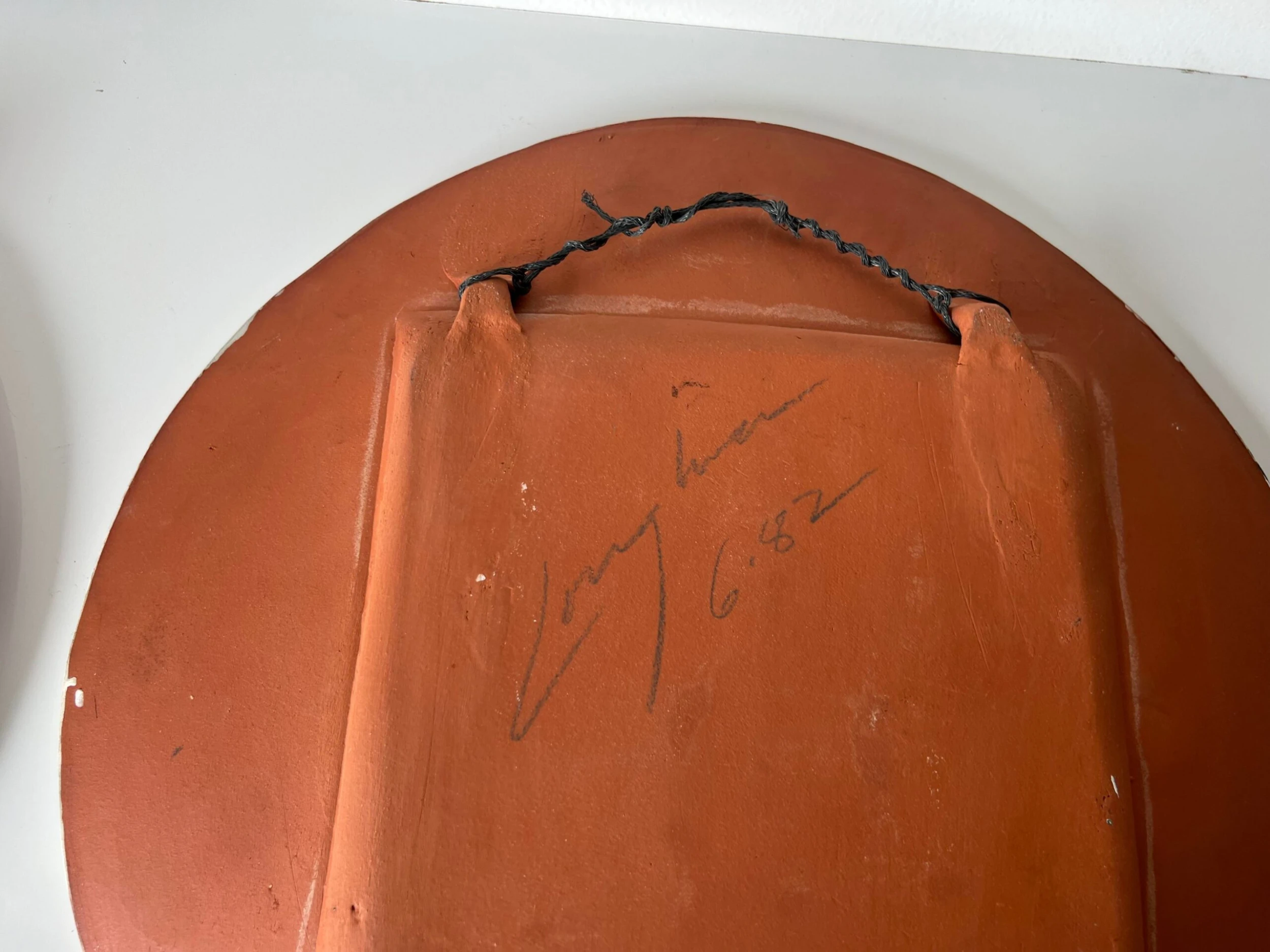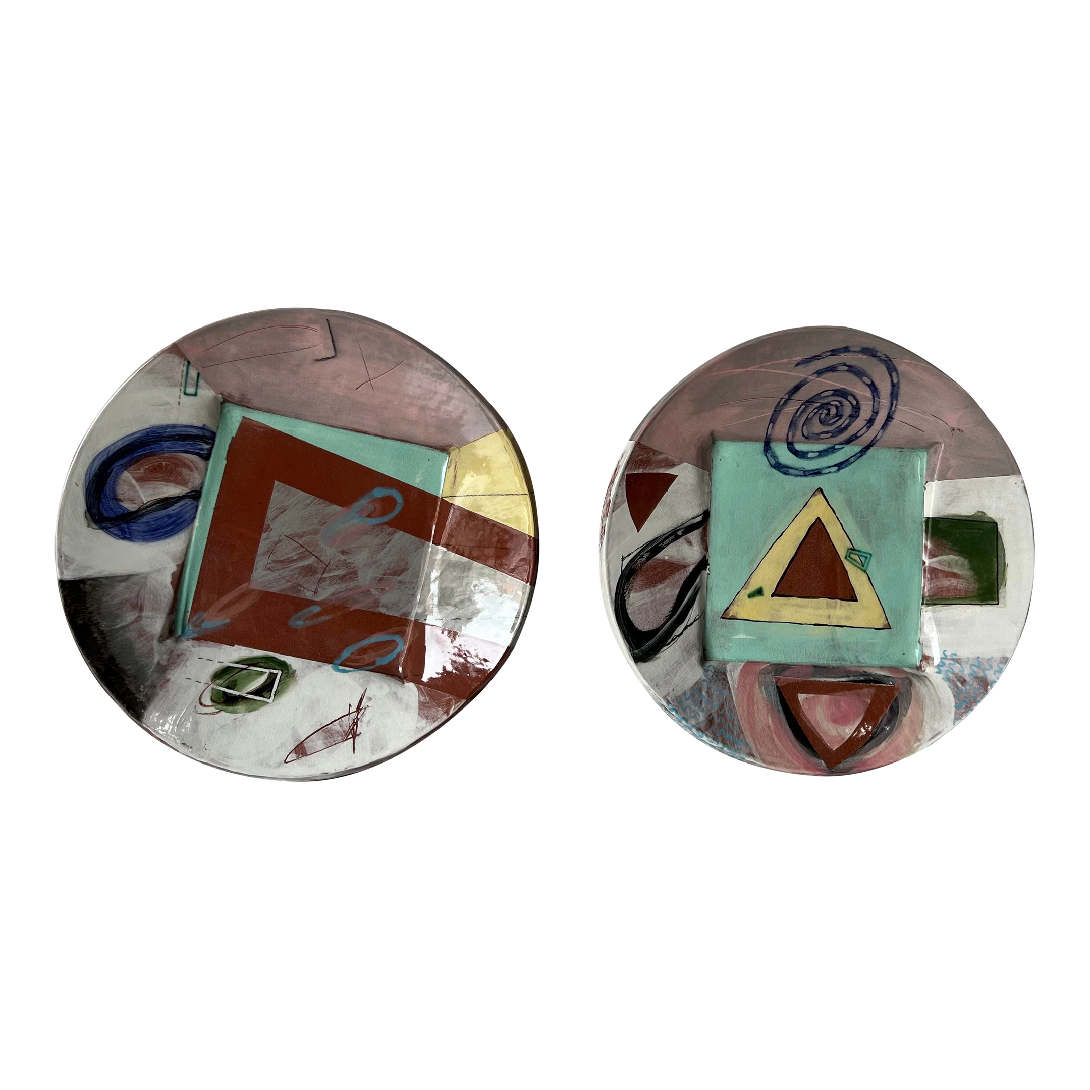 I’m pleased to offer for sale this magnificent pair of vintage Postmodern style hand painted decorative wall art pottery plates. The hand painted practice modernist with beautiful colors is on full display on this wall art plates made by ceramic artist Larry H. Date of 1982. Signed .