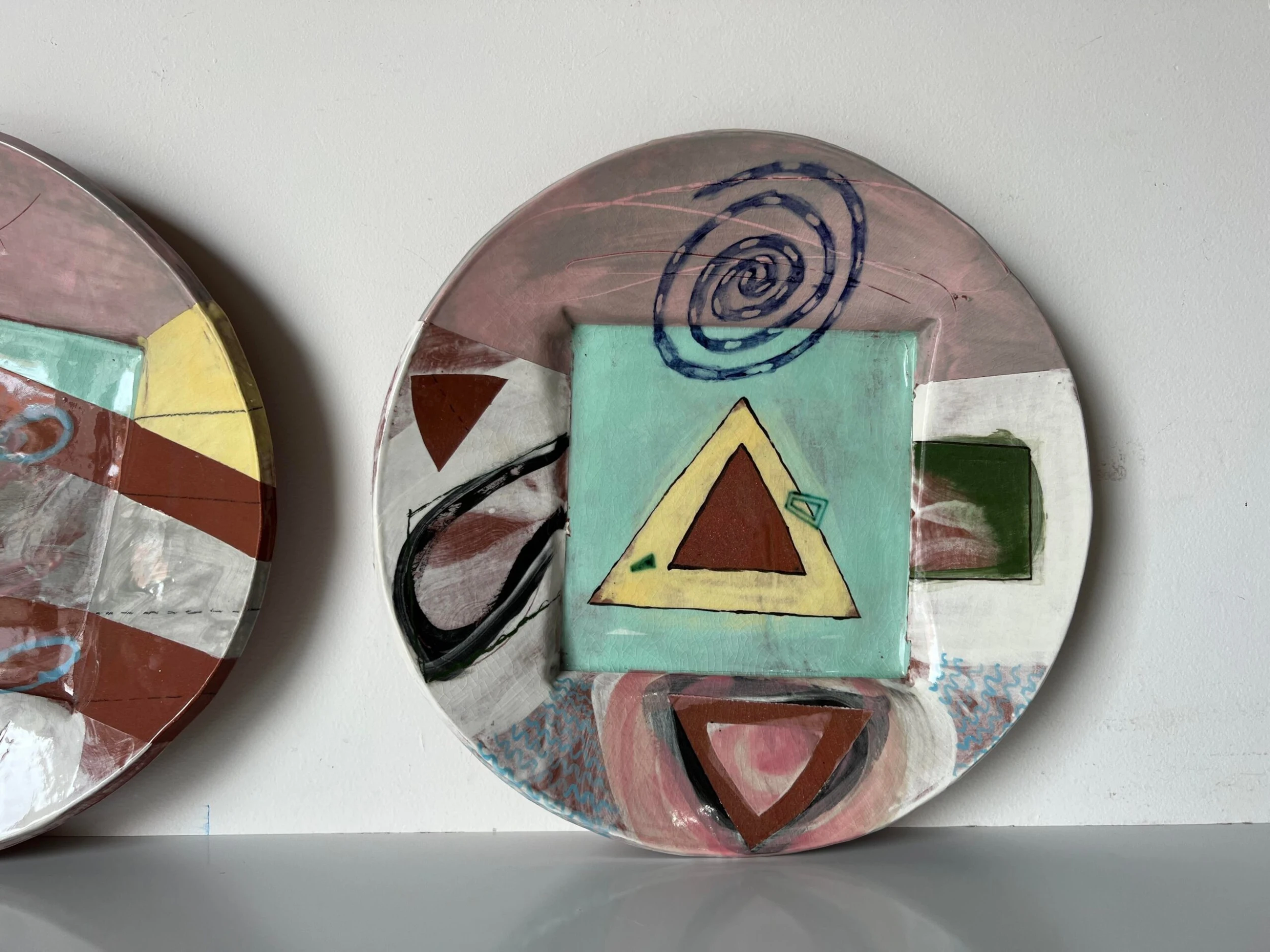 I’m pleased to offer for sale this magnificent pair of vintage Postmodern style hand painted decorative wall art pottery plates. …