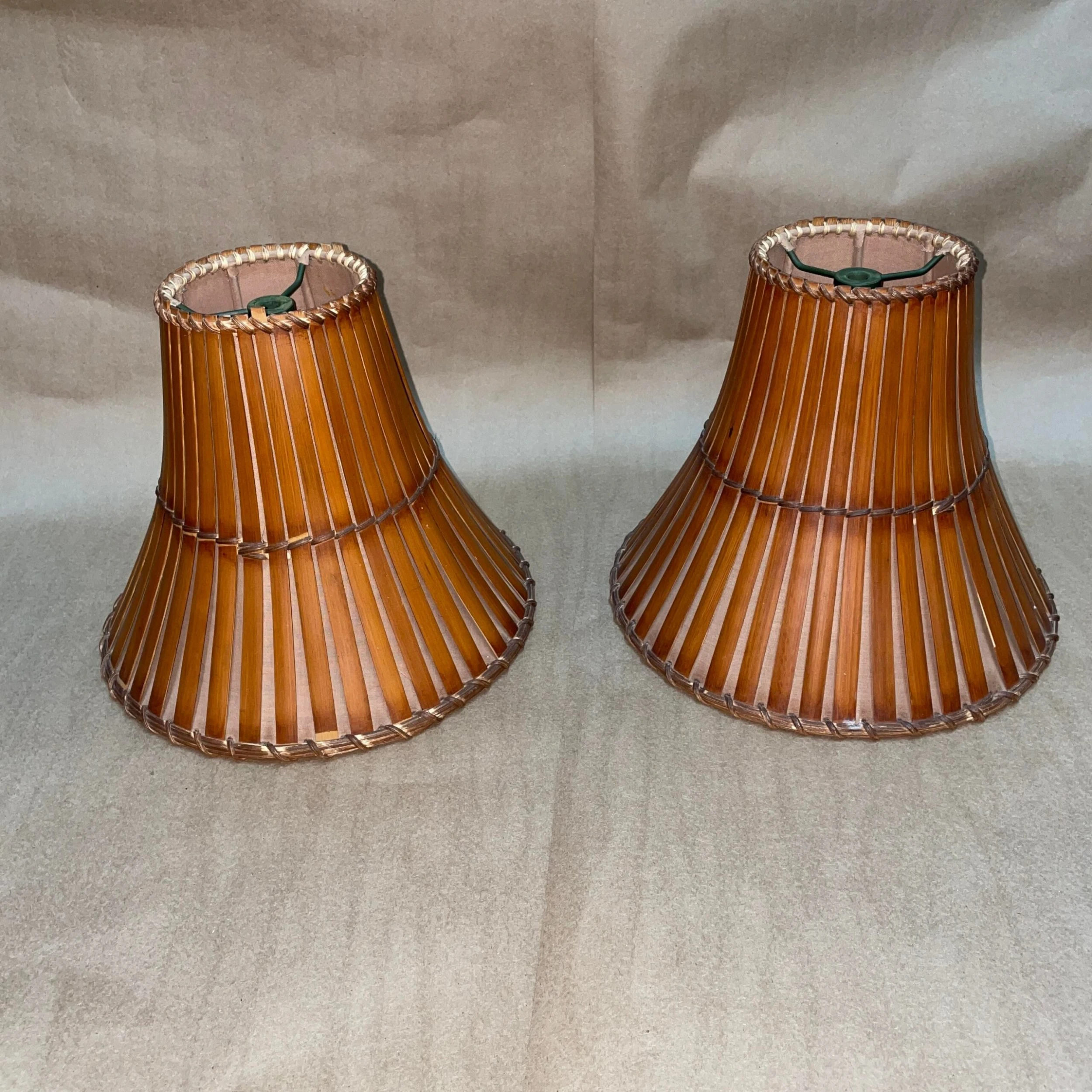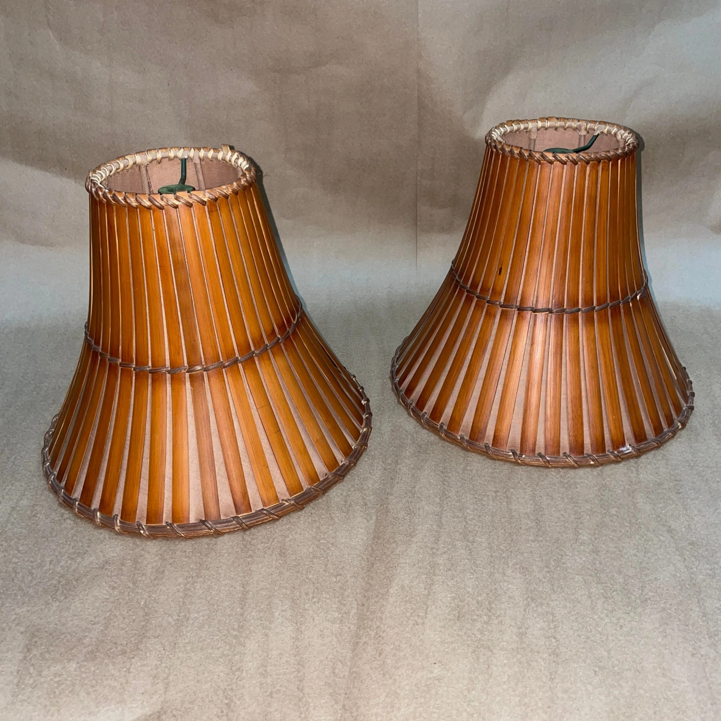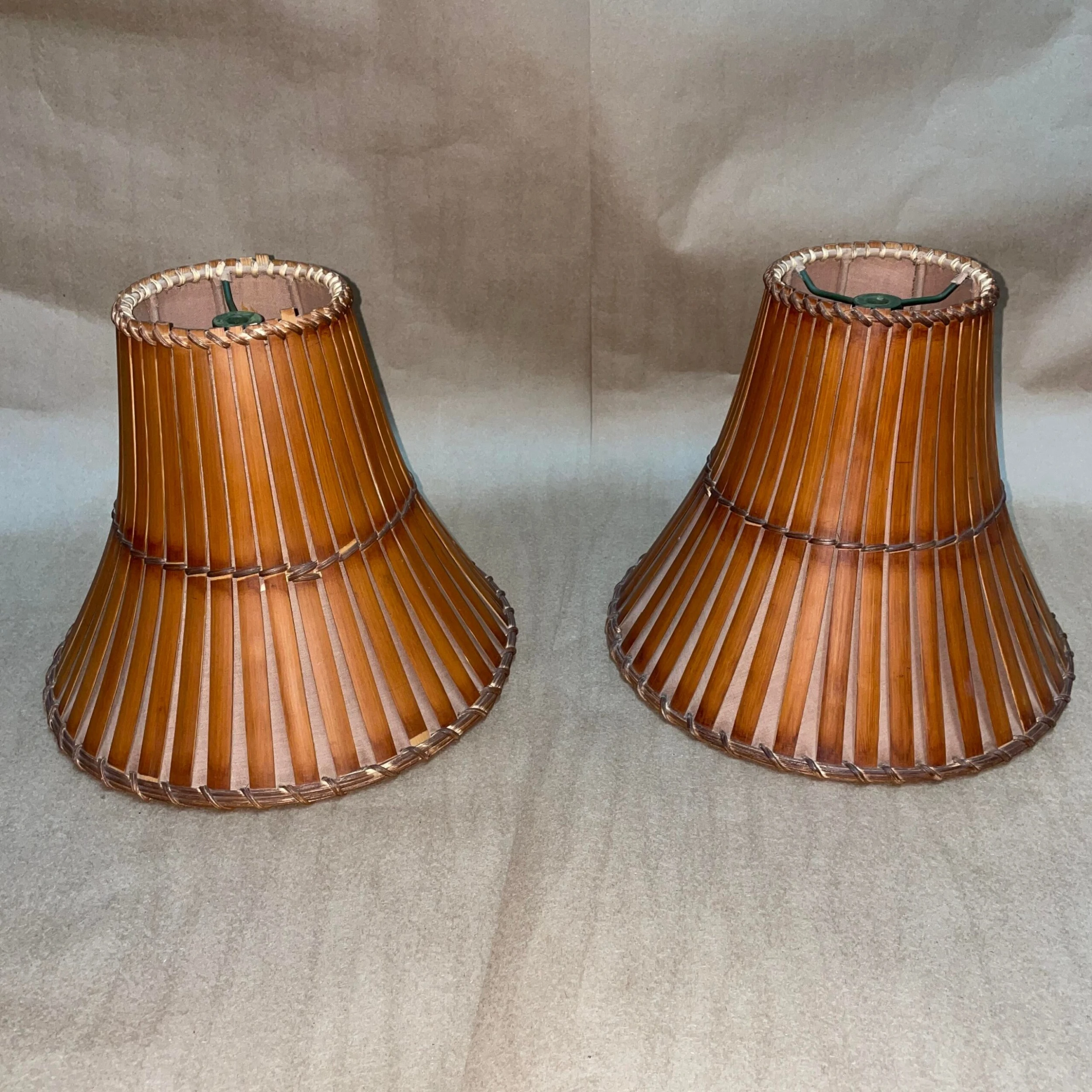 Up for grabs is a pair of rattan / bamboo lampshades that are fabric lined. The bamboo on both shades are in good condition. One strip of bamboo on one shade showing some light wear. There is also a spot on the fabric portion of one shade. Otherwise both are in fantastic shape. The weaving is still taut on both shades. I have a pair of finials in another listing that match the shades, if you’re interested check my other listings for it.