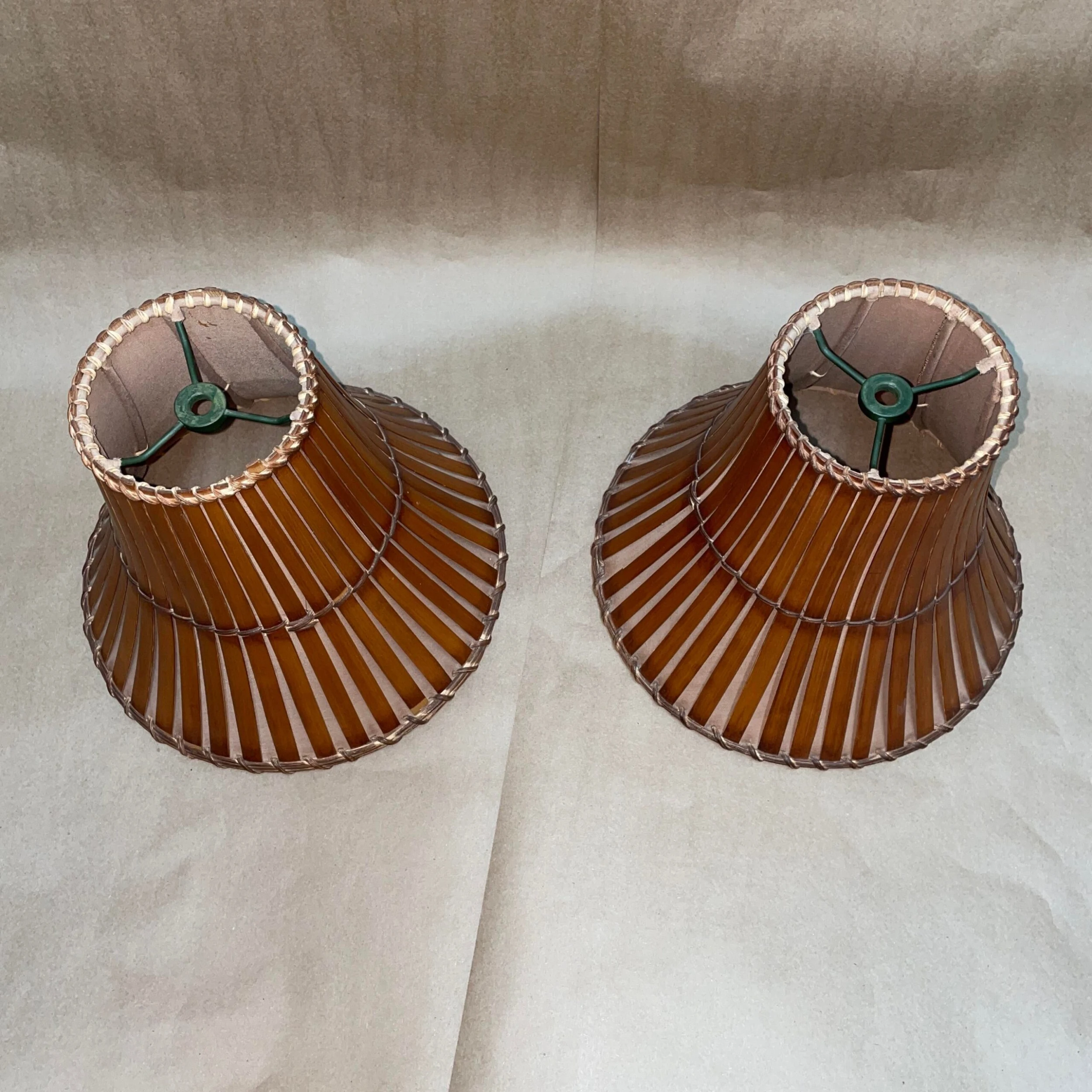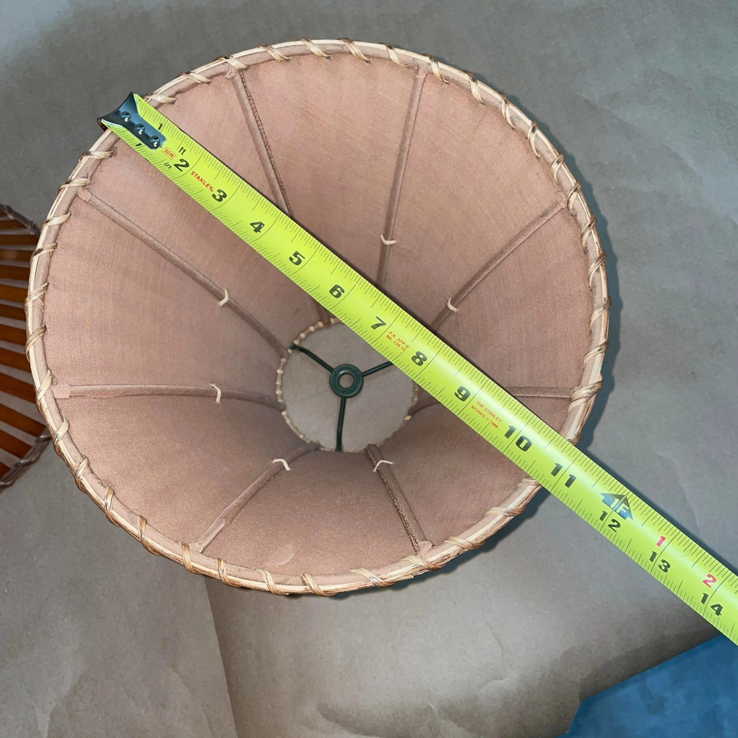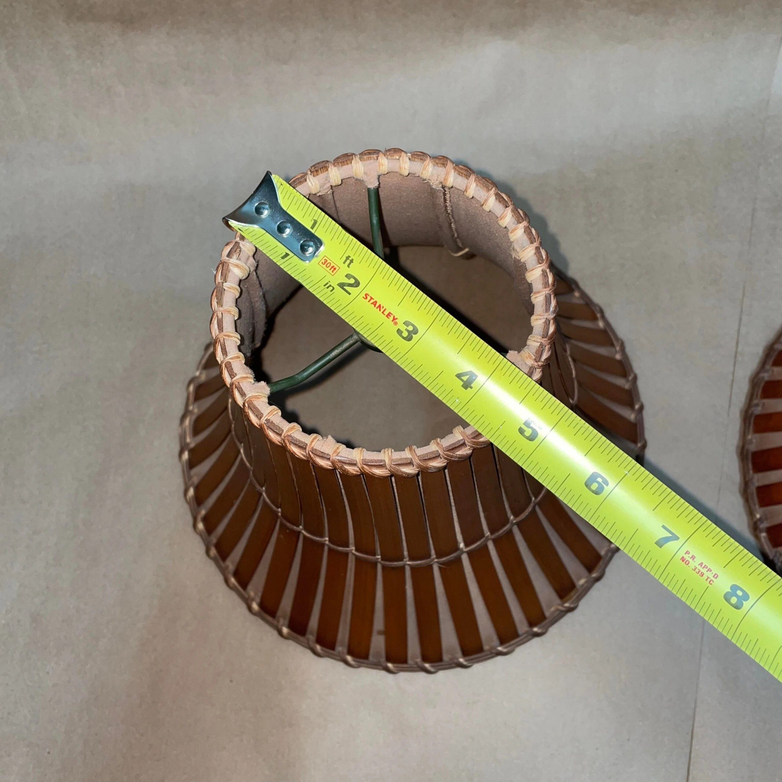 Up for grabs is a pair of rattan / bamboo lampshades that are fabric lined. The bamboo on both shades are in good condition. One strip of bamboo on one shade showing some light wear. There is also a spot on the fabric portion of one shade. Otherwise both are in fantastic shape. The weaving is still taut on both shades. I have a pair of finials in another listing that match the shades, if you’re interested check my other listings for it.