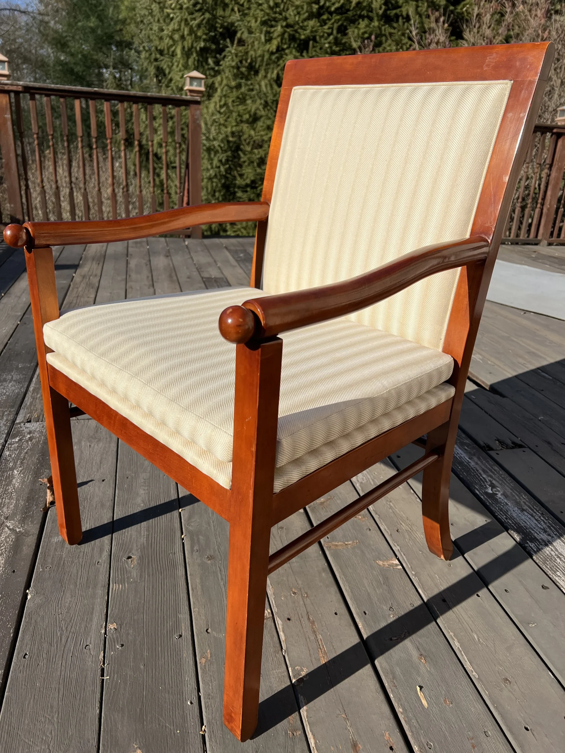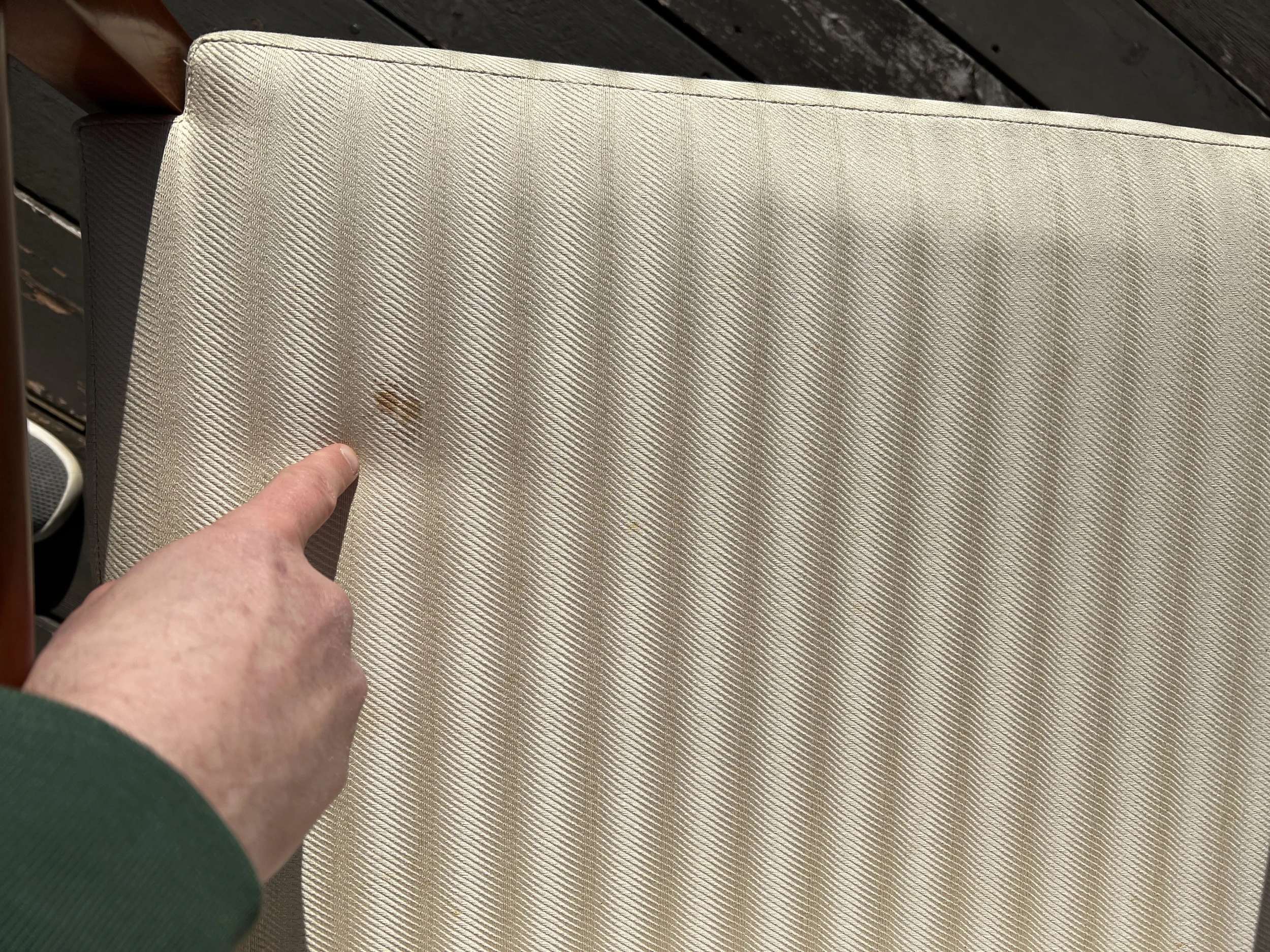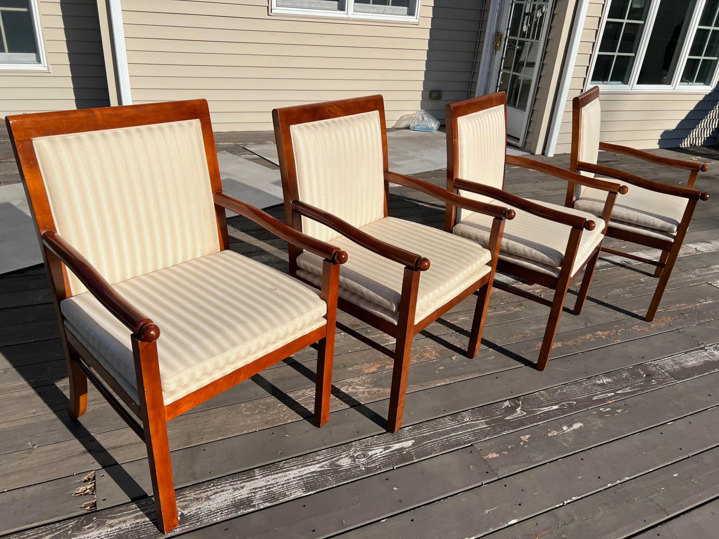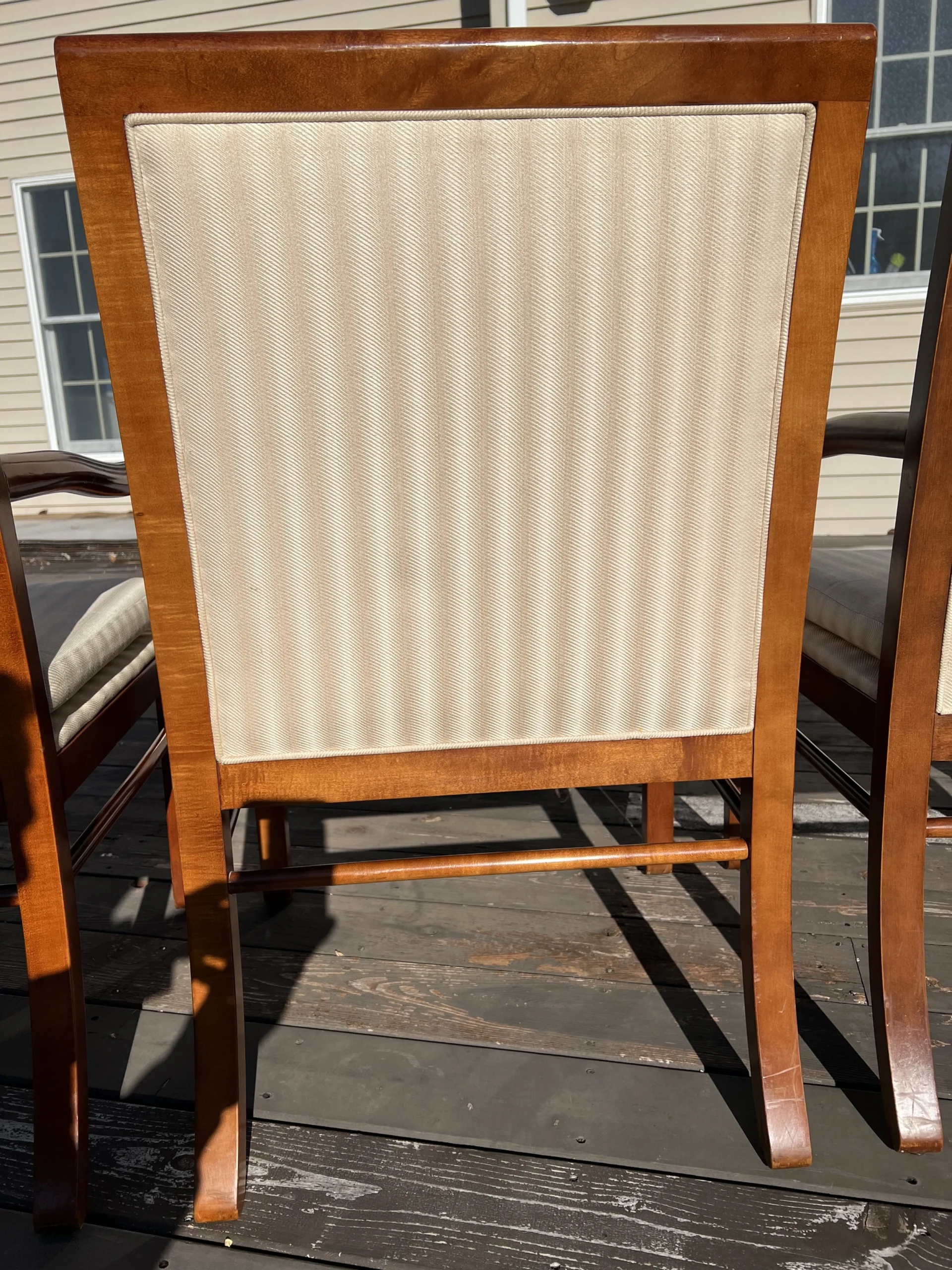 Condition is very good, but consistent with age and use. The mahogany frame has minor scratches, dents, dings and finish loss or discoloration, mainly on the bottom of the legs. The fabric has meaningful staining which is apparent given the light color pattern, however most stains are fairly small or lite. They need to be either professionally cleaned or reupholstered.