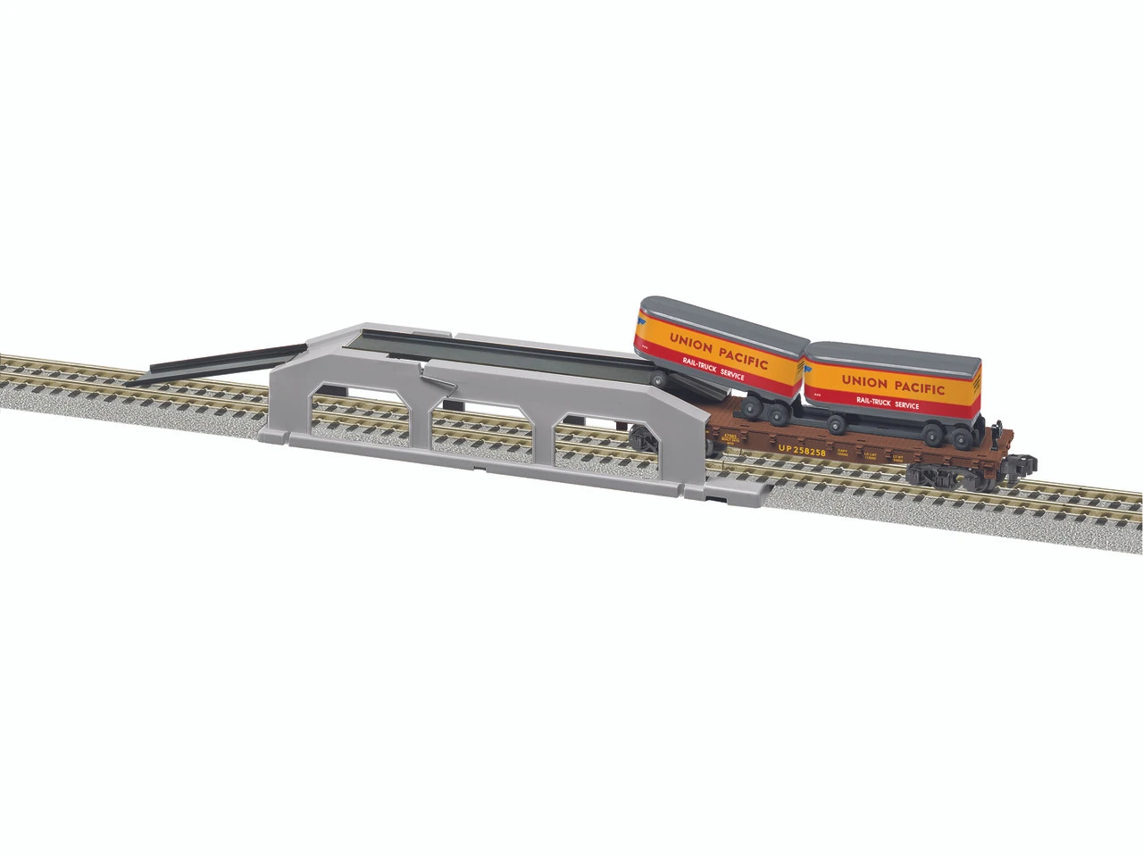Expand your intermodal operations with this new trailer and flatcar set!Flatcar comes equipped with a matching pair of trailers. Automatically unload your trailers with the ramp accessory by pushing the flatcar under the ramp!