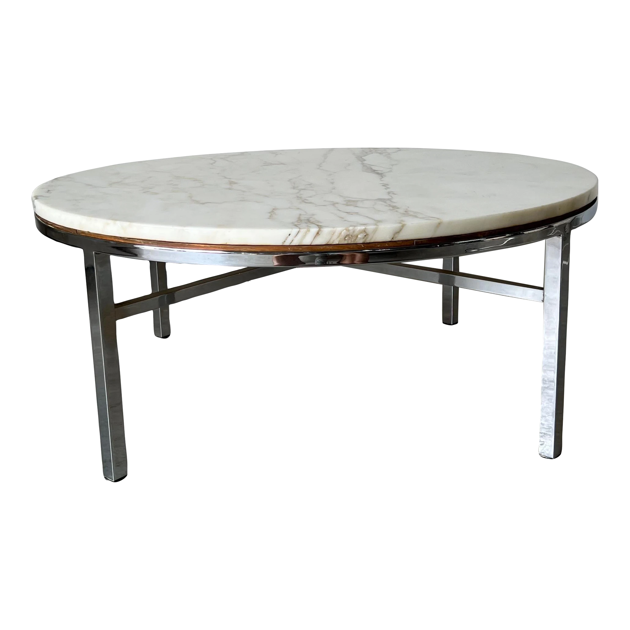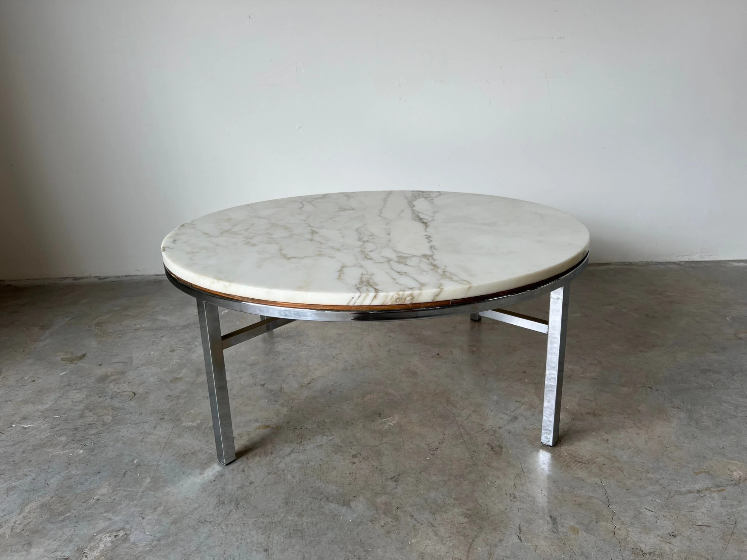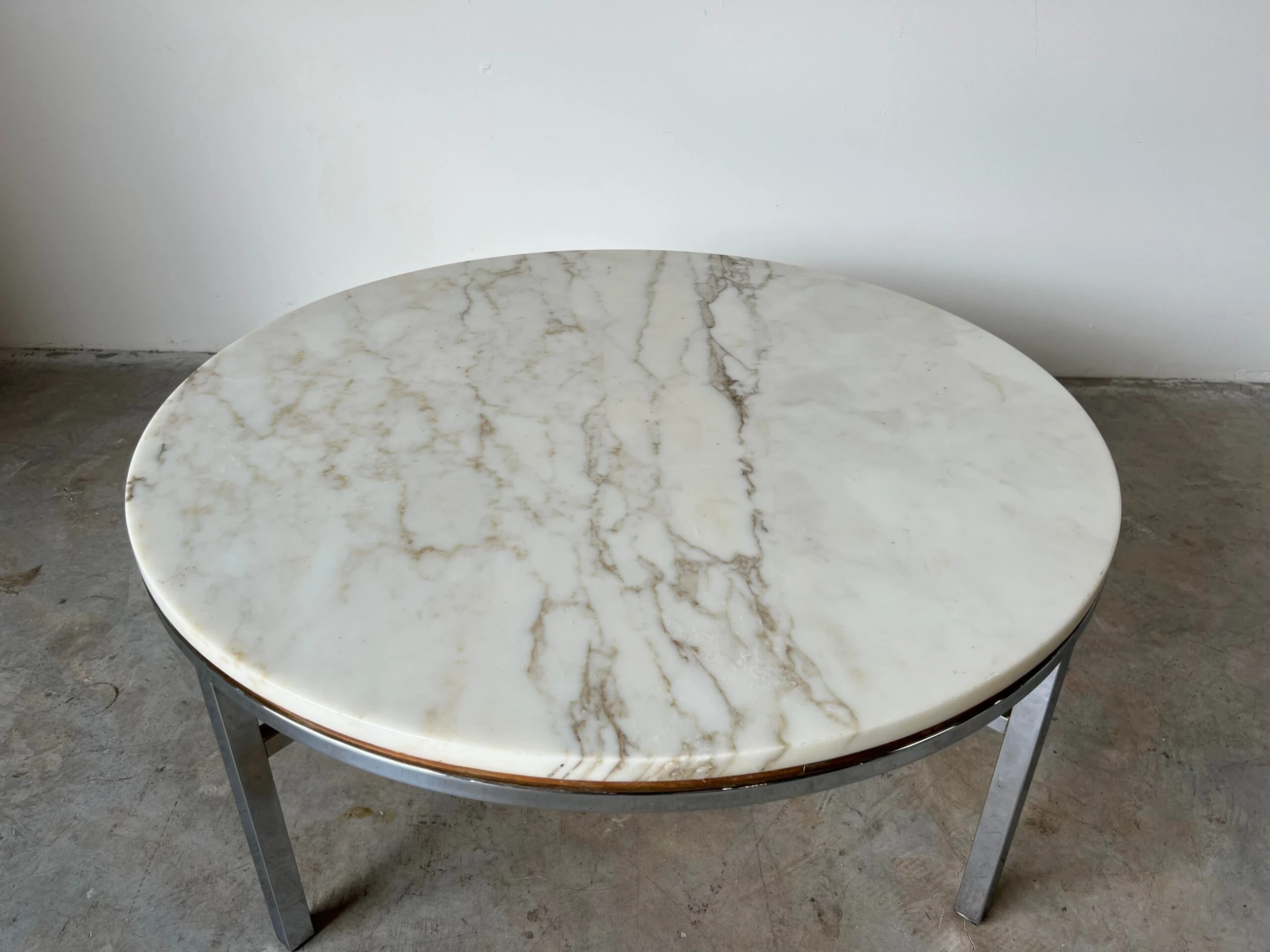 Available for sale this stunning modernist round coffee table, radiates pure Italian elegance. The table features a round white marble top and is architectural in its structure. The table rests on a round chrome base open frame. The shape of the table top combined with the geometrical slender chrome base is characteristic for Italian design .