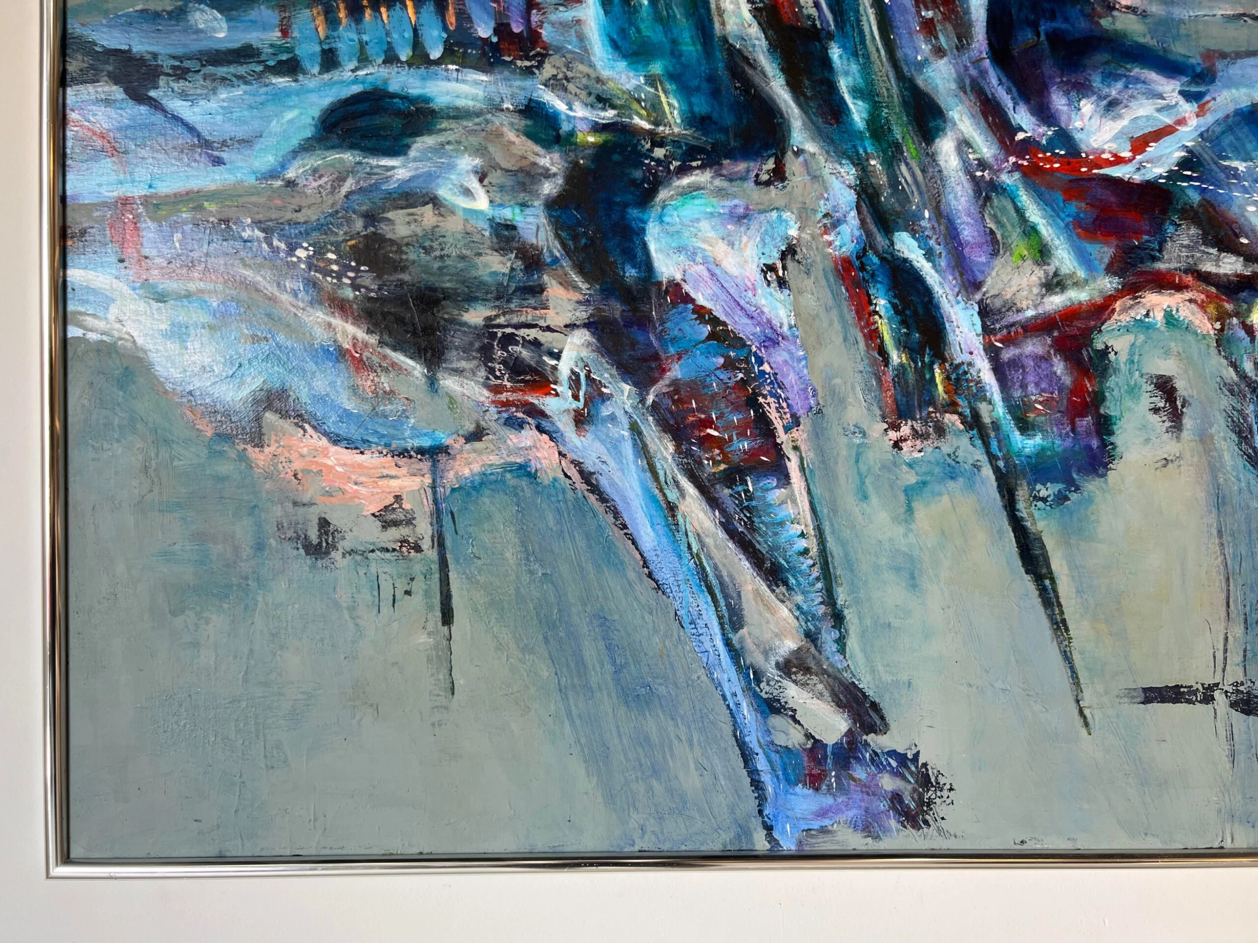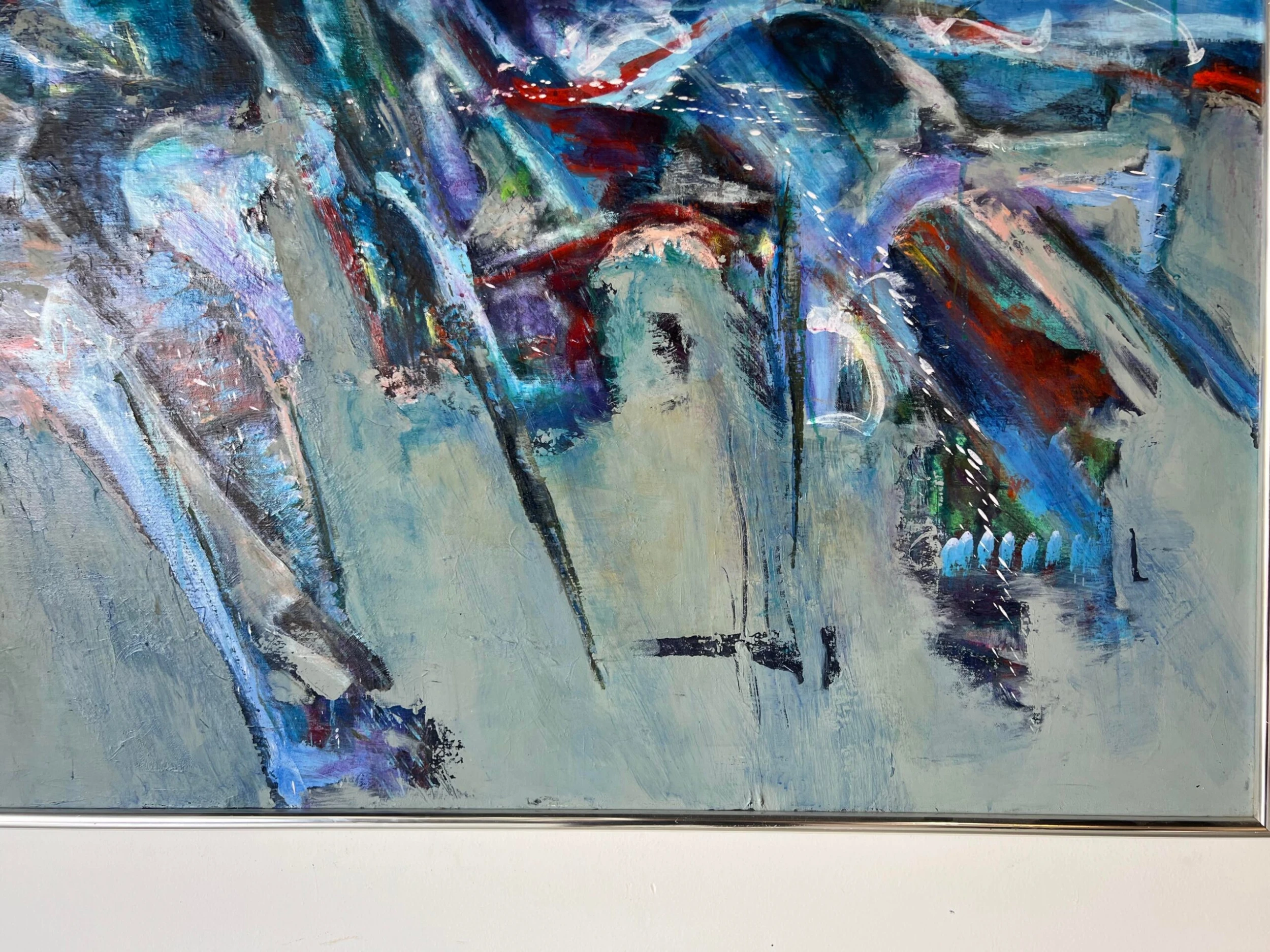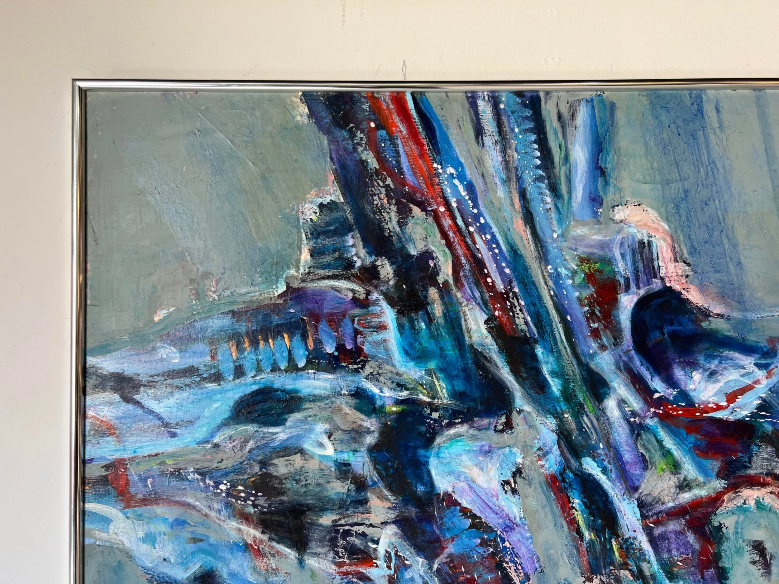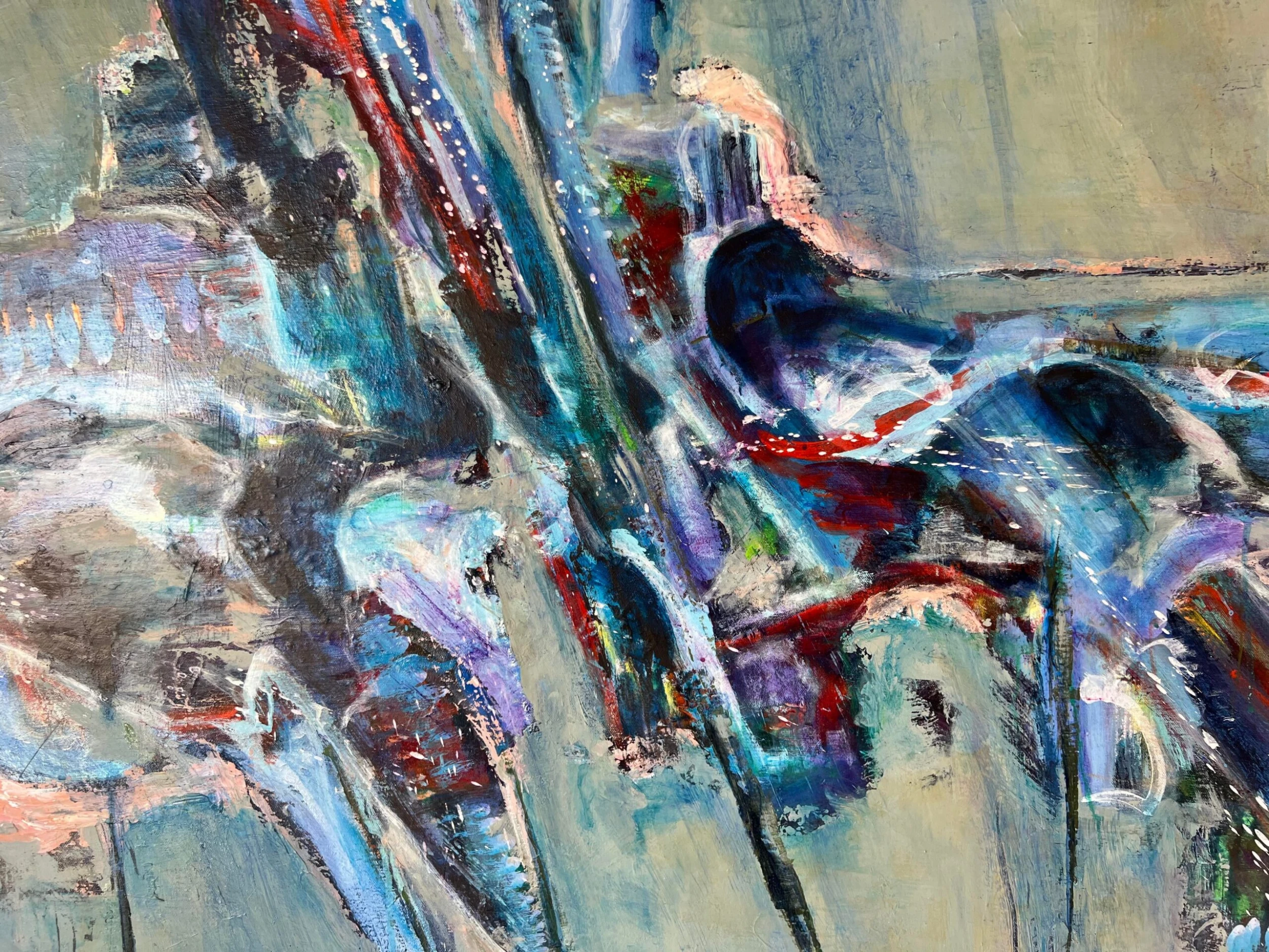 Wonderful vibrantly colored and worked paint surface contrasted by the blue background. The abstract image is worked with brush, brush handle and palette knife.