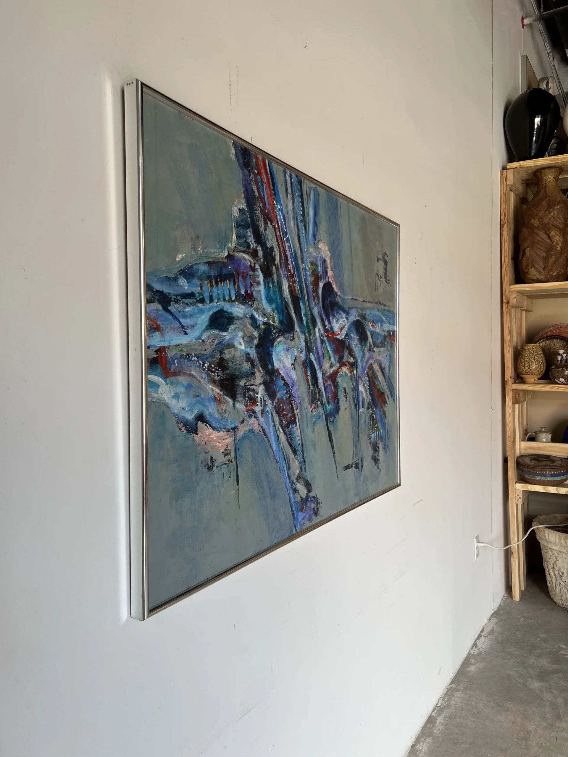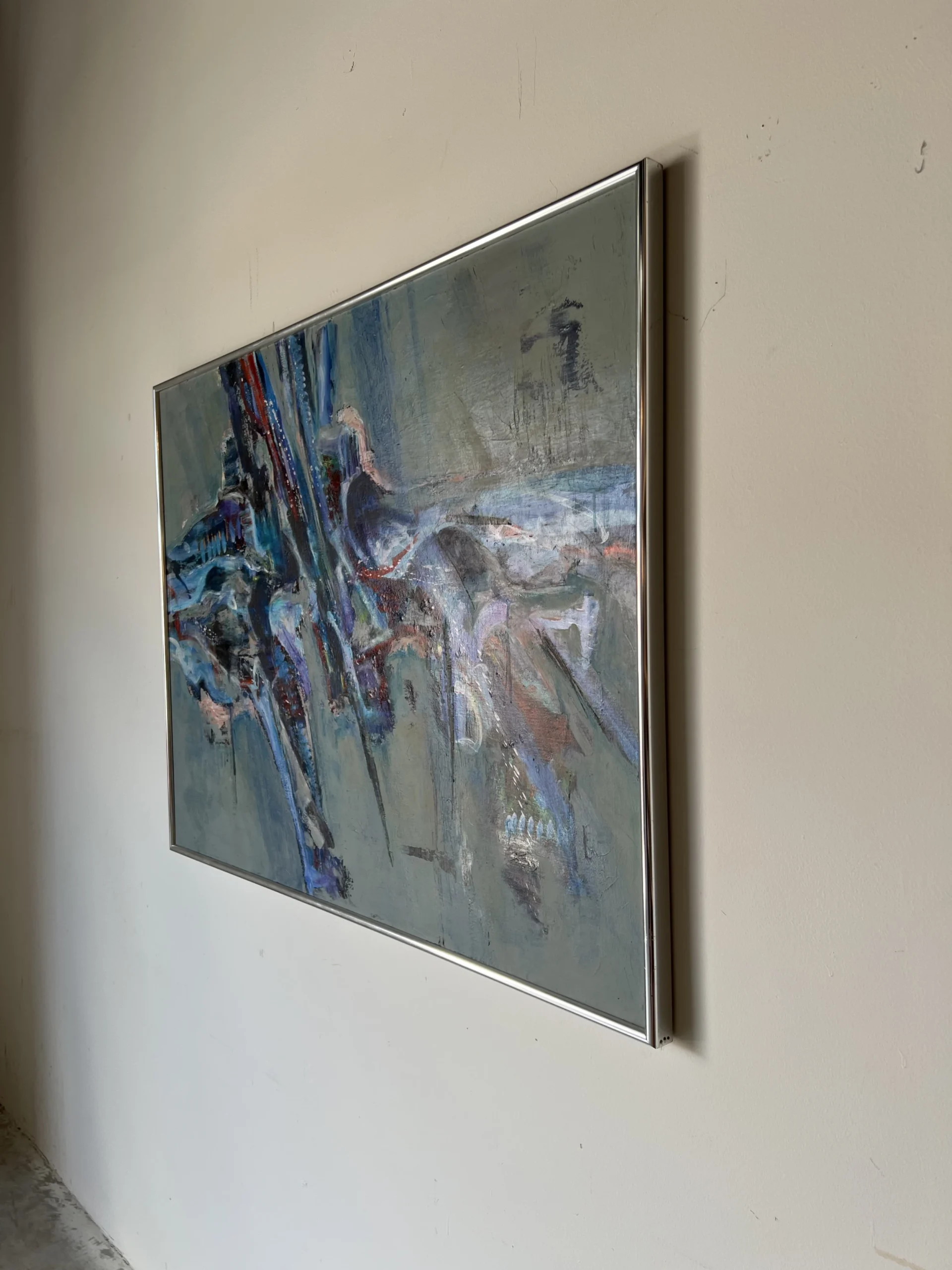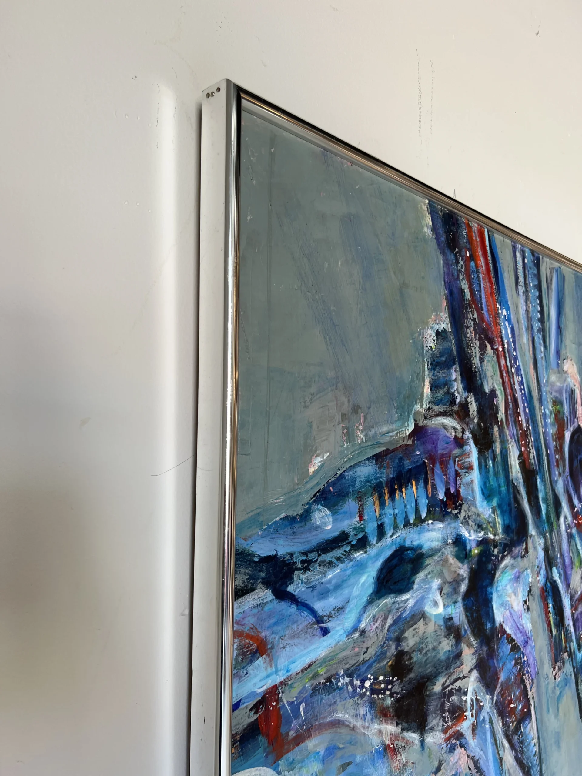 Created with oil on canvas , displayed in a chrome aluminum frame with a hanging wire attached to the reverse side.