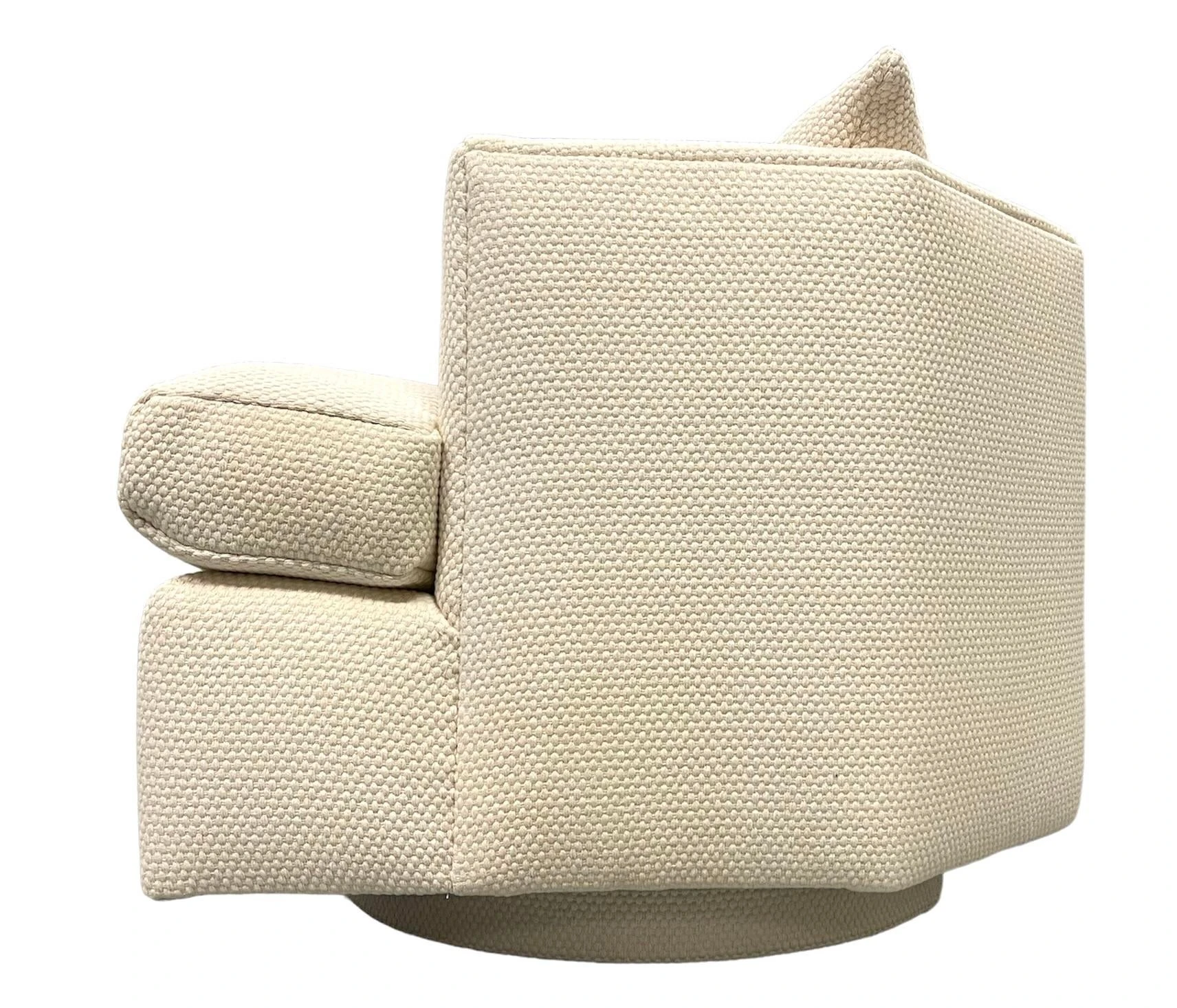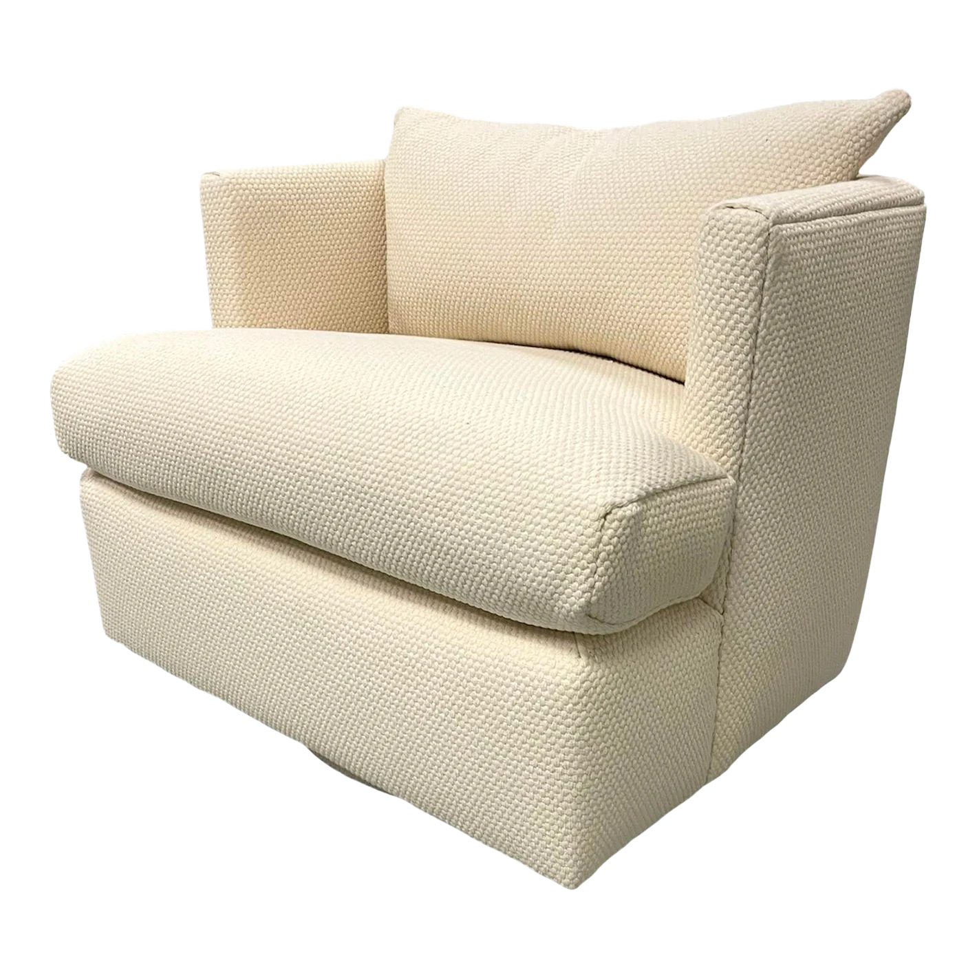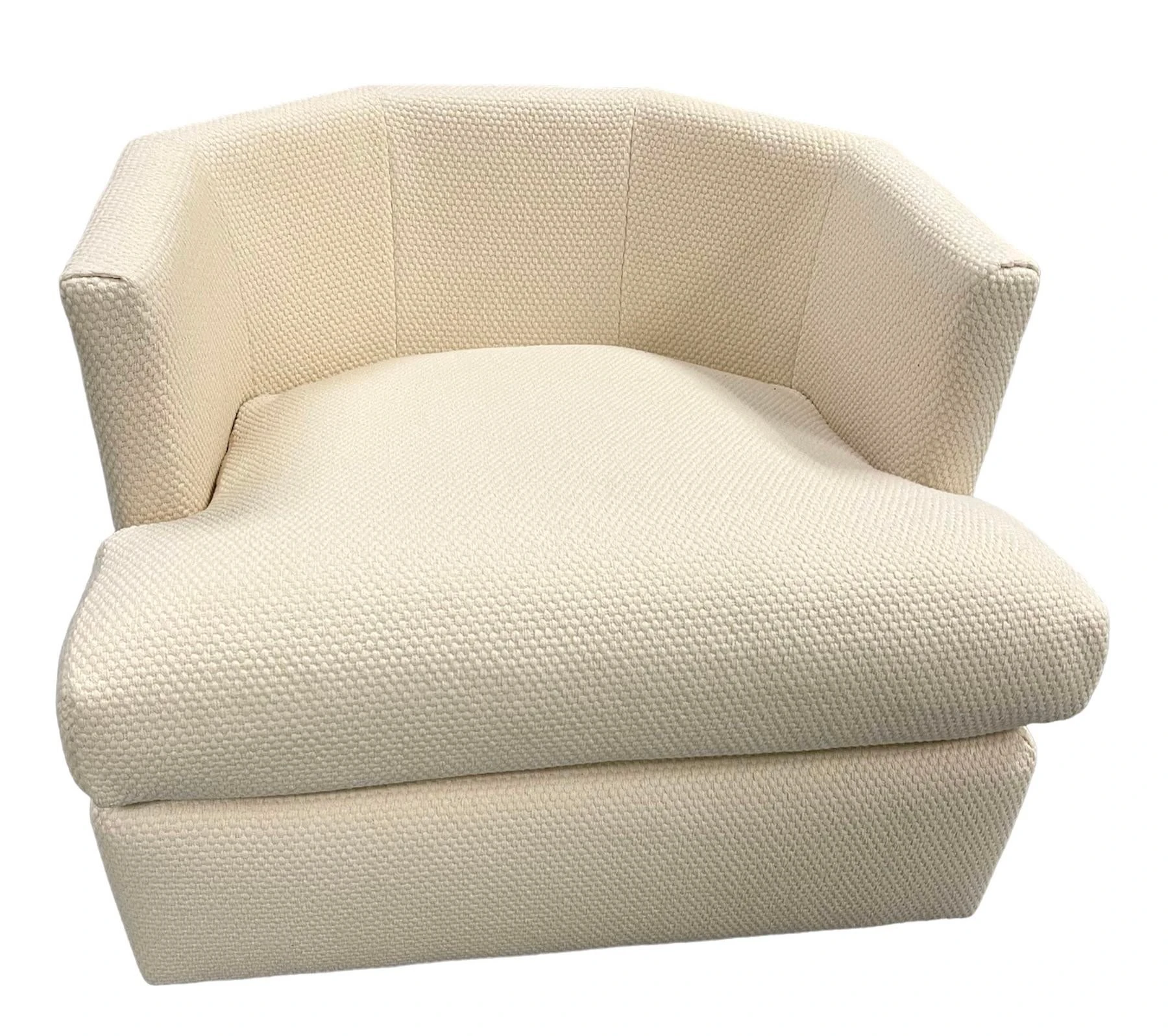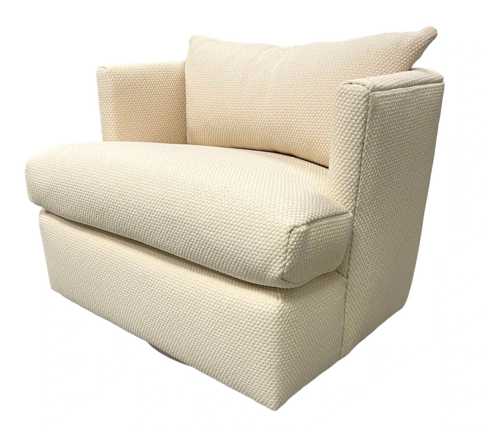 Freshly upholstered Directional swivel chair. Angled back and sides. Back cushion. Chunky thick off white cotton fabric from C&C Milano.