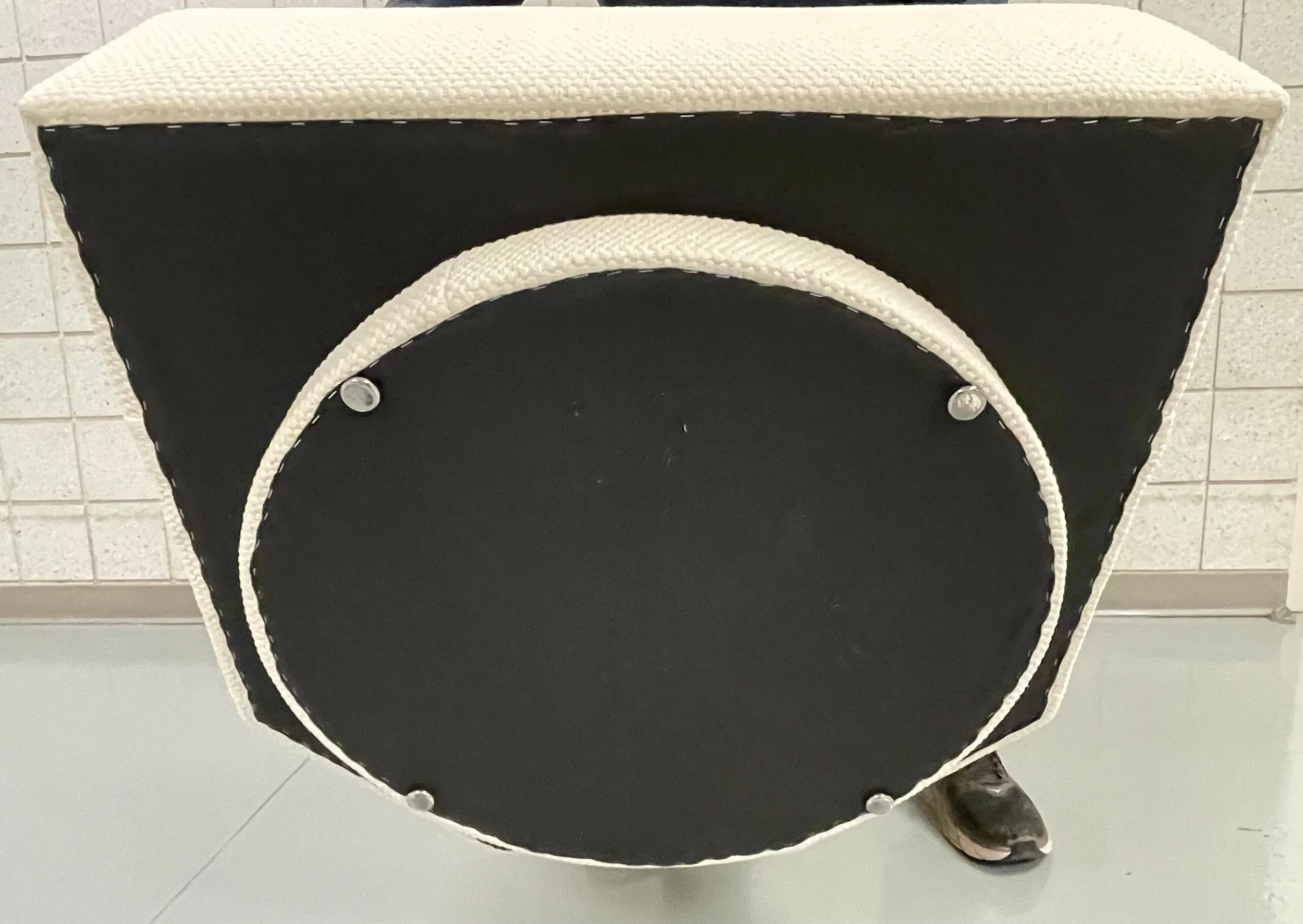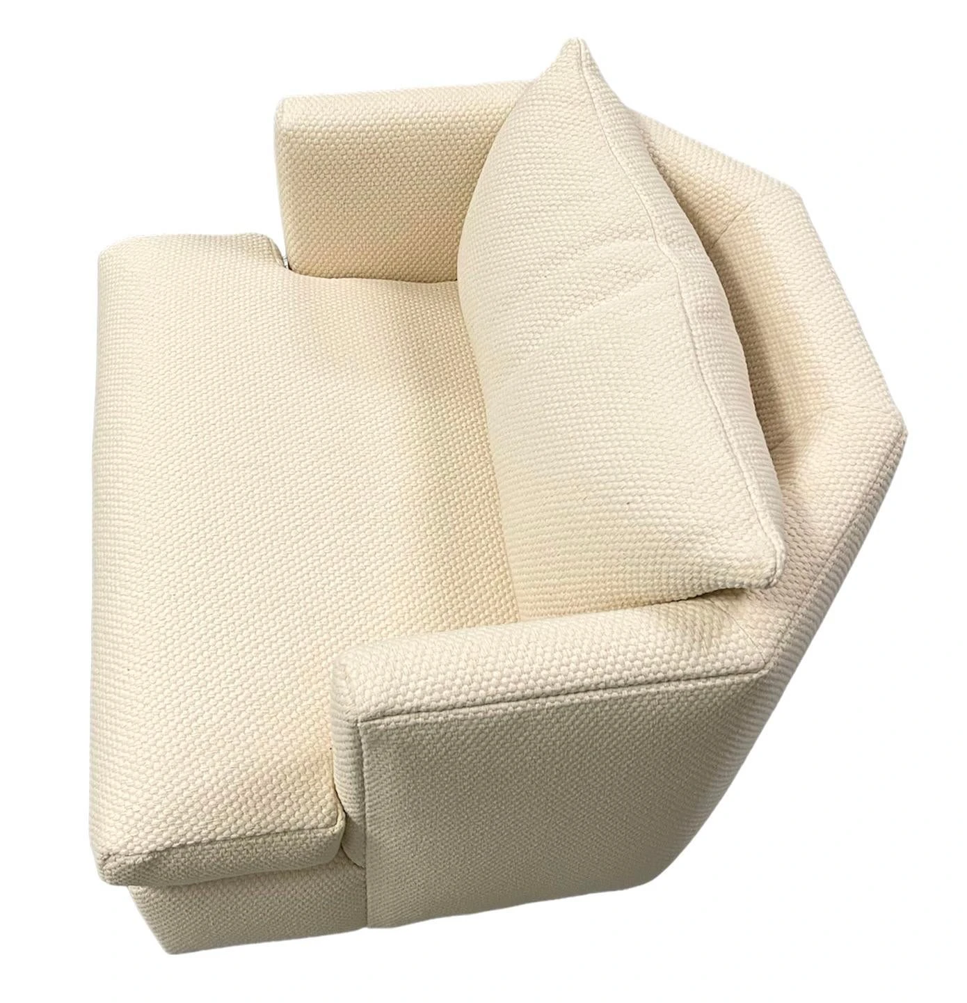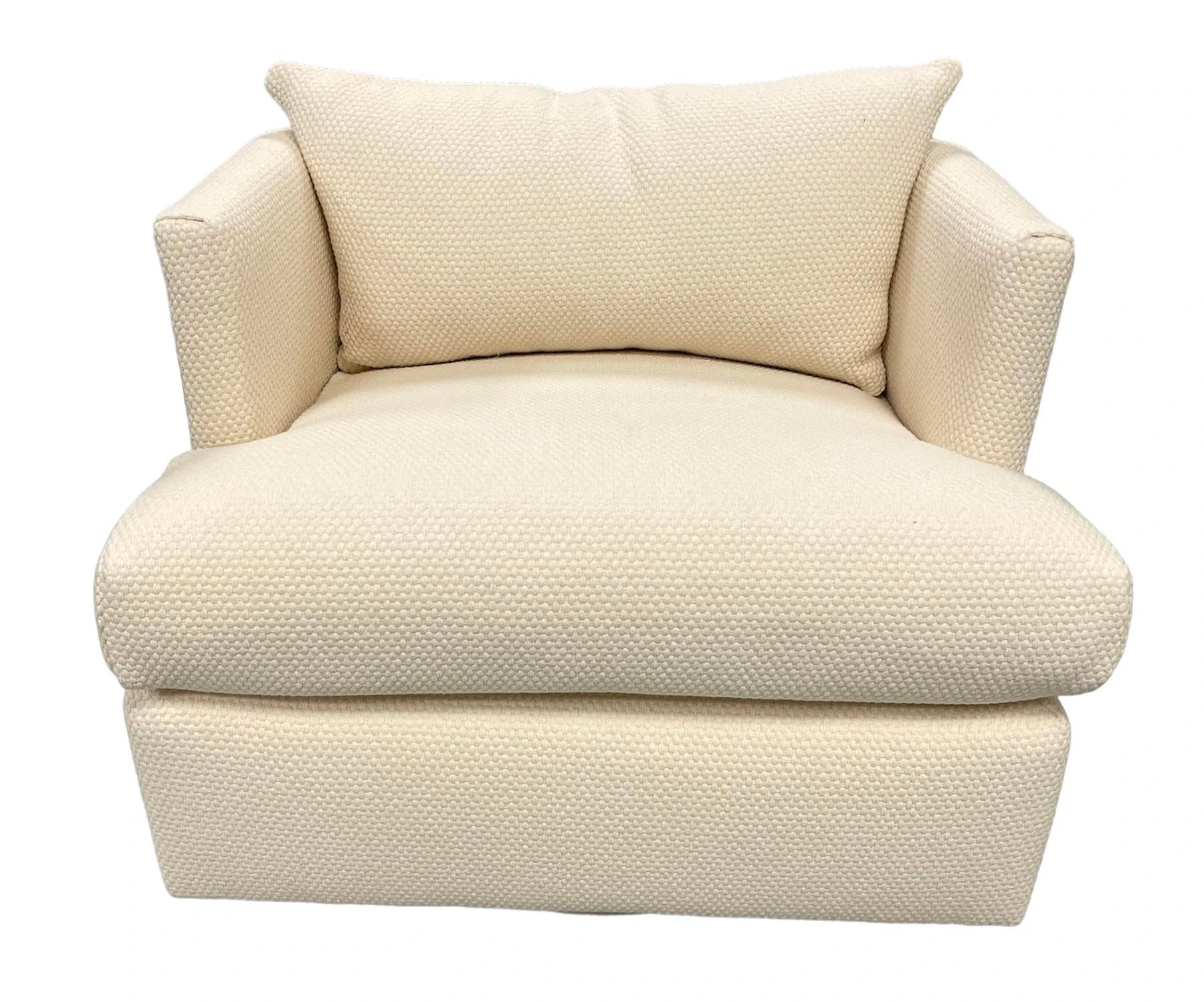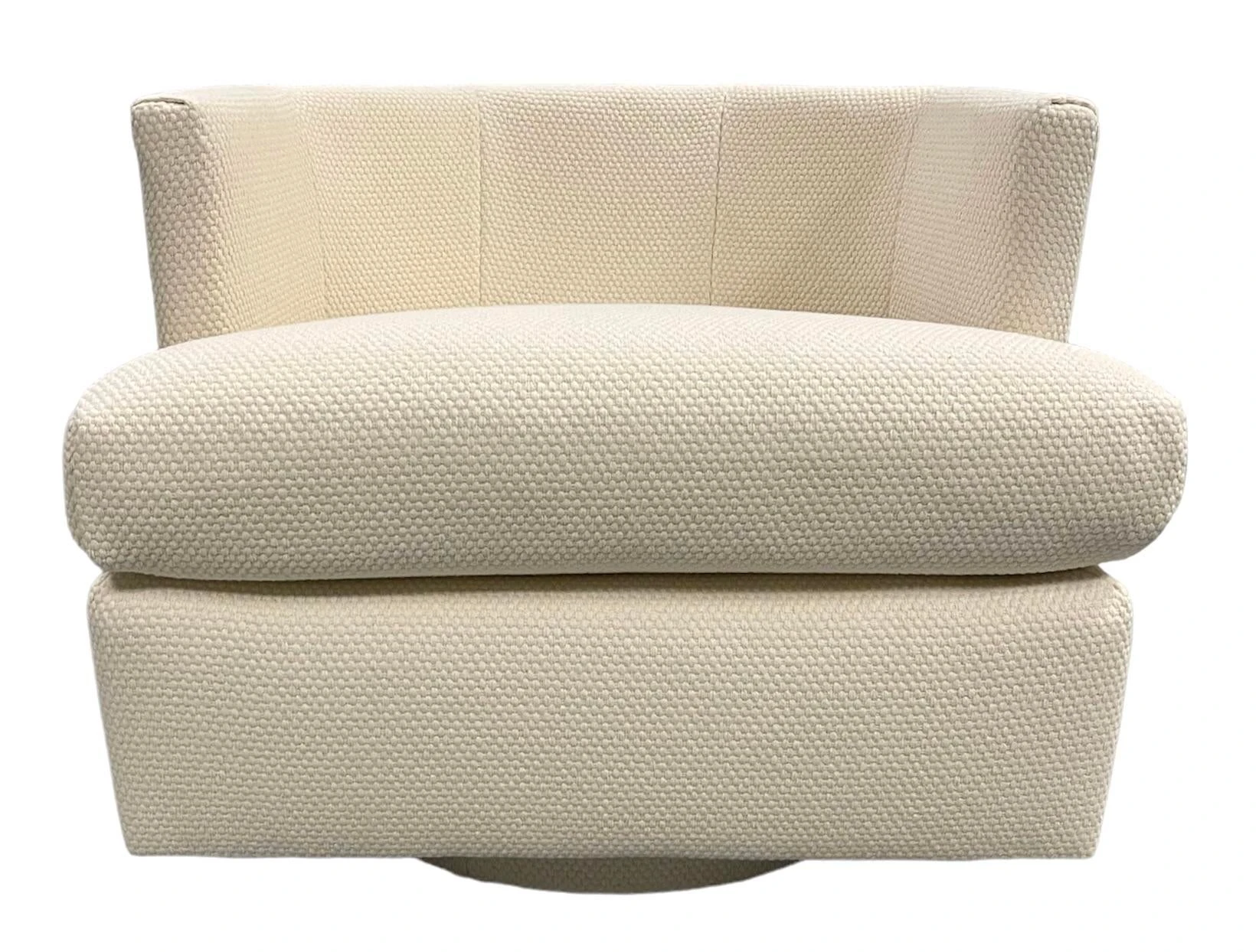 Freshly upholstered Directional swivel chair. Angled back and sides. Back cushion. Chunky thick off white cotton fabric from C&C Milano.