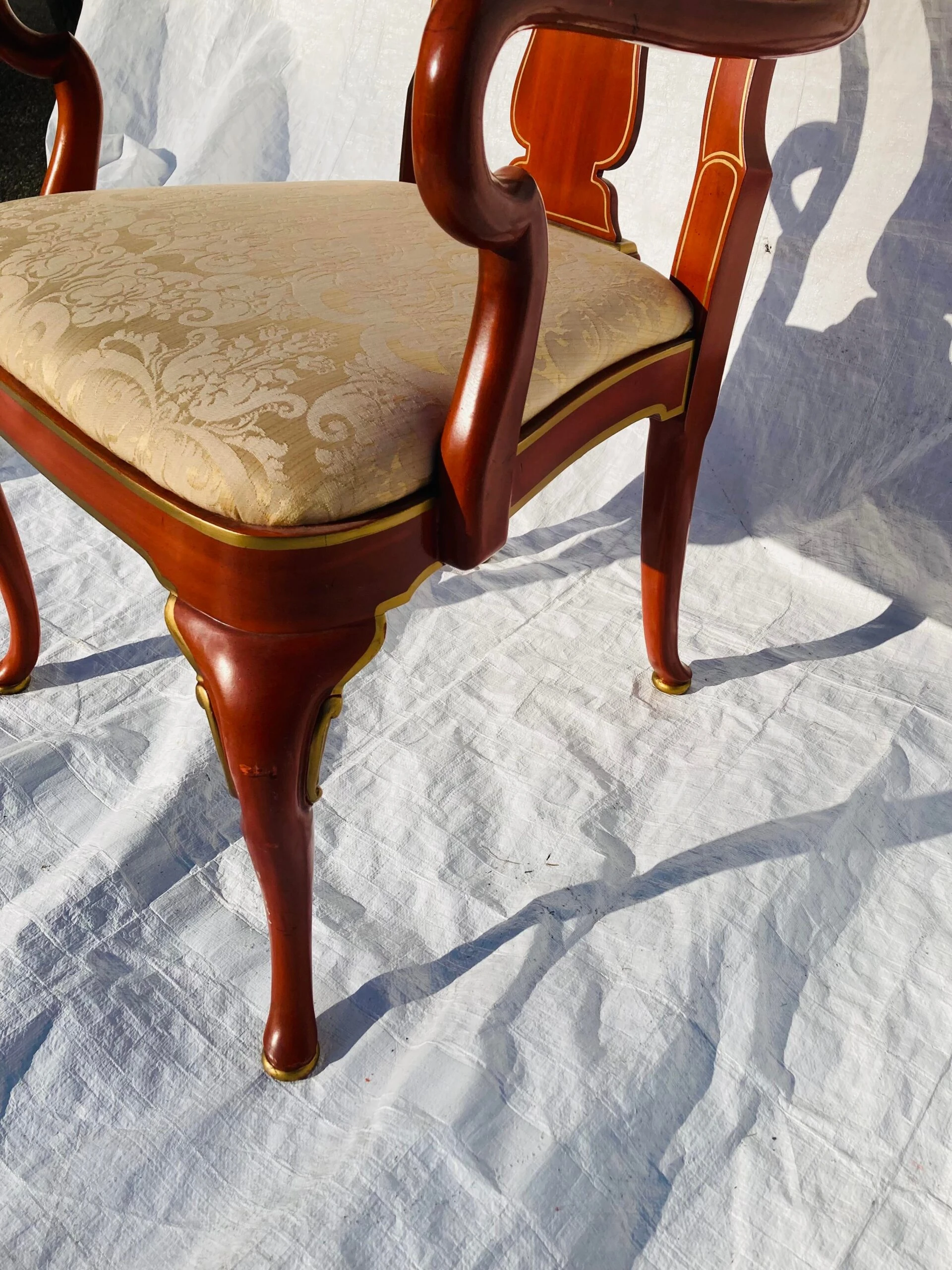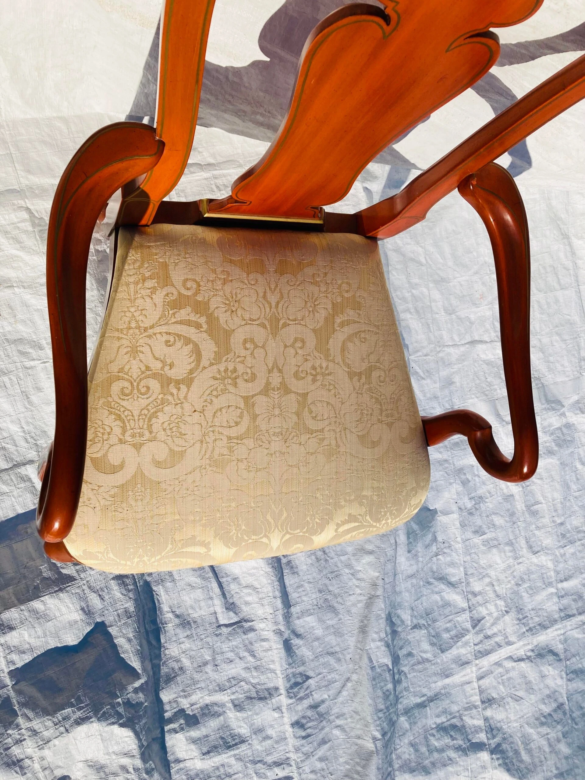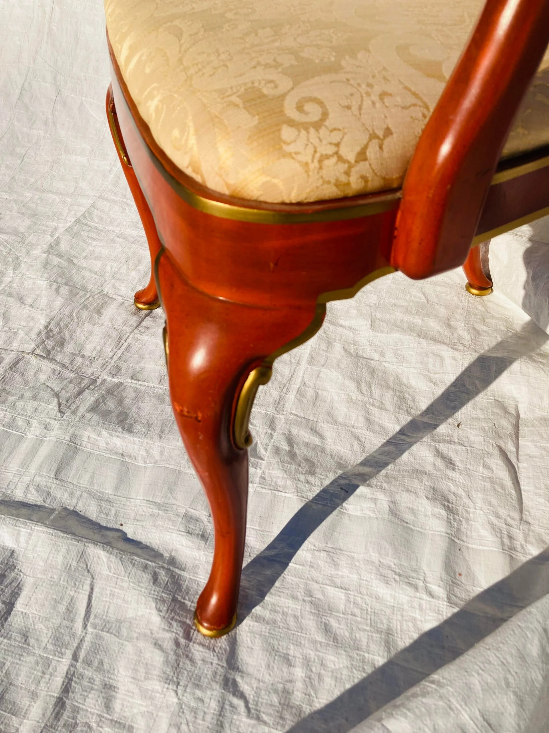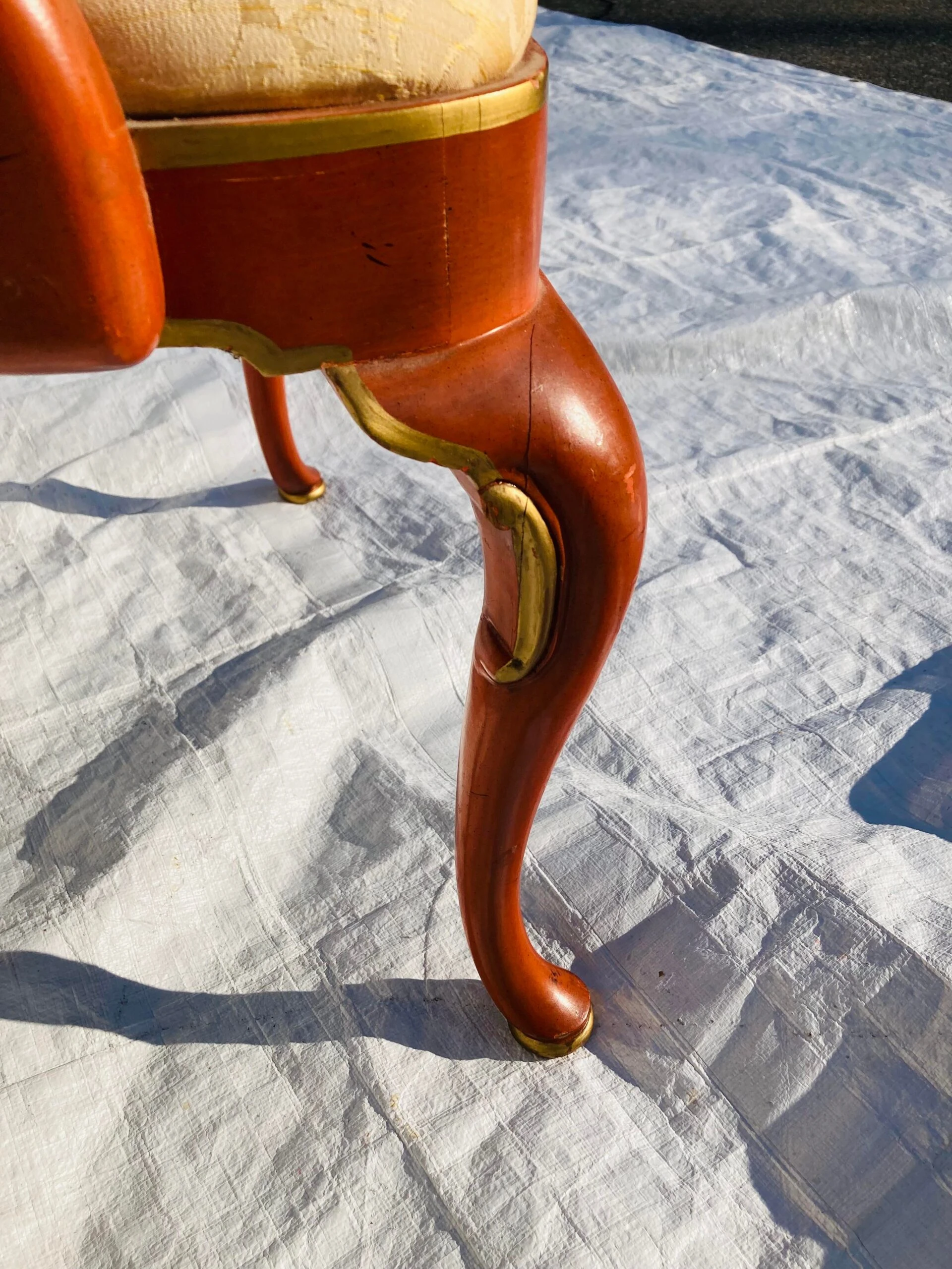 80’s Queen Anne Style Arm Chair , Original Paint by the Company Coral and Gold 39”H X 24”W X 23”D , Seat H 18” , Makers mark reads ” KINDEL FURNITURE COMPANY” Arm 26.5 Iw 20” Id 18”