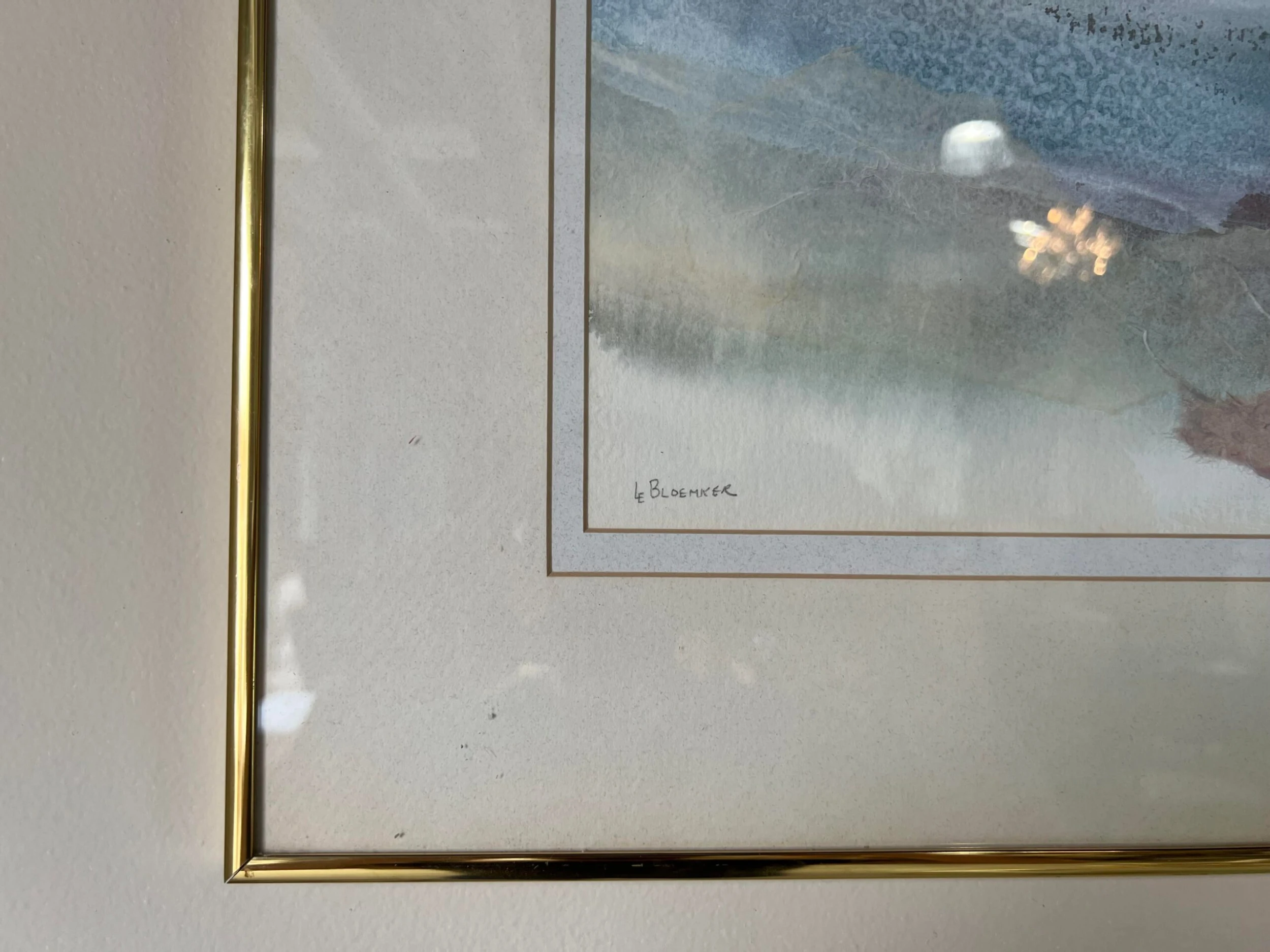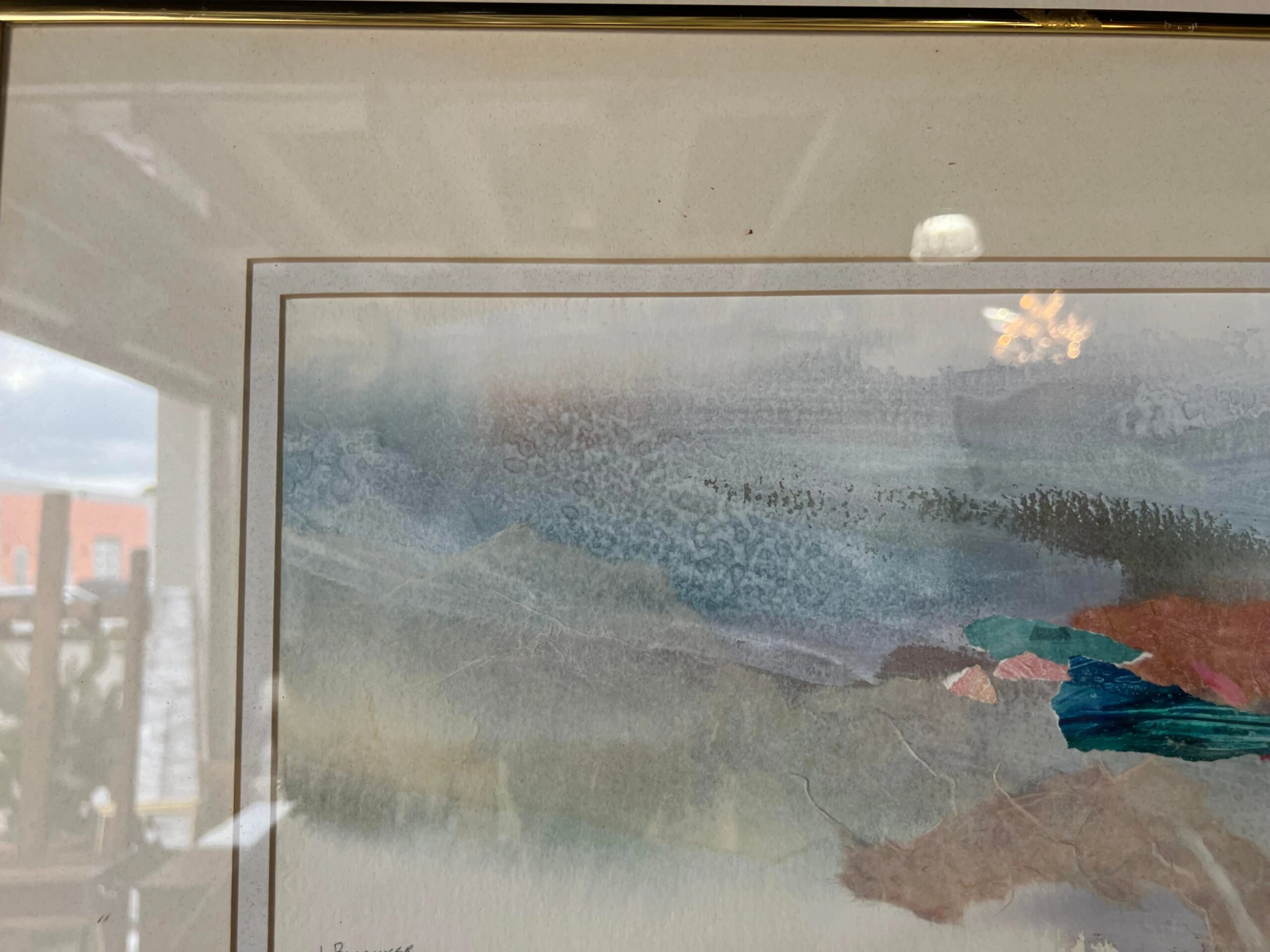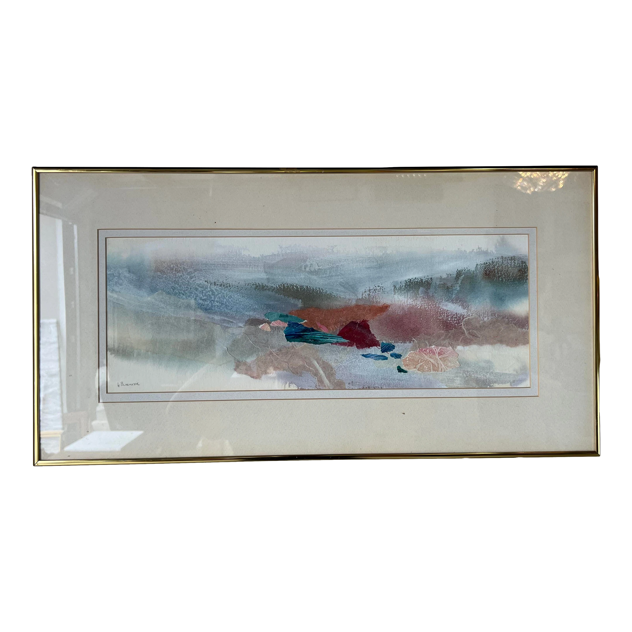 An acrylic mixed media collage expressionist painting on paper by Le Bloemker. The abstract composition in blues red and brown is signed to the lower left and mounted under glass with gold brass aluminum frame that is wired for hanging.