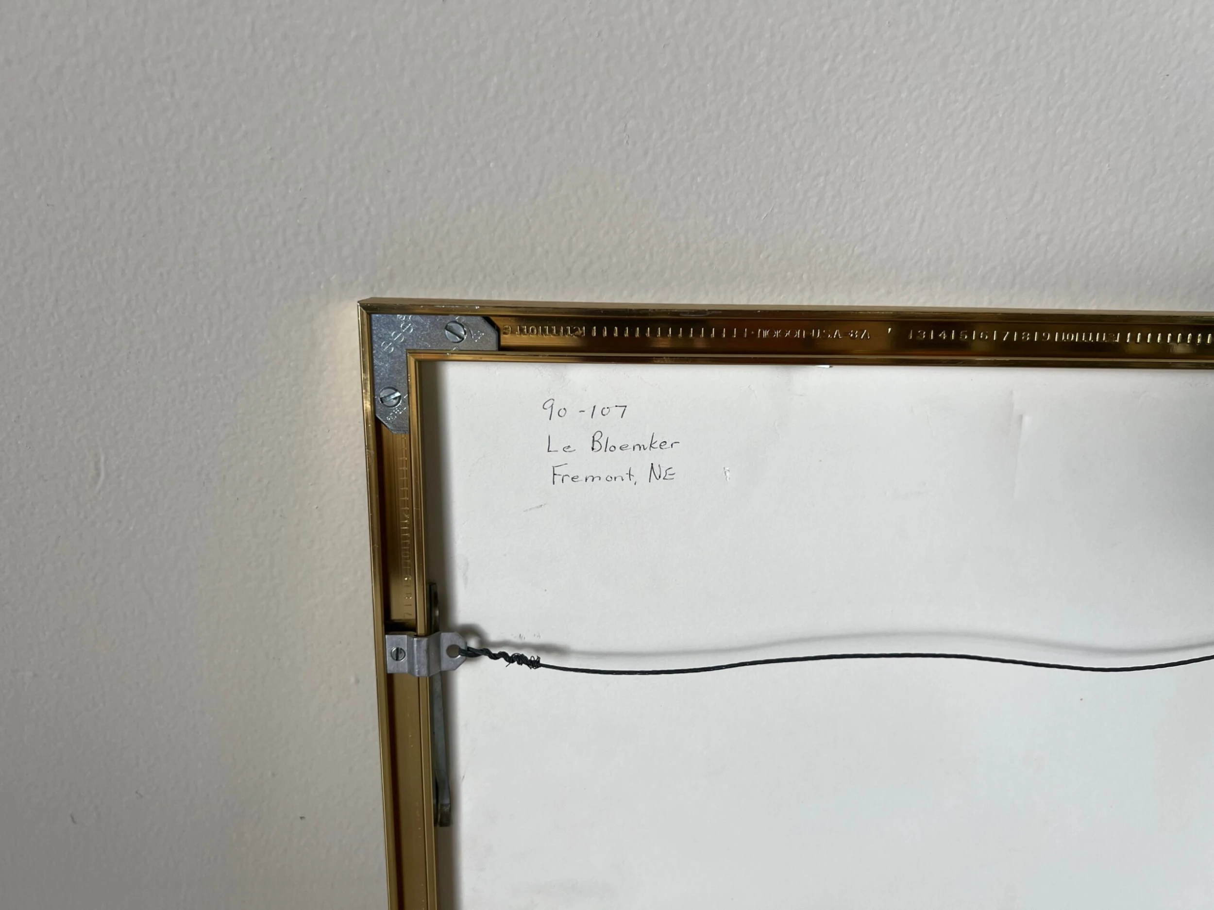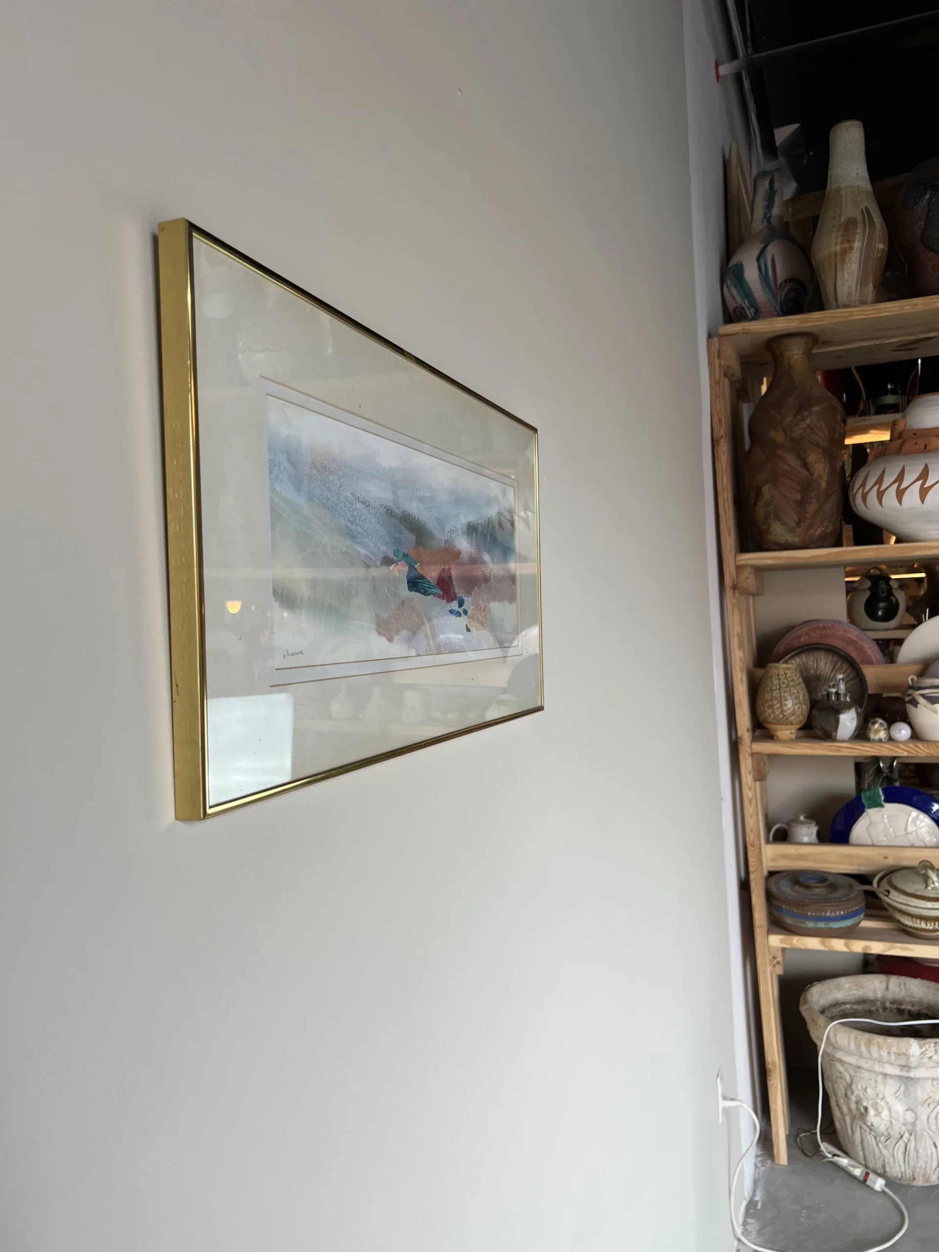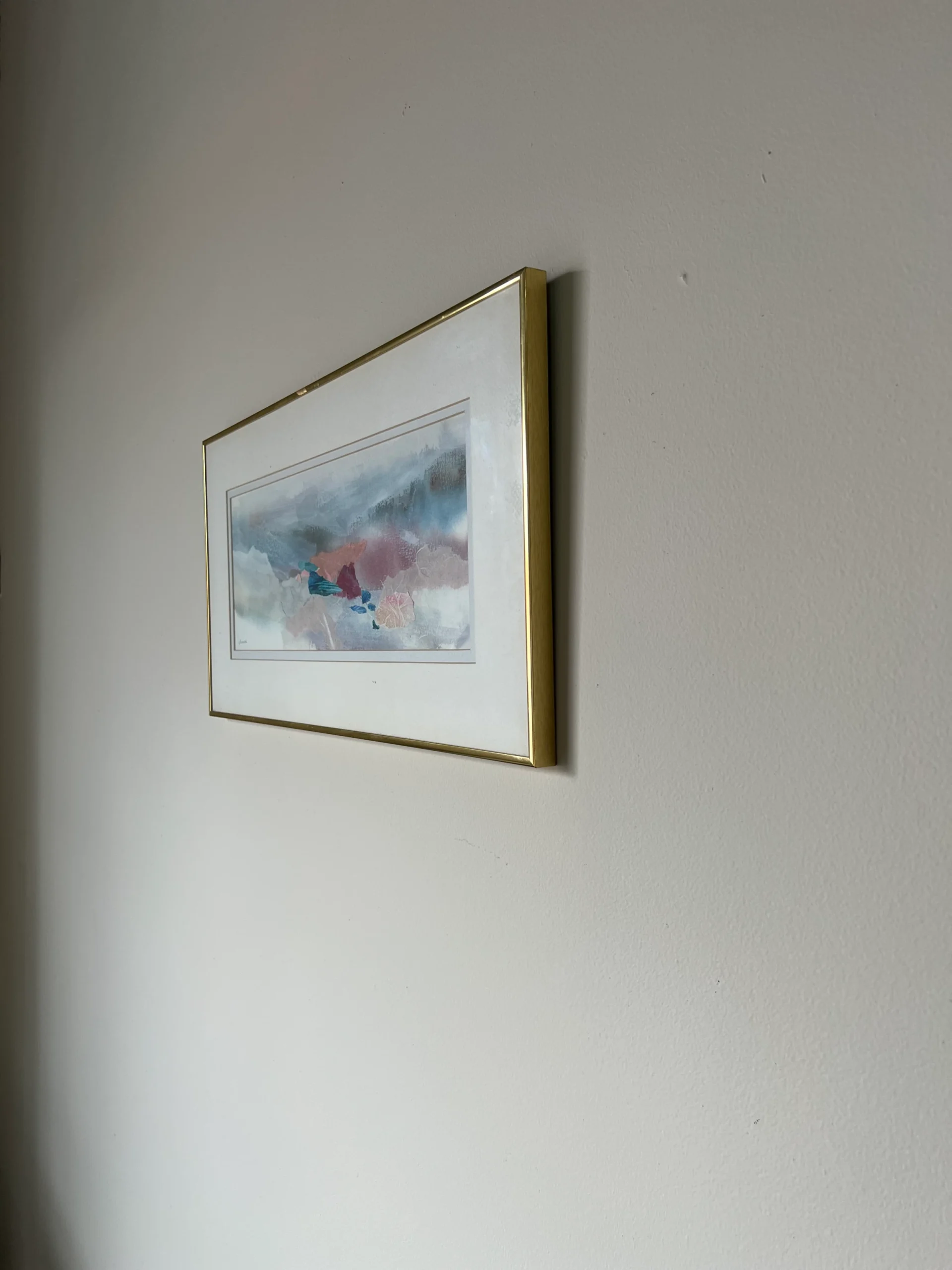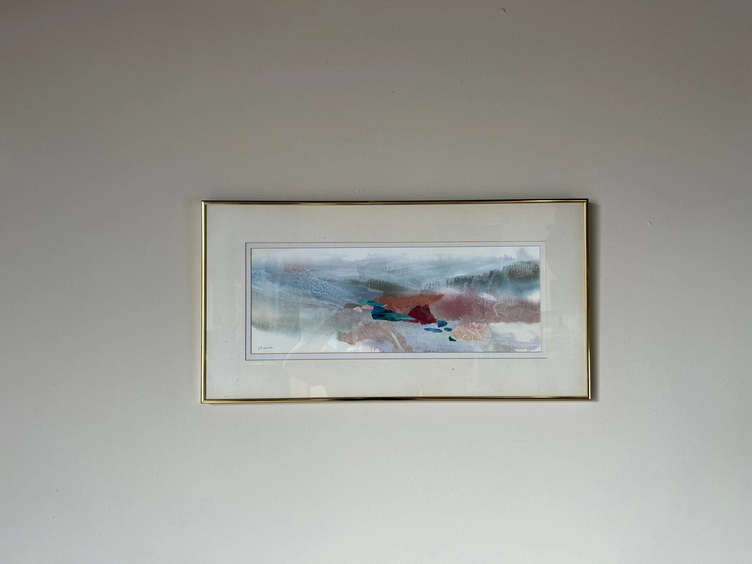 An acrylic mixed media collage expressionist painting on paper by Le Bloemker. The abstract composition in blues red and brown is signed to the lower left and mounted under glass with gold brass aluminum frame that is wired for hanging.