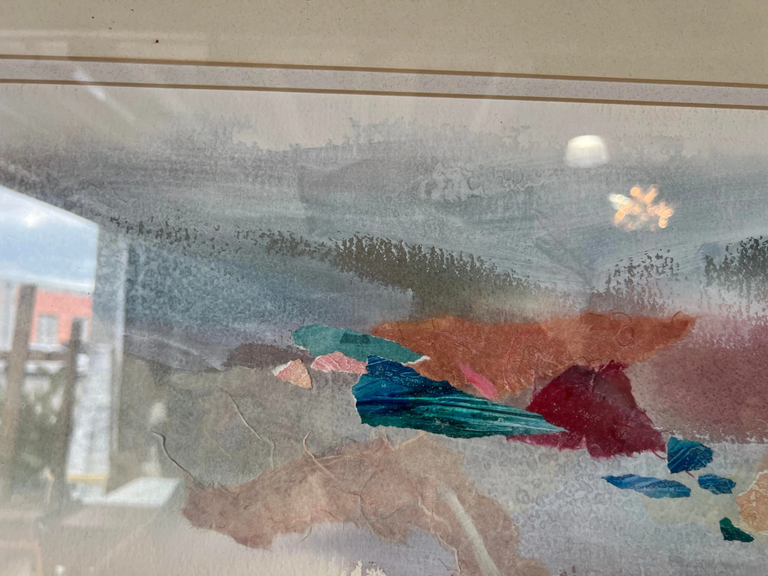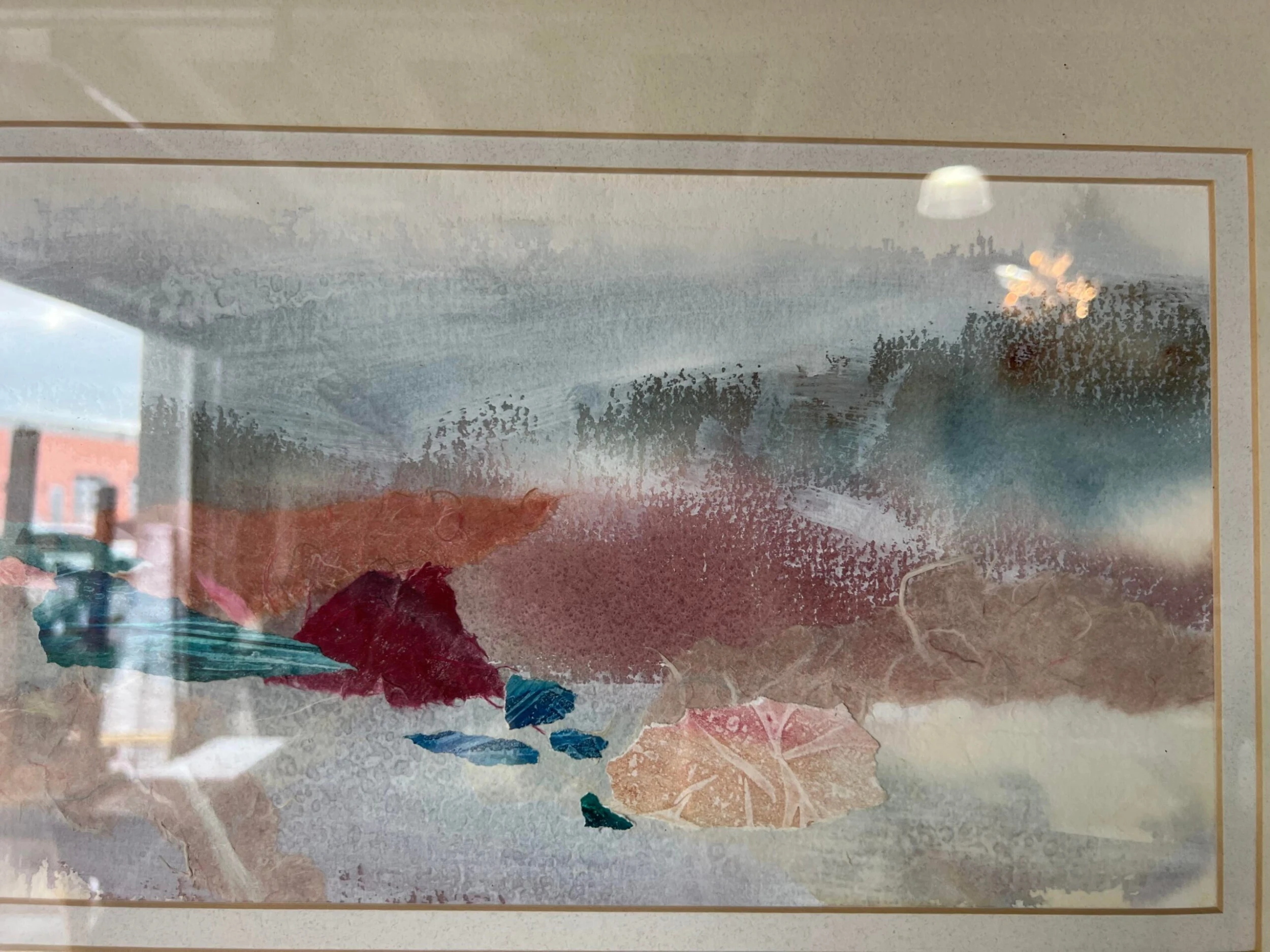 An acrylic mixed media collage expressionist painting on paper by Le Bloemker. The abstract composition in blues red and brown …