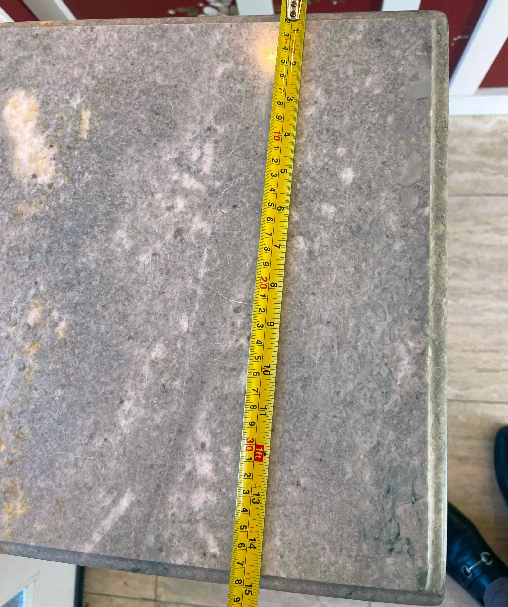 A very nice elegant clean looking iron metal accent side table that has been sealed with a beautiful black and green marble swirl paint. The removeable marble top is a light pink beige tone with green veins. It has beveled sides and 4 divots on the backside that fit the top of the sturdy metal base perfectly to keep it from sliding or moving around. It has flat pad feet and braces at the top and bottom. Our photos say more than 1000 words. Always zoom in for details.