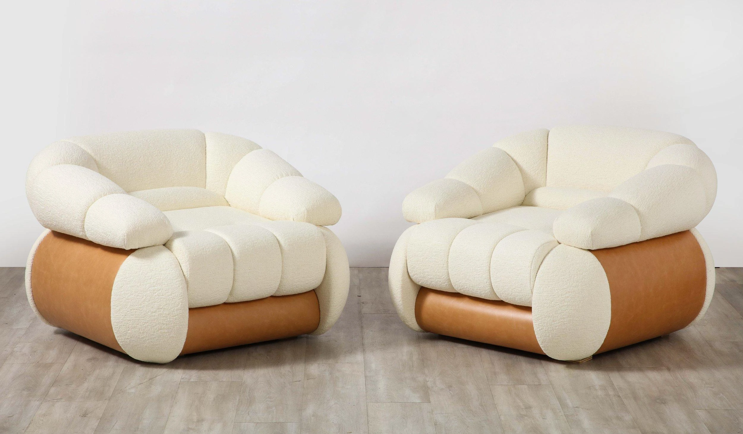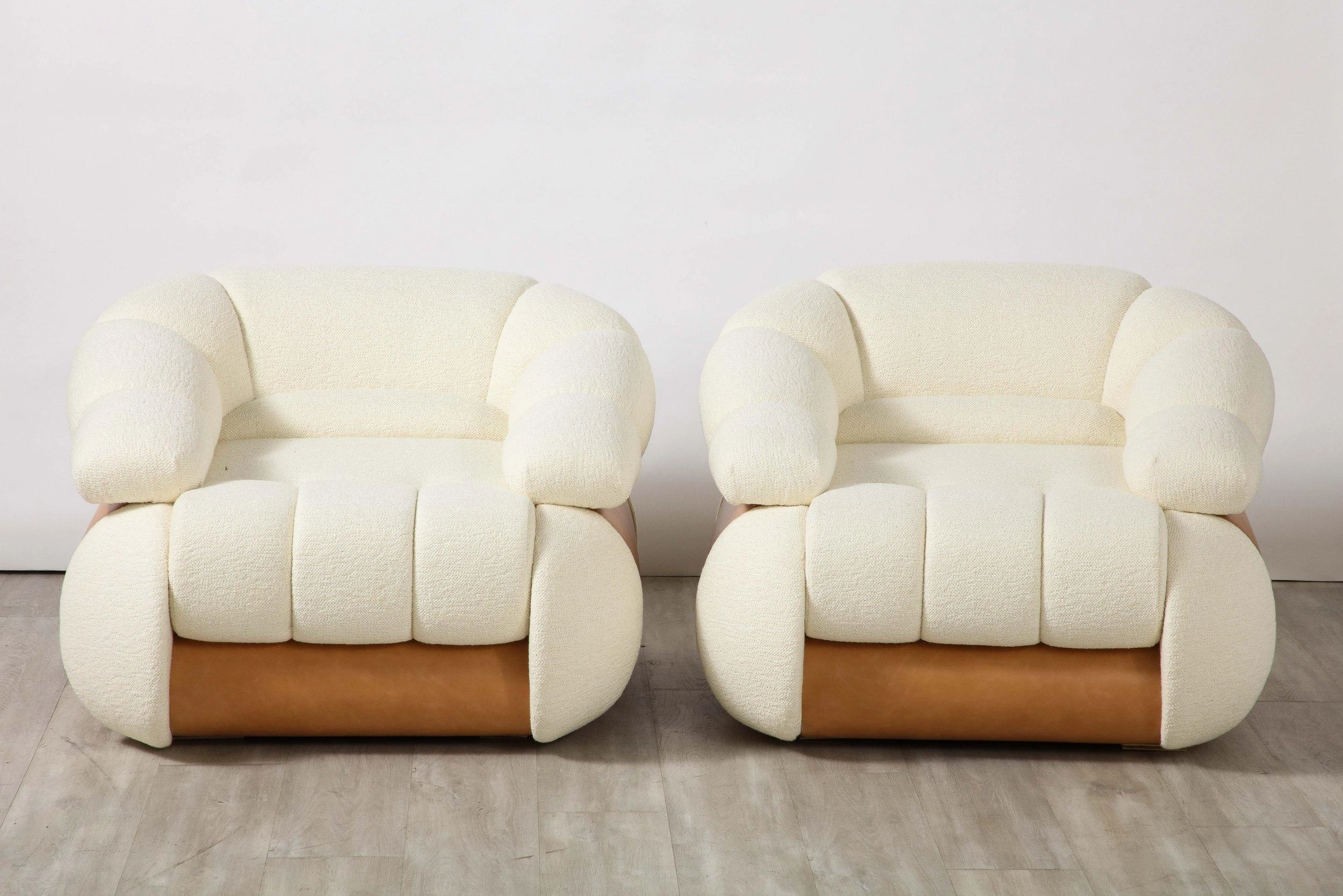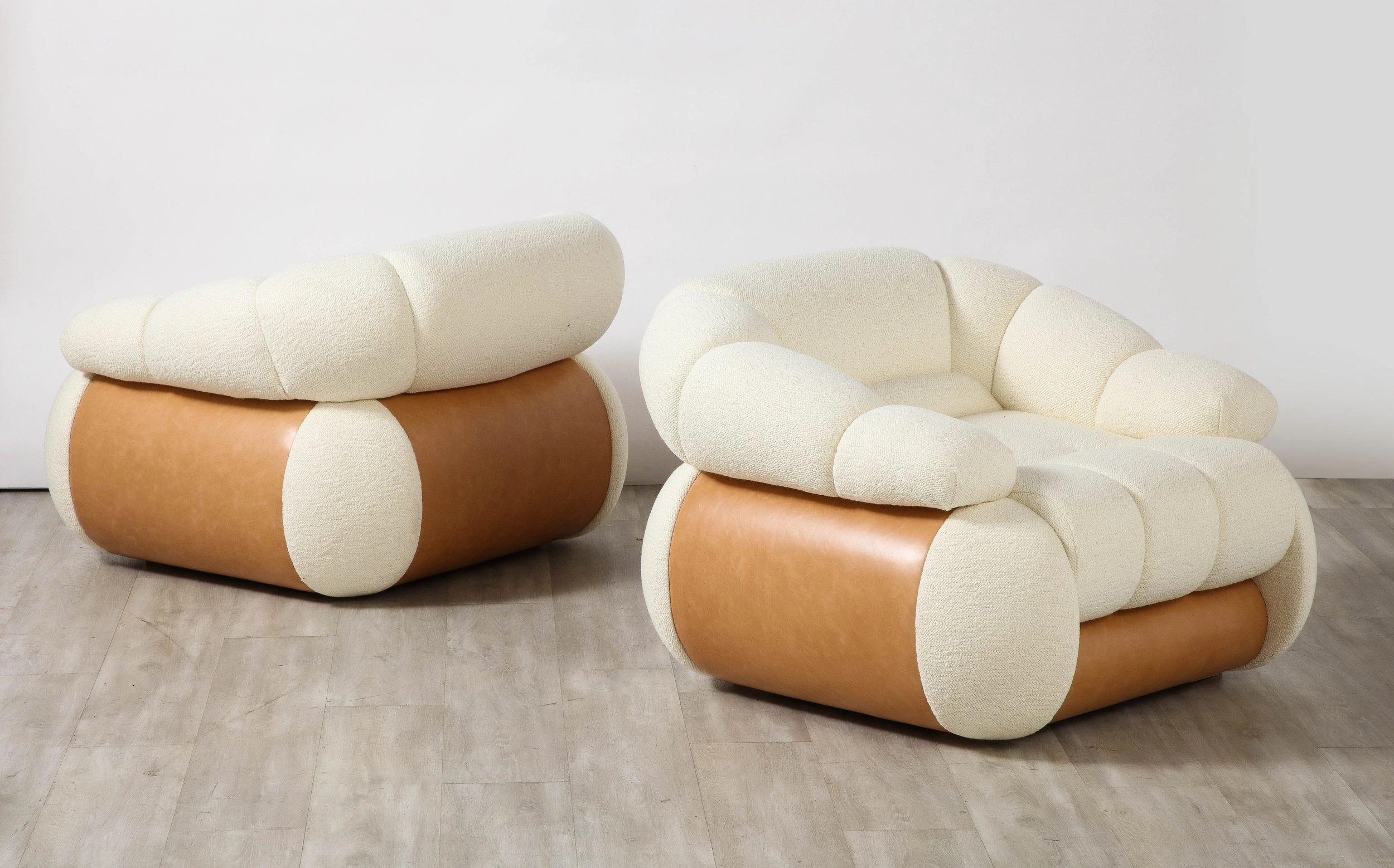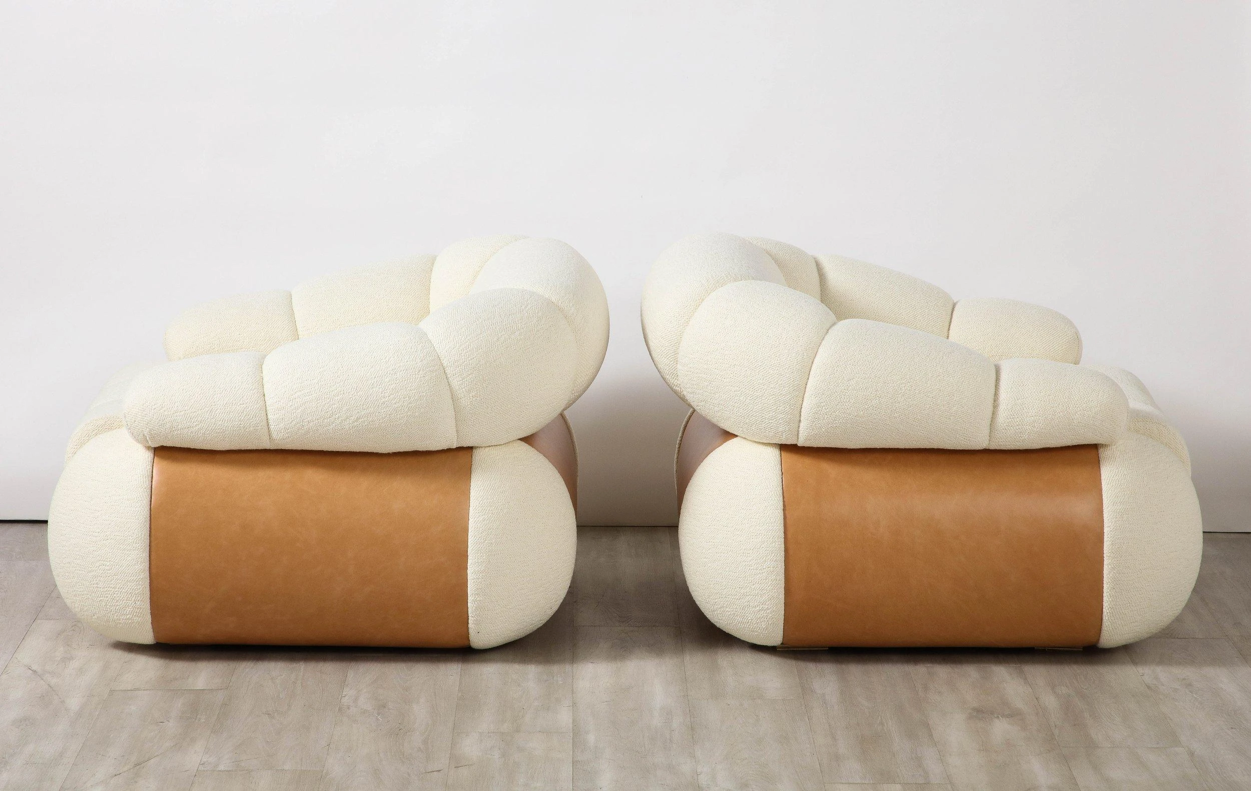 Pair of Adriano Piazzesi Italian 1970’s lounge chairs; the whole with channel and tufted upholstery, the sides and back are curved and covered in a warm brown Italian leather. The chairs are constructed of original solid wood structure and have been completely restored in our professional studio and are newly reupholstered in a Belgian textured creamy/white wool and cotton. The design, fabrication and form are highly indicative of the glamorous and playful style of Italy during the 1970’s and would make a sculptural and statement piece for any interior style.