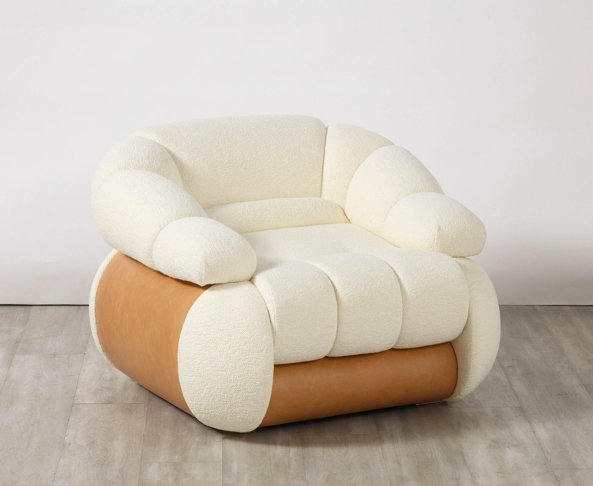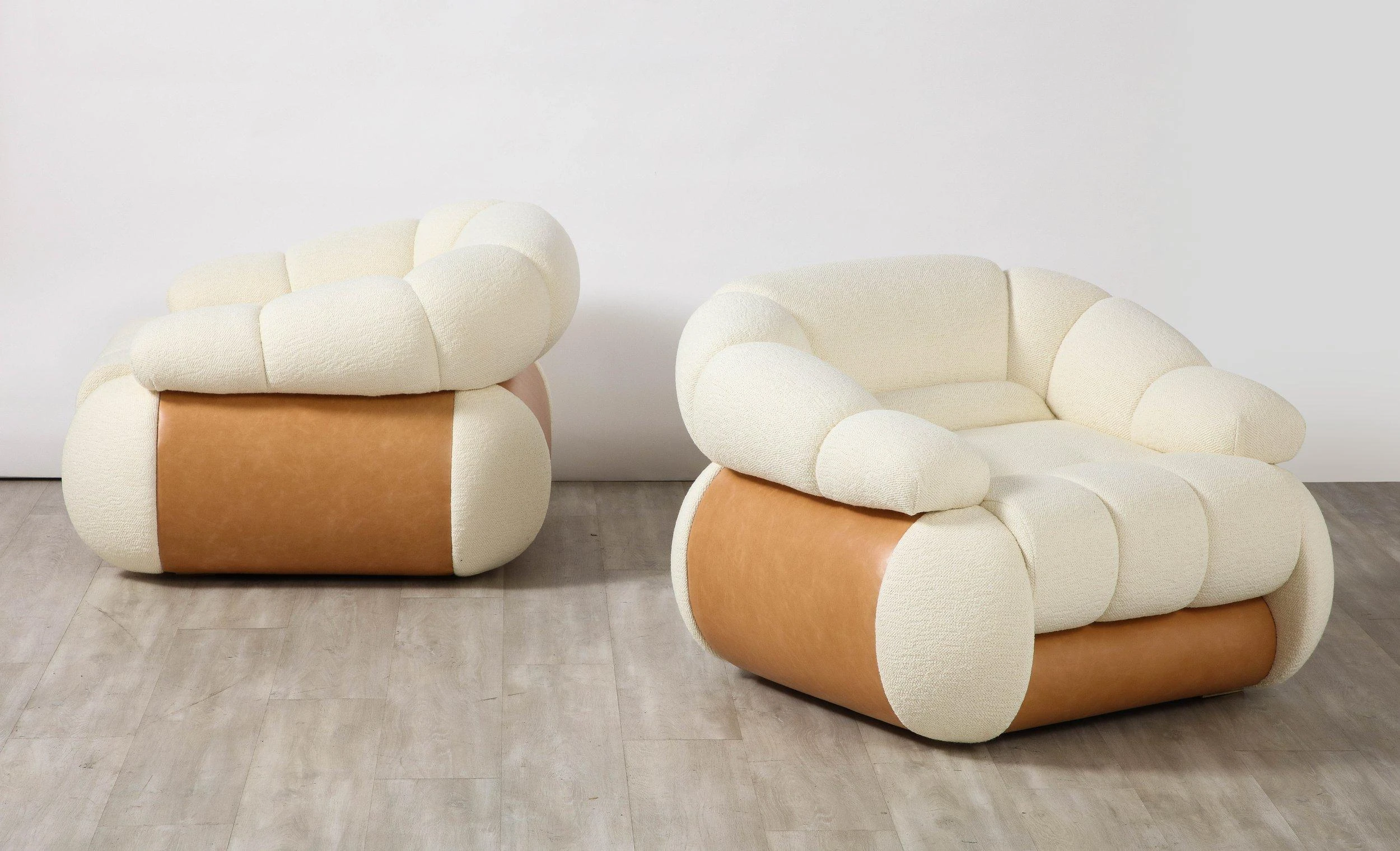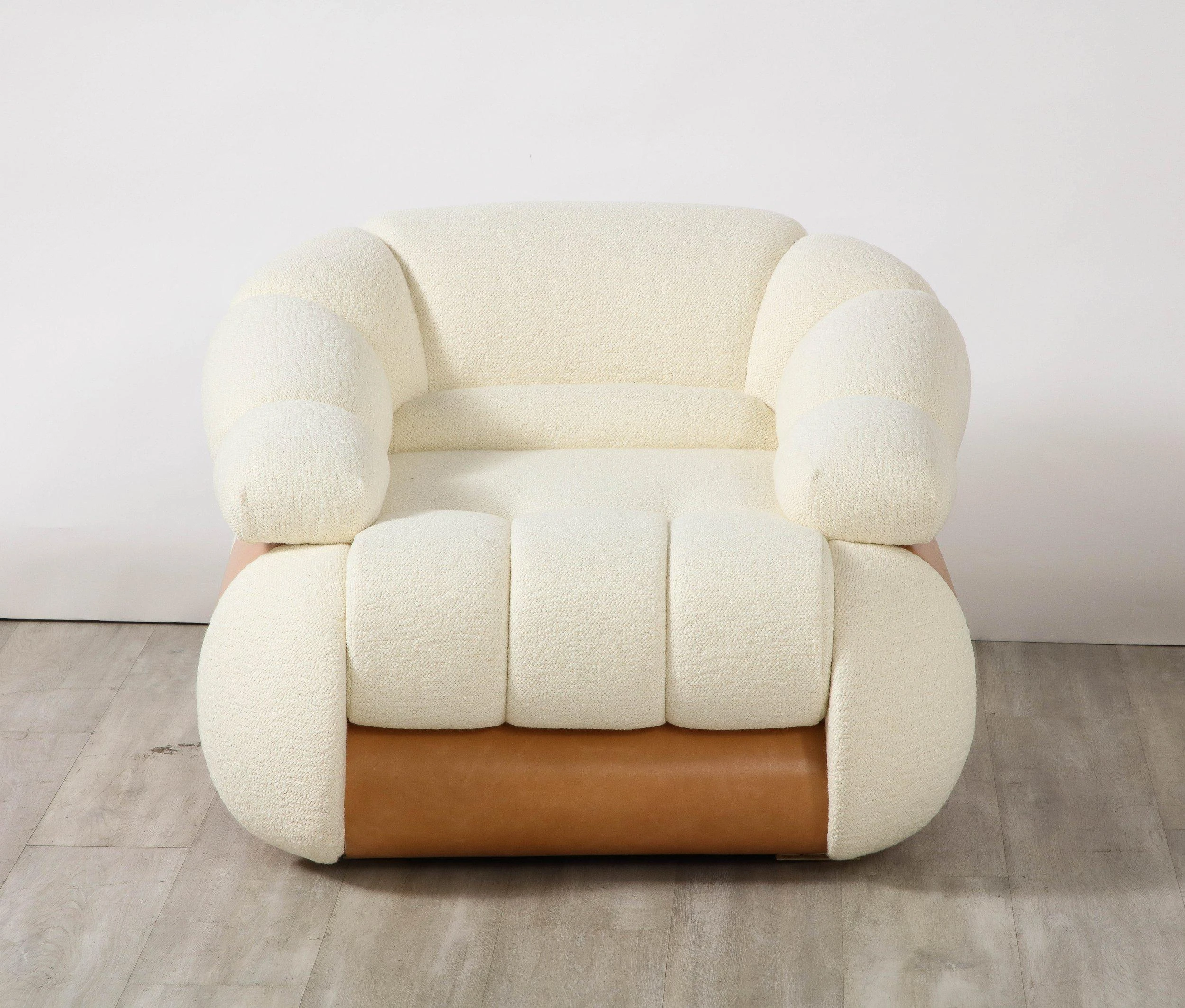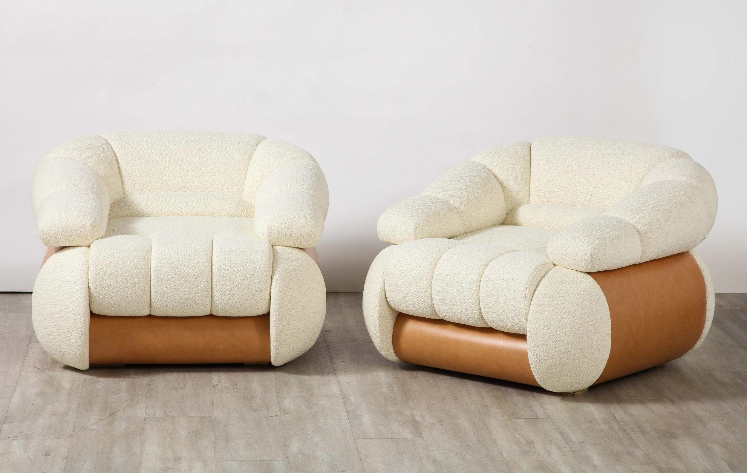 Pair of Adriano Piazzesi Italian 1970’s lounge chairs; the whole with channel and tufted upholstery, the sides and back are curved and covered in a warm brown Italian leather. The chairs are constructed of original solid wood structure and have been completely restored in our professional studio and are newly reupholstered in a Belgian textured creamy/white wool and cotton. The design, fabrication and form are highly indicative of the glamorous and playful style of Italy during the 1970’s and would make a sculptural and statement piece for any interior style.