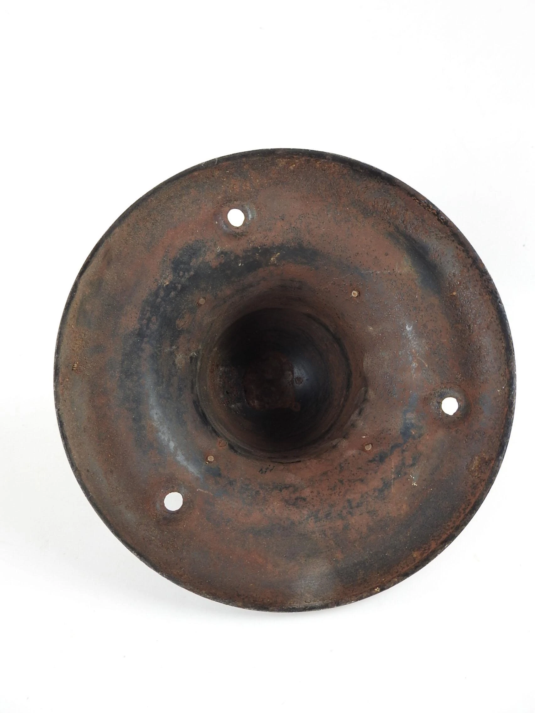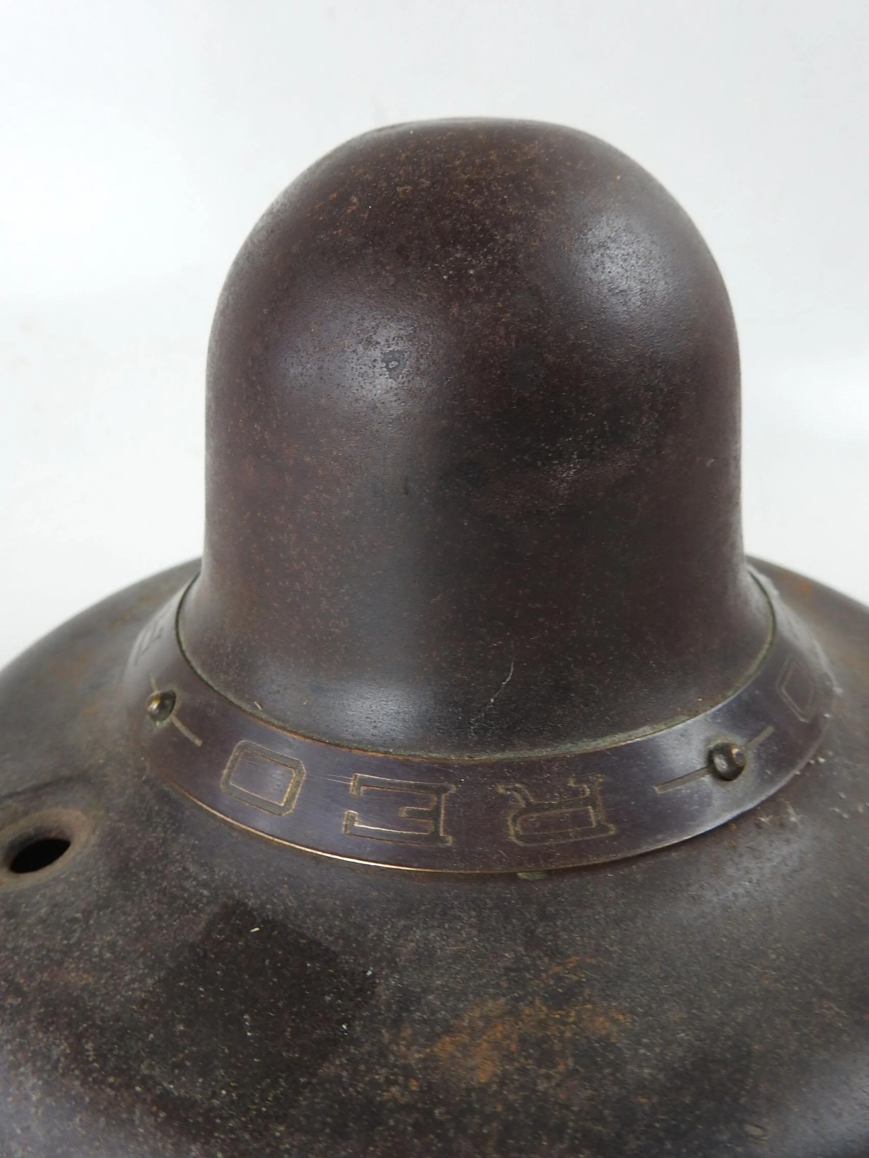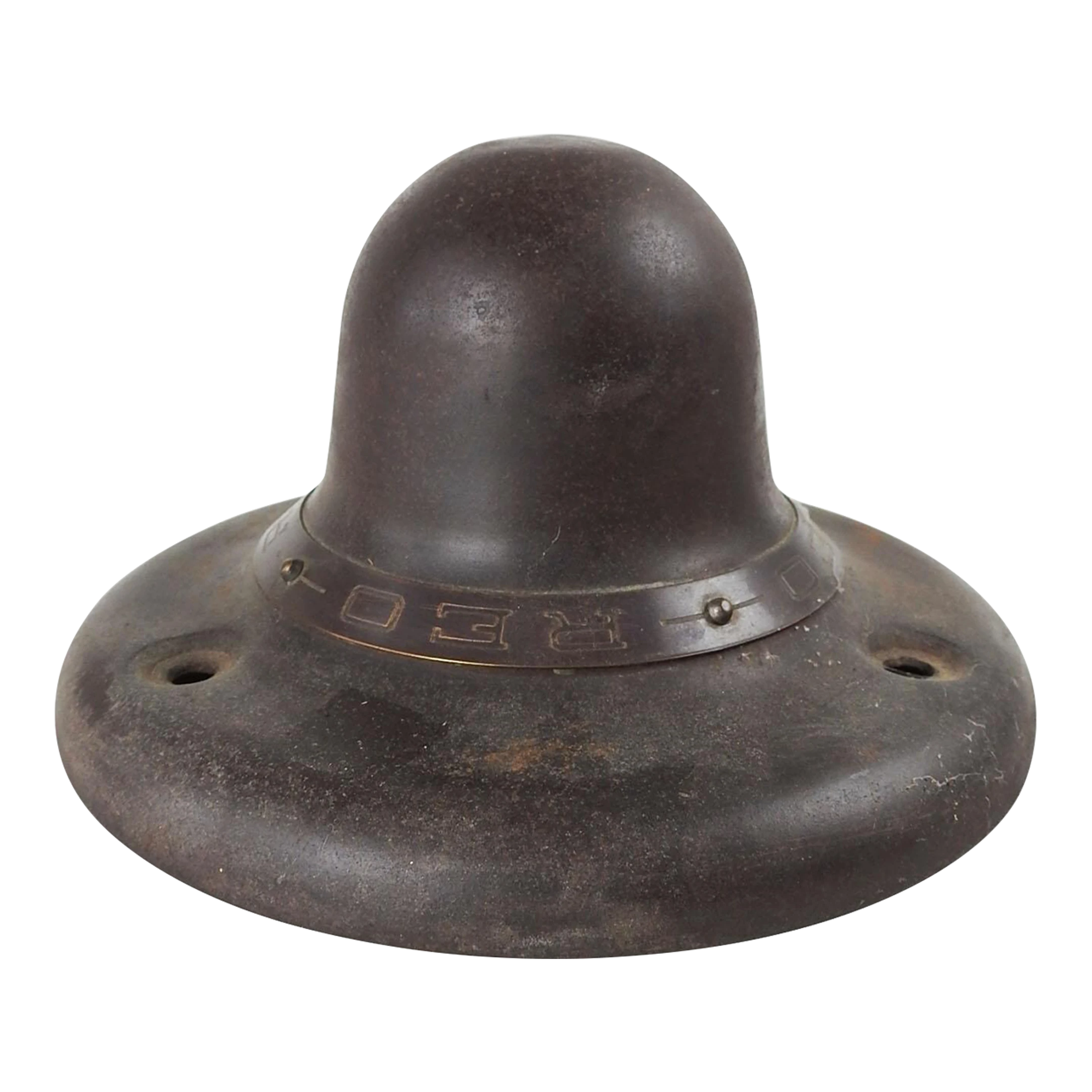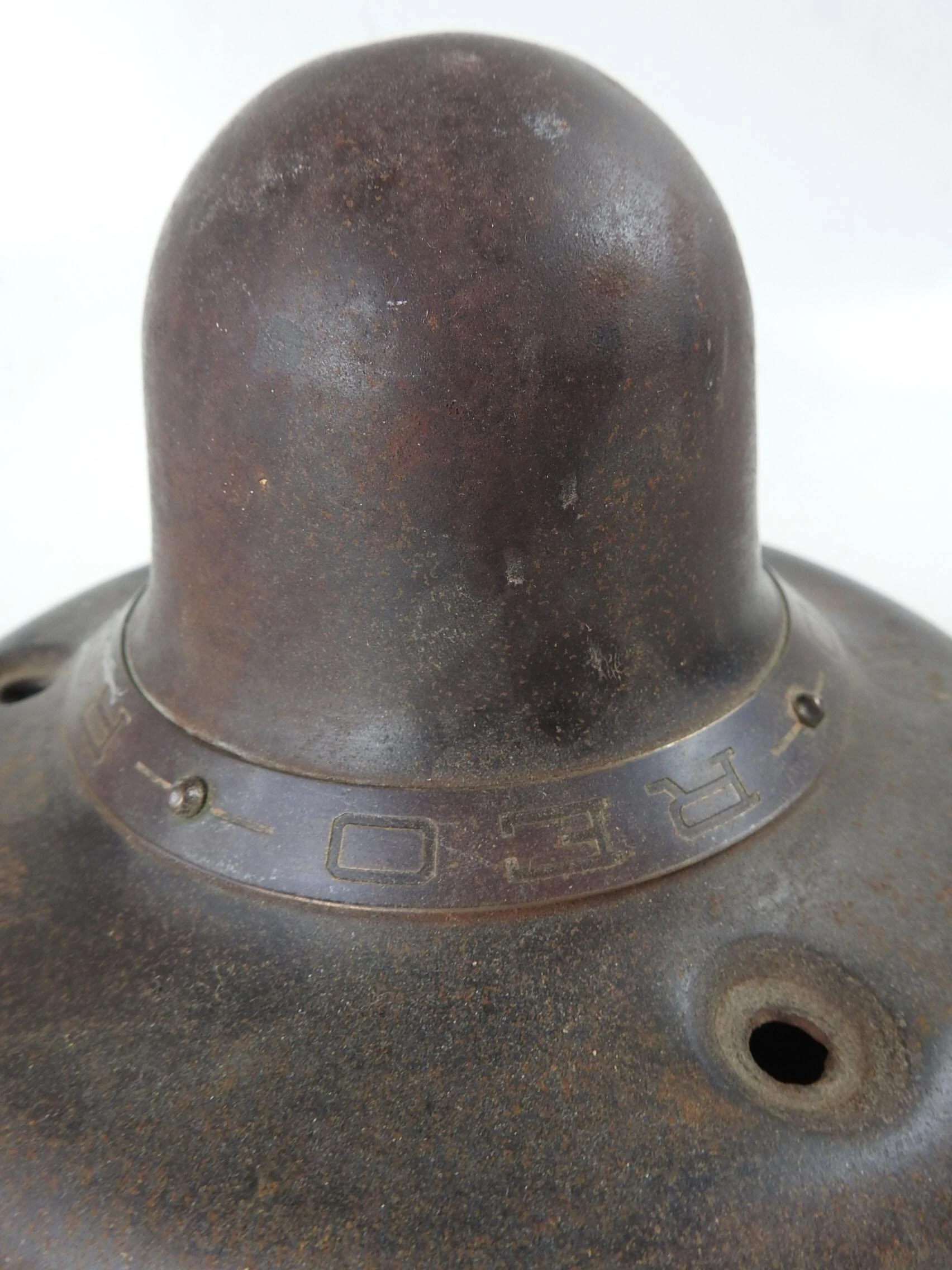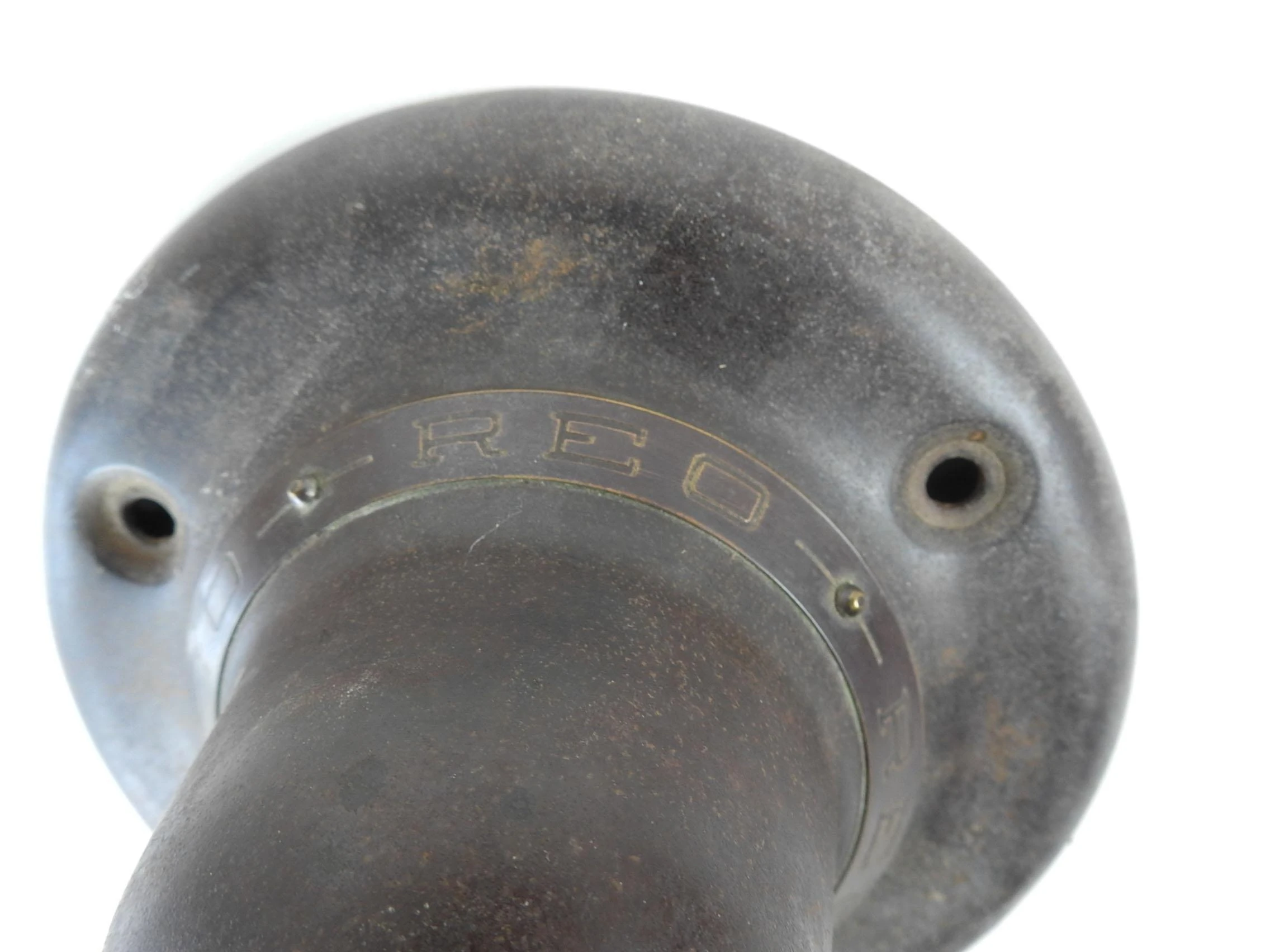 Vintage circa 1920’s REO wheel cover, brass band with REO engraved. 4.5″ h x 7.5″ dia. at base, overall patina.