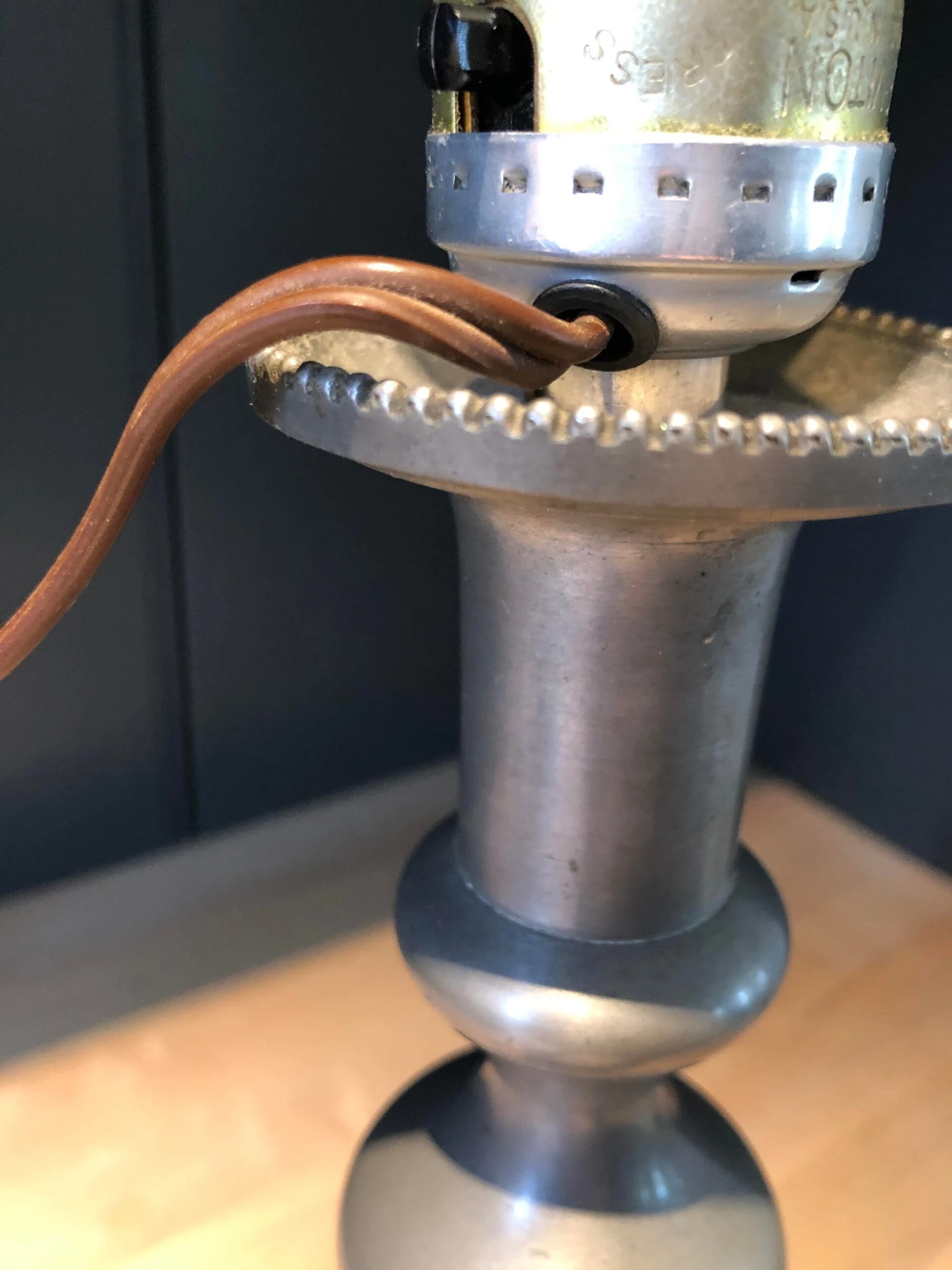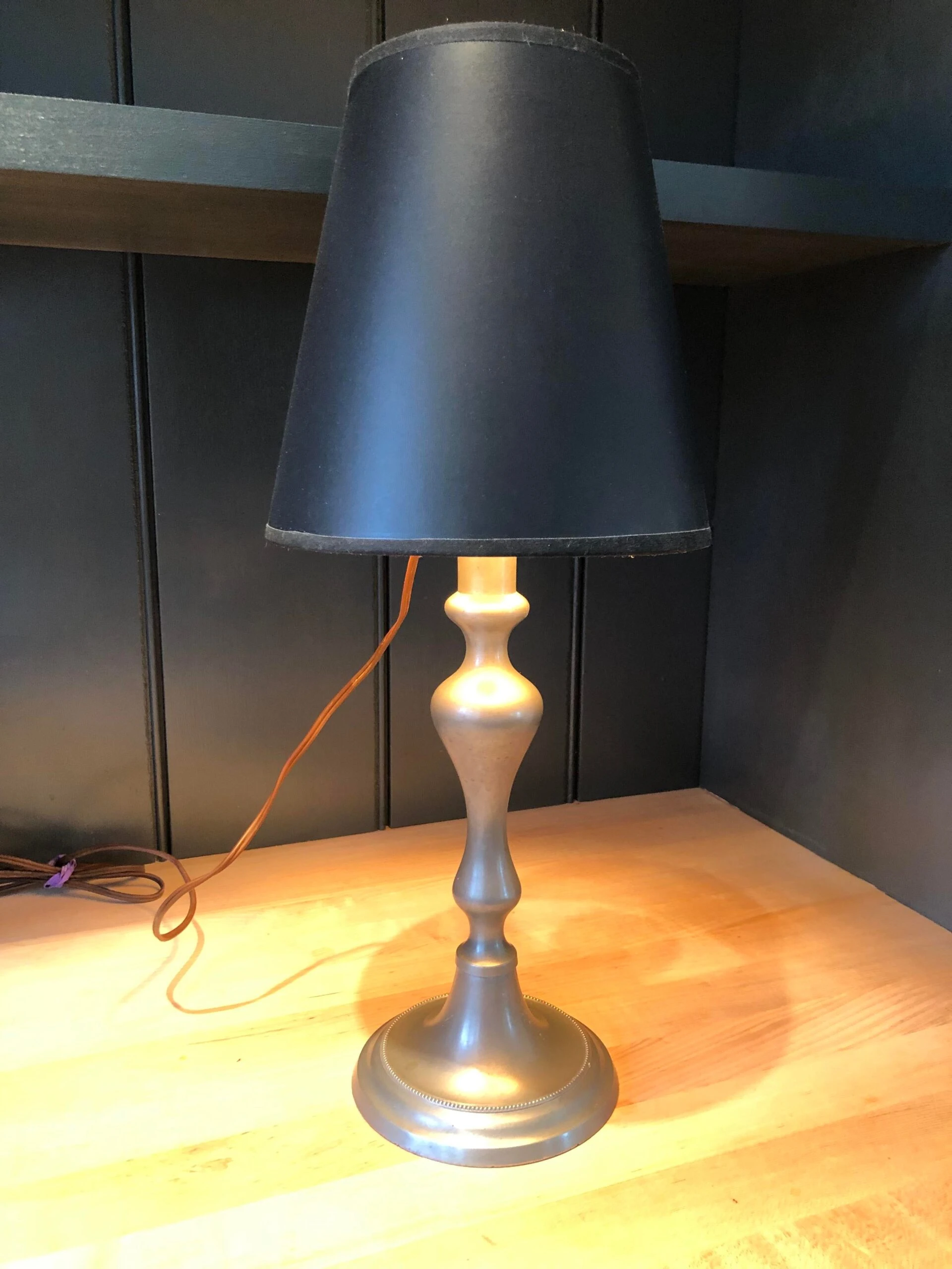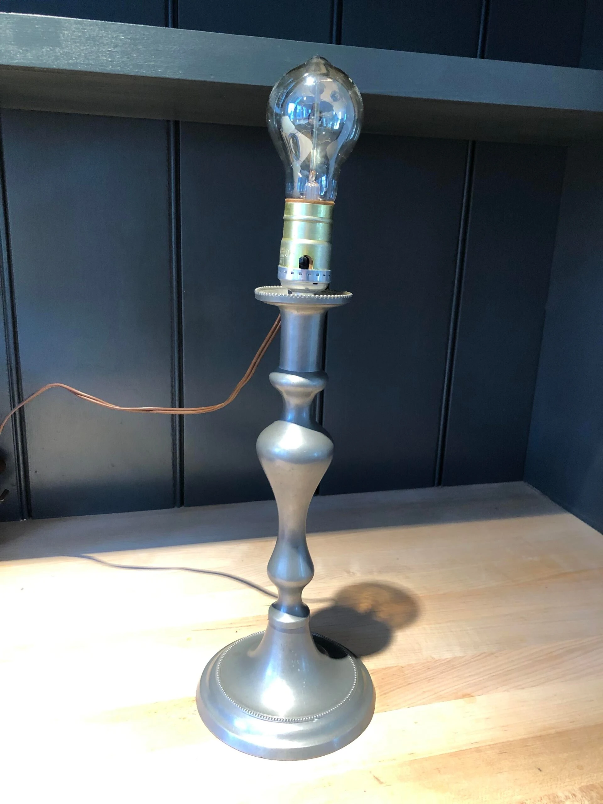 Circa mid 1800s pewter push up candlestick converted into table lamp, no finial will need a clip on lamp shade, …