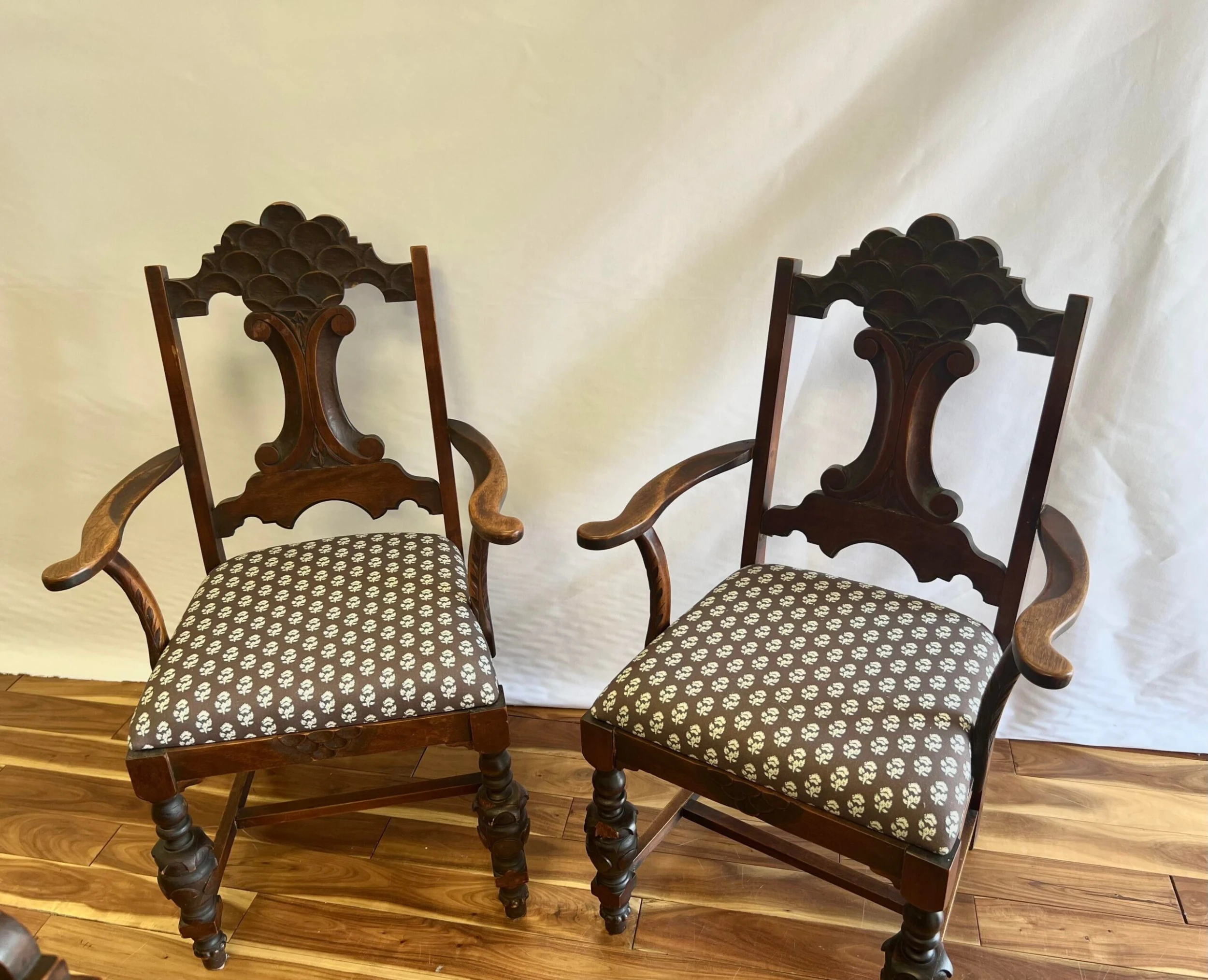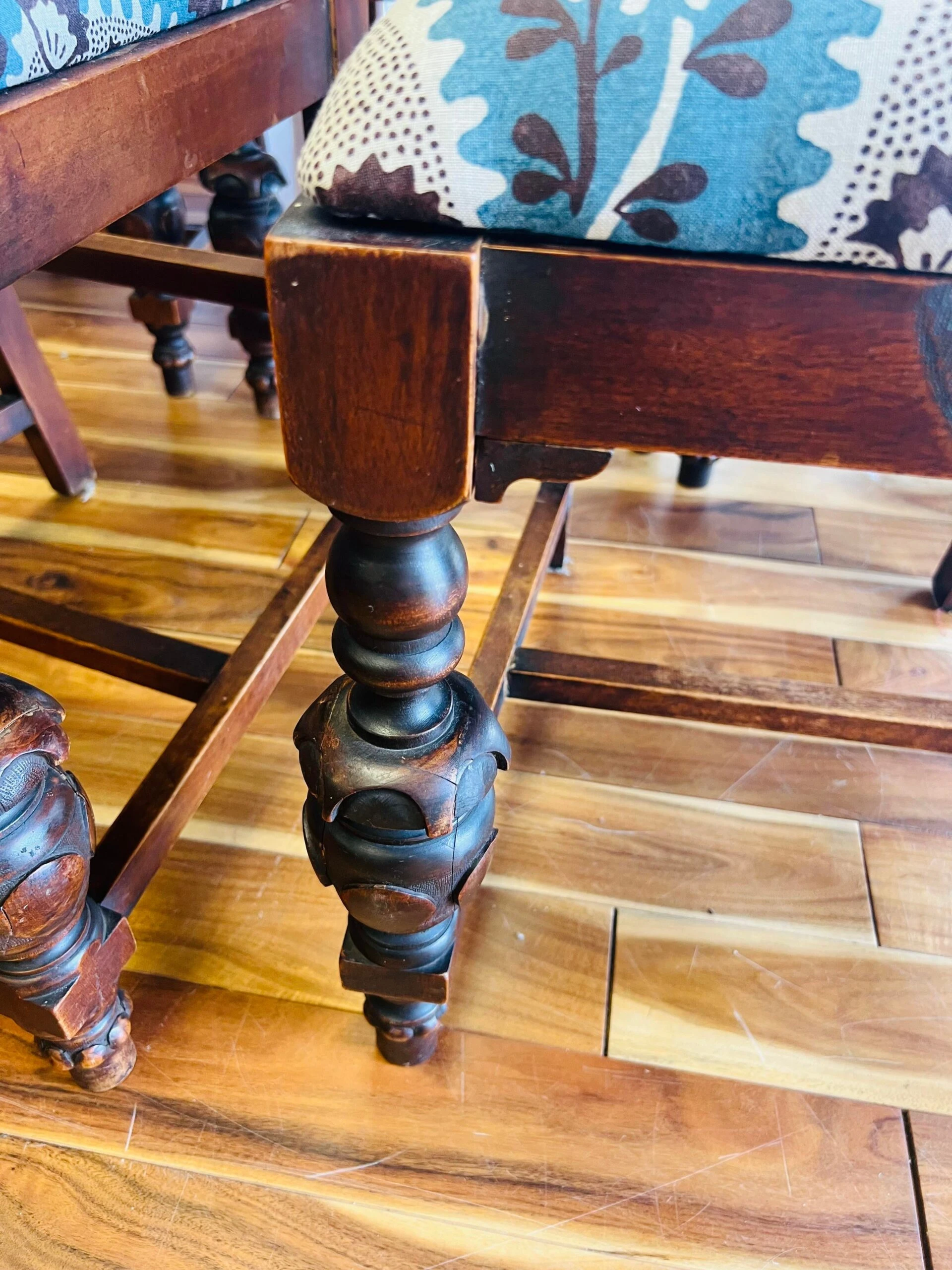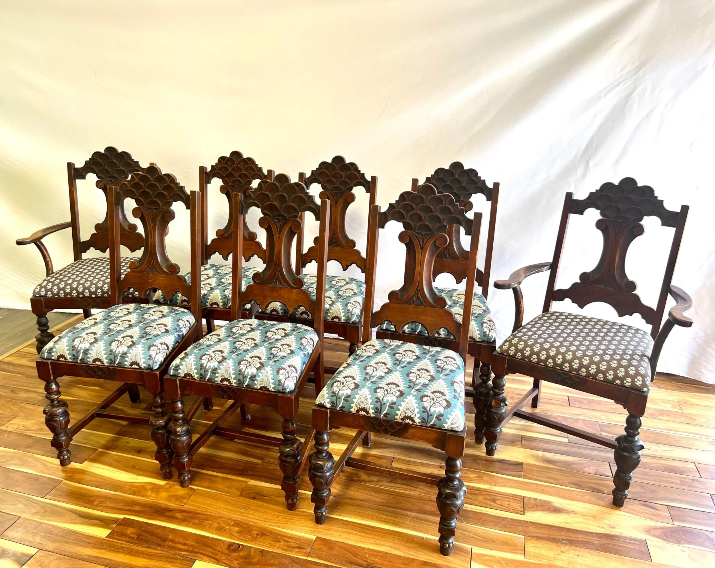Stunning antique hand carved wood 9 piece dining room set that consists of an expandable dining room table and 8 newly upholstered chairs in Thibaut’s Anna French Cornwall and Julian fabric in brown and blue. New foam and wood polish. Heavy carved details suitable for an impressive castle like ambiance. The table measures 29.5” high, 60” wide and 44” deep. Expands to 80”. The chairs are 39” tall, 17” wide and 16” deep. Minor wear on the chairs, and insignificant missing details here and there as well as discoloration and spots on the table top which will need to be refinished.
