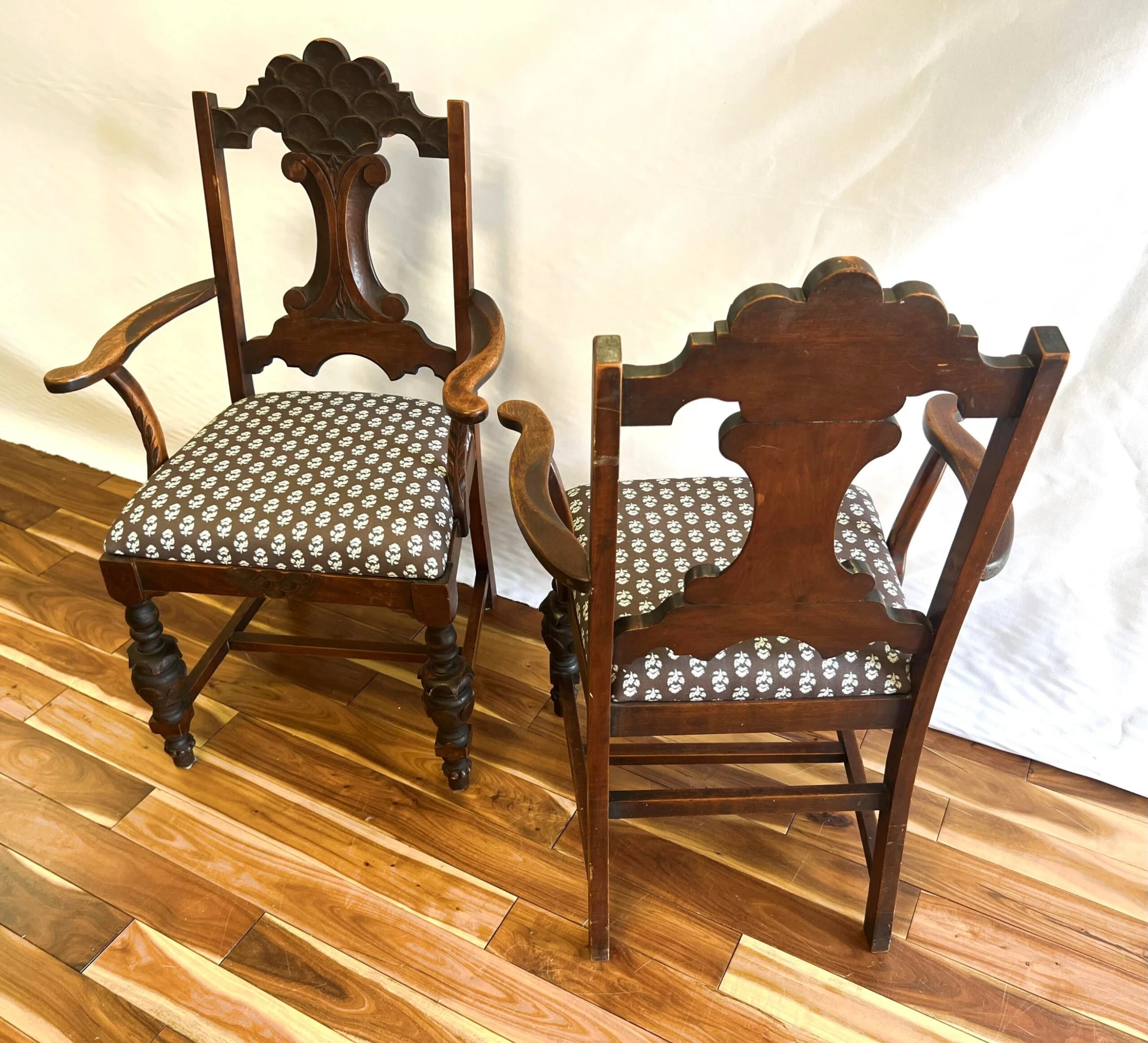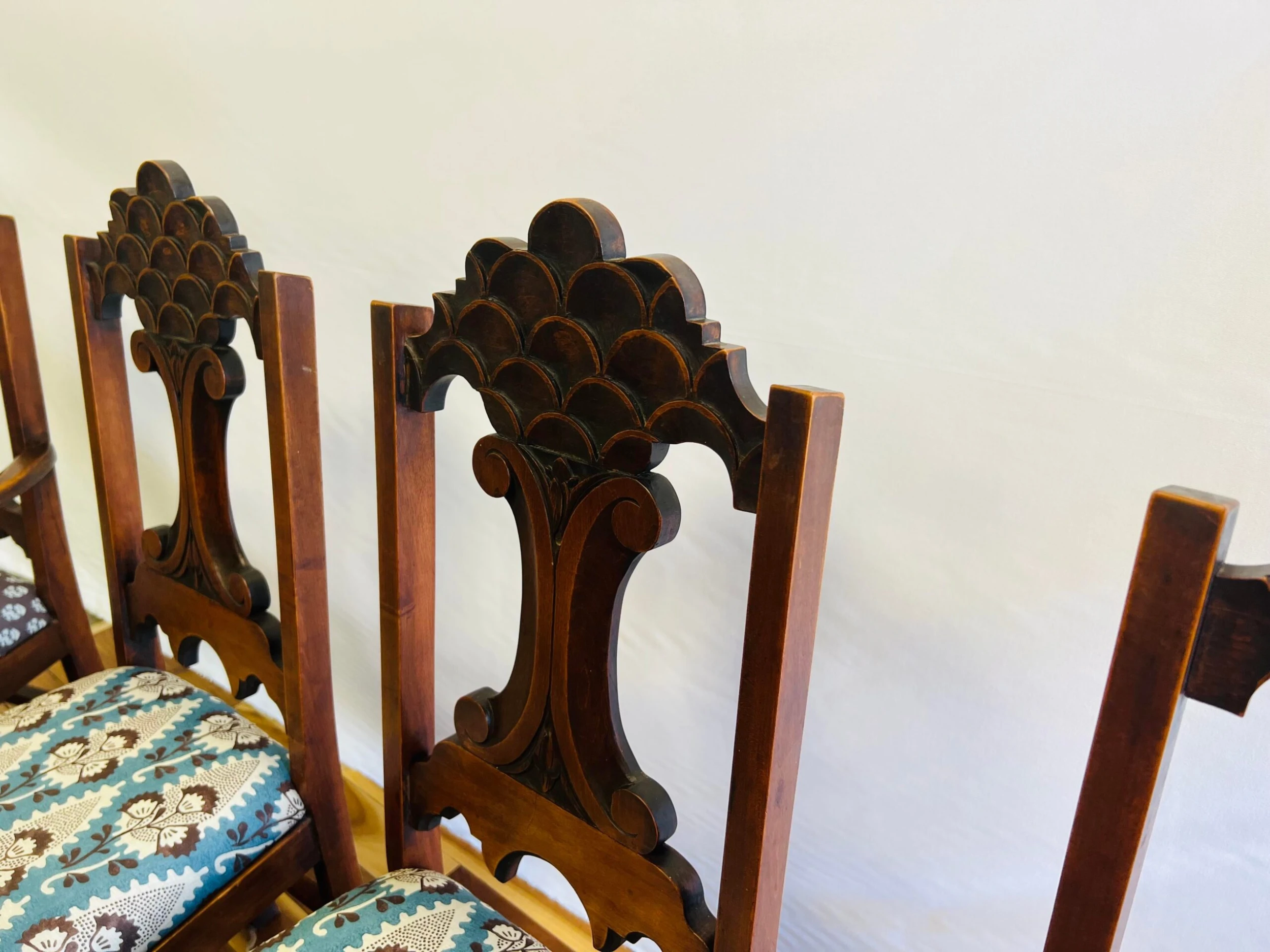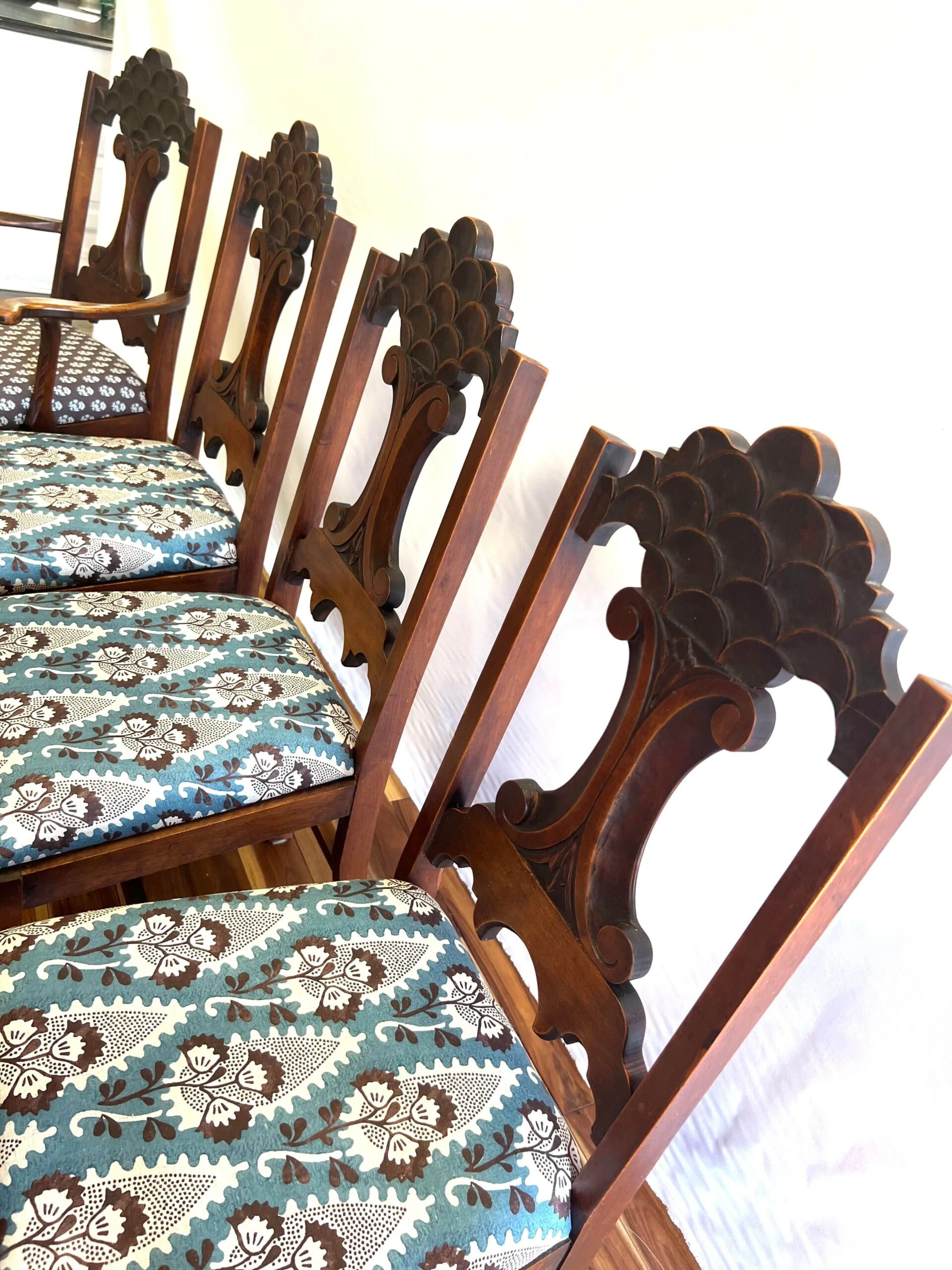 Stunning antique hand carved wood 9 piece dining room set that consists of an expandable dining room table and 8 newly upholstered chairs in Thibaut’s Anna French Cornwall and Julian fabric in brown and blue. New foam and wood polish. Heavy carved details suitable for an impressive castle like ambiance. The table measures 29.5” high, 60” wide and 44” deep. Expands to 80”. The chairs are 39” tall, 17” wide and 16” deep. Minor wear on the chairs, and insignificant missing details here and there as well as discoloration and spots on the table top which will need to be refinished.