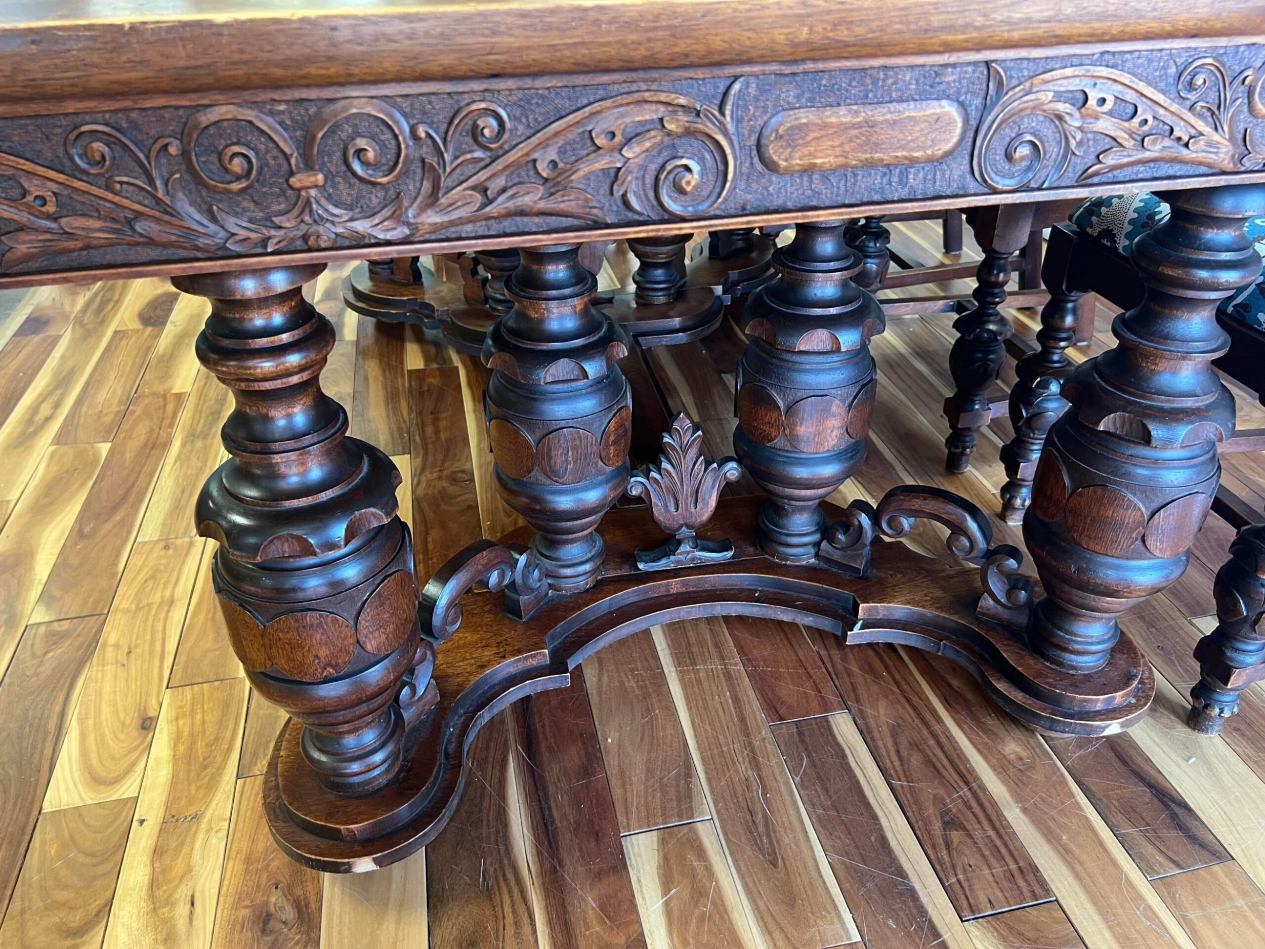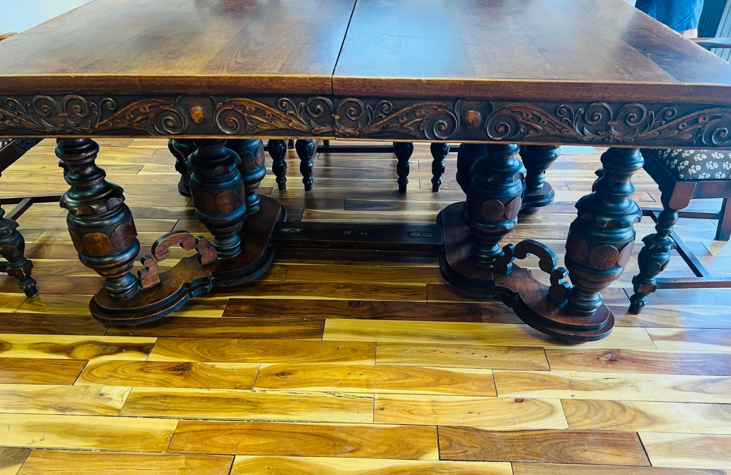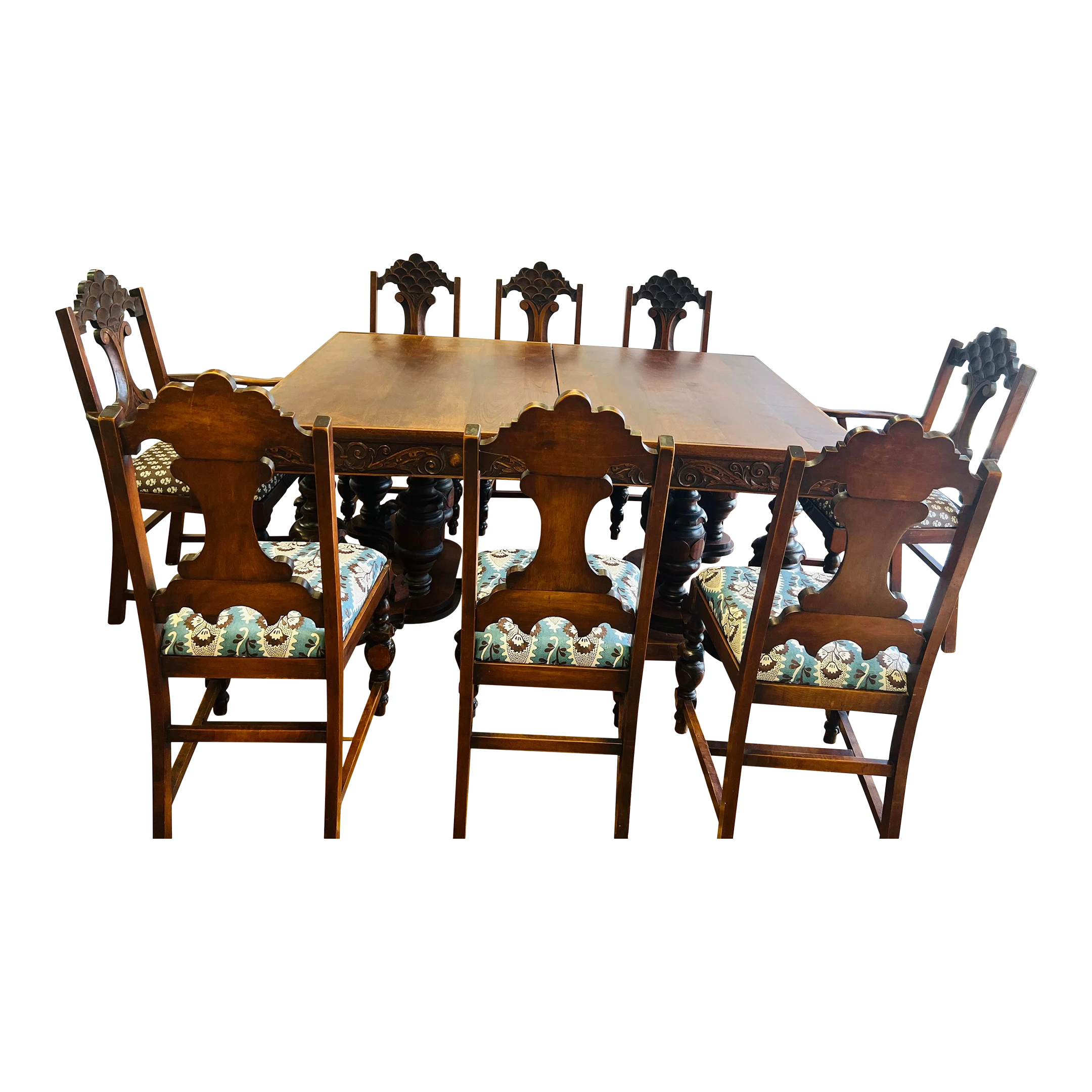 Stunning antique hand carved wood 9 piece dining room set that consists of an expandable dining room table and 8 …