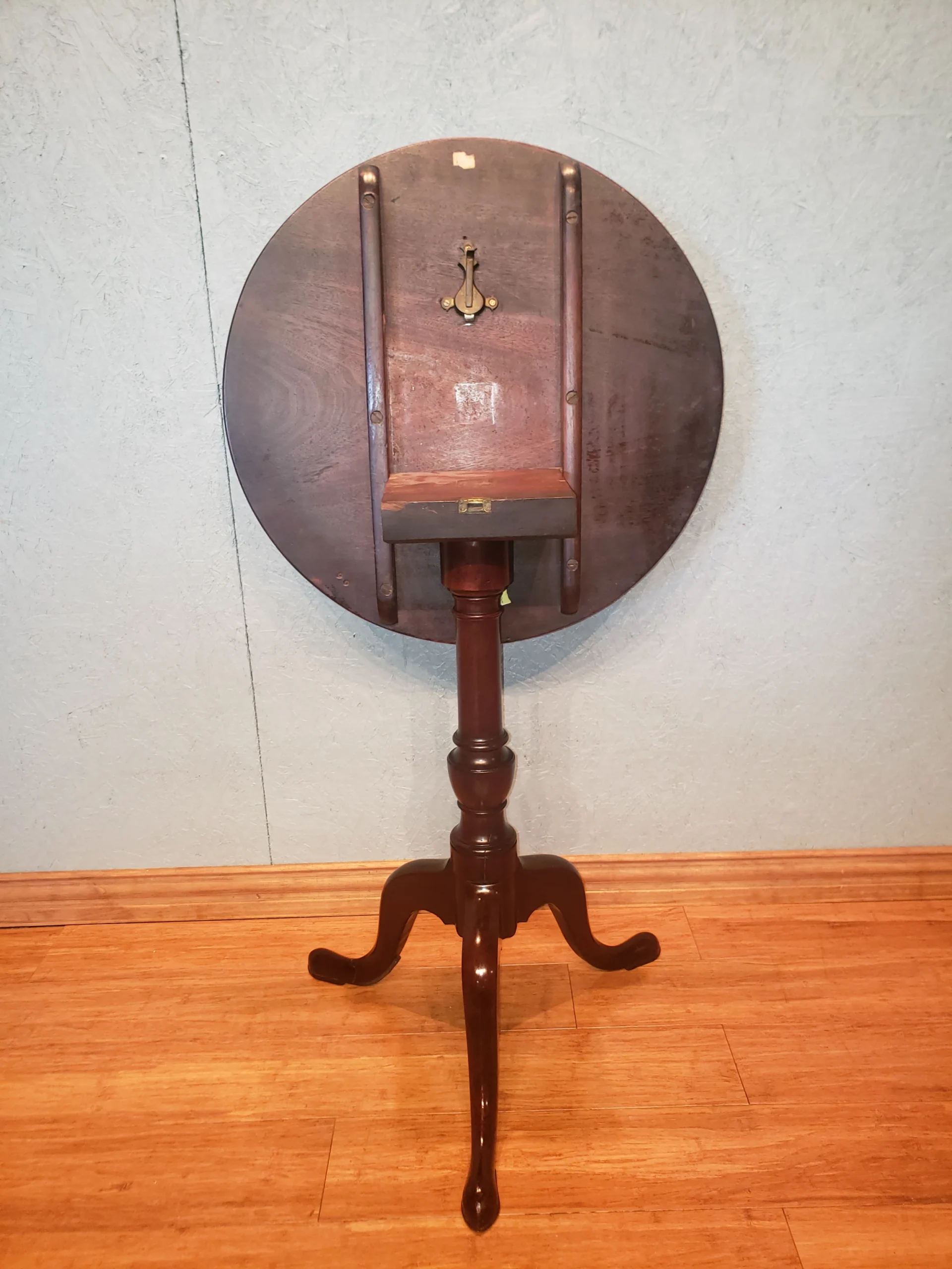 What an outstanding English Provincial Cherry Tilt Top Table with very brilliant and visible grain detail in the top. This selection features 3 Cabriole legs, barrel form pillar and a brass push catch latch. This piece would be an excellent choice for any room, with its popup design, it can be easily pushed next to wall to make room in smaller rooms.