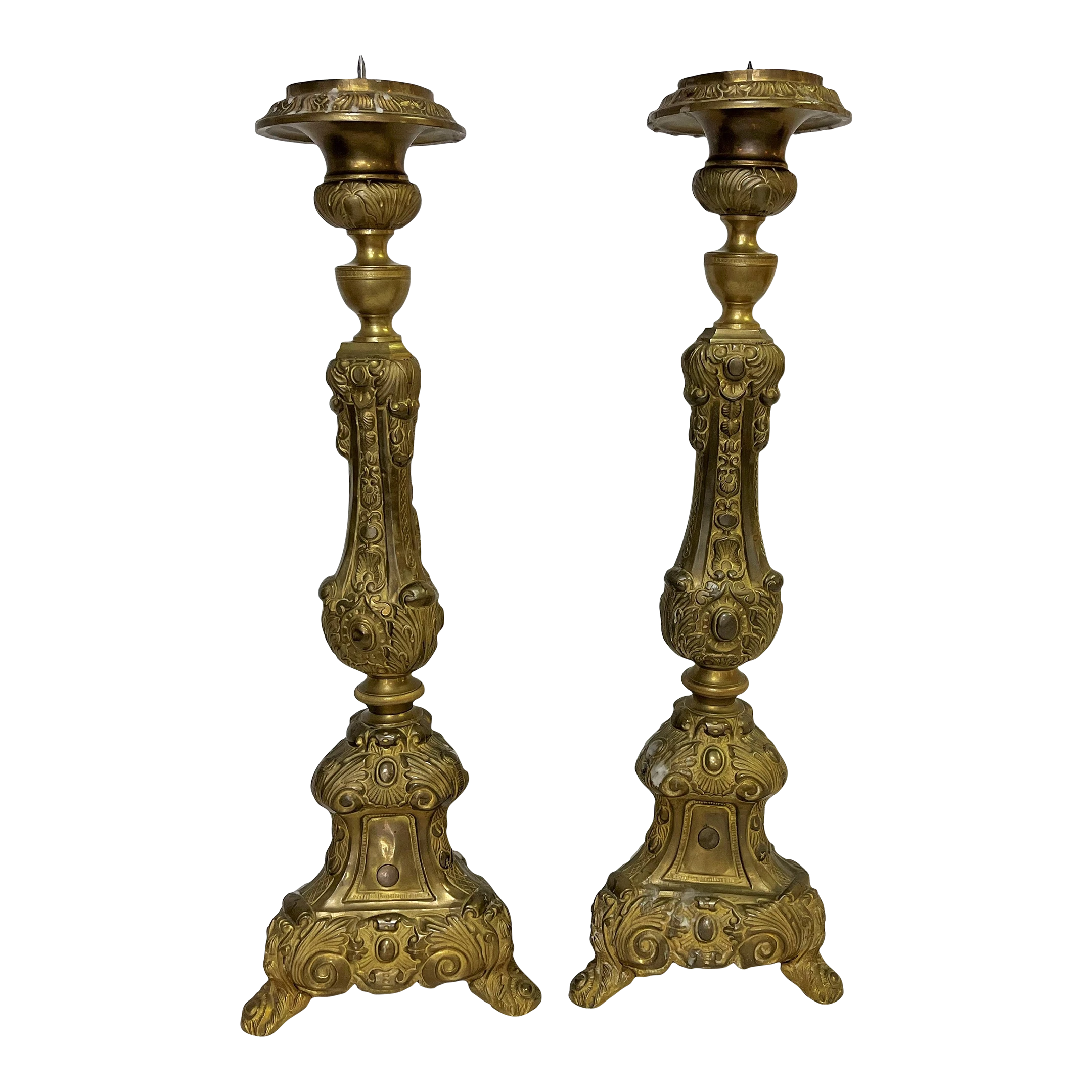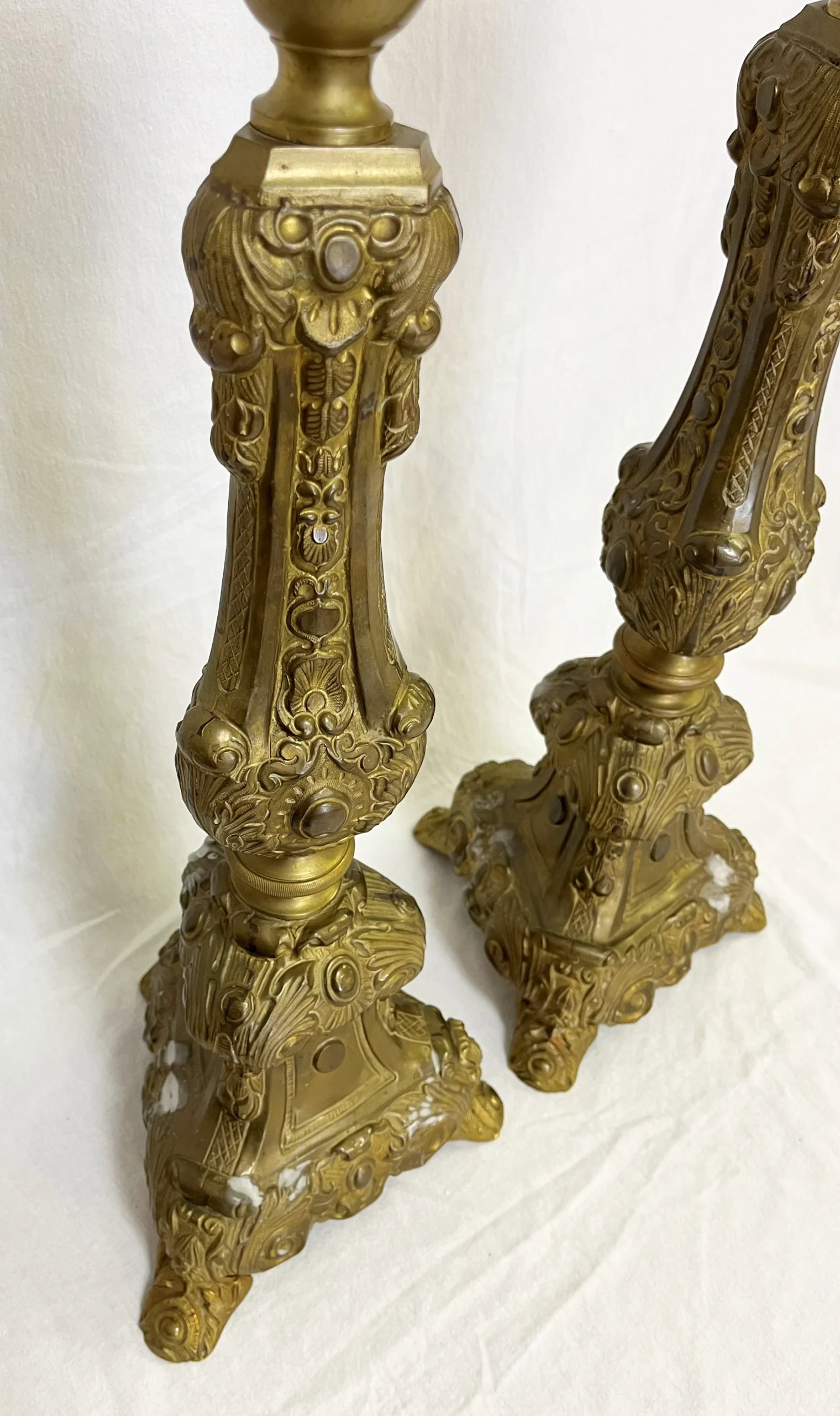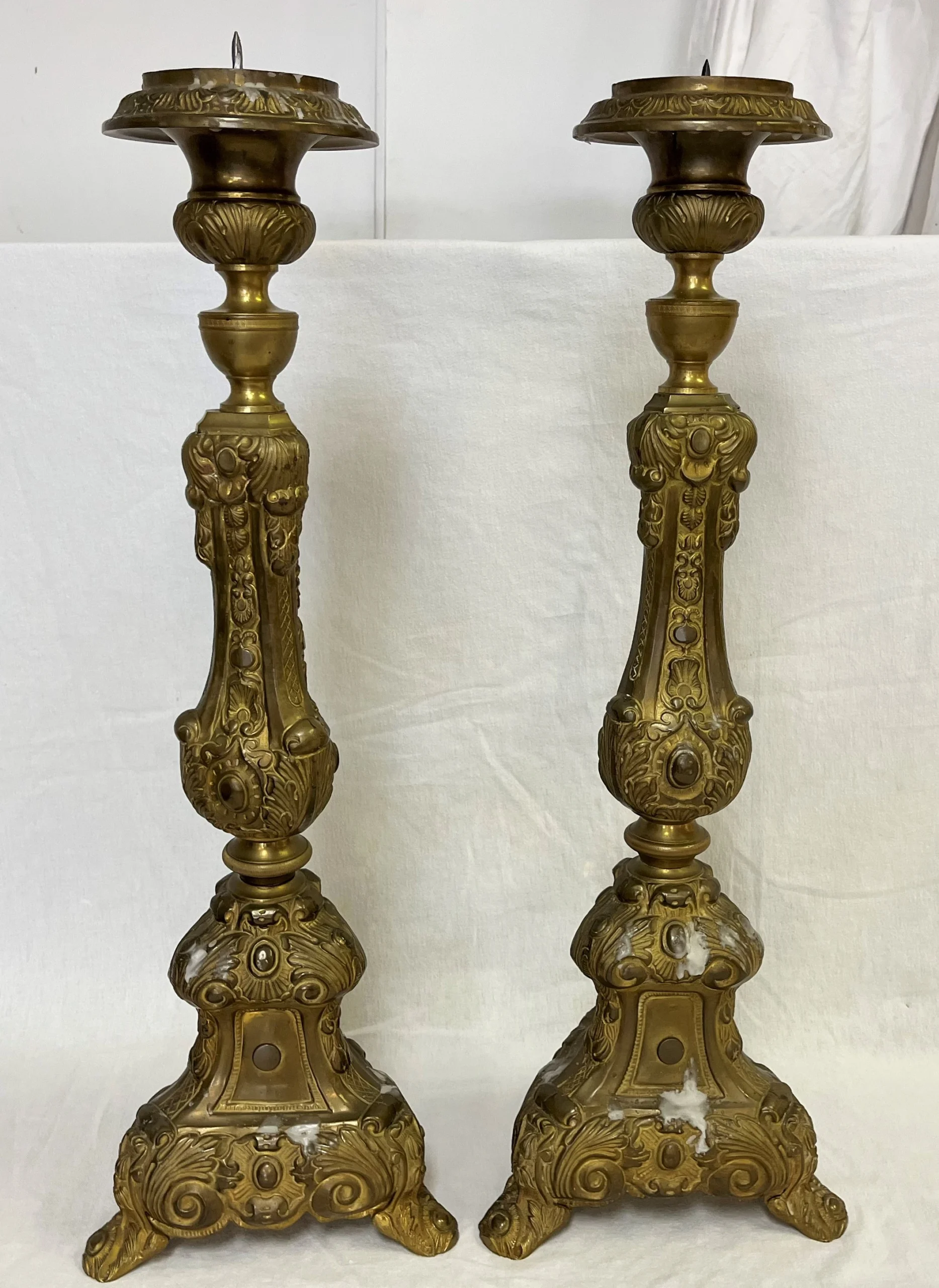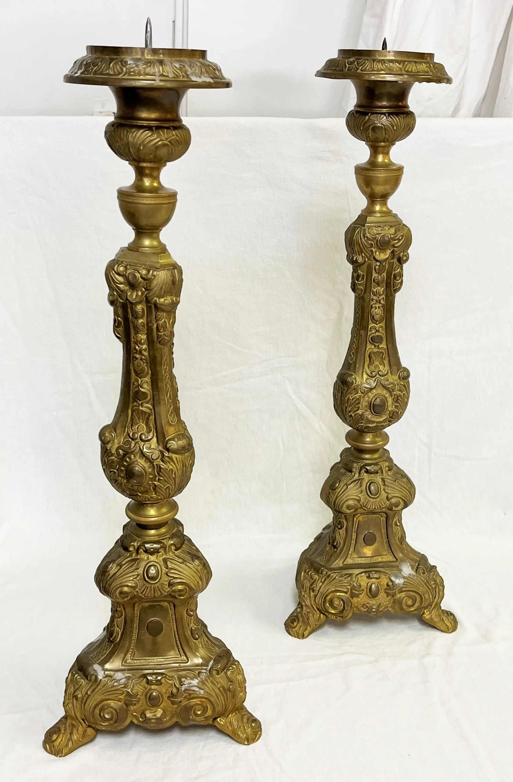 Fabulous and ornate pair of large French brass altar prickets or candlesticks. The pair is from the early 1900’s and …