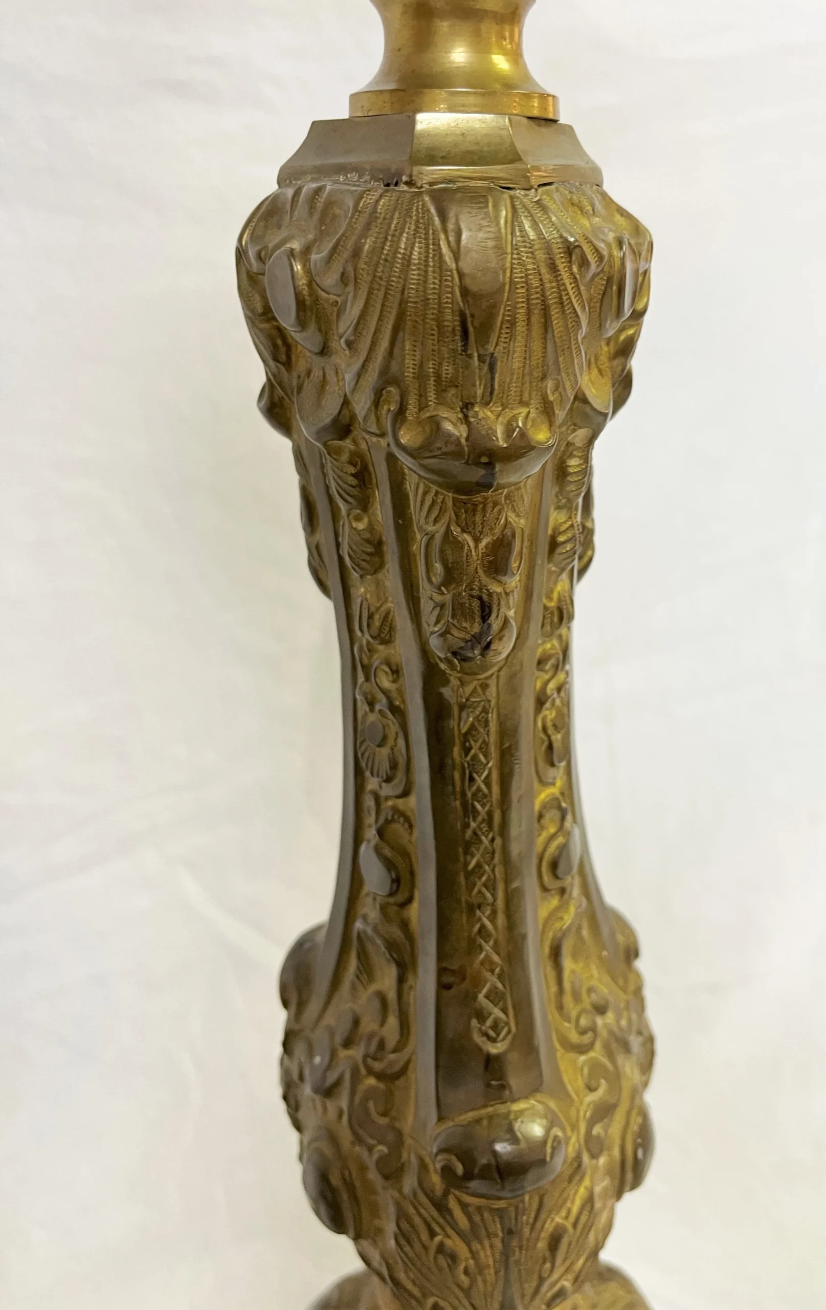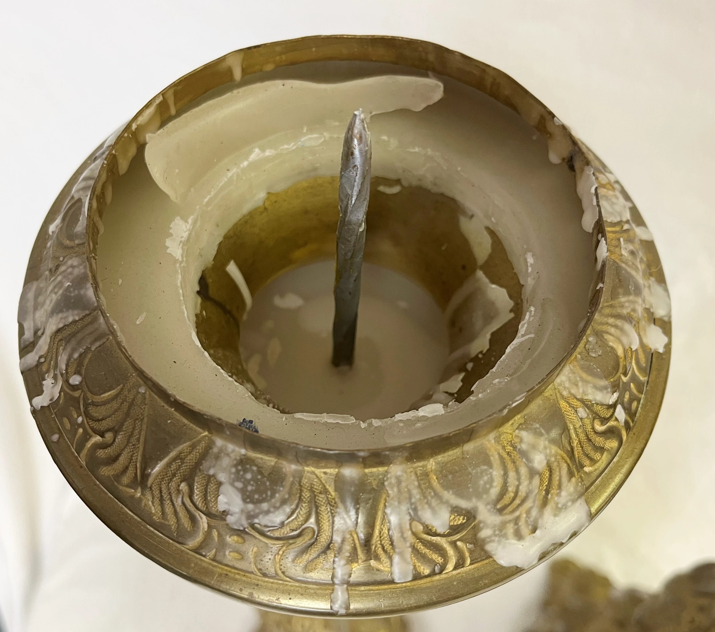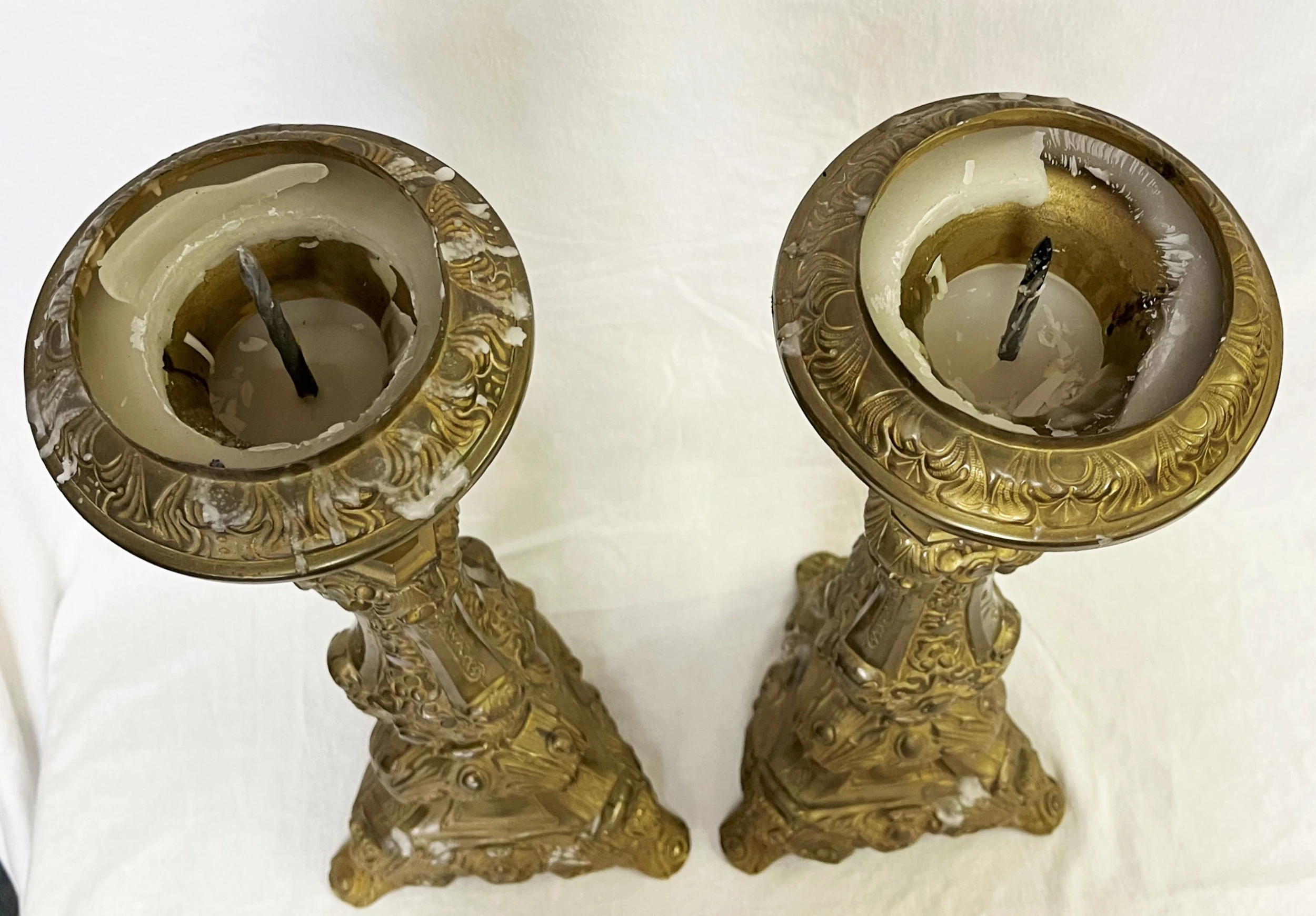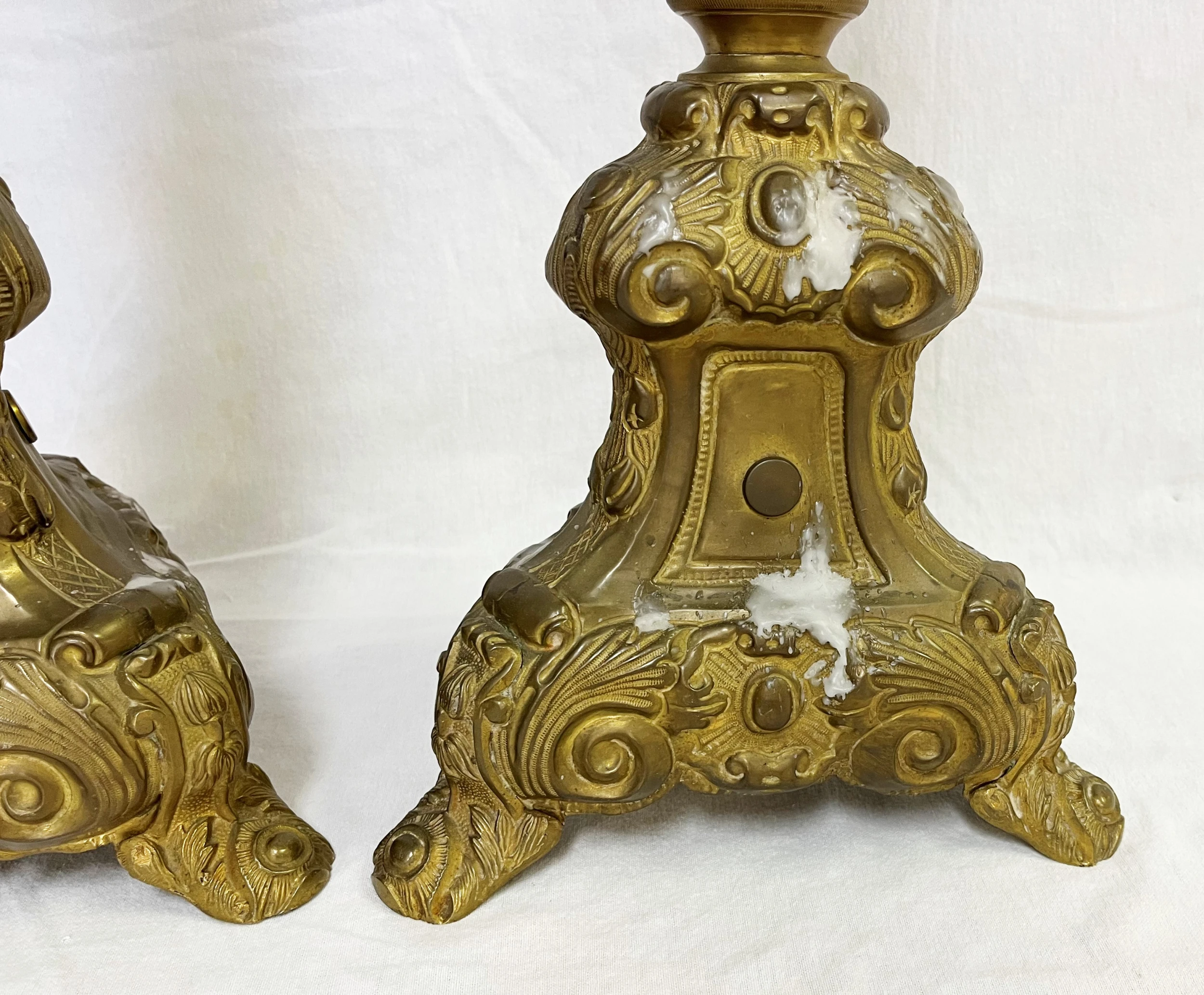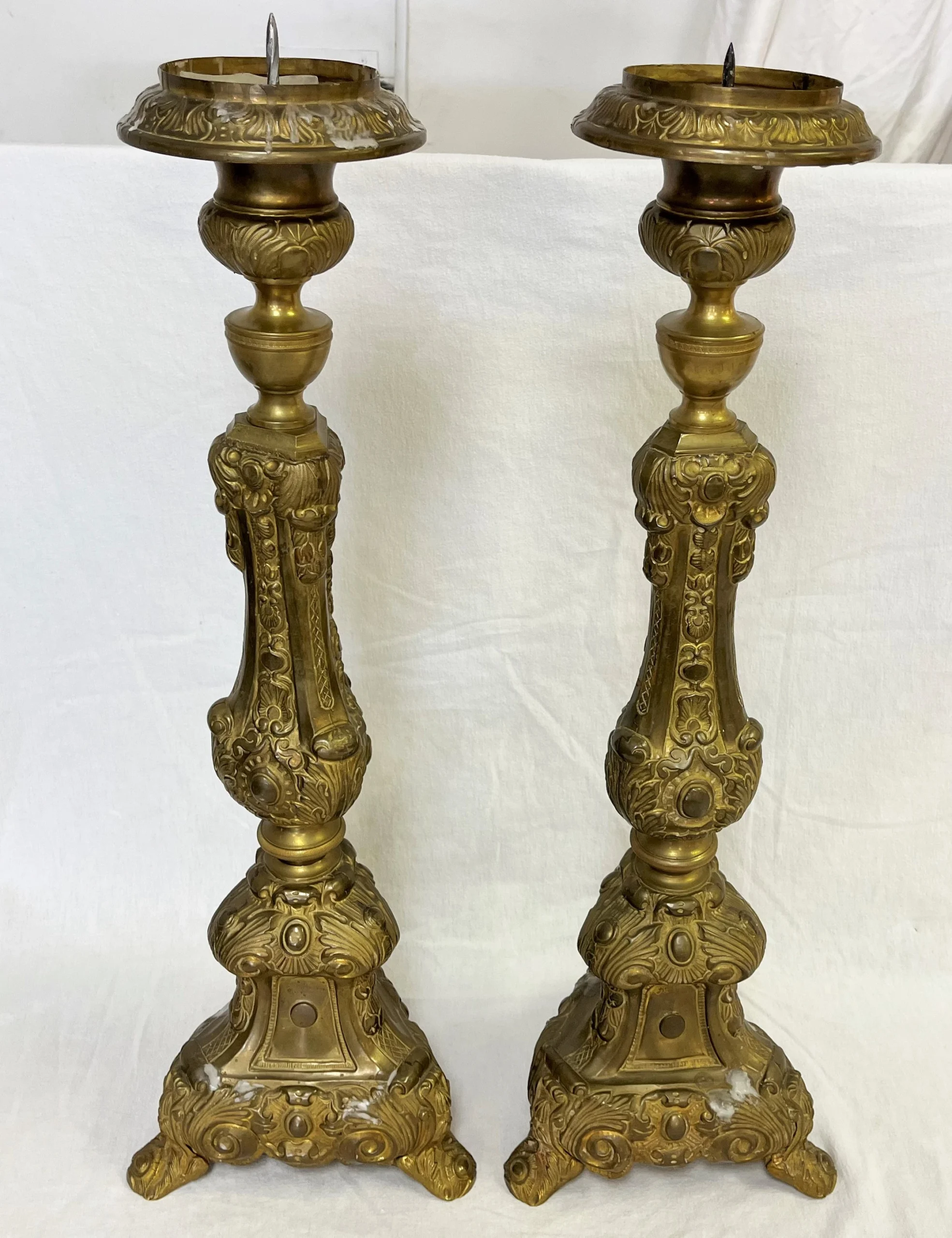 Fabulous and ornate pair of large French brass altar prickets or candlesticks. The pair is from the early 1900’s and …