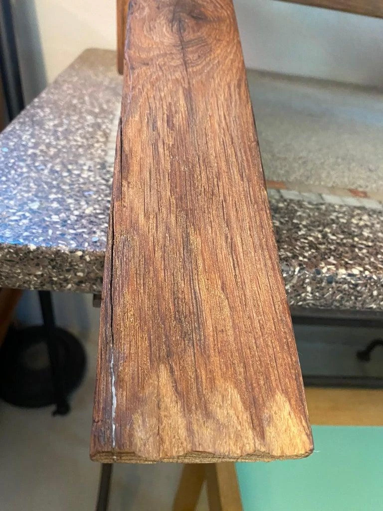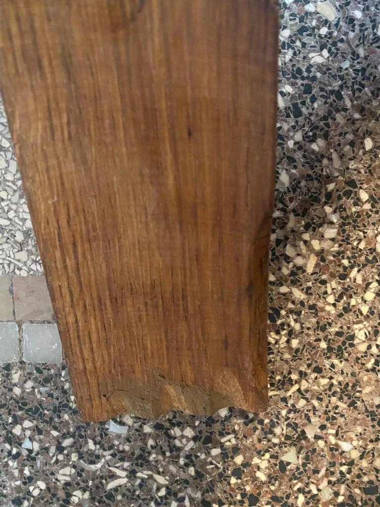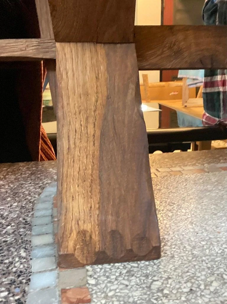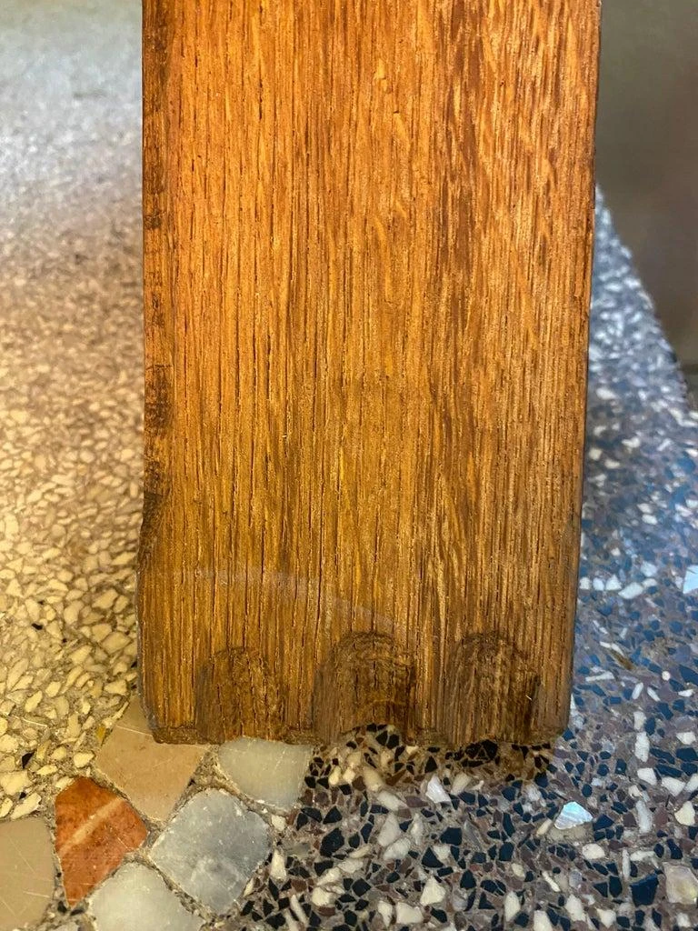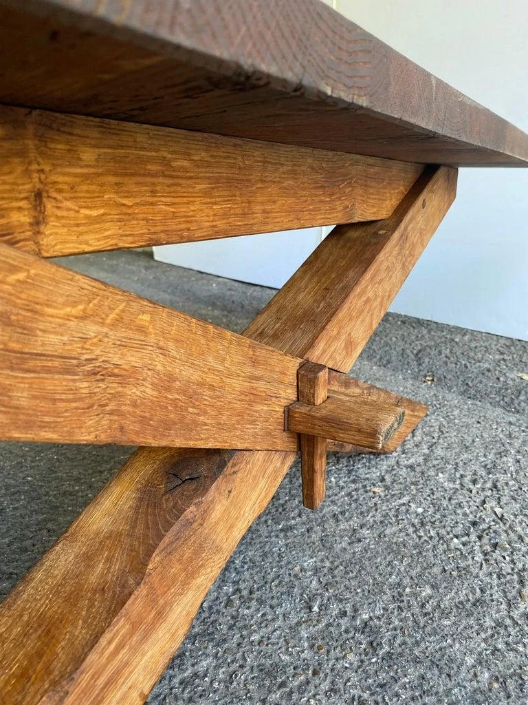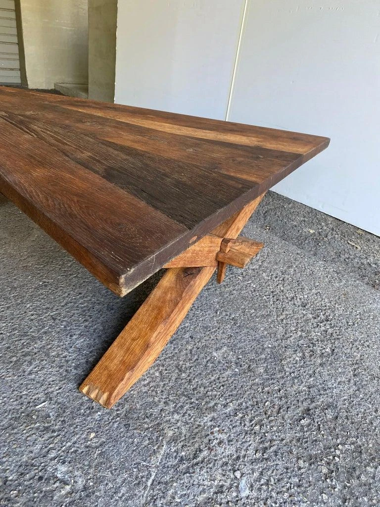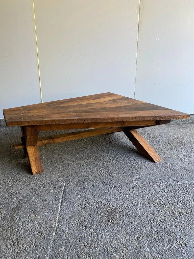 Sculptural cocktail table in the rustic Mid-Century Modern aesthetic of France and Belgium referred to as Brutalist. The heavy solid oak table is likely hand crafted and has a unique triangle shape and exposed joinery. Wax finish on scraped oak presents handsomely and structurally the table is in very good condition.