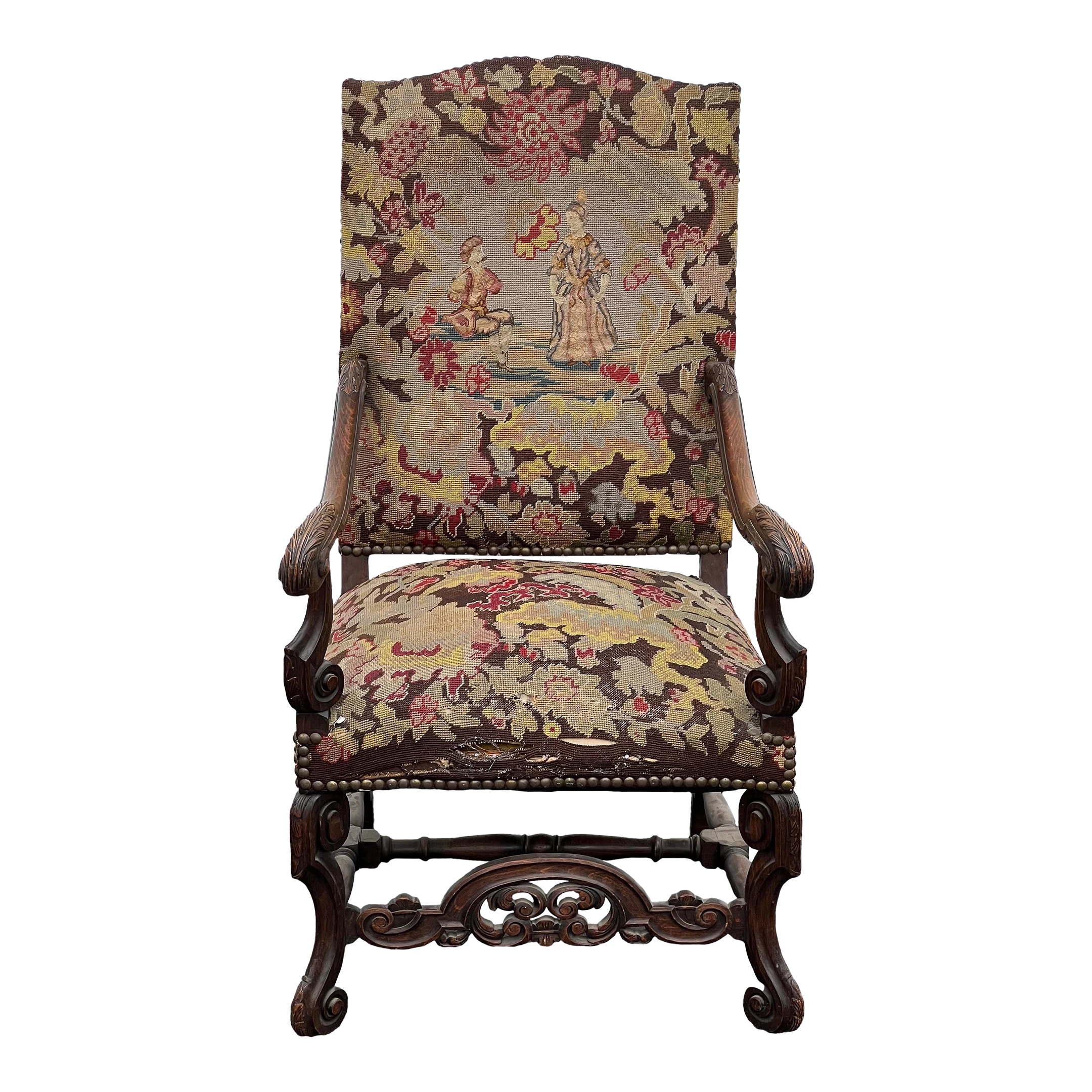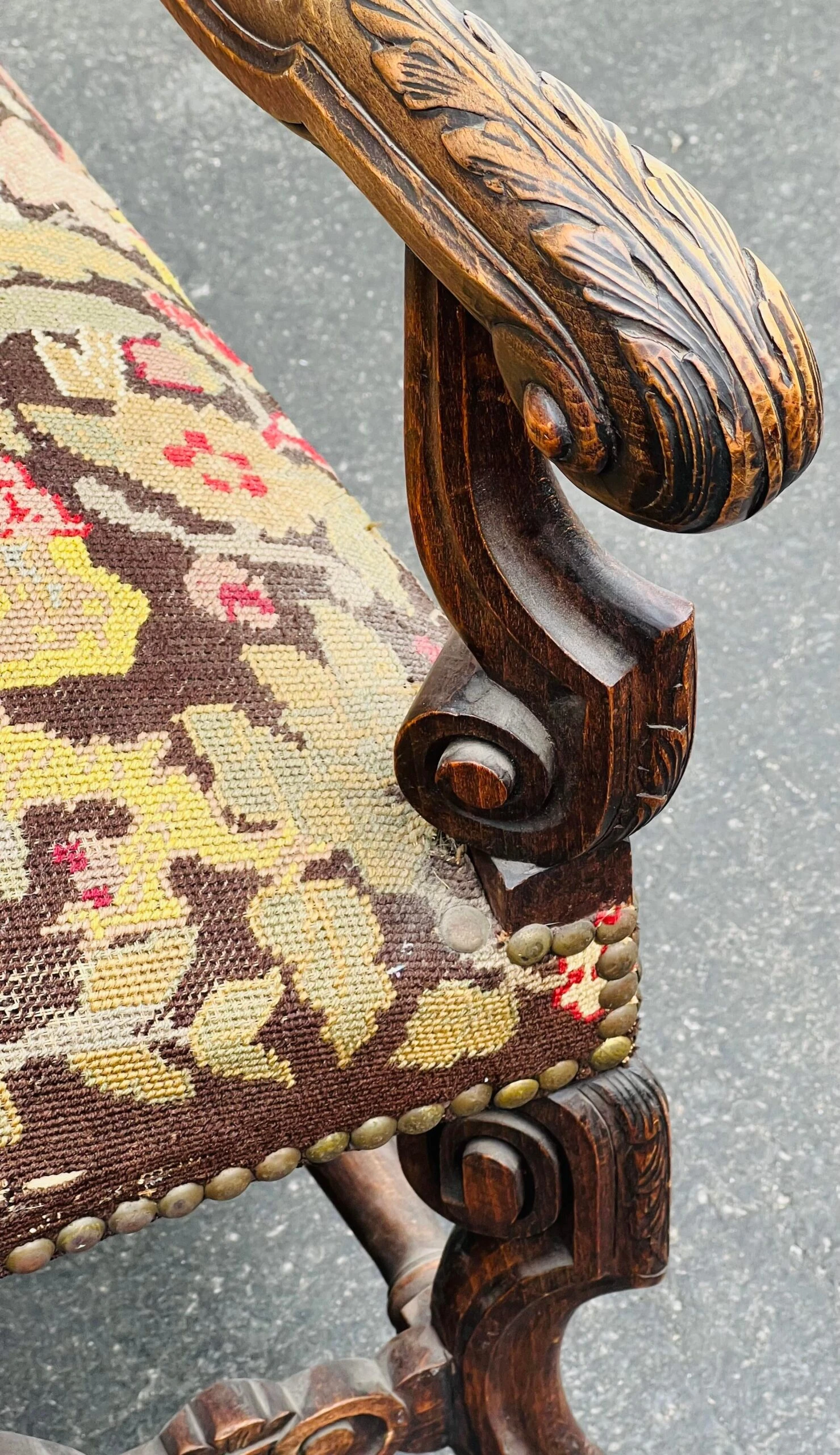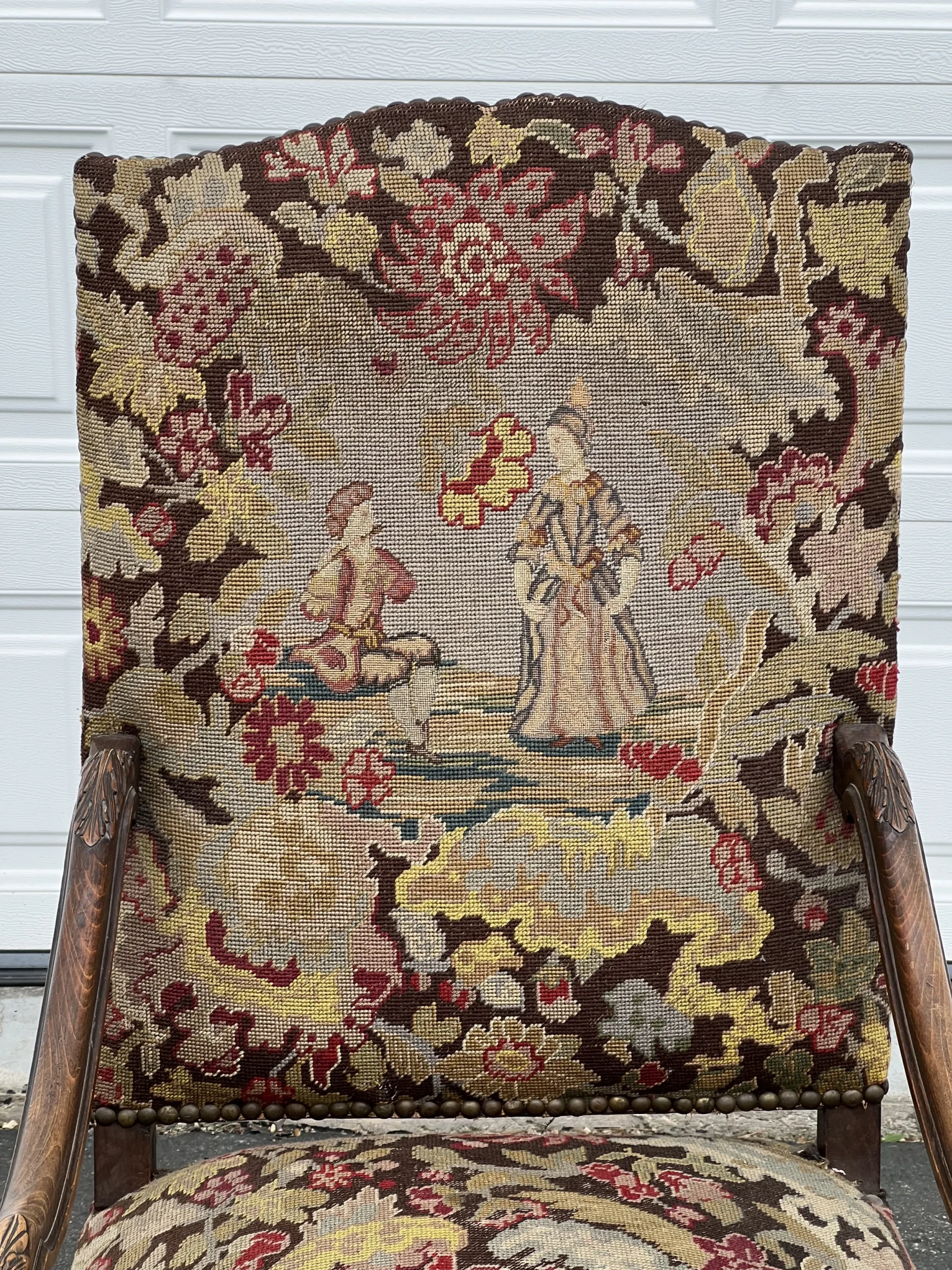 Upholstery of mideivel eedlepoint is somewhat tired on the seat but still in great shape on the back of chair. Chair is in sturdy condition. Could use a litle stain to on areas of the surface.