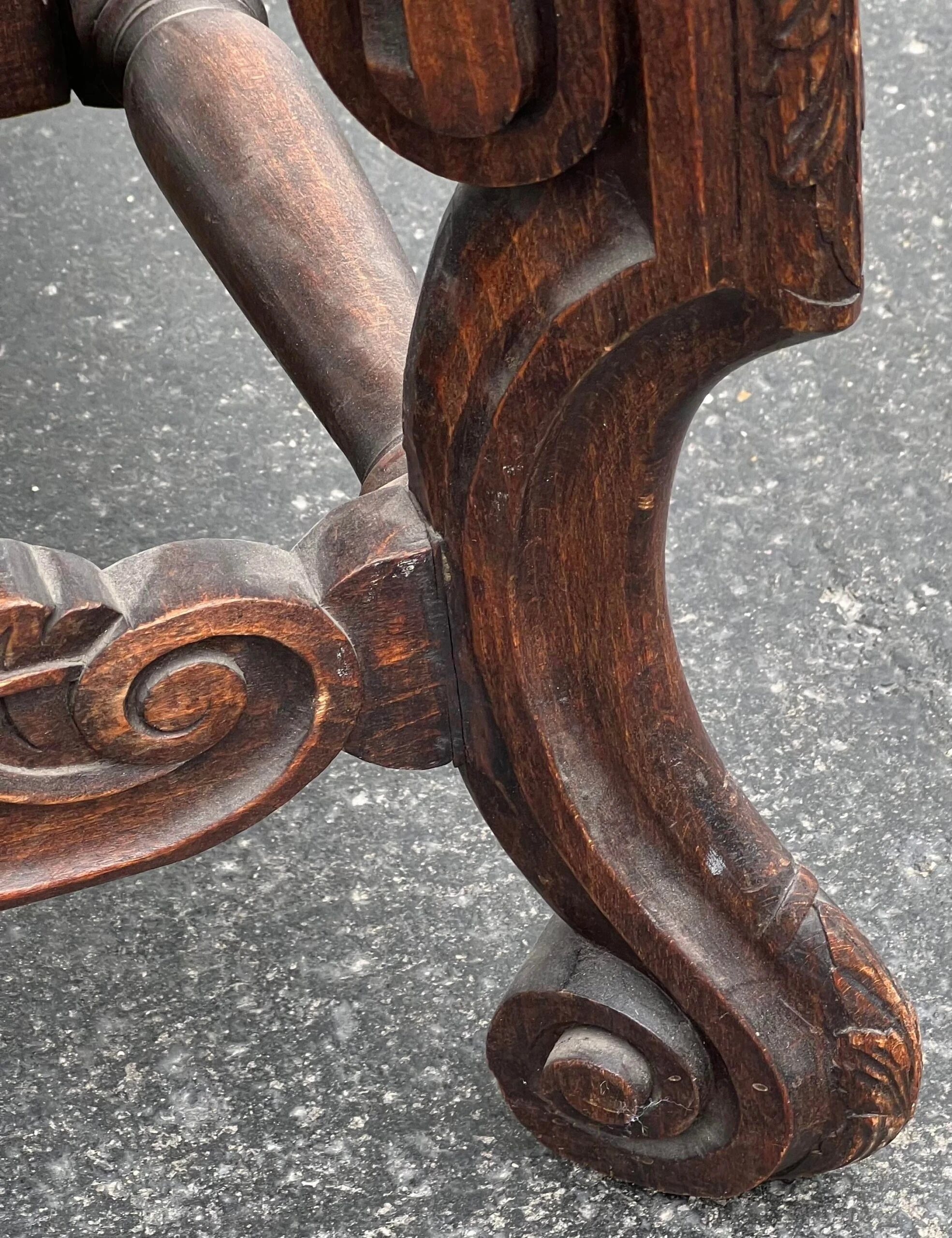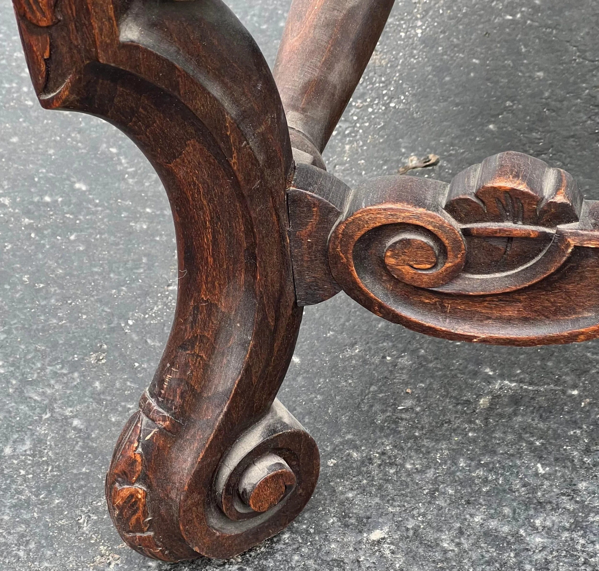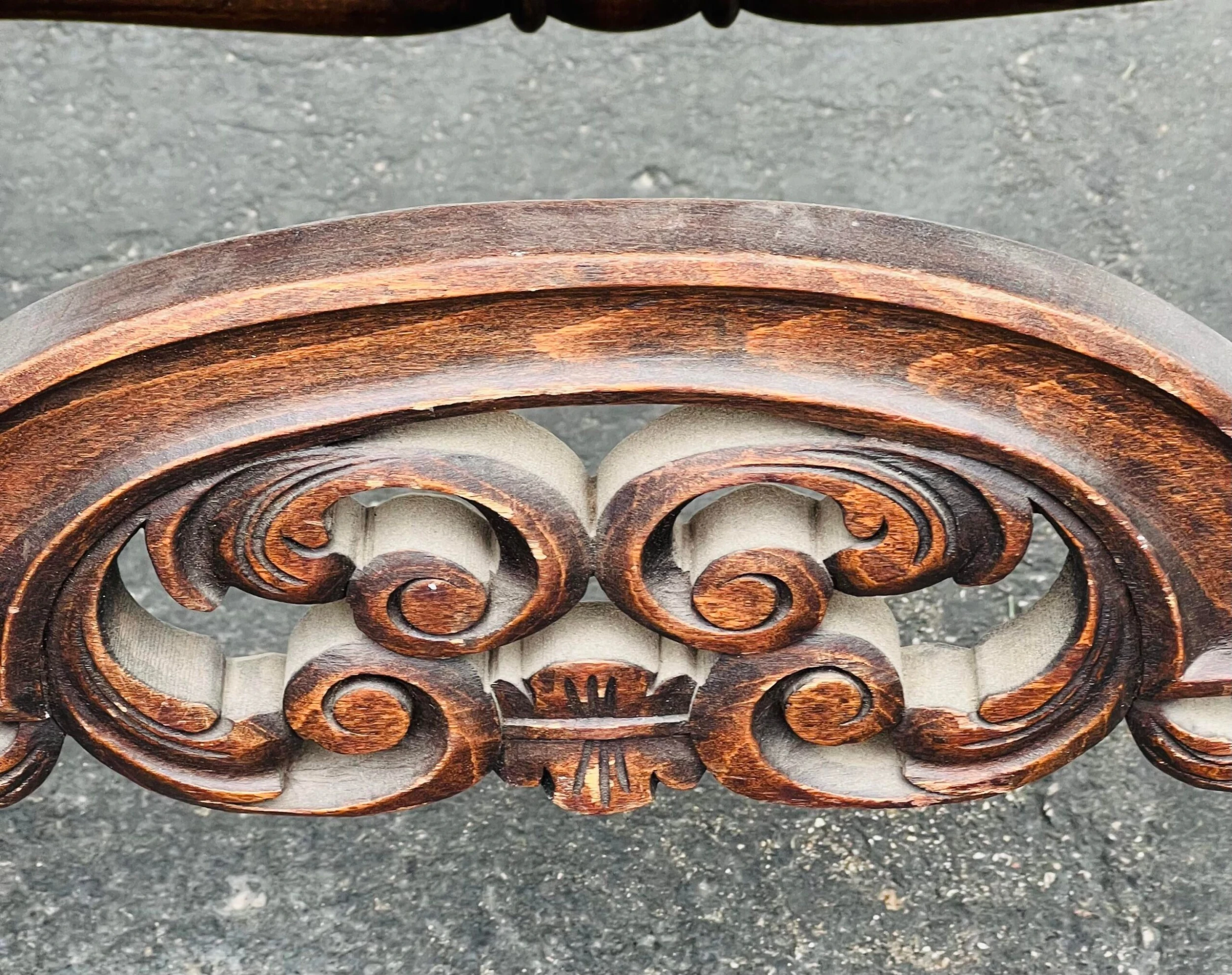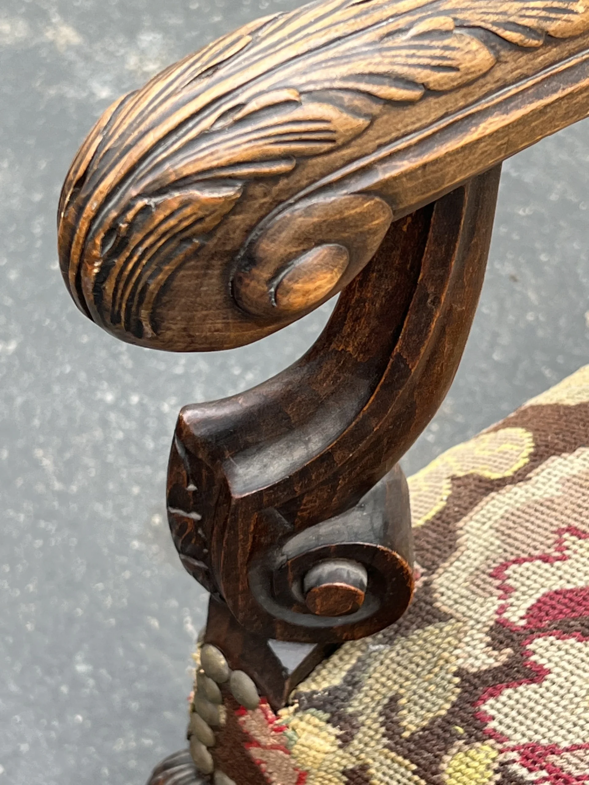 Upholstery of mideivel eedlepoint is somewhat tired on the seat but still in great shape on the back of chair. Chair is in sturdy condition. Could use a litle stain to on areas of the surface.