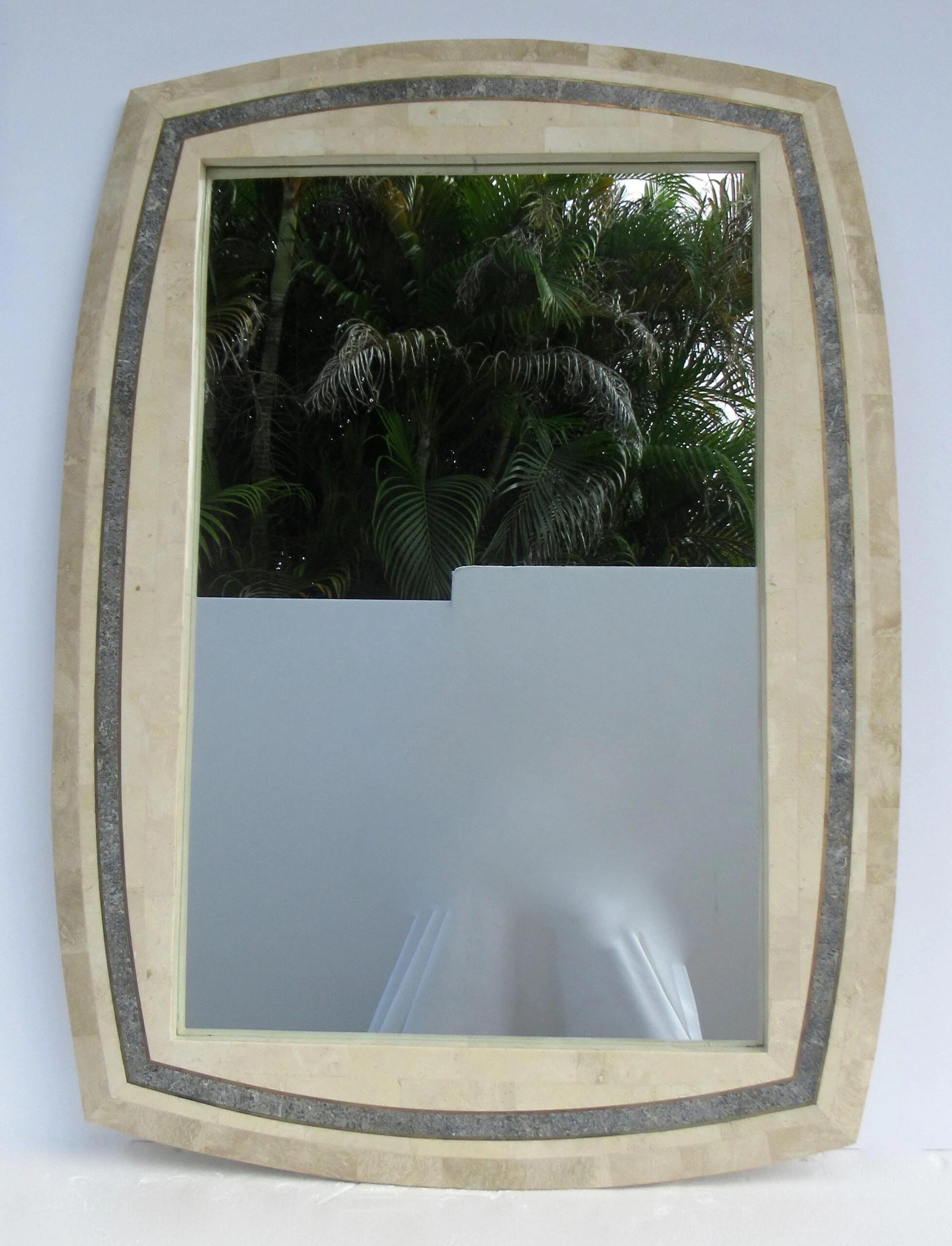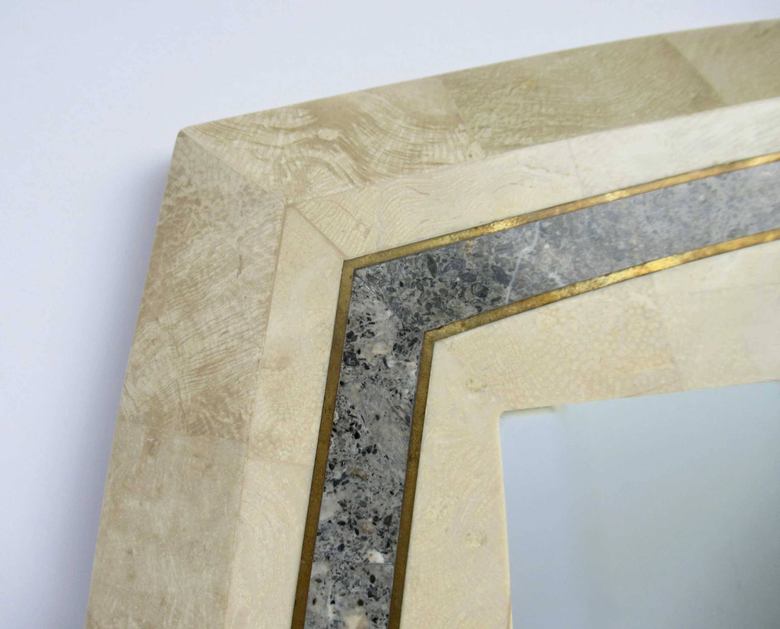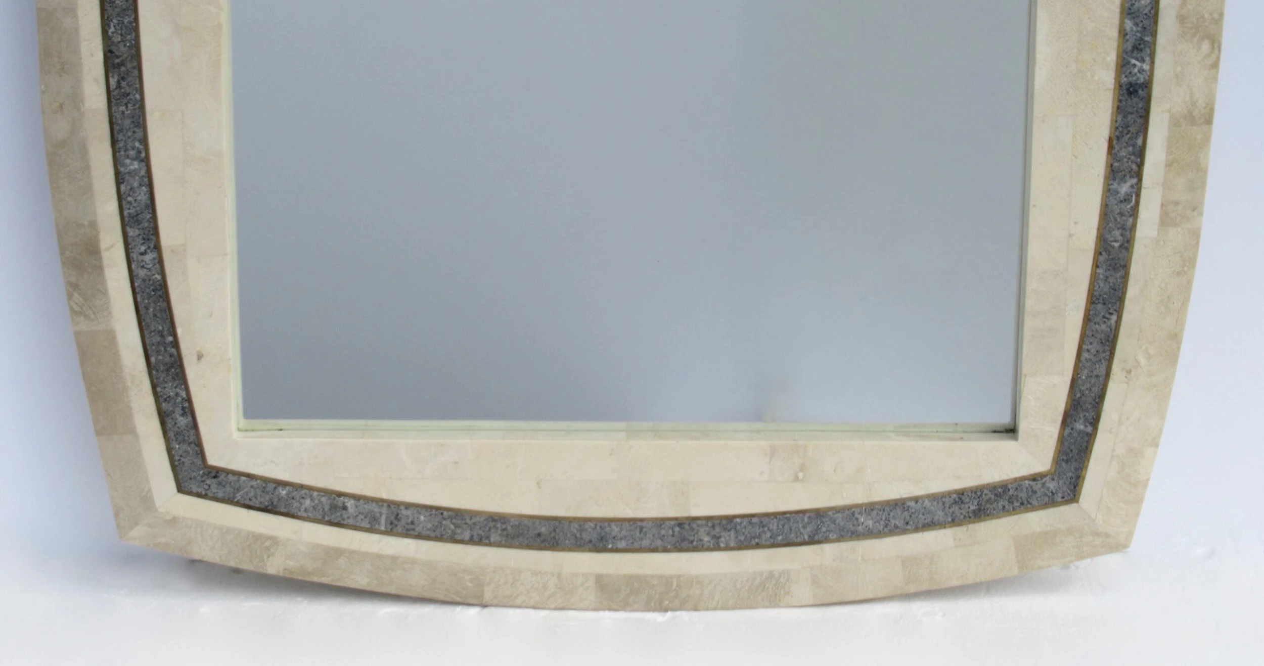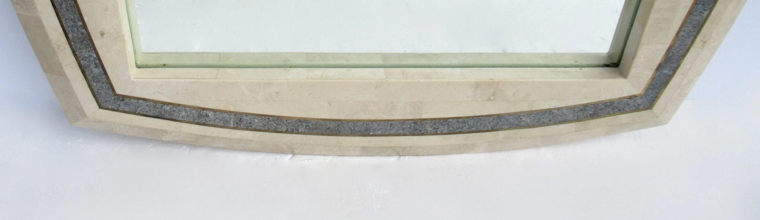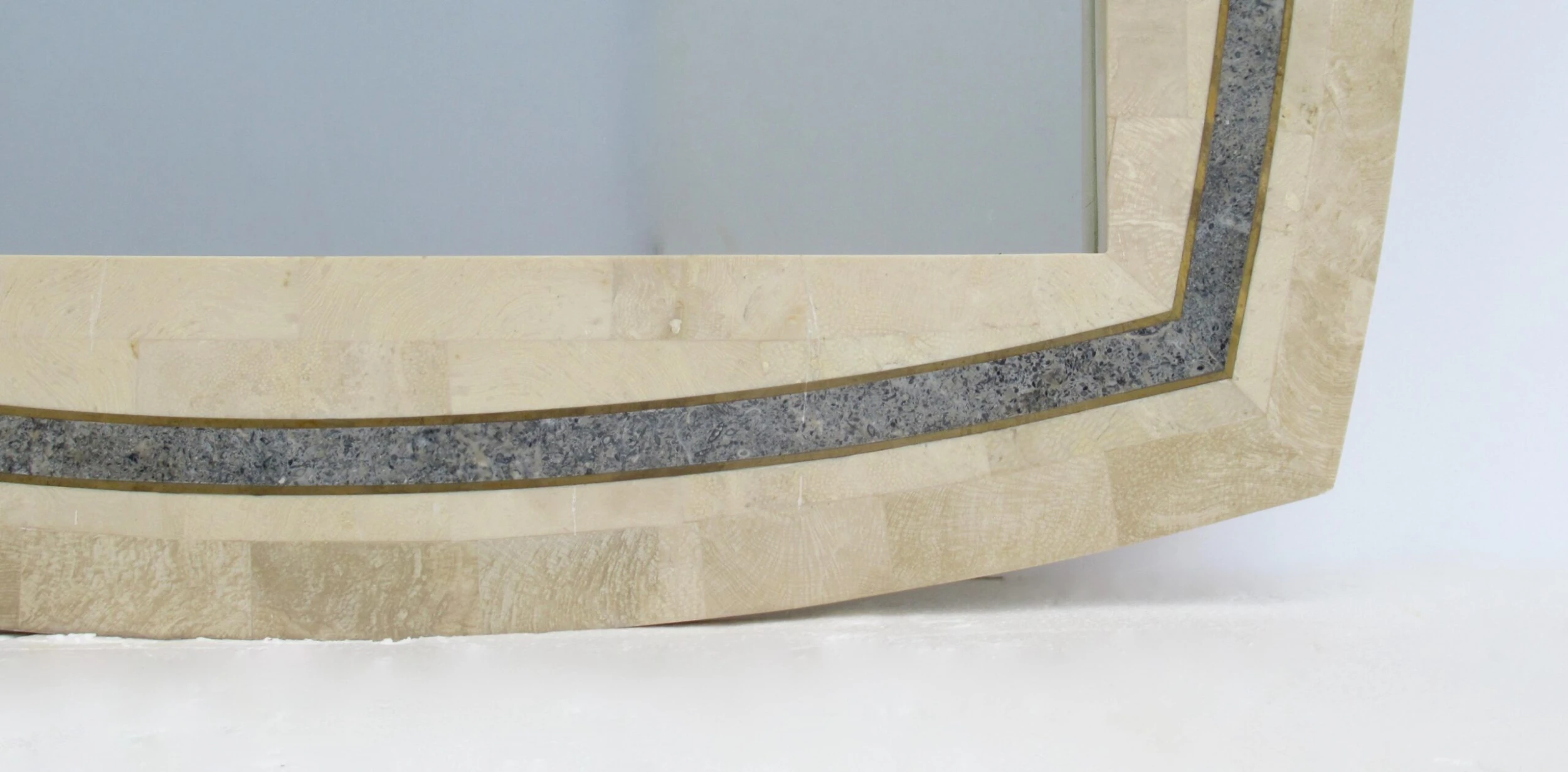 C.1980’s Roche-Bubois, tessellated stone wall mirror with inlaid brass trim detail, and a contrasting tessellated stone perimeter surround, design detail. A la’ Maitland-Smith style, with the tessellated stone mannerism/design mantra. The coloration is a 2-tone, cream or ecrus coloration with charcoal and variations of speckled gray gradation colors within the trim detail, and inset with a brass trim surround, which offsets the look, but gives a quasi jewel-tone sheen with the brass. We left the patina to the brass, but certainly can be polished to heighten the linear brass pencil trim detail. Manufactured country of provenance within the Philippines, for several design manufacturers, based on the material utilized into the manufacturing of Maitland-Smith and Roche-Bobois, and Case bisque, Enrique Garcel and the like Certain shapes of these type of mirrors, were manufactured specifically for specific Furniture, “To the Trade Showrooms, such is this shape, designated to the Roche-Bpbois Line, the sticker which was affixed to the backside below, was removed, and the leftover residue of when it was applied there is gone. As we have preserving the Catalog for reference, and designation, should we acquire any pieces by this well-known and highly regarded company.