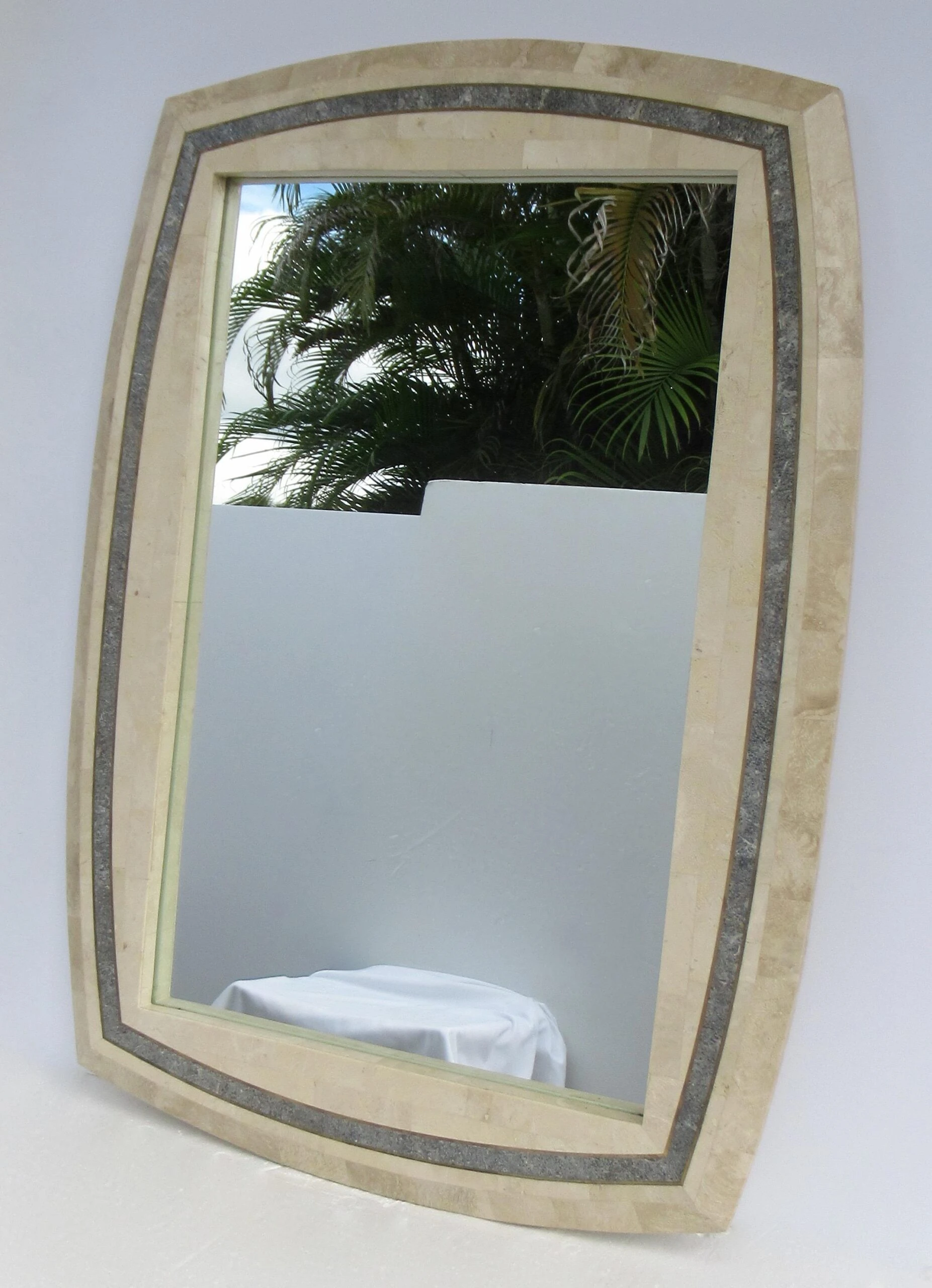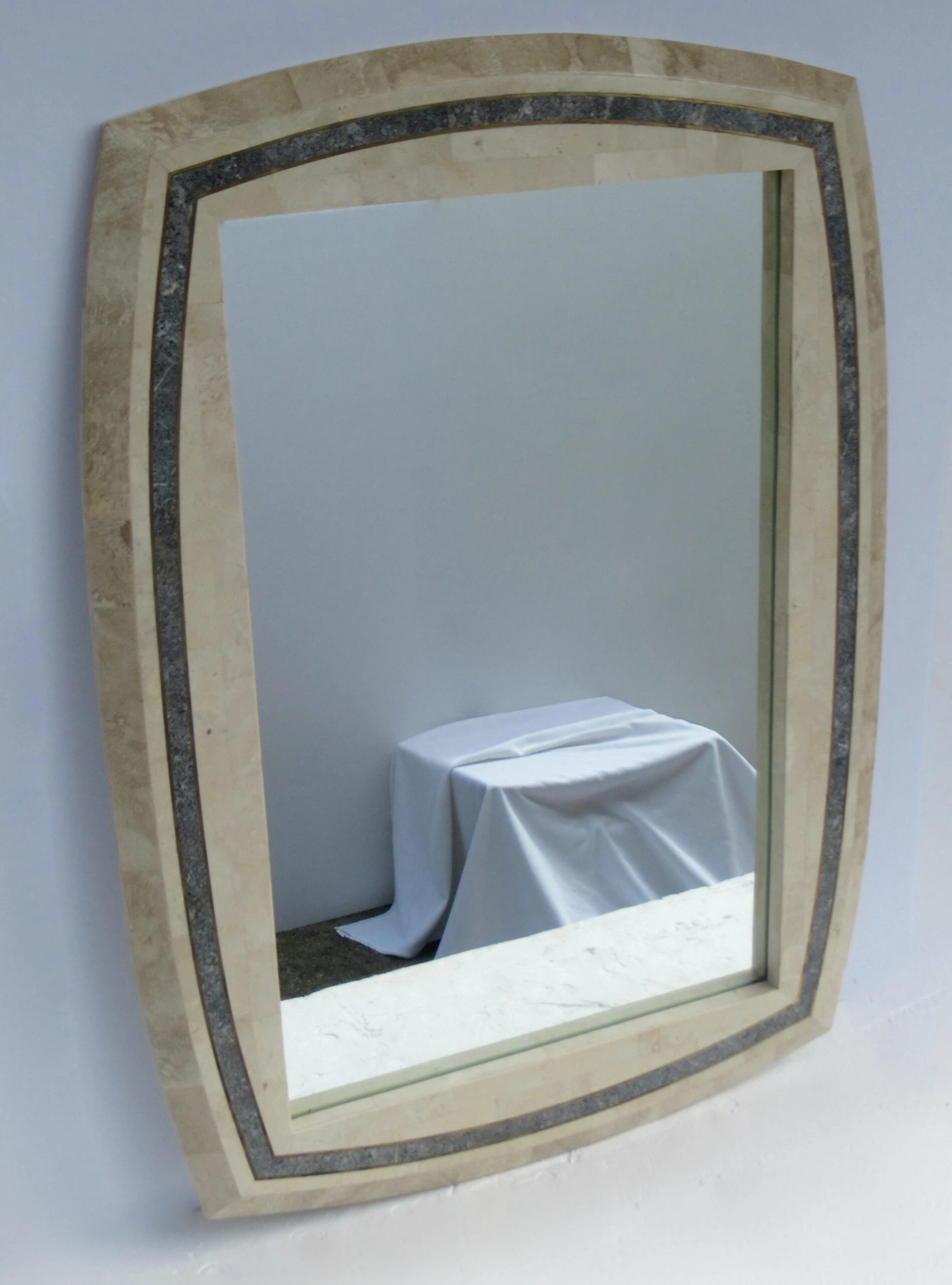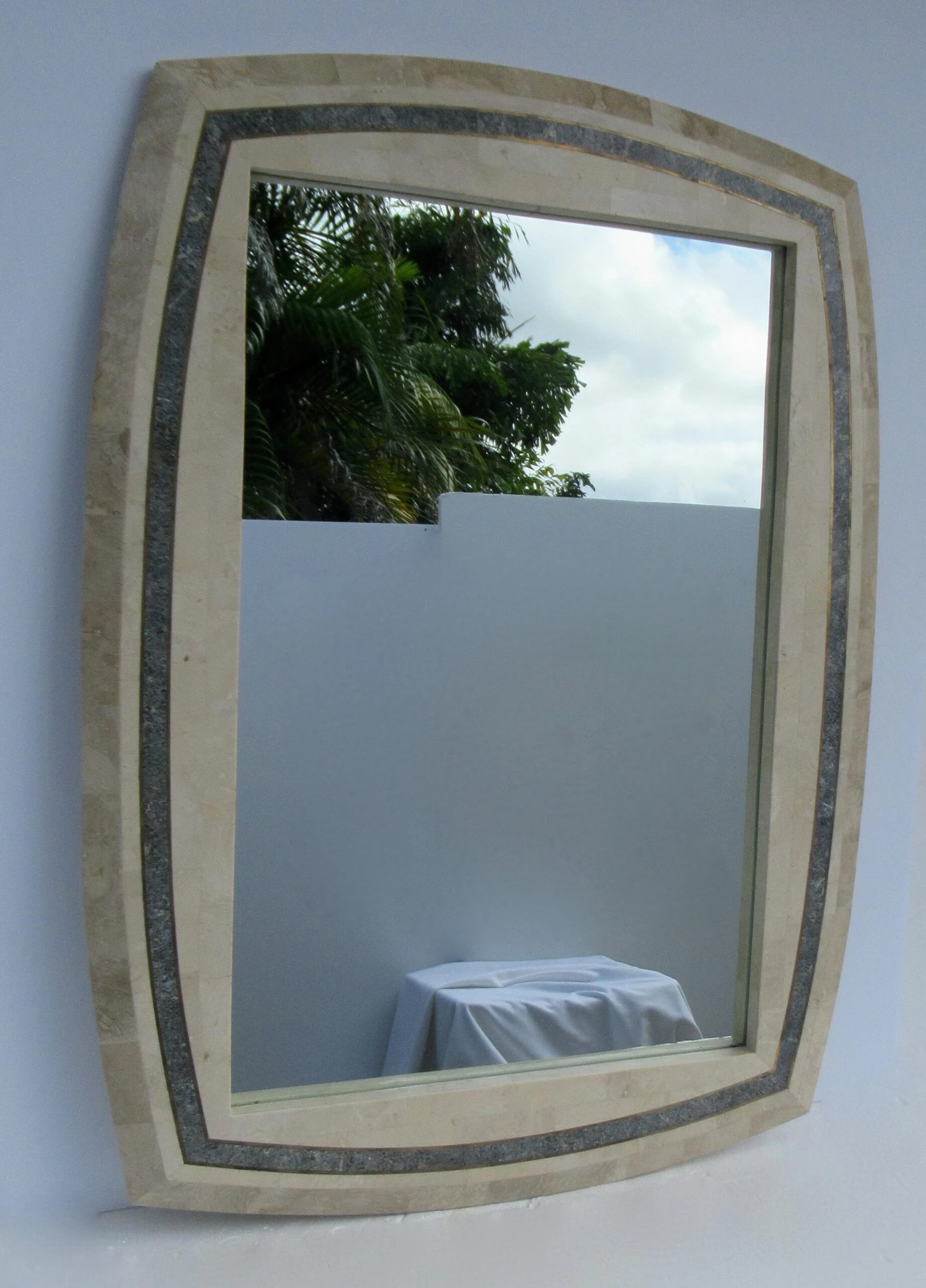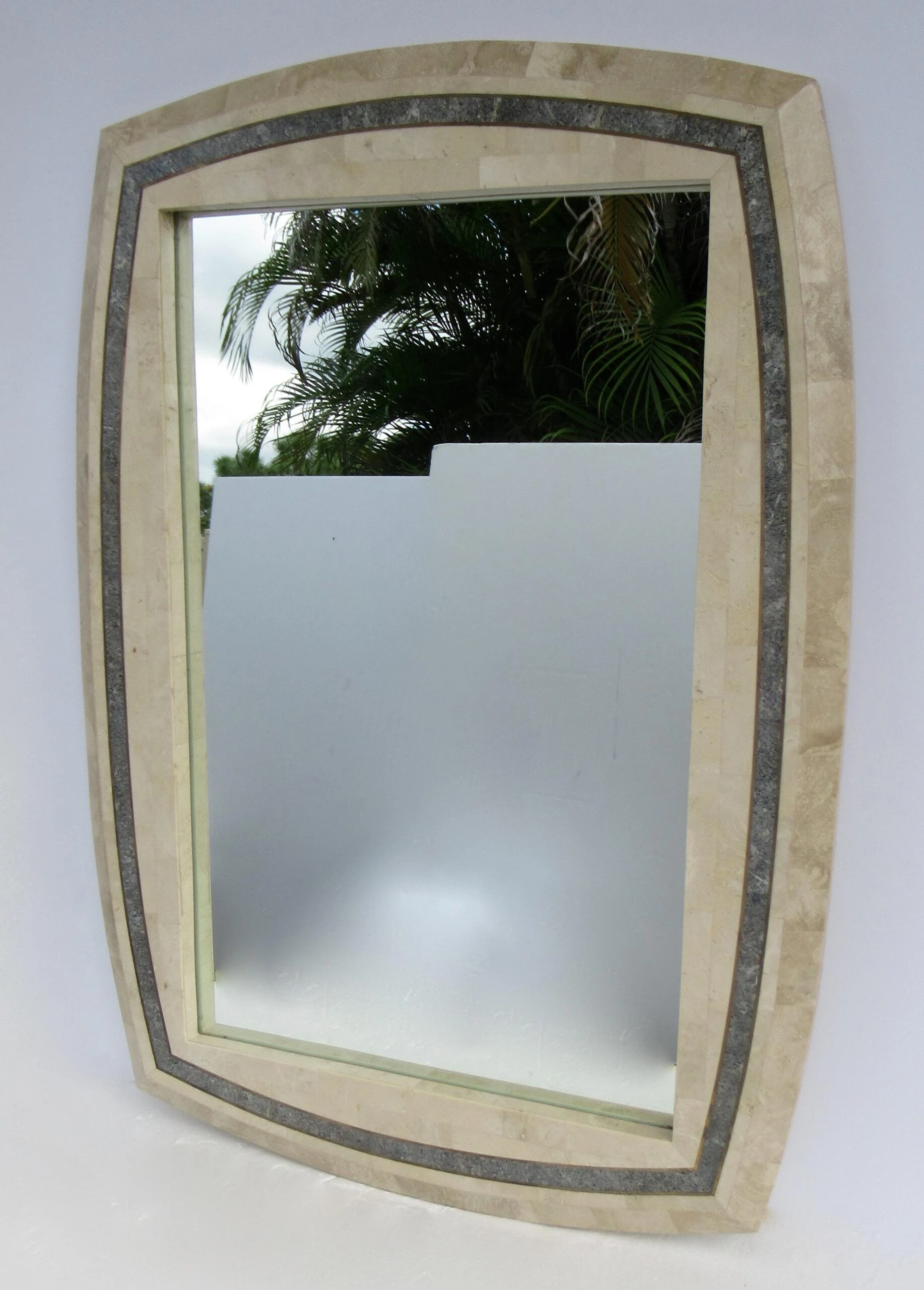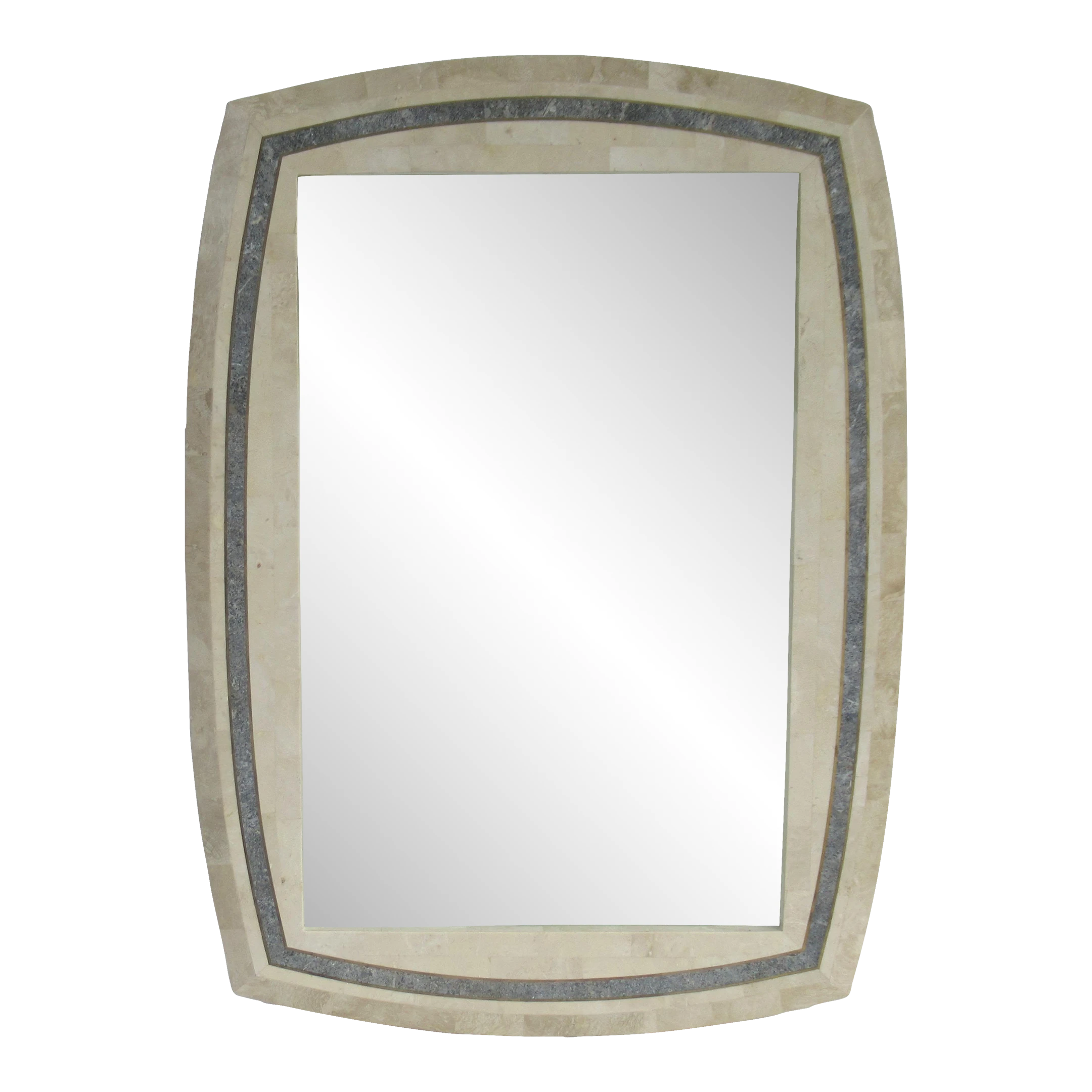 C.1980’s Roche-Bubois, tessellated stone wall mirror with inlaid brass trim detail, and a contrasting tessellated stone perimeter surround, design detail. A la’ Maitland-Smith style, with the tessellated stone mannerism/design mantra. The coloration is a 2-tone, cream or ecrus coloration with charcoal and variations of speckled gray gradation colors within the trim detail, and inset with a brass trim surround, which offsets the look, but gives a quasi jewel-tone sheen with the brass. We left the patina to the brass, but certainly can be polished to heighten the linear brass pencil trim detail. Manufactured country of provenance within the Philippines, for several design manufacturers, based on the material utilized into the manufacturing of Maitland-Smith and Roche-Bobois, and Case bisque, Enrique Garcel and the like Certain shapes of these type of mirrors, were manufactured specifically for specific Furniture, “To the Trade Showrooms, such is this shape, designated to the Roche-Bpbois Line, the sticker which was affixed to the backside below, was removed, and the leftover residue of when it was applied there is gone. As we have preserving the Catalog for reference, and designation, should we acquire any pieces by this well-known and highly regarded company.