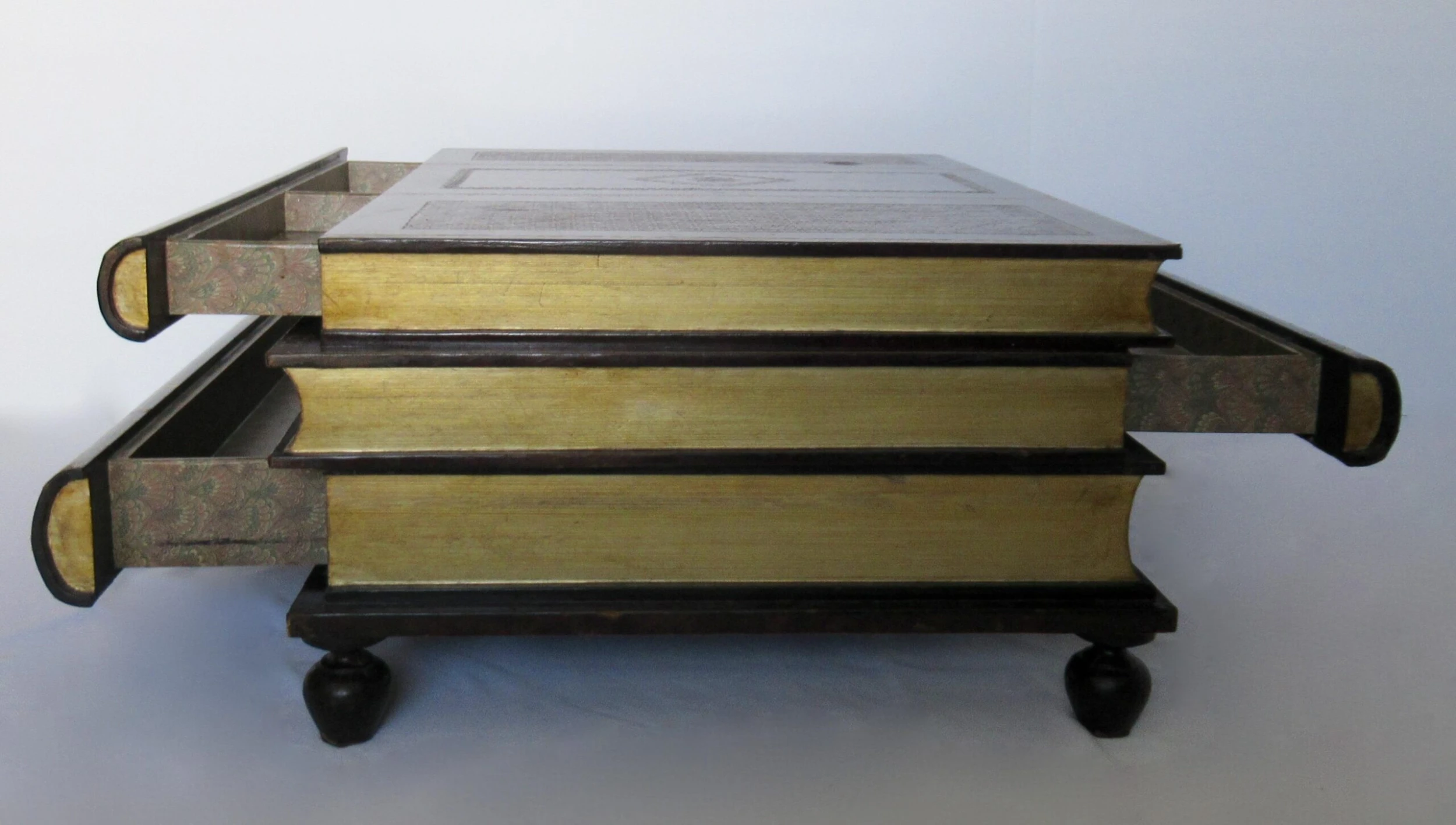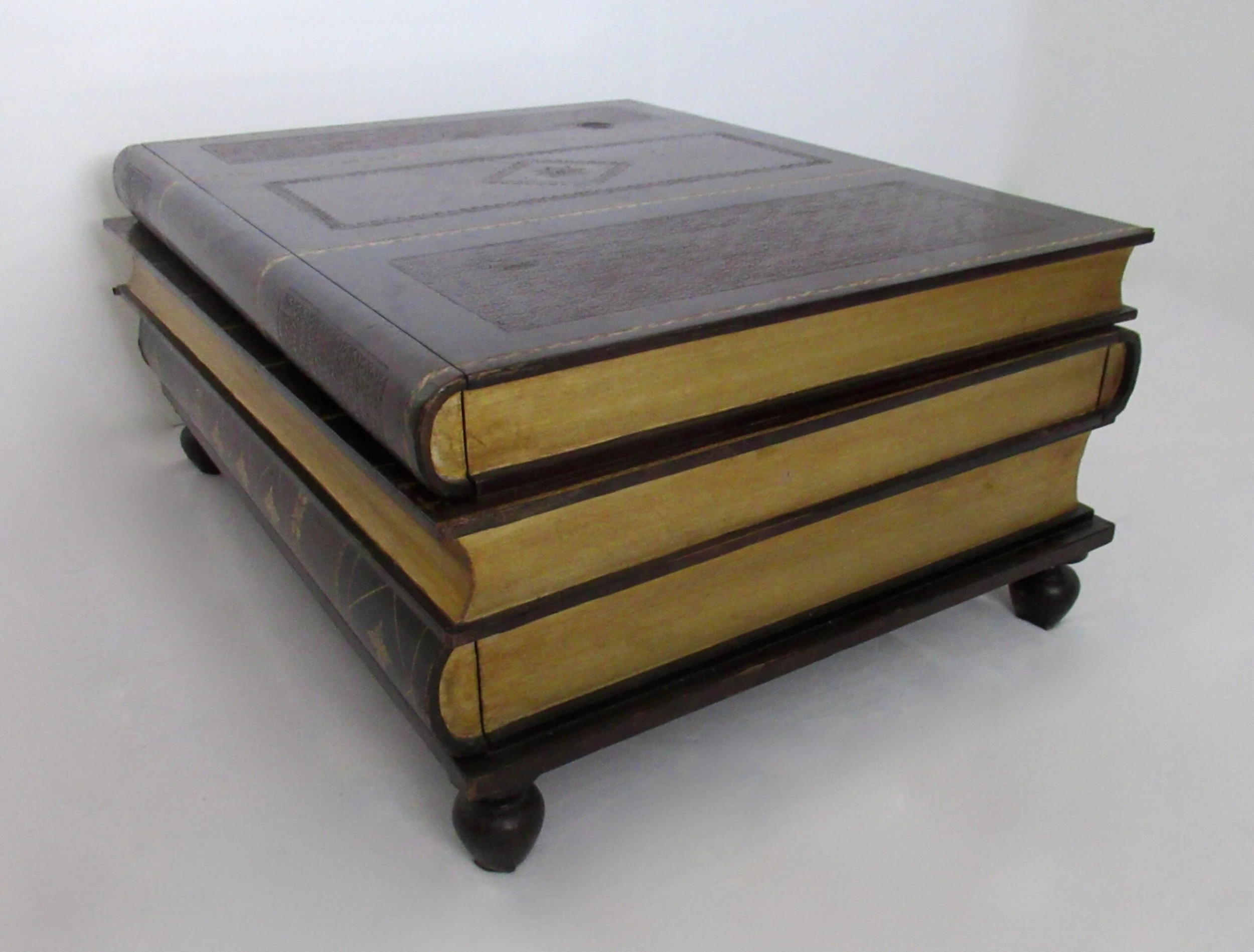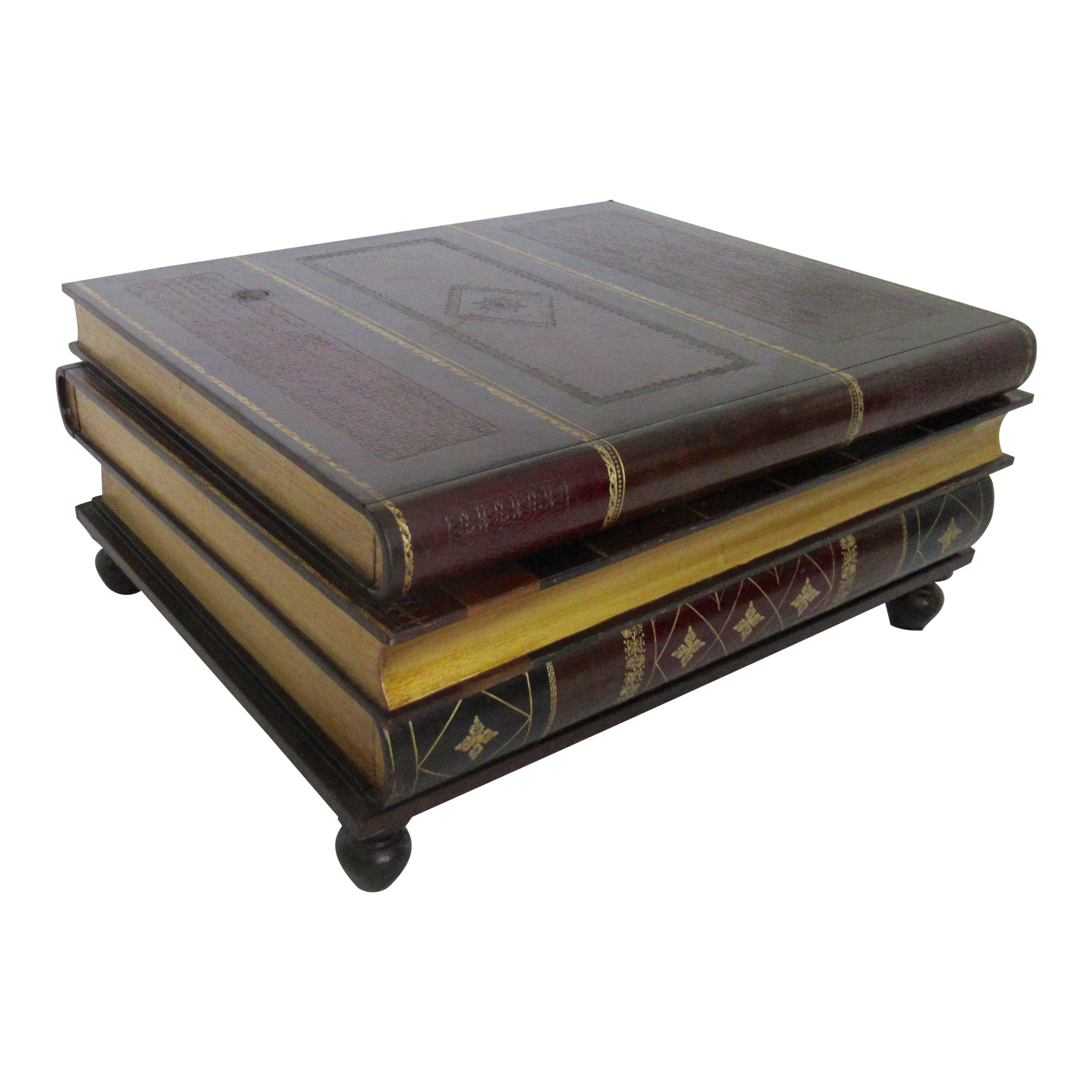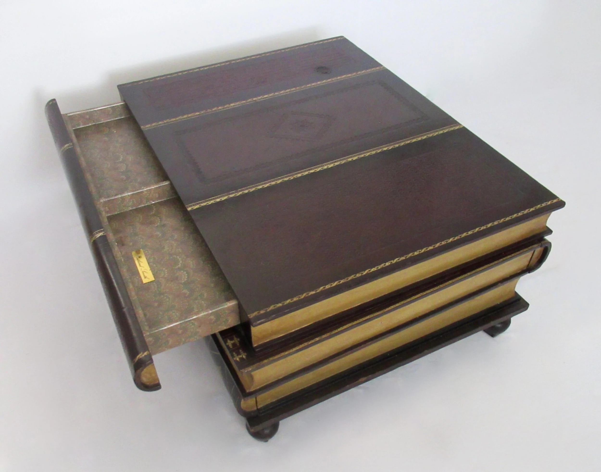 A C.1990’s: Genuine leather and gilt gold leaf Maitland-Smith Coffee/Library table in a Tromp L’eoil fashion of large, stacked books, …