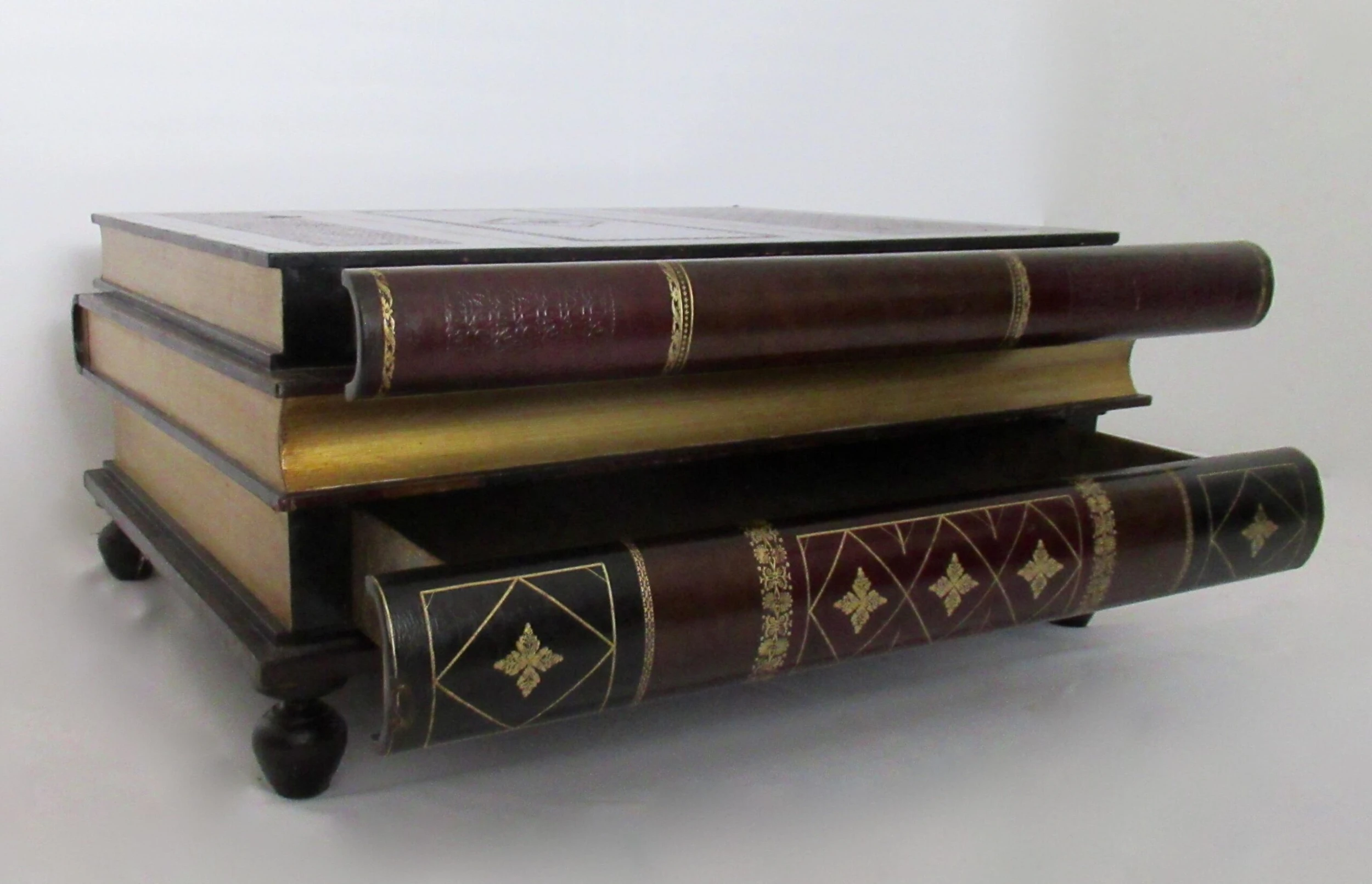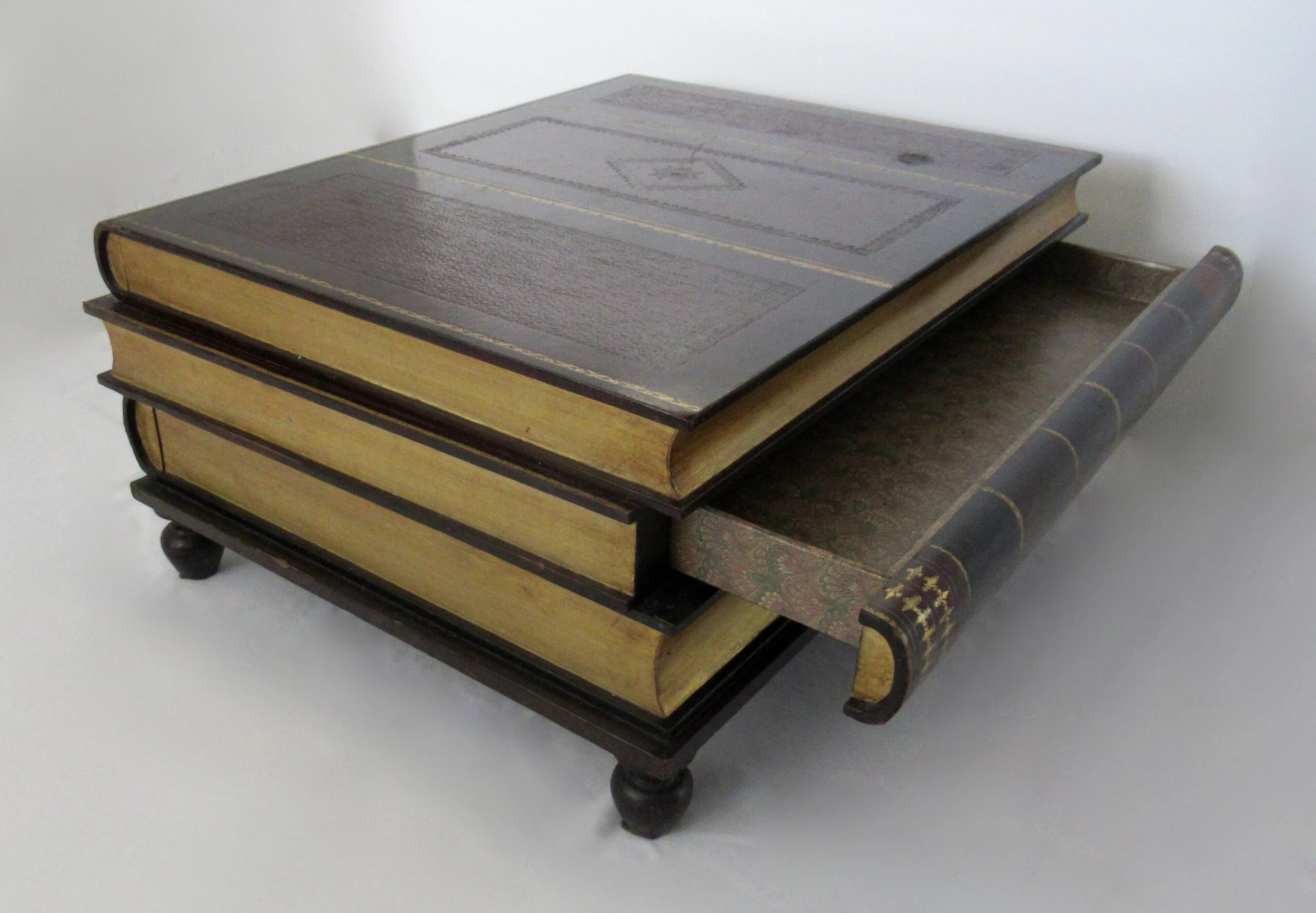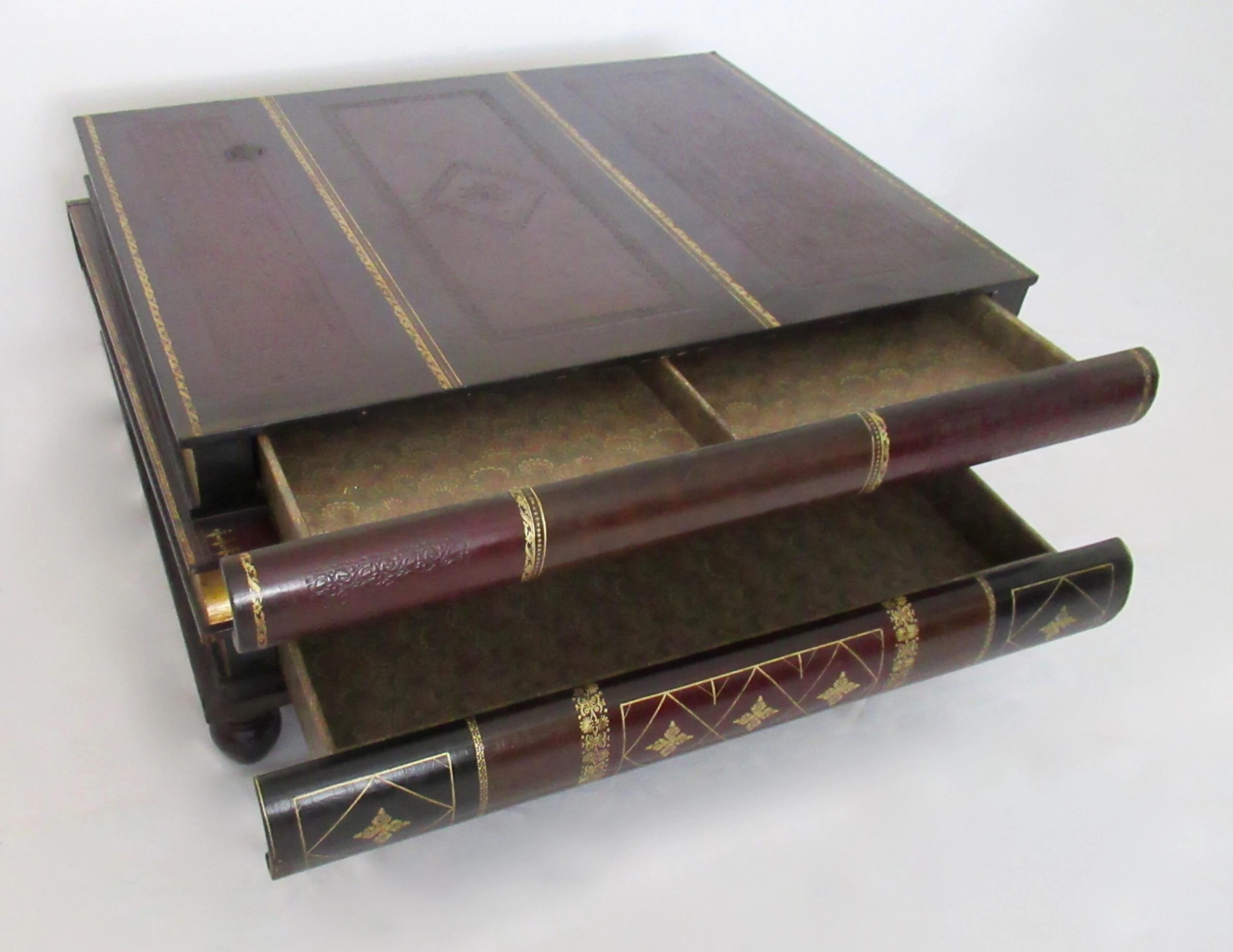 A C.1990’s: Genuine leather and gilt gold leaf Maitland-Smith Coffee/Library table in a Tromp L’eoil fashion of large, stacked books, with inset 3-drawer storage. Embossed sections to top, along with a diamond shaped design detail to center roof top table,. A Tromp l’oil example, of the most recognizable of the piece(s) of Maitland-Smith Co. Maker’s mark brass plate inset top drawer with the familiar flocked ombre or peacock paper lined drawers and wrapped drawers. Maitland-Smith is known for placing their signature purple variations of wave-like form or paisley-like formed, ombre wall-covering within some of these pieces, such as this one, along with their brass maker’s markings nameplate, as indicated in images within. There is “only,” one accidental and obvious, human attributed flaw by the previous owners, apparently they had placed something hot; like perhaps had a candle holder and candle wax overflowed, and burnt the surface top of leather, in question, as image indicates area in question, or something else hot, unless applied a protective barrier like a dish, tray or drink coaster. without using a coaster to the top left side leather embossed area as close up image indicates, otherwise the rest of table is in great condition with minute nick to legs, or to some of the edging. It gives it a worldly, leather bound book look. We took the liberty in polishing the leather and the wood, which fills in most of those “used,” issues with antique pieces, but a well deserved Table for distinction within any interior abode, library/den/family or living room areas. but most certainly has a world look and feel, with gorgeous patna. Sourced from a Delray Beach, Florida Estate. We welcome any and all offers, given that one small area of damage to top of leather, and should not detract from the overall table, some have been known to place a decorative catchall/object, book or tray even so the table has the old Worldly look. The table is solidly heavy and requires 2 strong men to move.