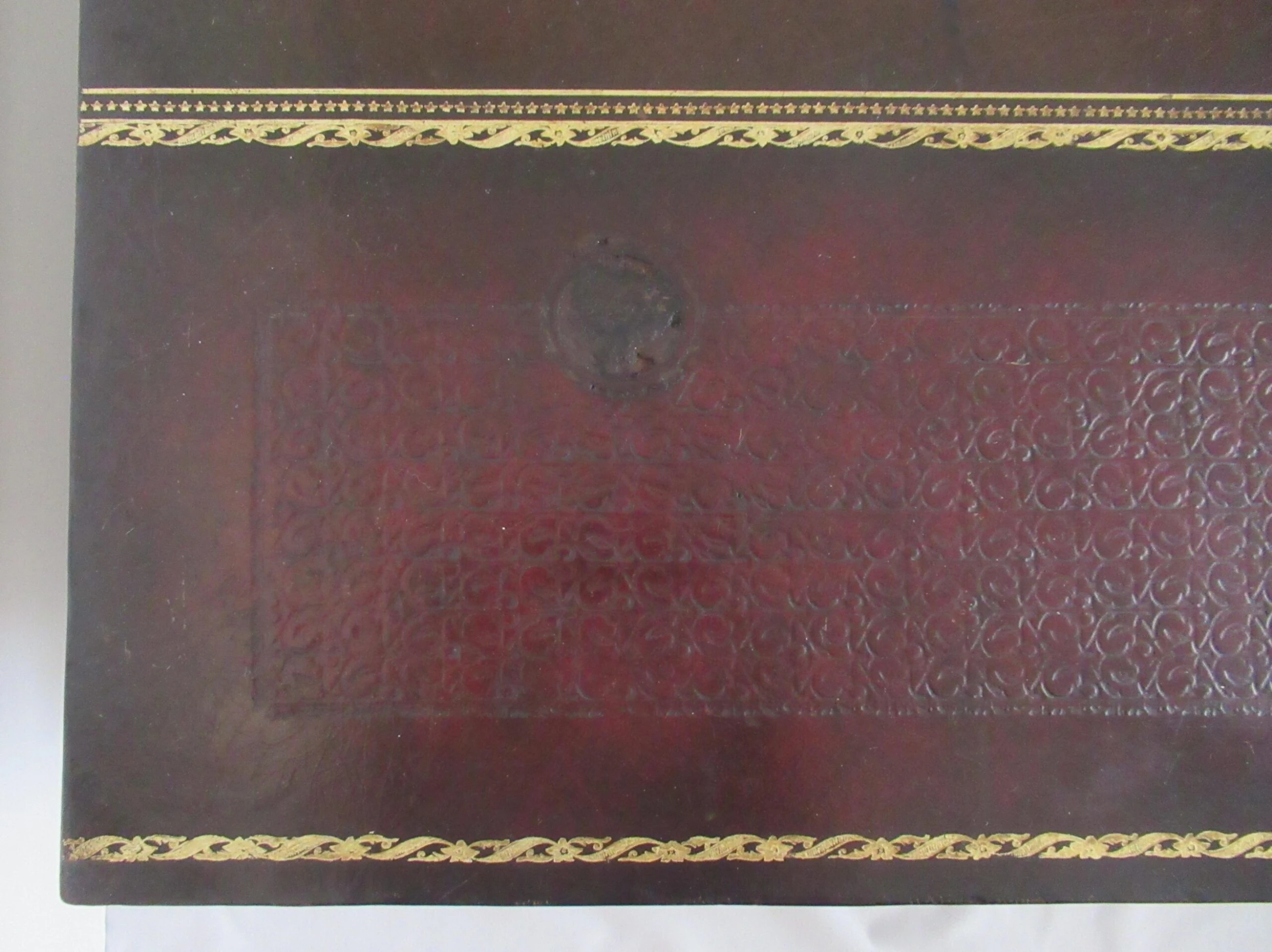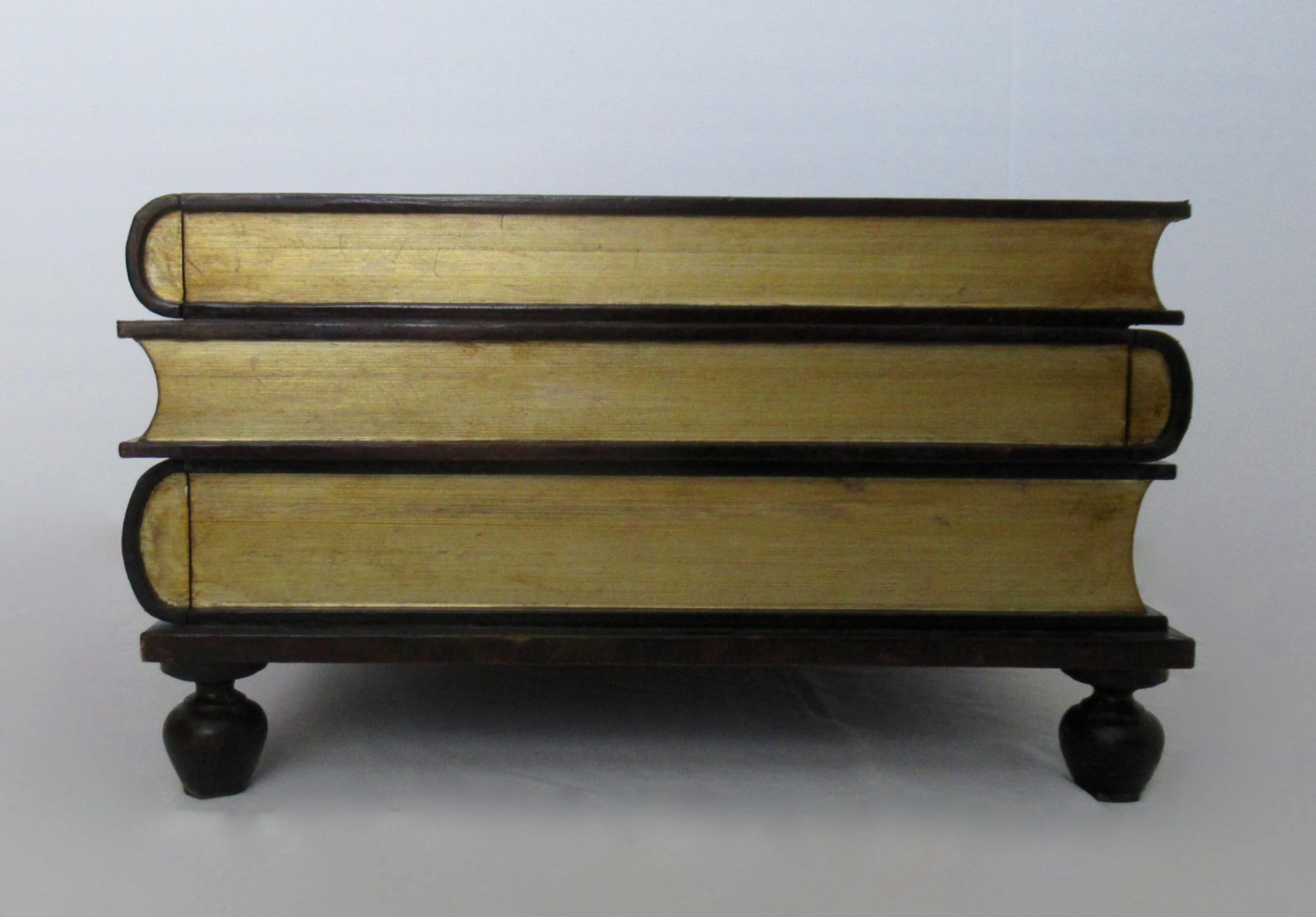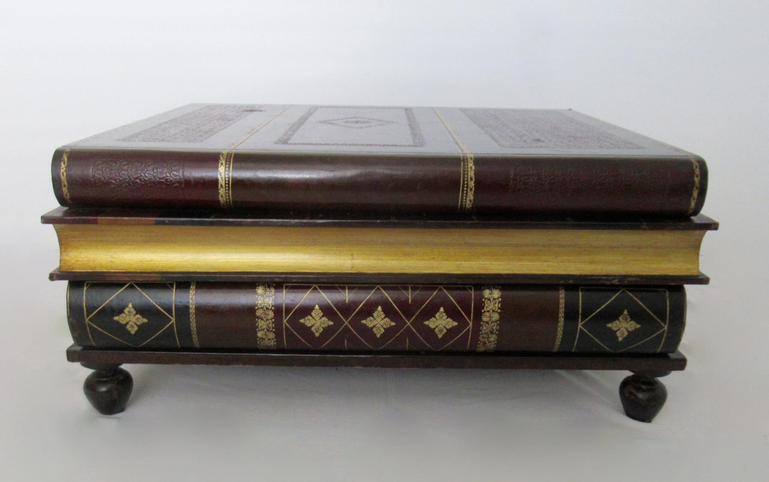 A C.1990’s: Genuine leather and gilt gold leaf Maitland-Smith Coffee/Library table in a Tromp L’eoil fashion of large, stacked books, with inset 3-drawer storage. Embossed sections to top, along with a diamond shaped design detail to center roof top table,. A Tromp l’oil example, of the most recognizable of the piece(s) of Maitland-Smith Co. Maker’s mark brass plate inset top drawer with the familiar flocked ombre or peacock paper lined drawers and wrapped drawers. Maitland-Smith is known for placing their signature purple variations of wave-like form or paisley-like formed, ombre wall-covering within some of these pieces, such as this one, along with their brass maker’s markings nameplate, as indicated in images within. There is “only,” one accidental and obvious, human attributed flaw by the previous owners, apparently they had placed something hot; like perhaps had a candle holder and candle wax overflowed, and burnt the surface top of leather, in question, as image indicates area in question, or something else hot, unless applied a protective barrier like a dish, tray or drink coaster. without using a coaster to the top left side leather embossed area as close up image indicates, otherwise the rest of table is in great condition with minute nick to legs, or to some of the edging. It gives it a worldly, leather bound book look. We took the liberty in polishing the leather and the wood, which fills in most of those “used,” issues with antique pieces, but a well deserved Table for distinction within any interior abode, library/den/family or living room areas. but most certainly has a world look and feel, with gorgeous patna. Sourced from a Delray Beach, Florida Estate. We welcome any and all offers, given that one small area of damage to top of leather, and should not detract from the overall table, some have been known to place a decorative catchall/object, book or tray even so the table has the old Worldly look. The table is solidly heavy and requires 2 strong men to move.
