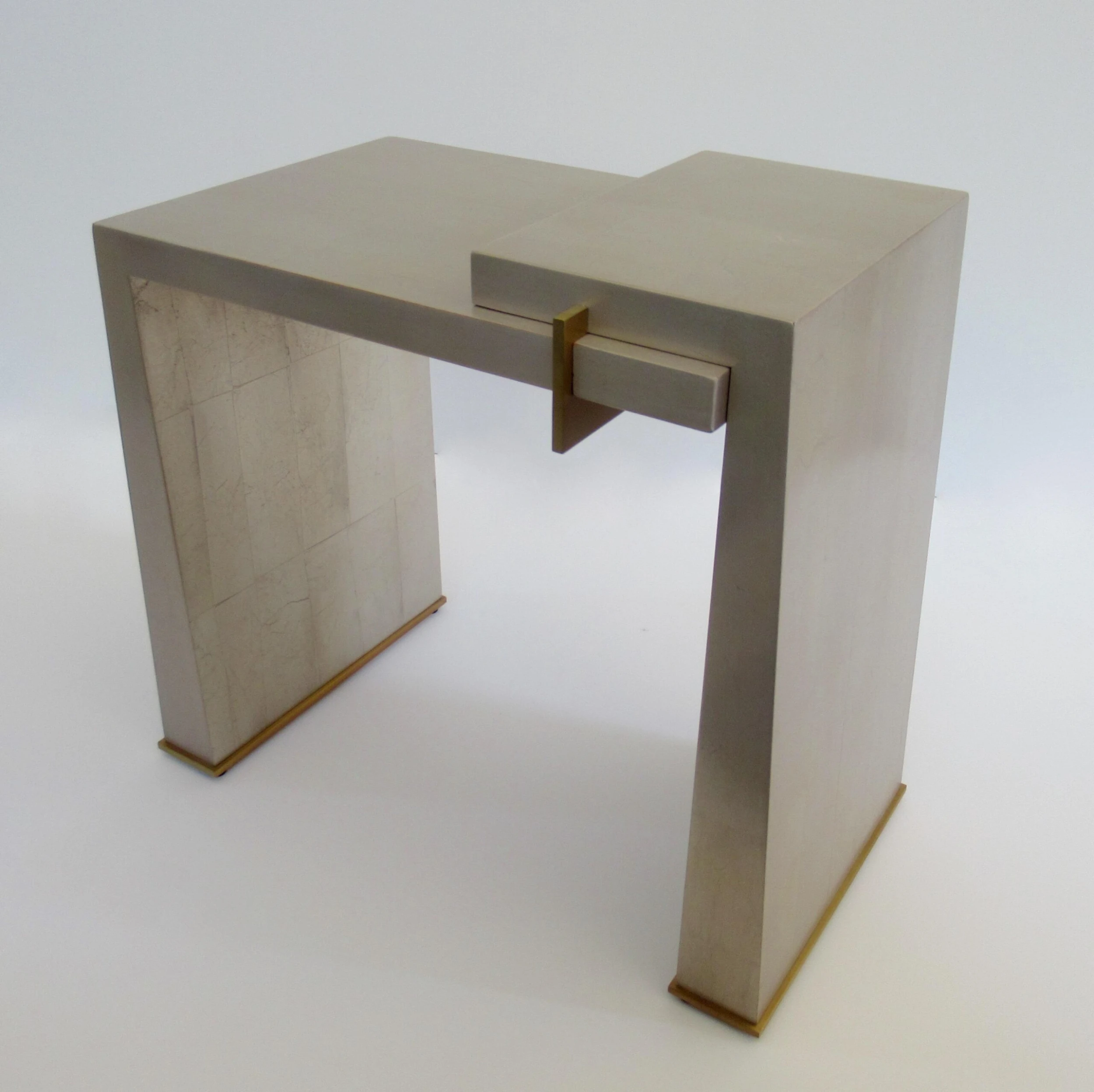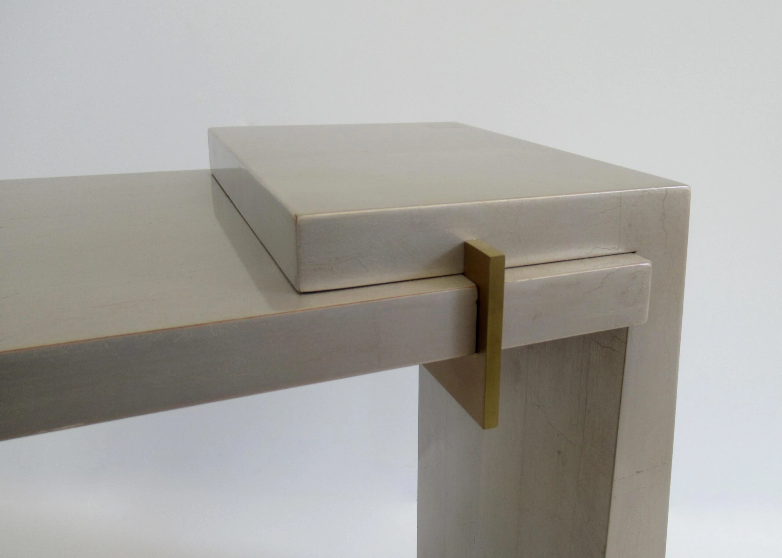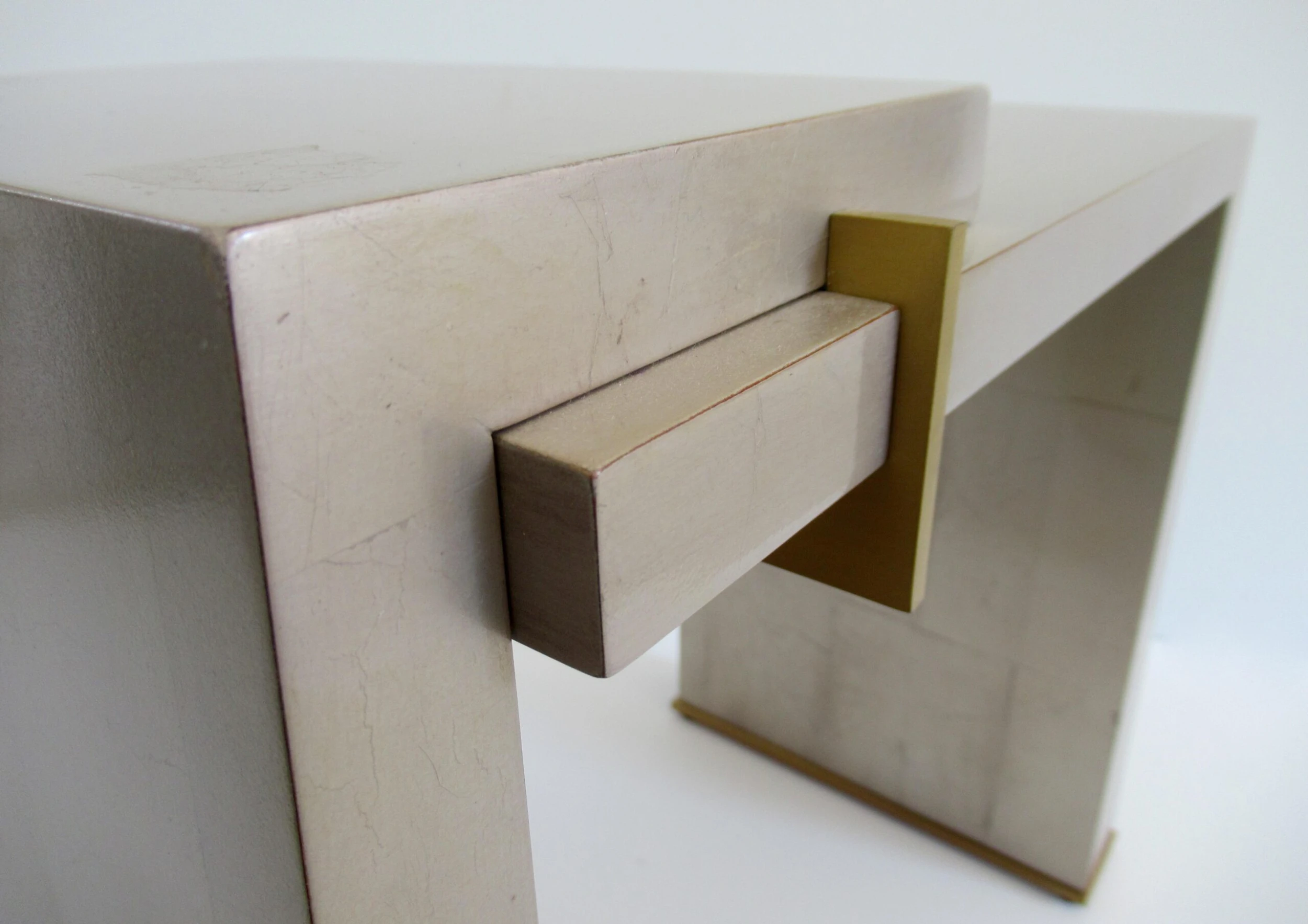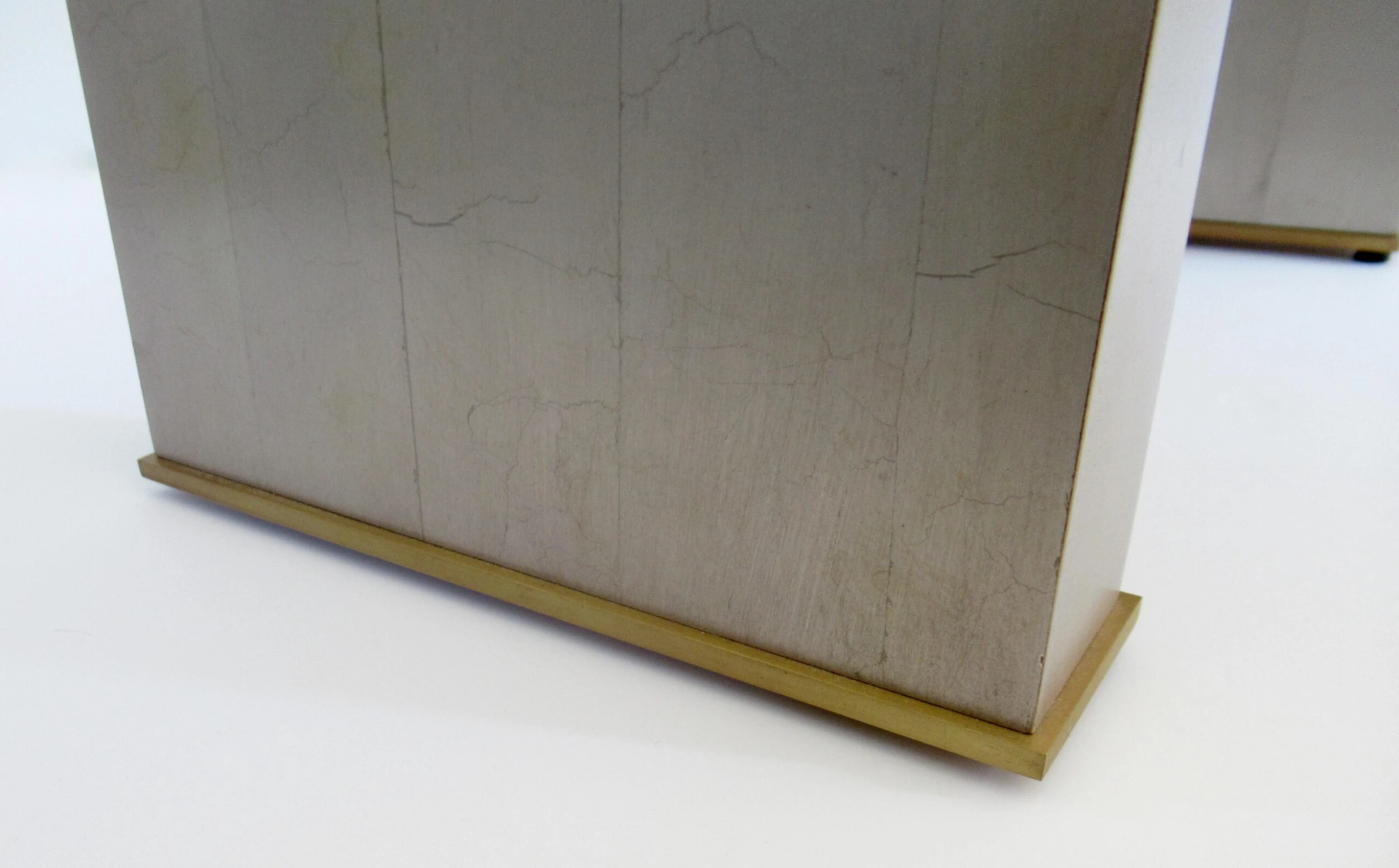C.1990’s Thomas Pheasant (Design), exclusively for Baker Furniture Company, a “To the Trade,” industry representative, are these EXQUISITE, NEVERR BEFORE USED, pair of “Stratum,” Modernist, Minimal yet Contemporary and Transitional, Side/End, and/or Occasional Tables or drink tables in a sophisticated platinum silver leaf finish, with bronze details throughout. A wonderful interconnected quasi-type tables; given some of the craftsmanship entailed, with a nod towards Frank Lloyd Wright as well as Craftsman Architecture, as the legs flare wider towards the base, and narrow upwards, along with the base is supported by a bronze underside with black protective bumpers as last image indicates. Also it showcases the connectivity of the bronze details upwards to where the 2 sections of the tables meet and interconnect the simple and refined detail offsets the softness of the platinum and the bronze. These are perfect between a pair of occasional lounge chairs, lower seating areas, in a boudoir next to a favorite chair or area to read, cocktail tables utilized in a multi-functional environment, offsetting a sofa, in living/family room, etc. A plethora of possibilities, given one’s domain Platinum Silver leaf has a sealed finish to it.