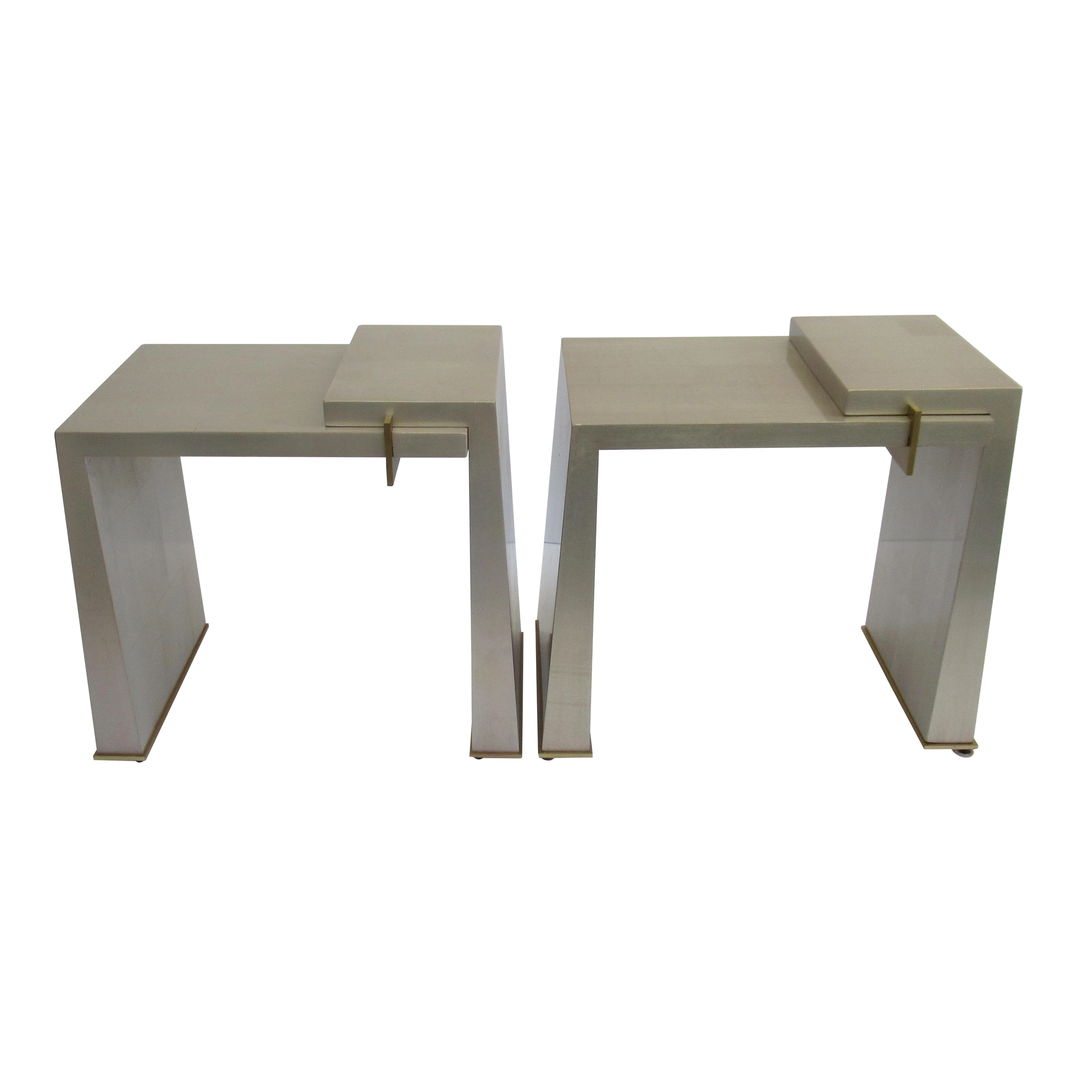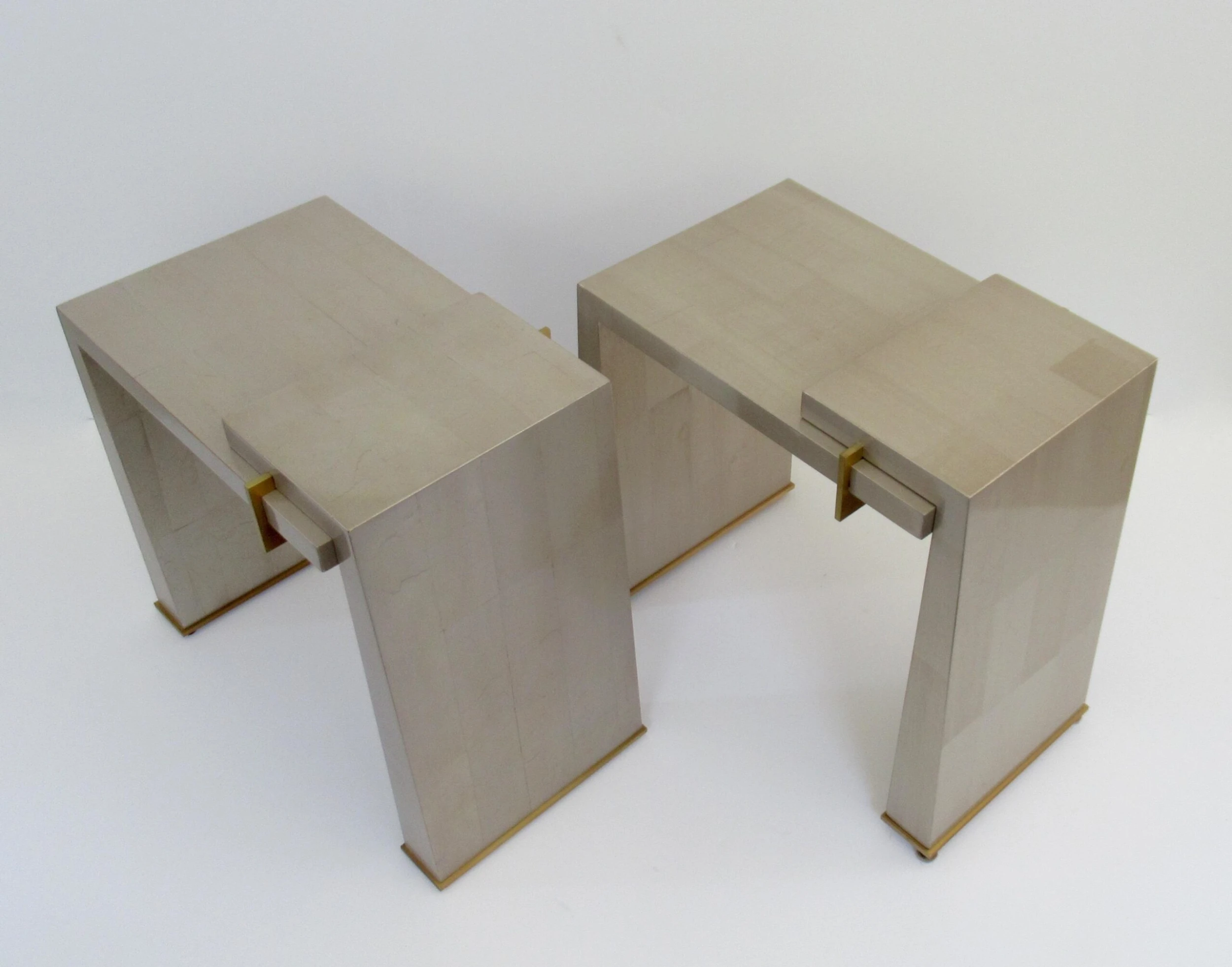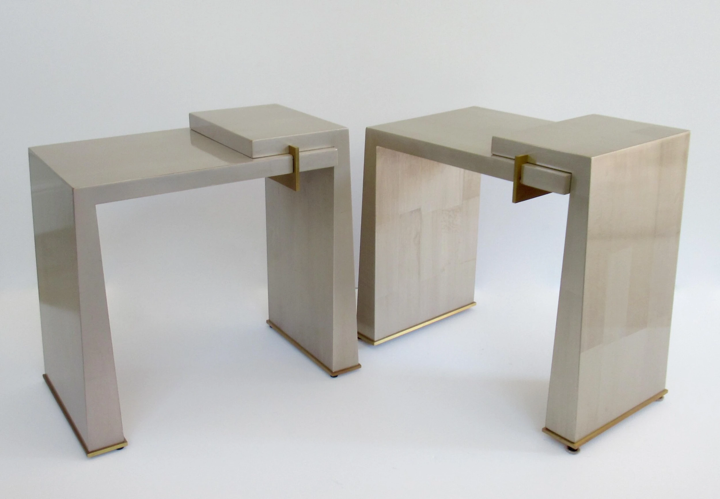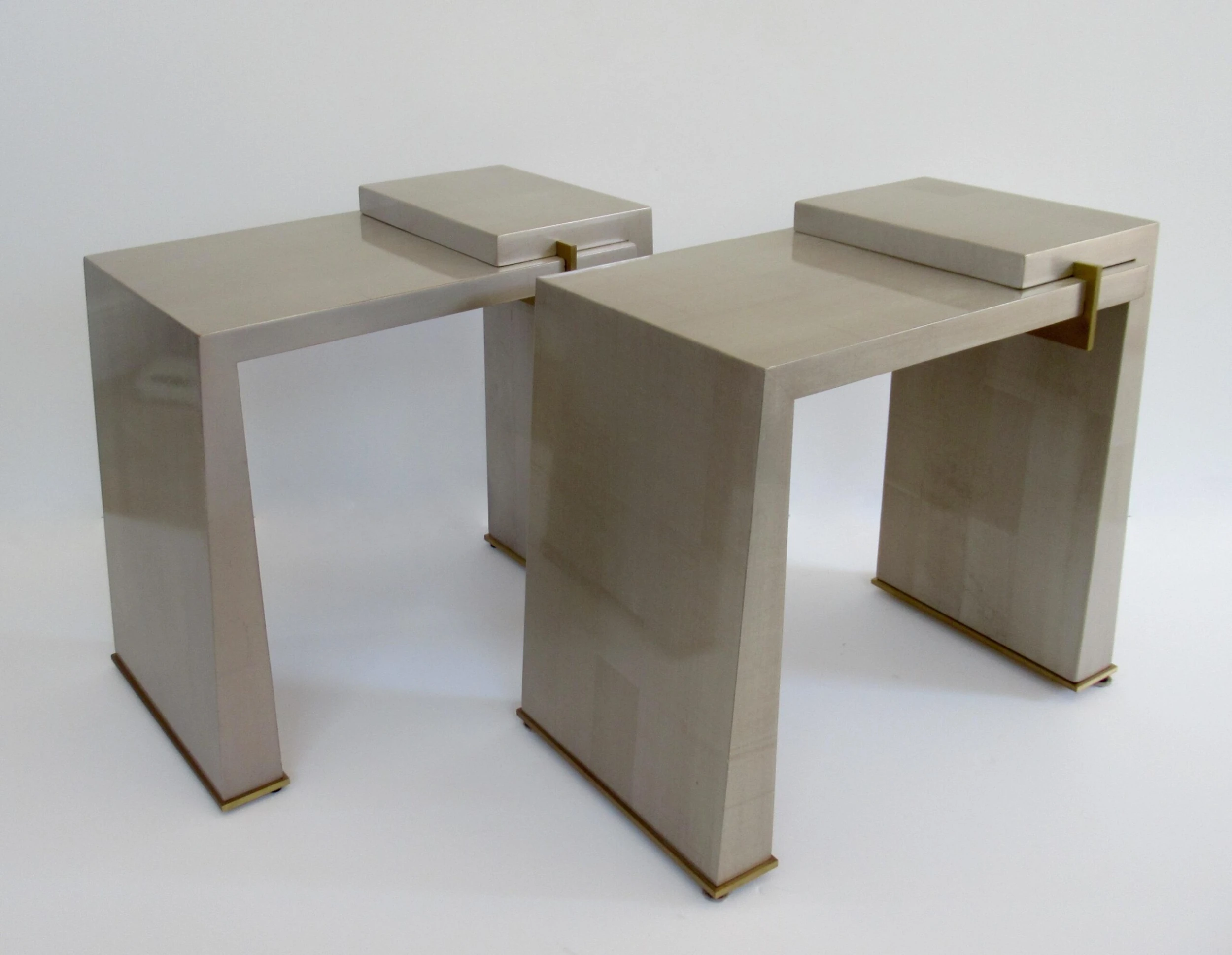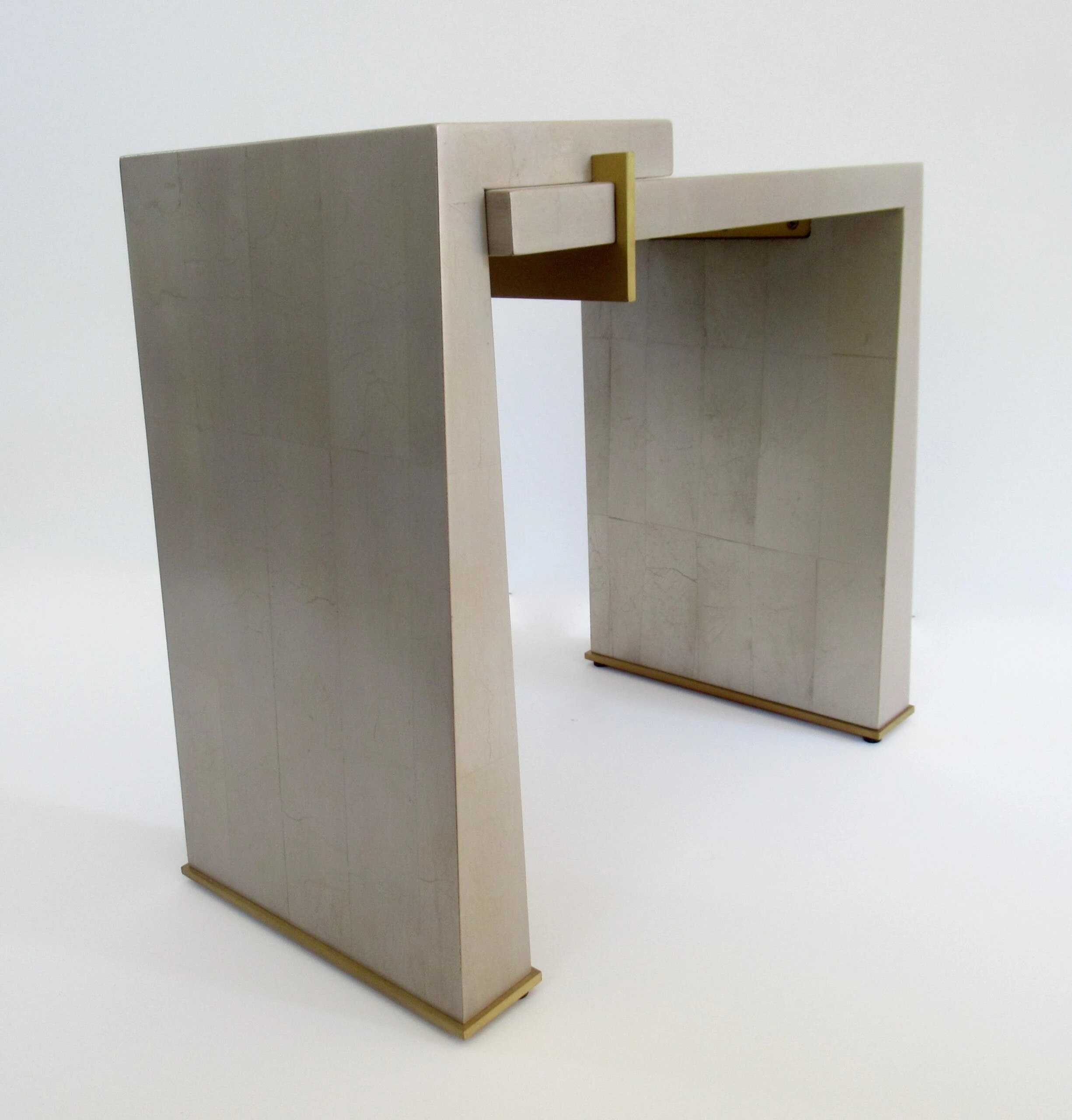 C.1990’s Thomas Pheasant (Design), exclusively for Baker Furniture Company, a “To the Trade,” industry representative, are these EXQUISITE, NEVERR BEFORE USED, pair of “Stratum,” Modernist, Minimal yet Contemporary and Transitional, Side/End, and/or Occasional Tables or drink tables in a sophisticated platinum silver leaf finish, with bronze details throughout. A wonderful interconnected quasi-type tables; given some of the craftsmanship entailed, with a nod towards Frank Lloyd Wright as well as Craftsman Architecture, as the legs flare wider towards the base, and narrow upwards, along with the base is supported by a bronze underside with black protective bumpers as last image indicates. Also it showcases the connectivity of the bronze details upwards to where the 2 sections of the tables meet and interconnect the simple and refined detail offsets the softness of the platinum and the bronze. These are perfect between a pair of occasional lounge chairs, lower seating areas, in a boudoir next to a favorite chair or area to read, cocktail tables utilized in a multi-functional environment, offsetting a sofa, in living/family room, etc. A plethora of possibilities, given one’s domain Platinum Silver leaf has a sealed finish to it.